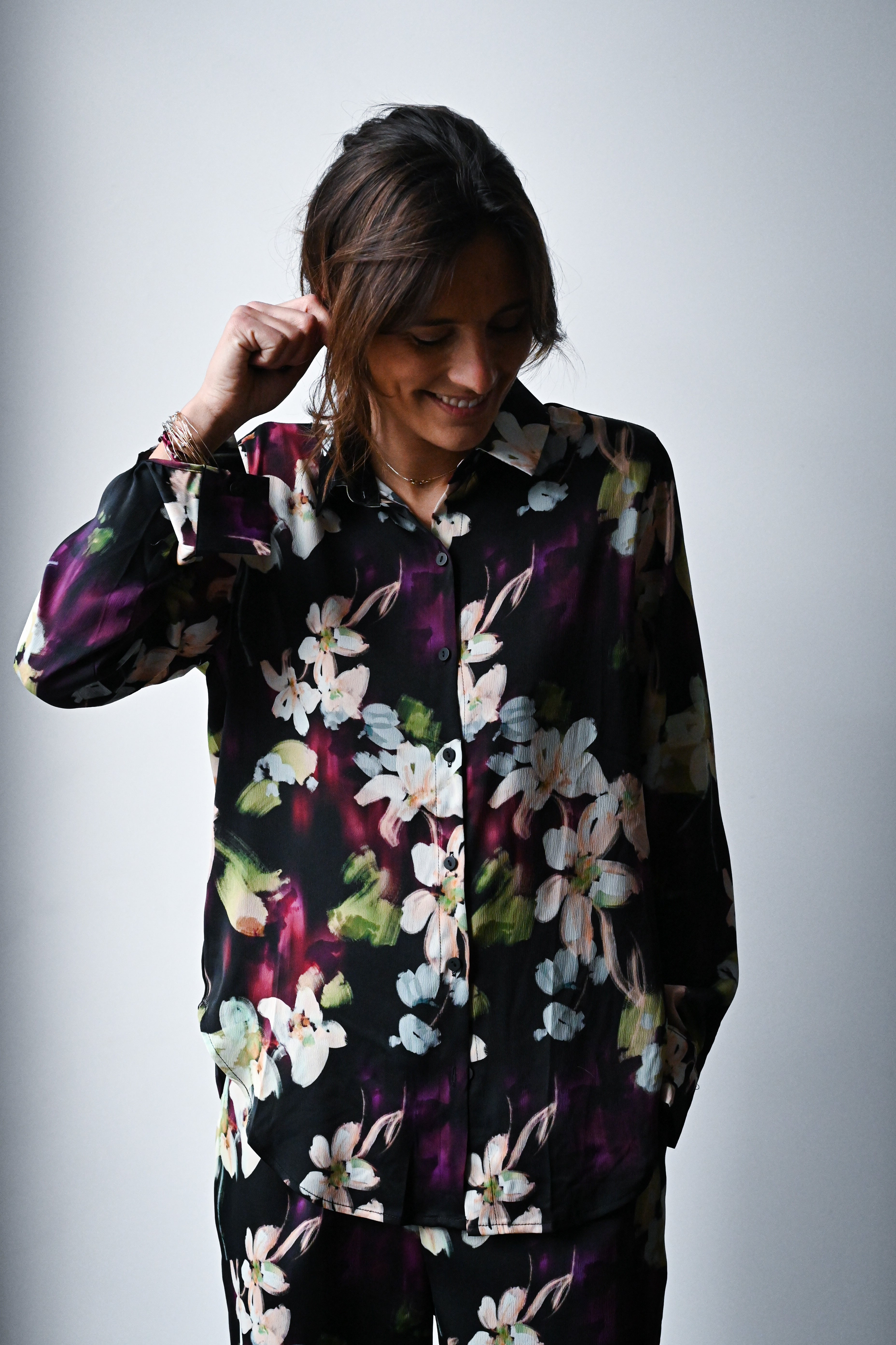 Découvrez la chemise CLEM en satin fleuri, ornée de boutons élégants sur toute la longueur. Disponible en tailles S, M et L, elle apporte une touche de raffinement à votre garde-robe.