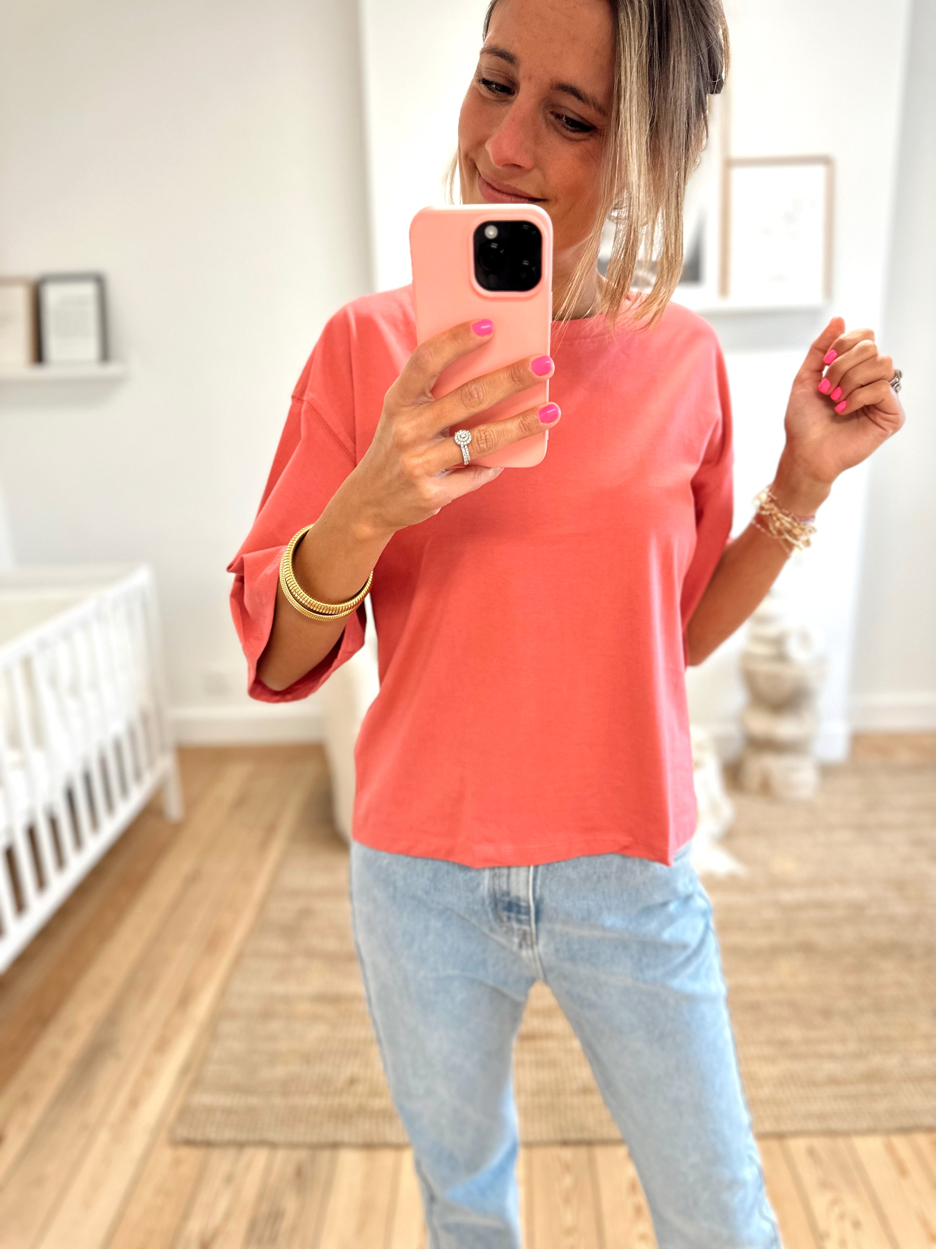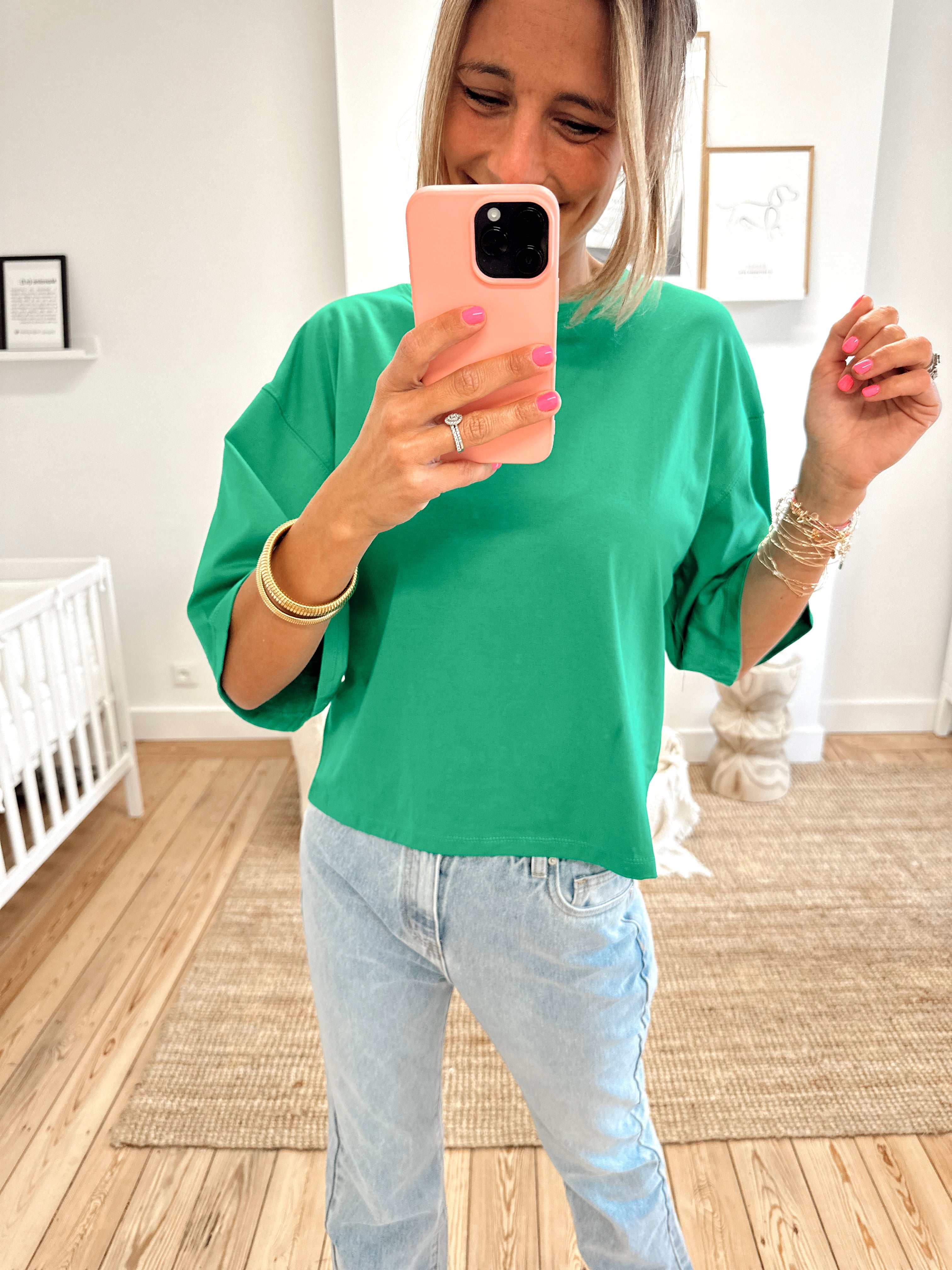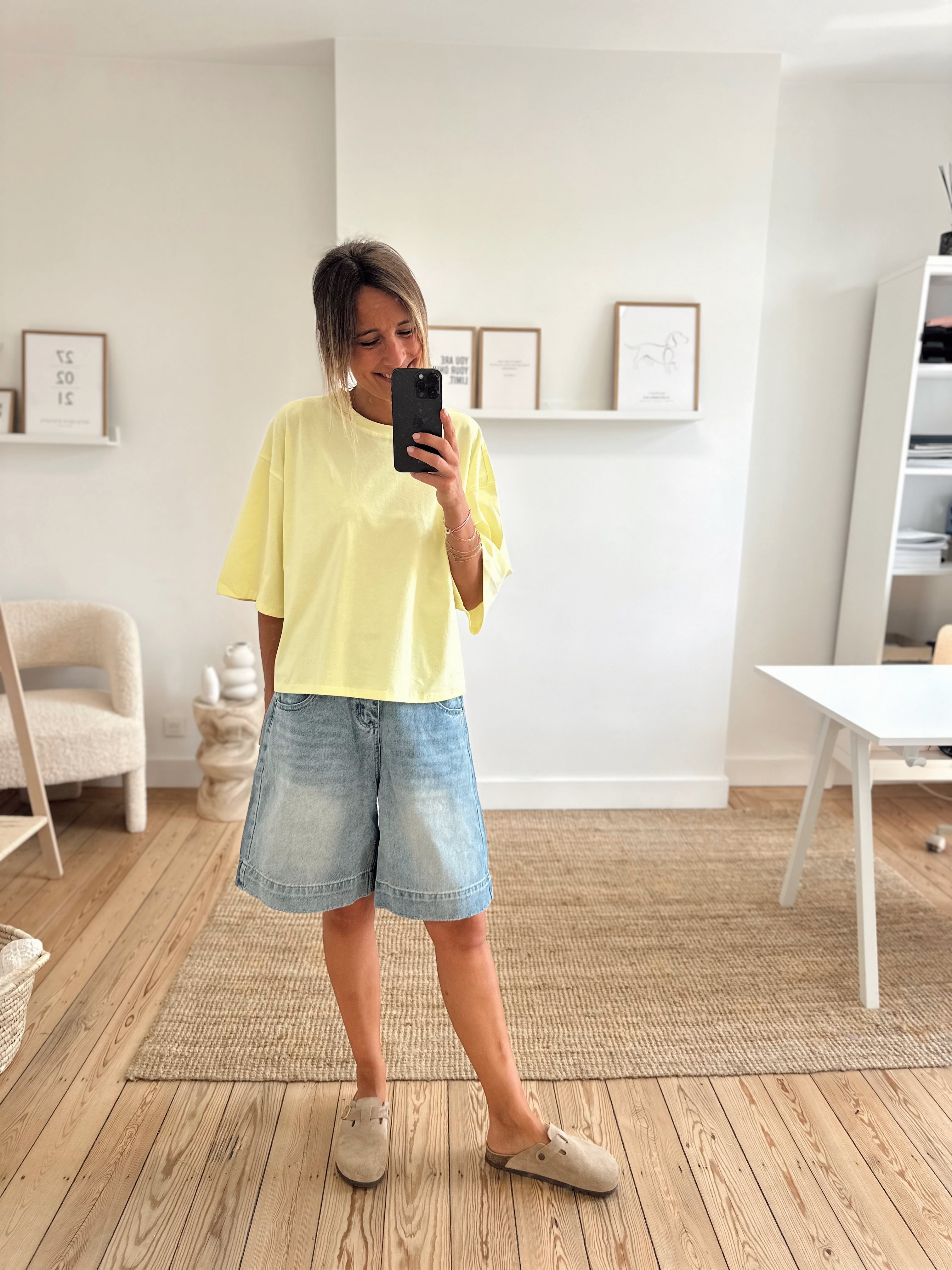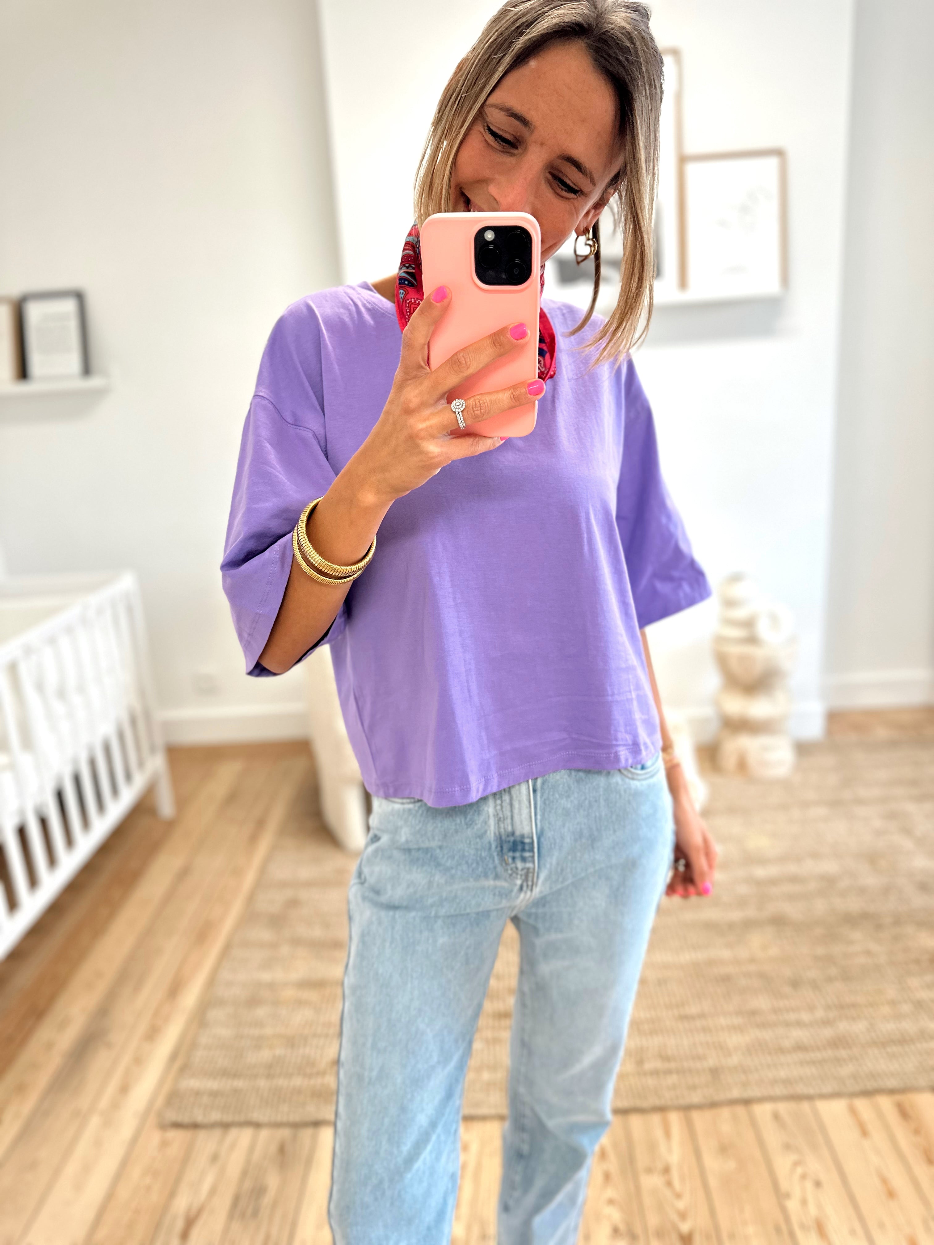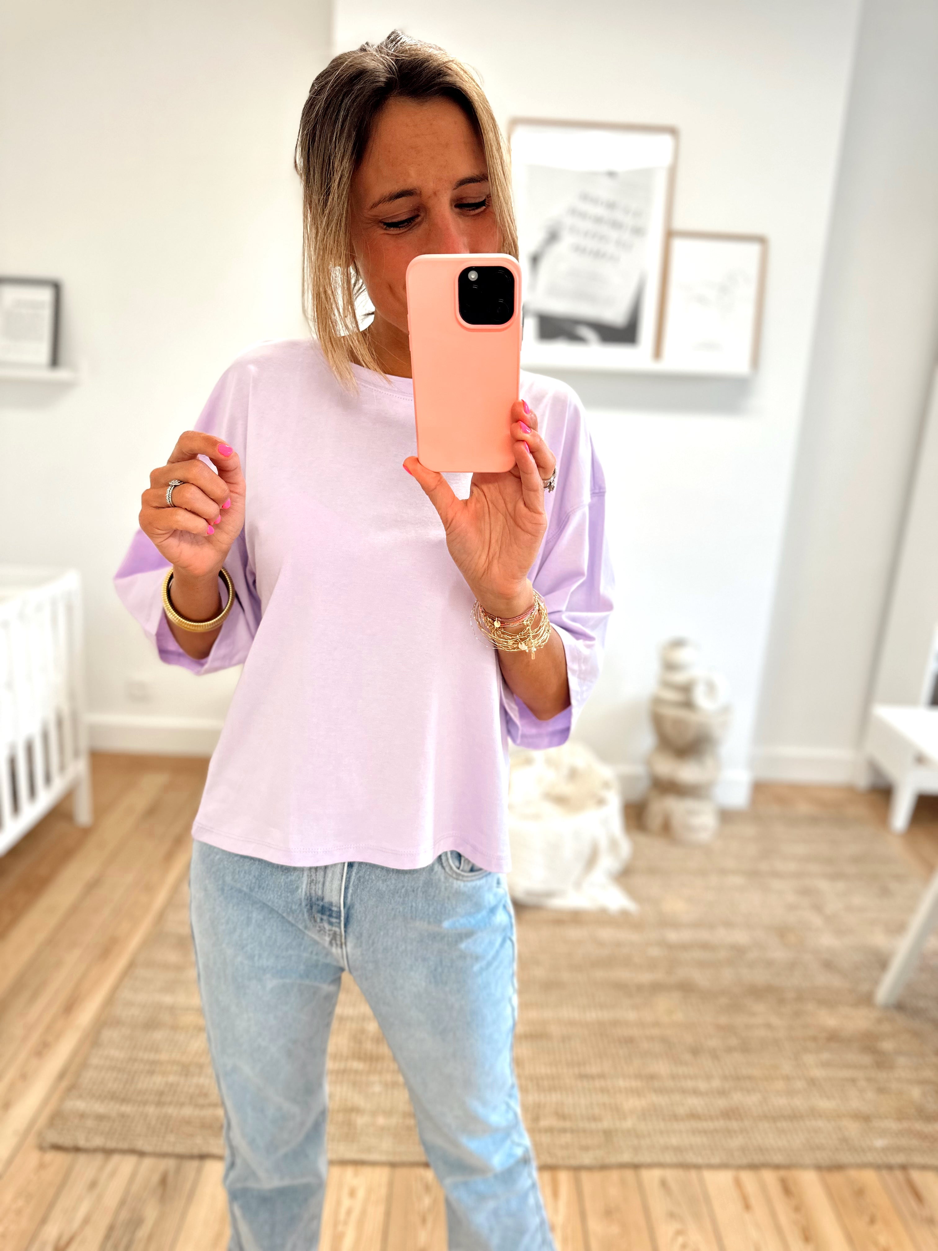T-shirt oversize, manches courtes. Col rond. Il est disponible en taille S/M et M/L. Le mannequin porte la taille S/M.
