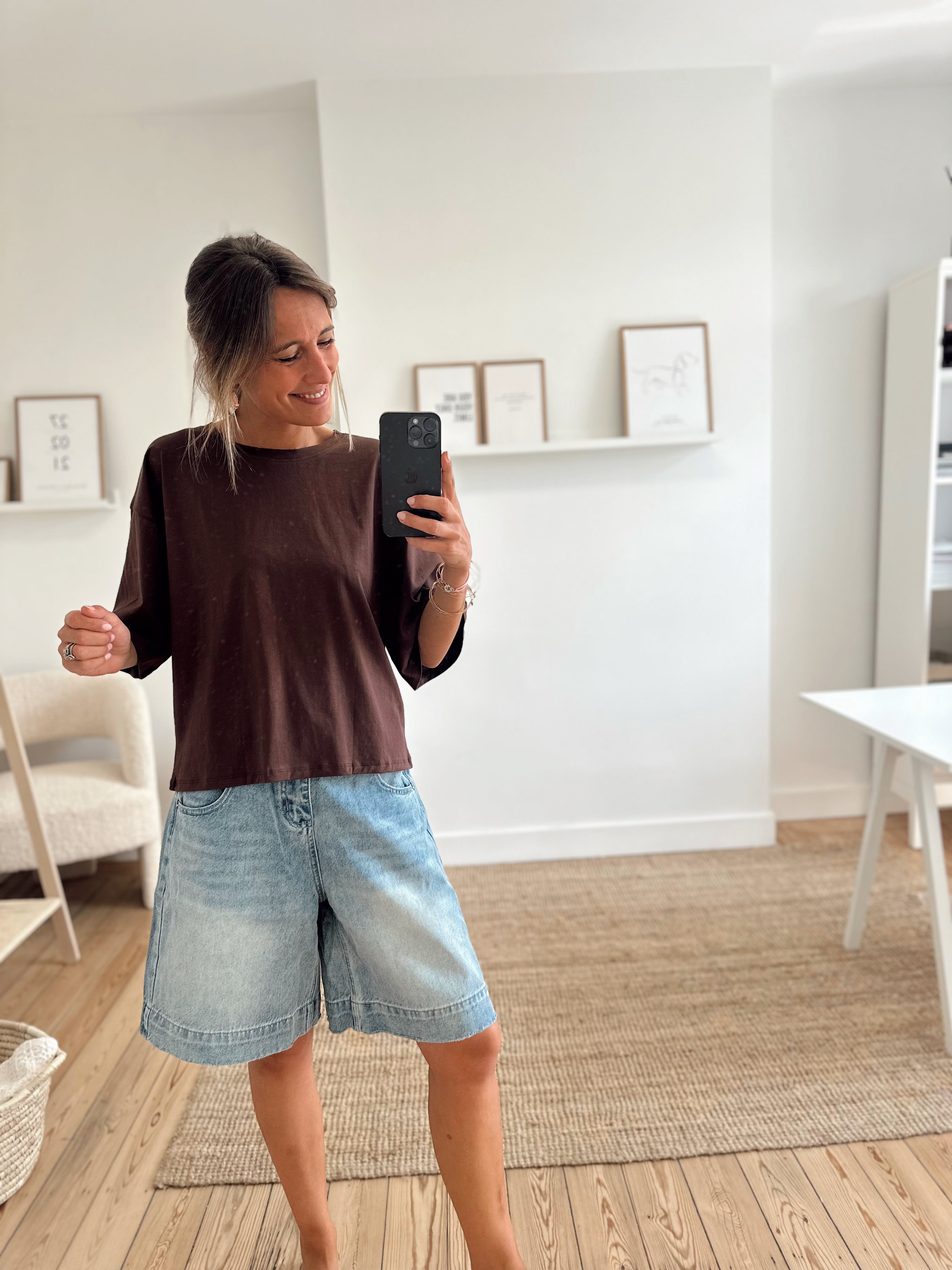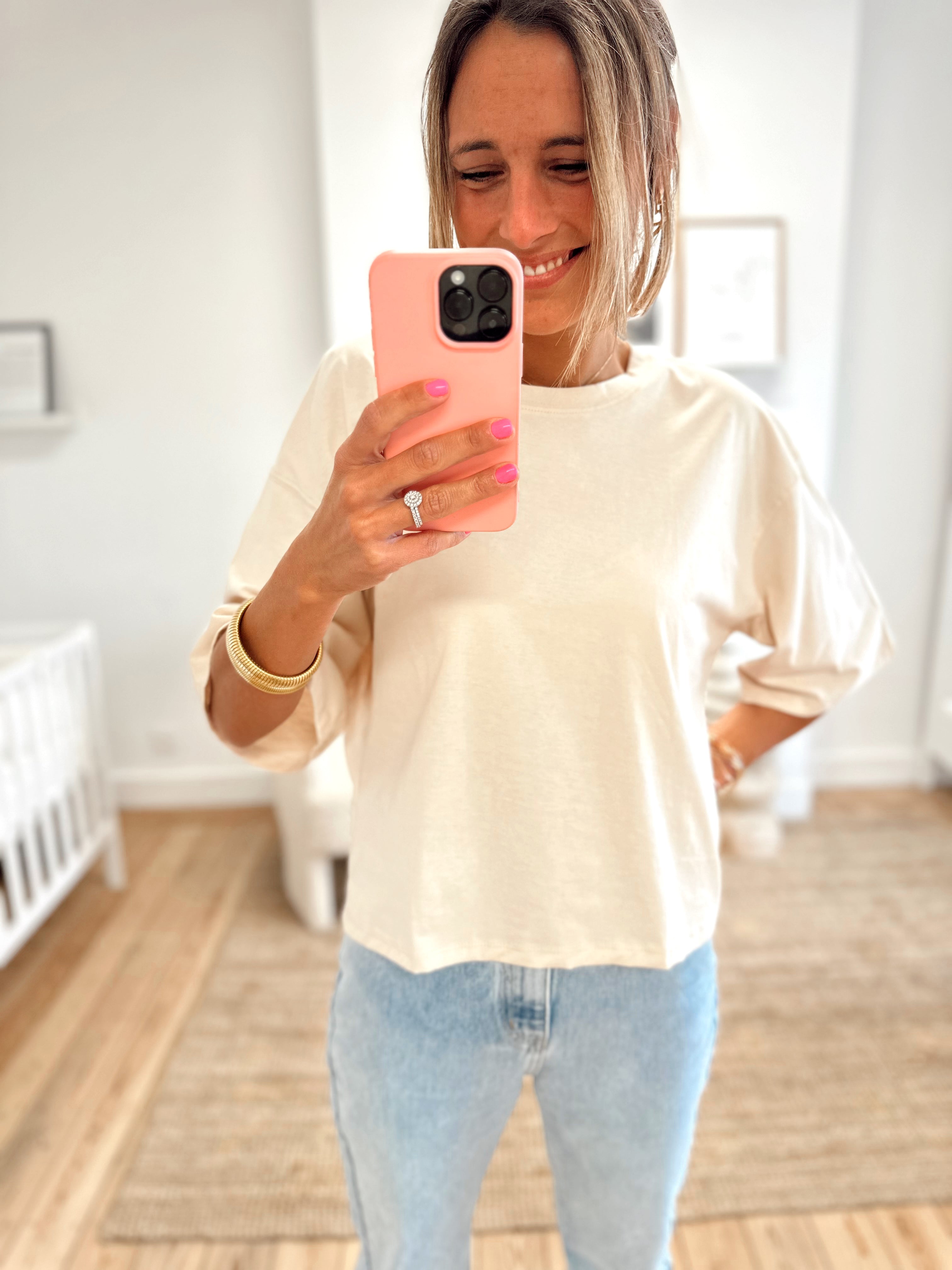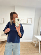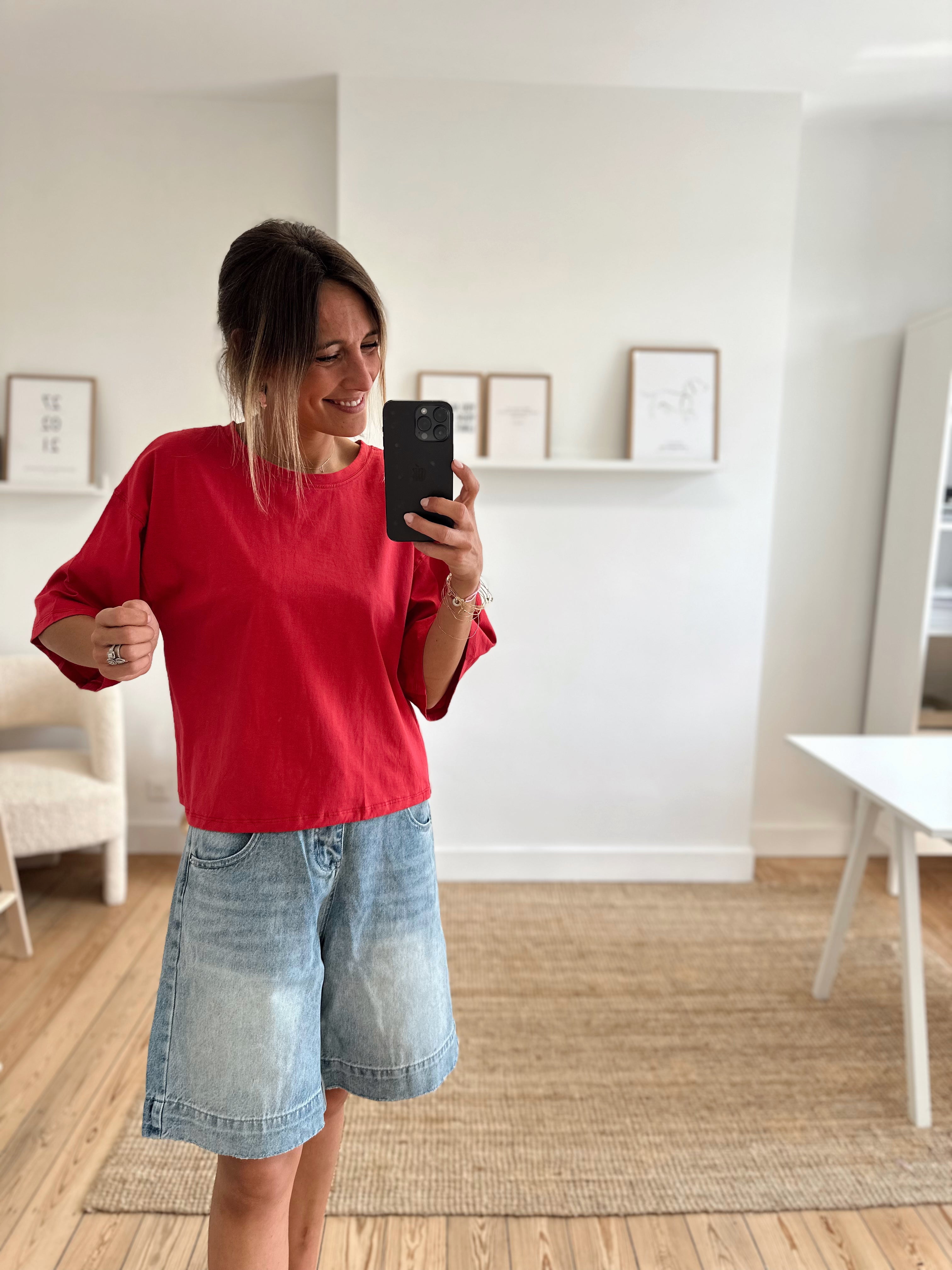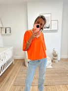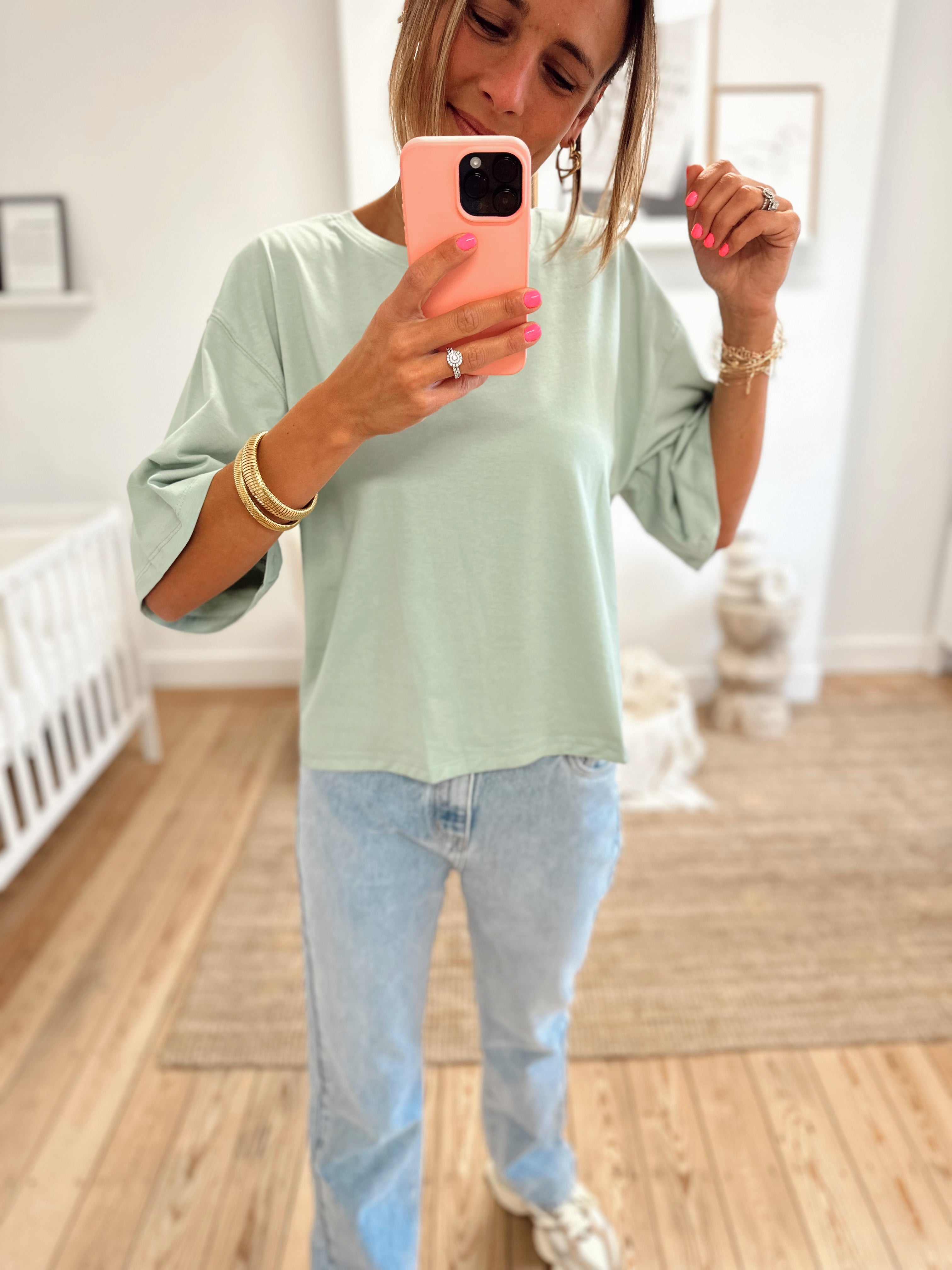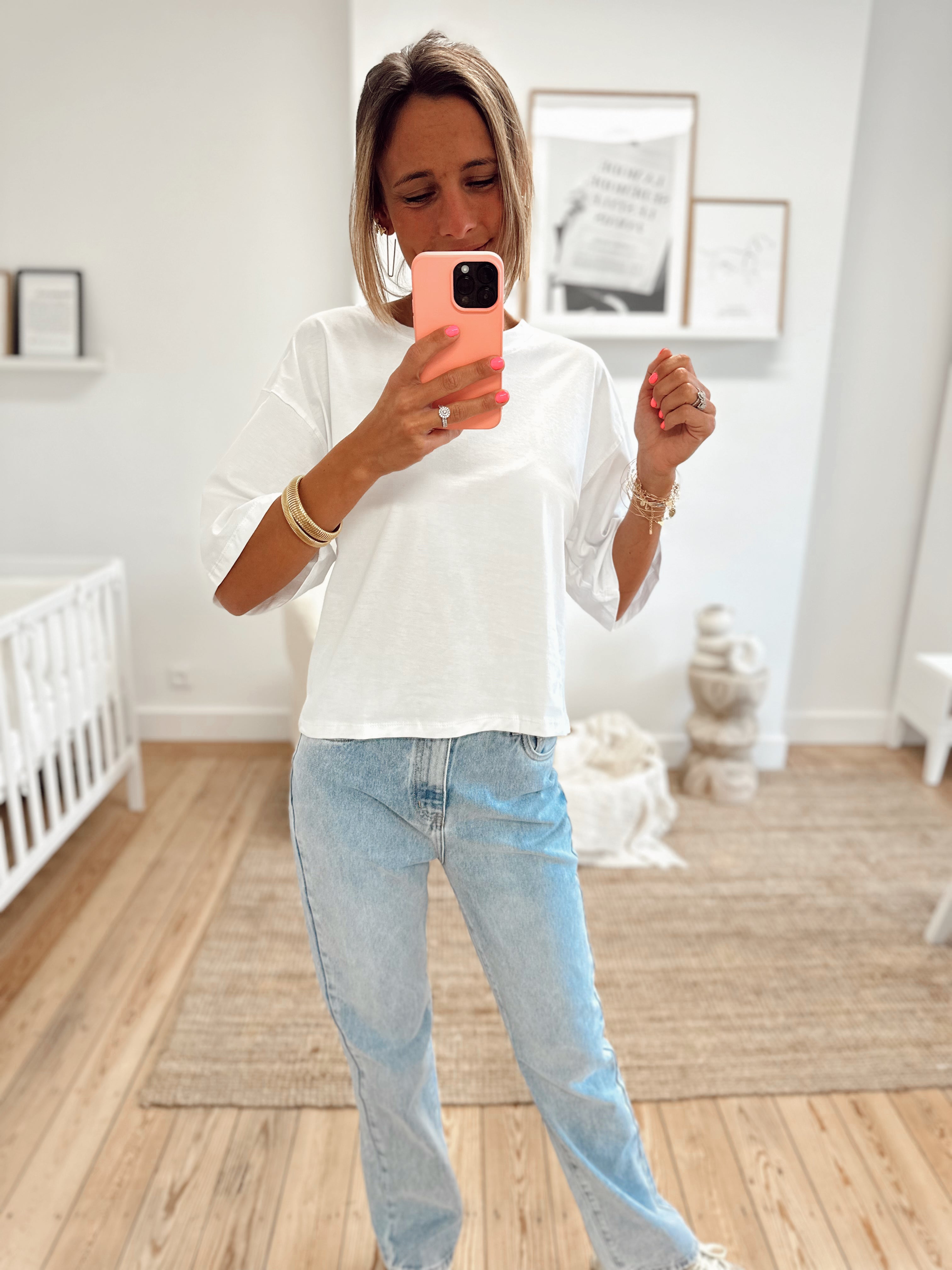 T-shirt oversize, manches courtes. Col rond. Il est disponible en taille S/M et M/L. Le mannequin porte la taille S/M.