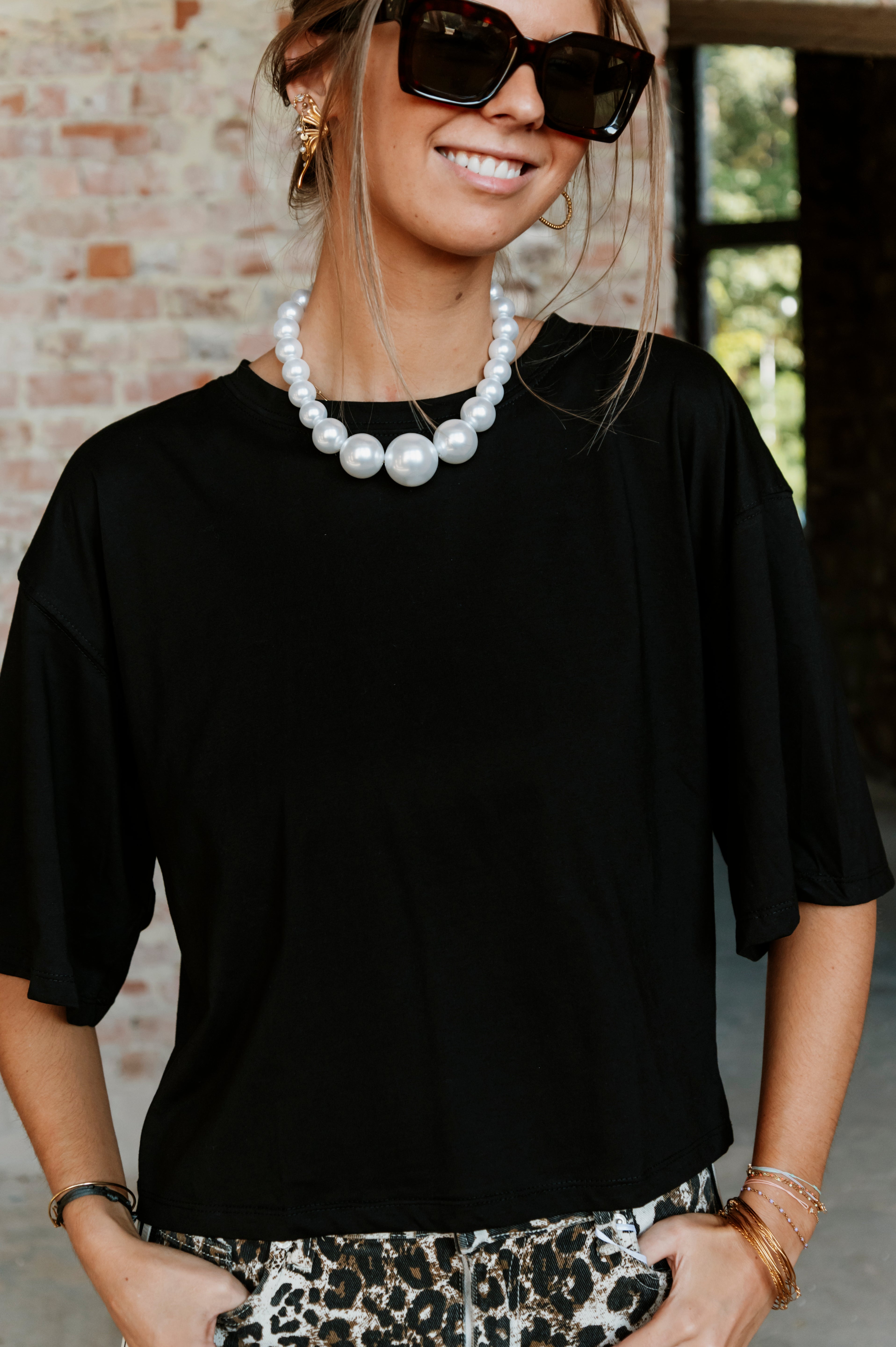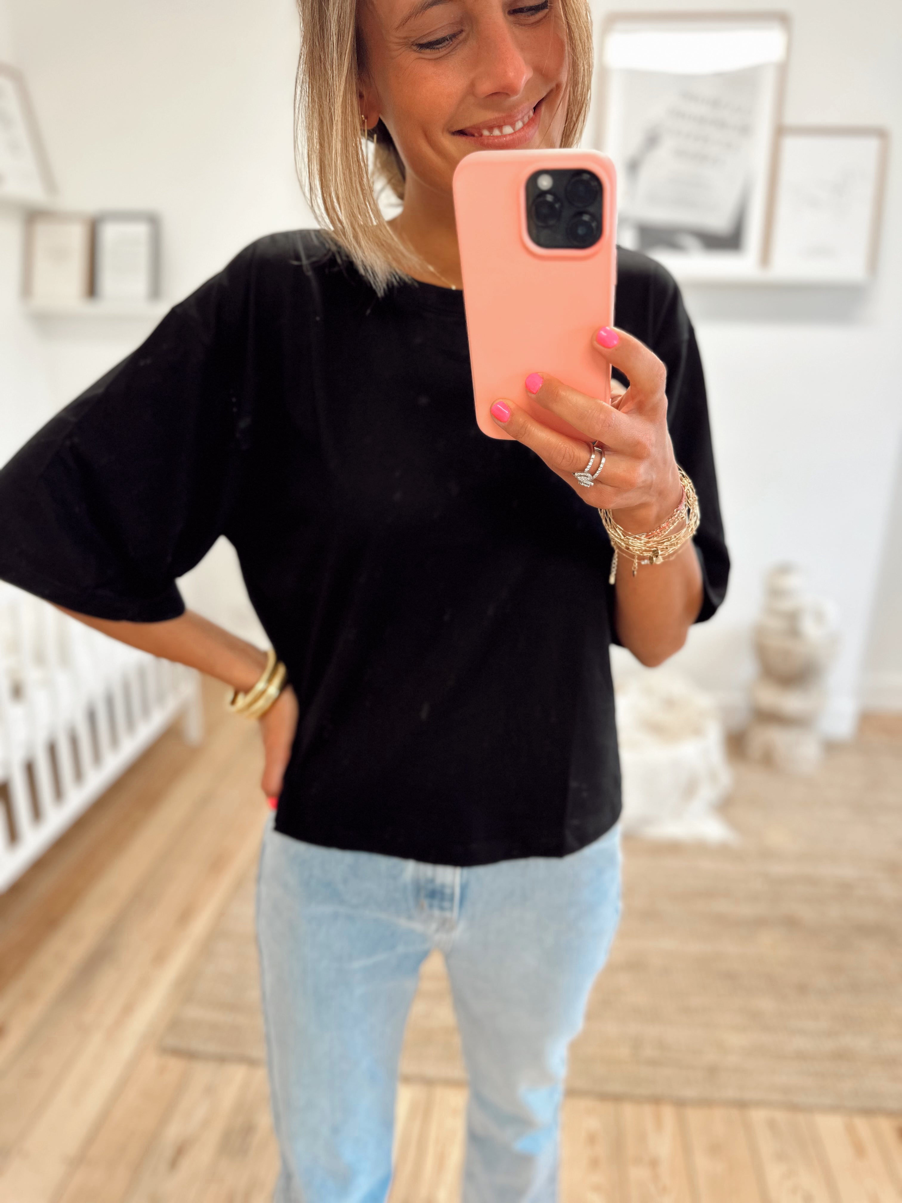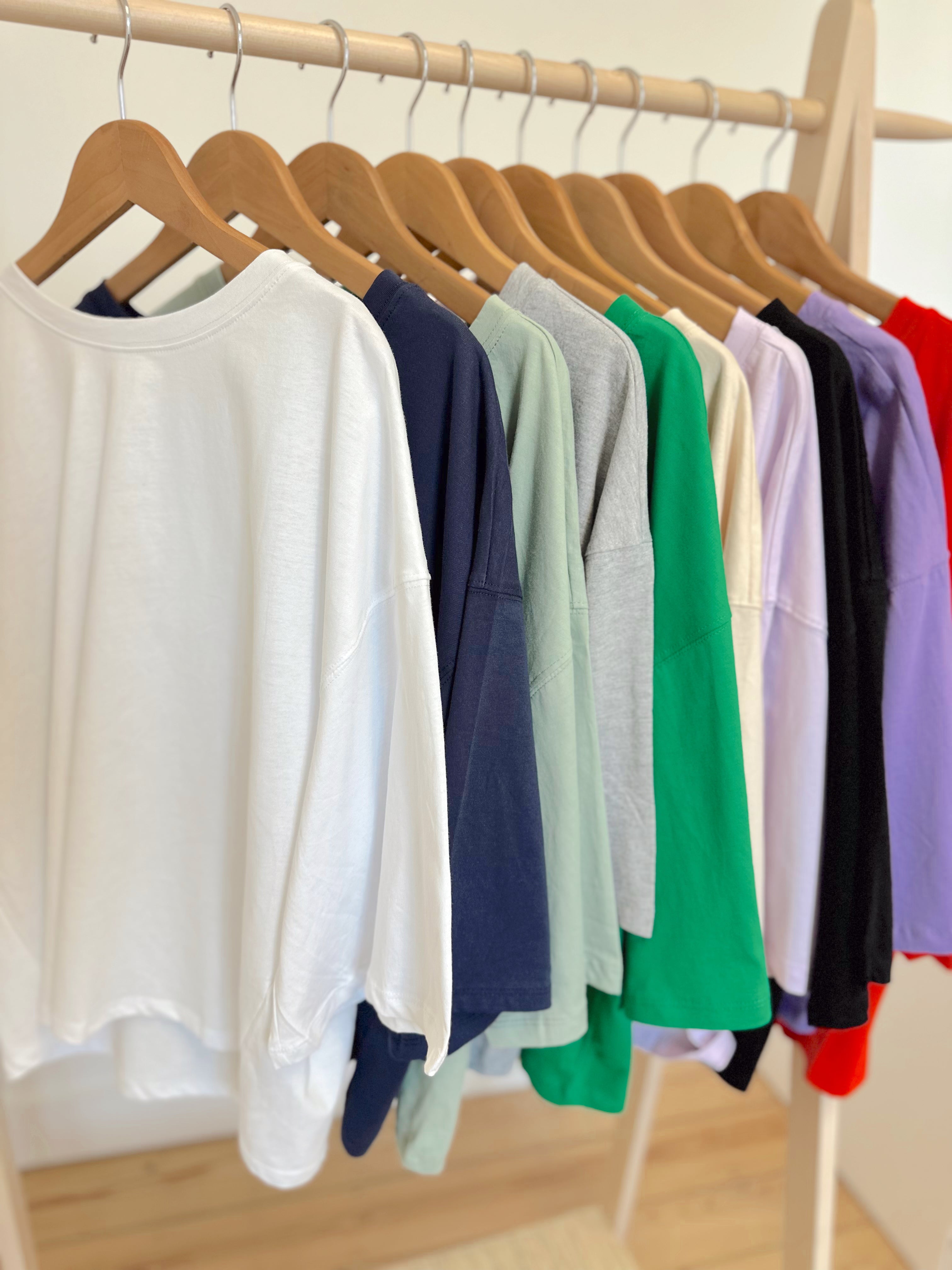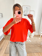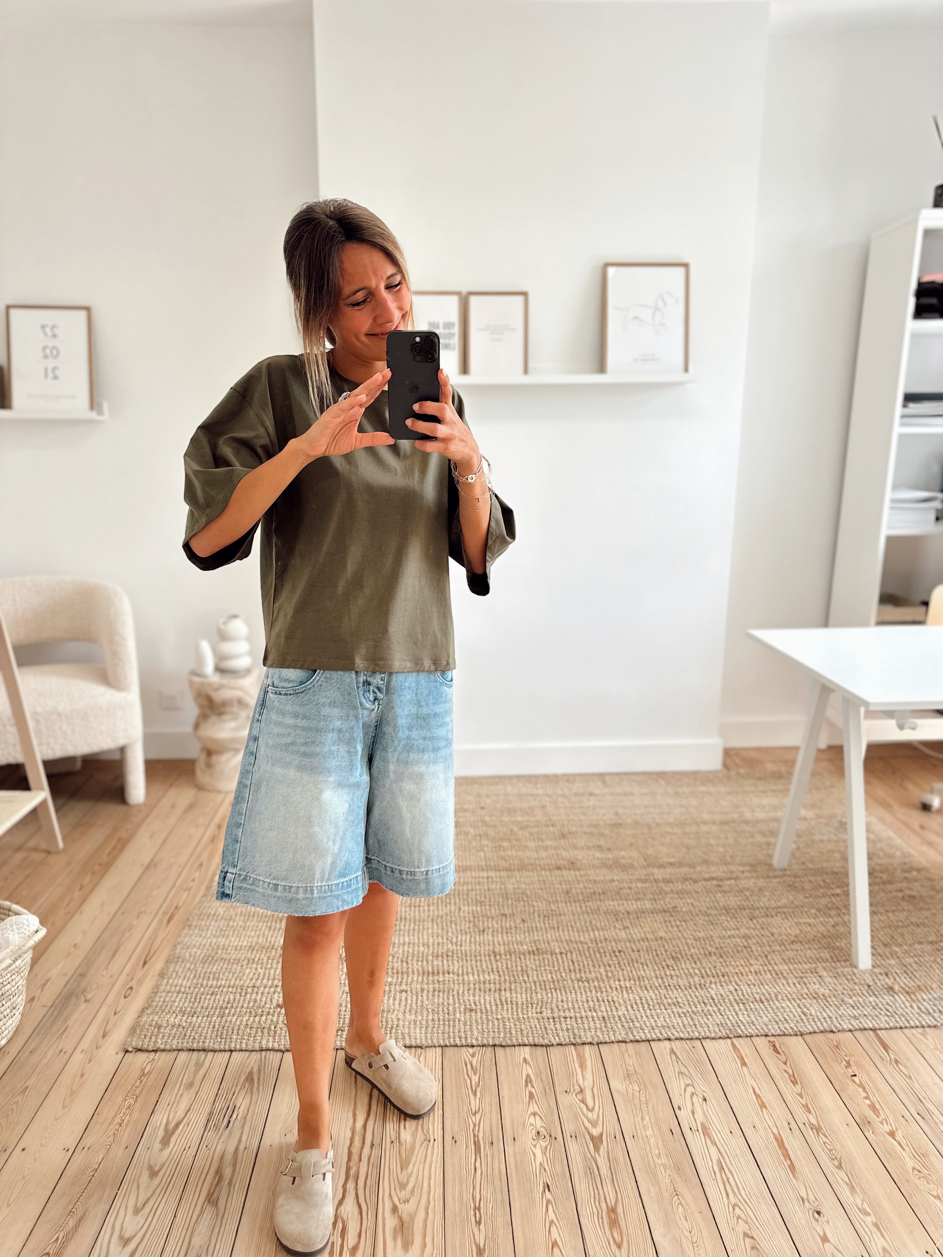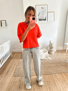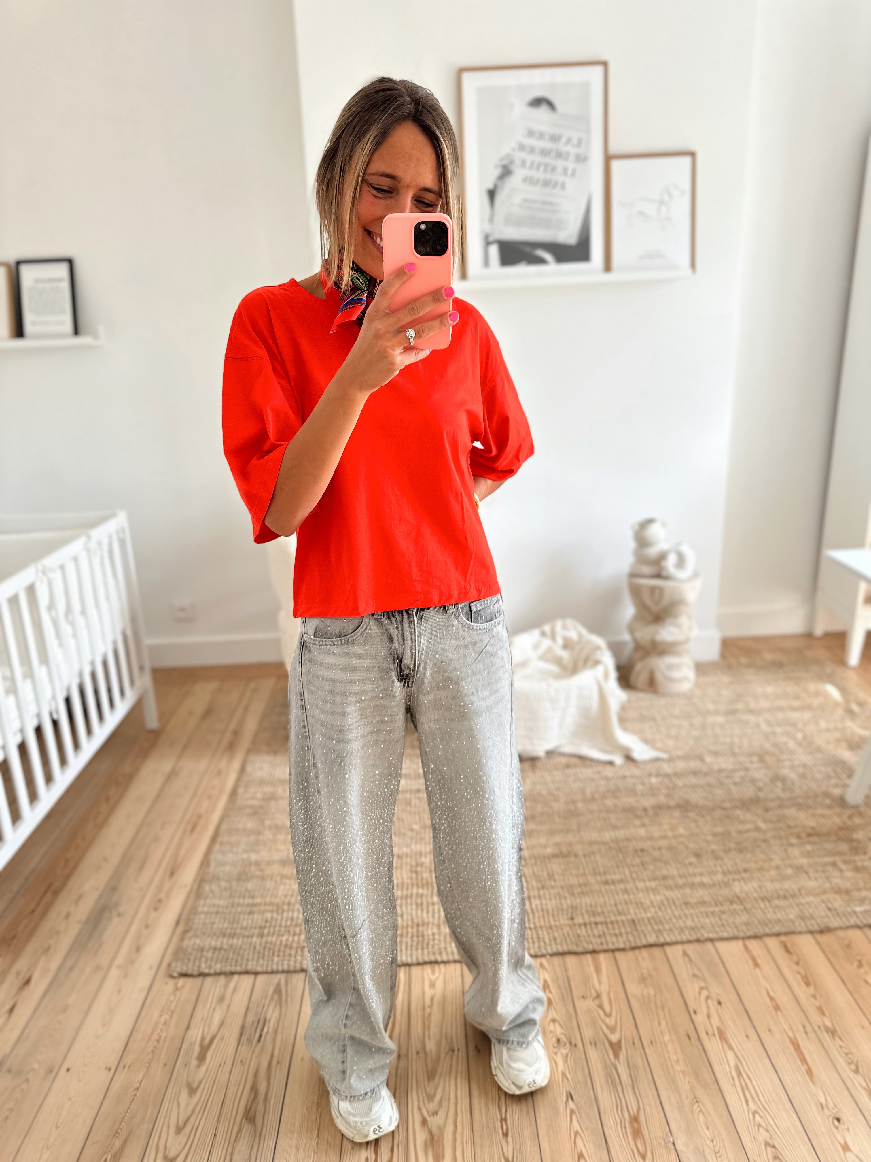 T-shirt oversize, manches courtes. Col rond. Il est disponible en taille S/M et M/L. Le mannequin porte la taille S/M.