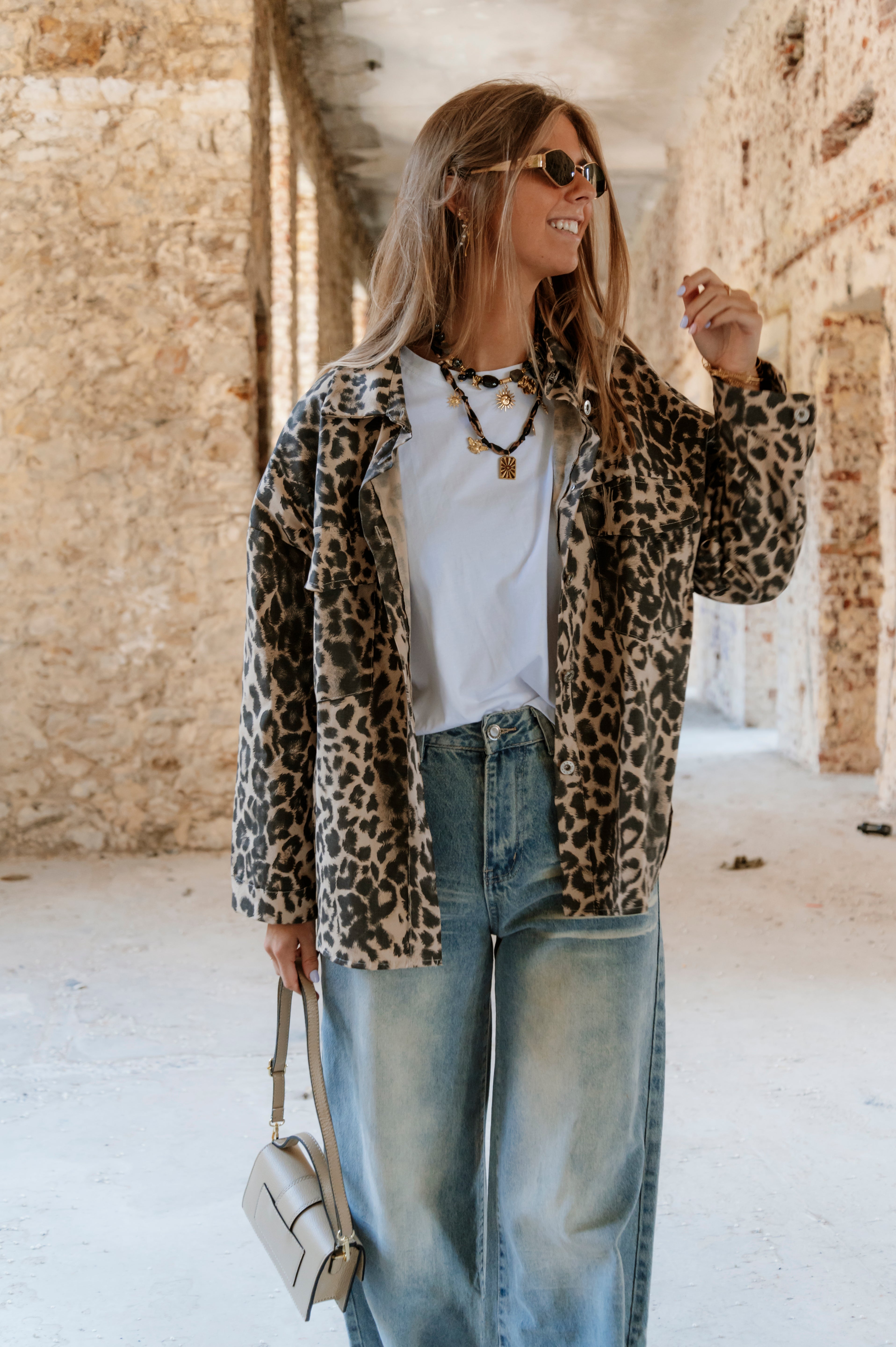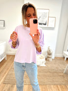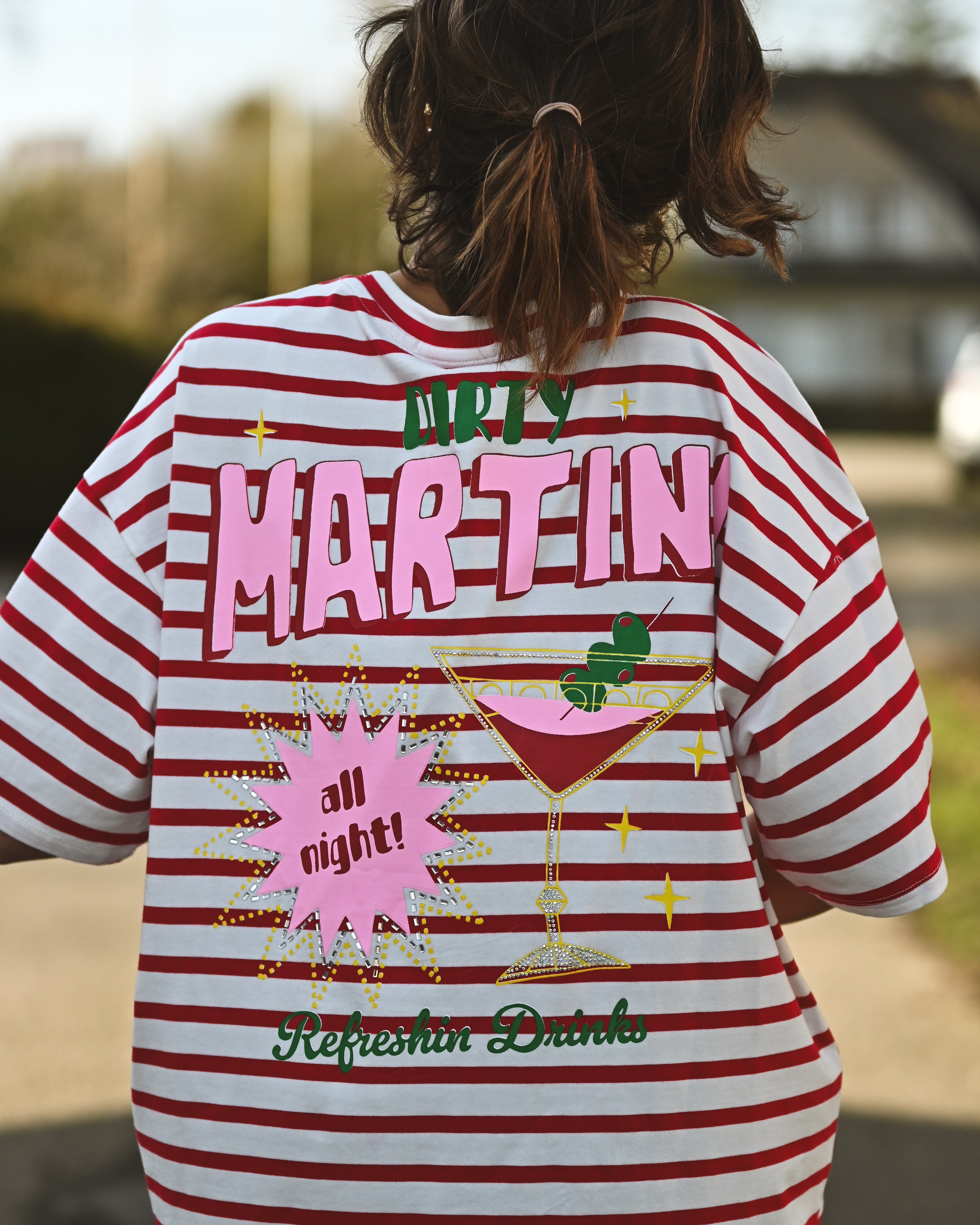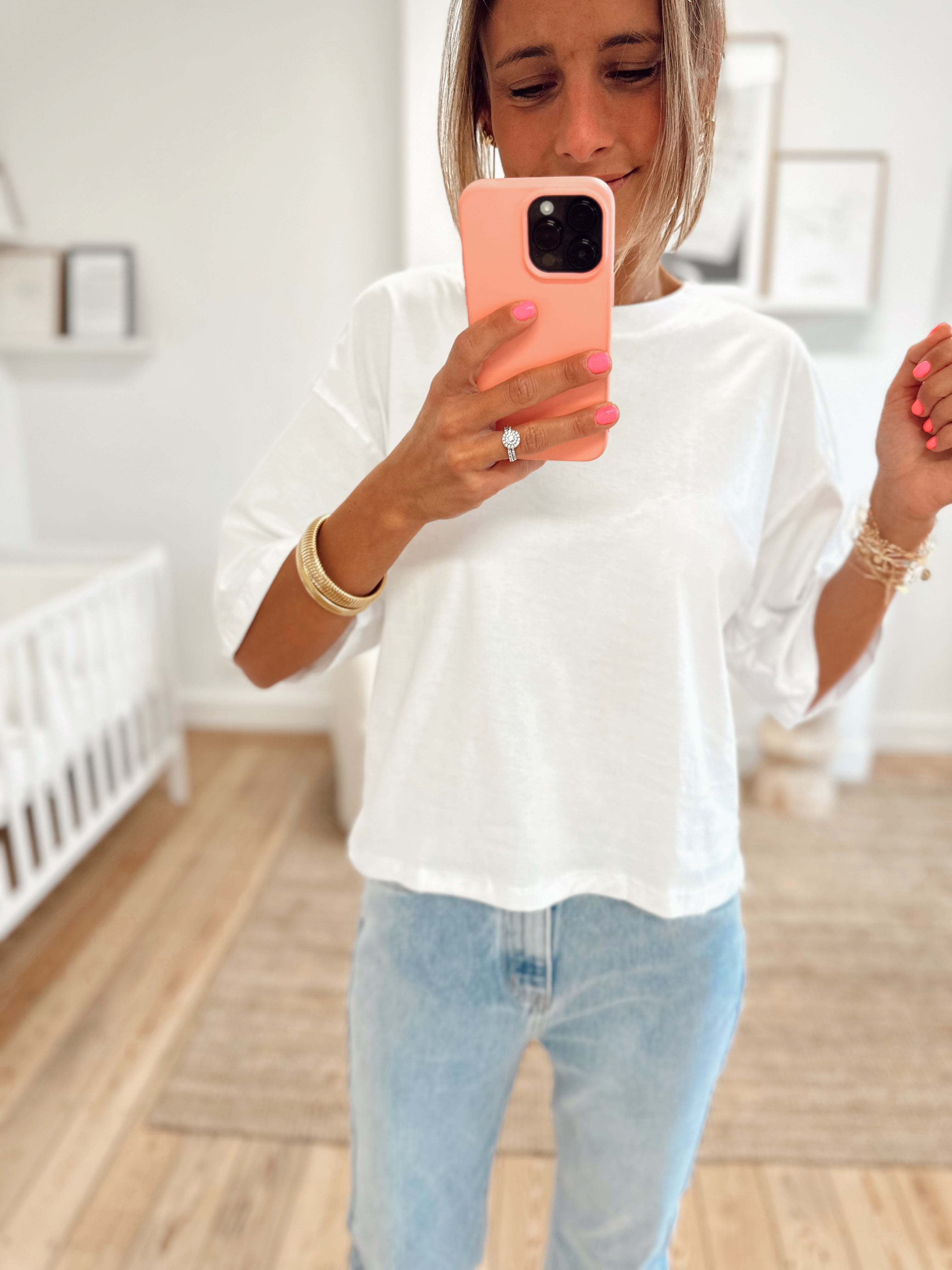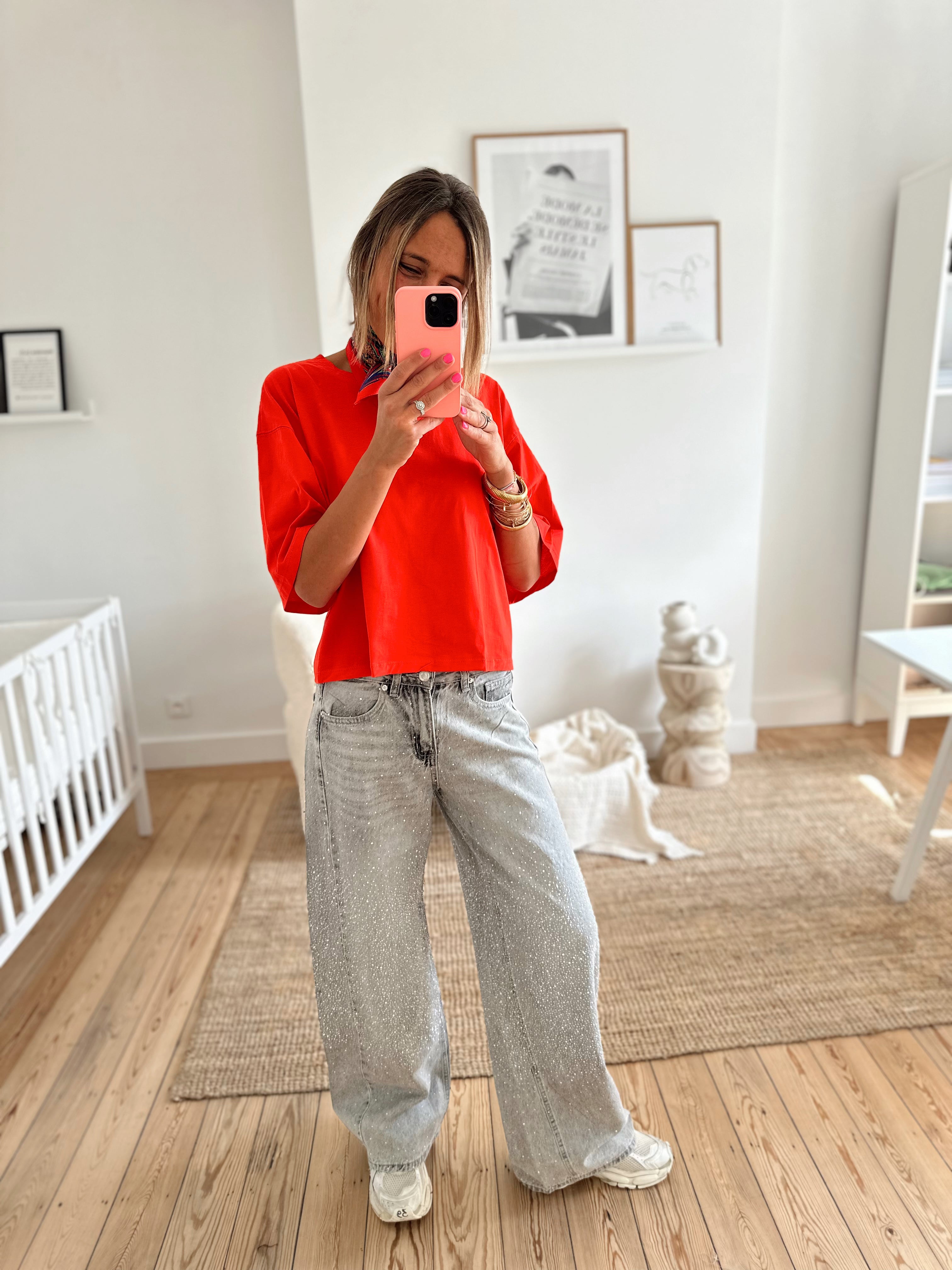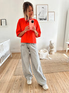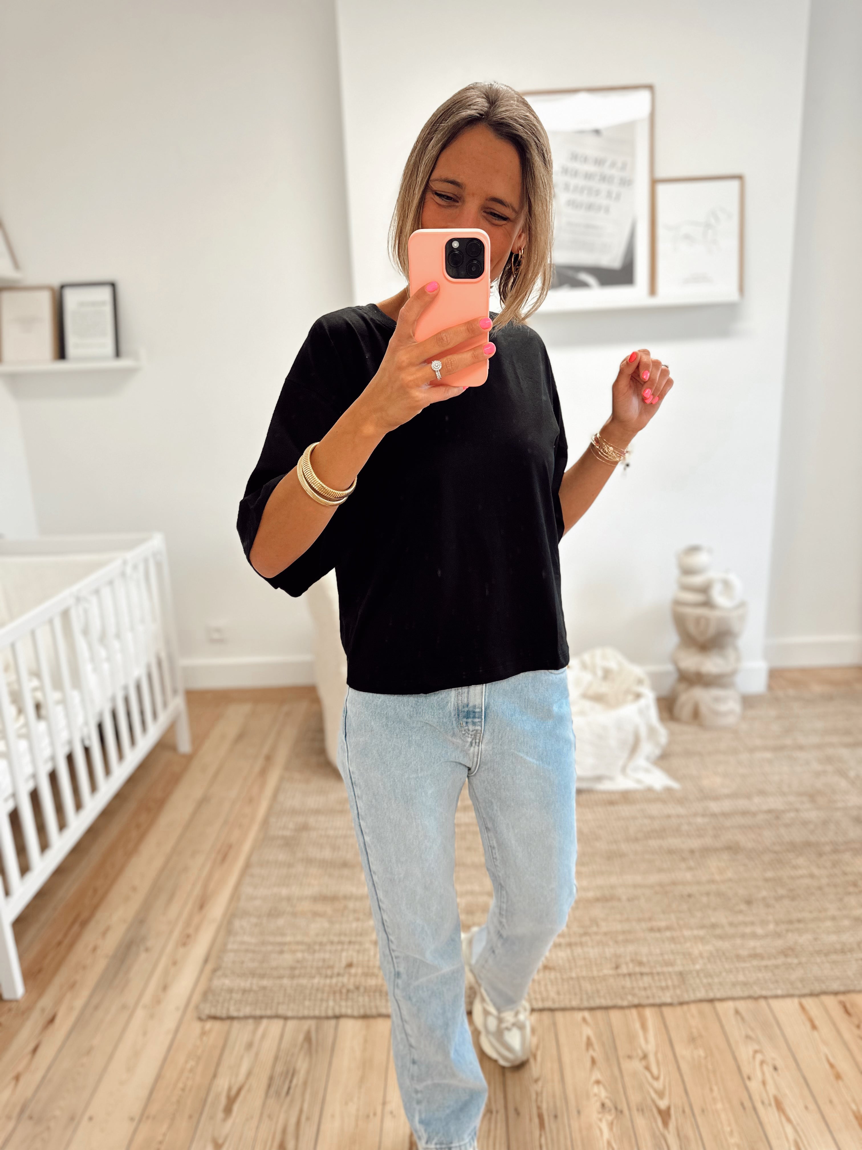 T-shirt oversize, manches courtes. Col rond. Il est disponible en taille S/M et M/L. Le mannequin porte la taille S/M.