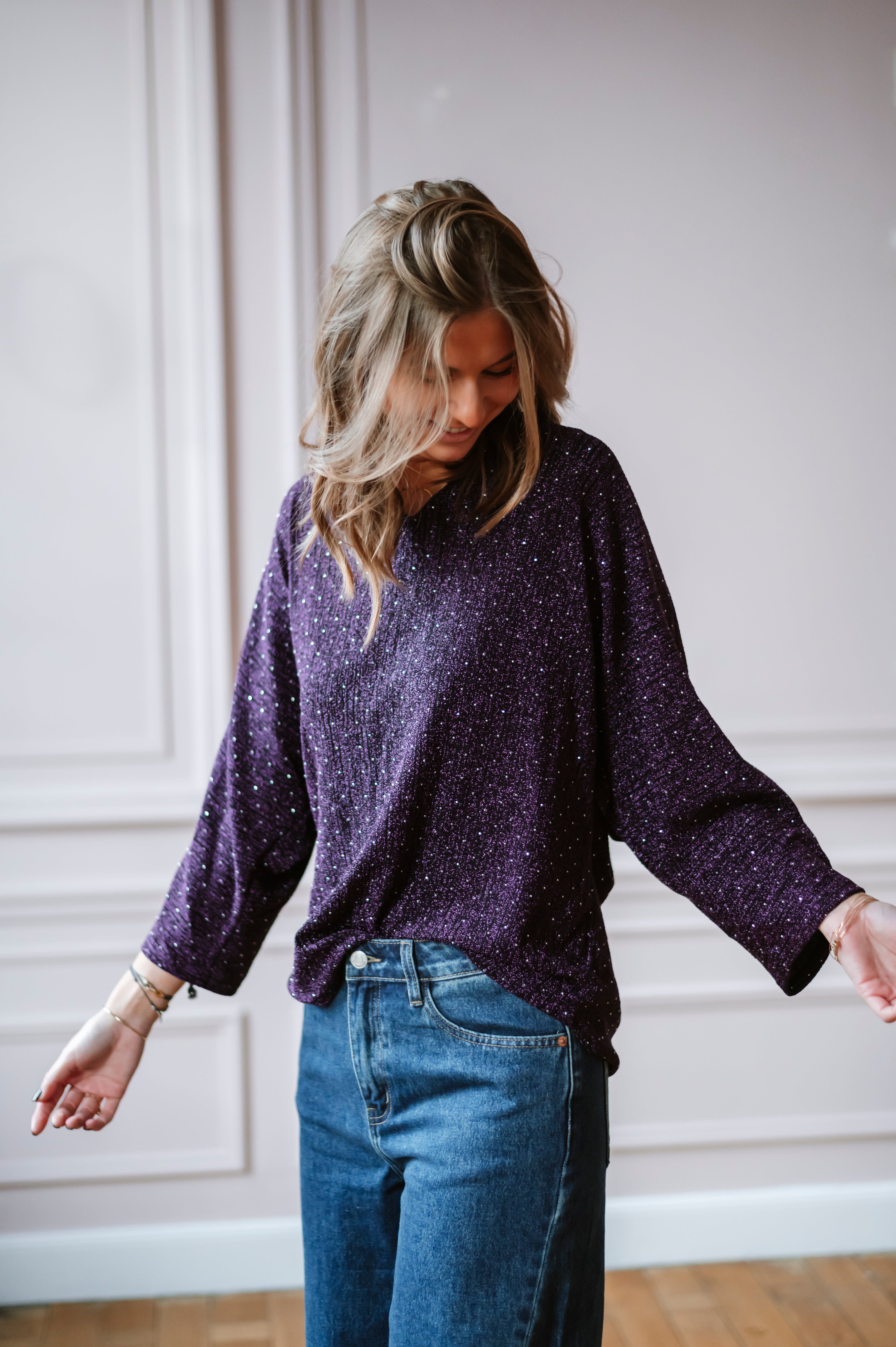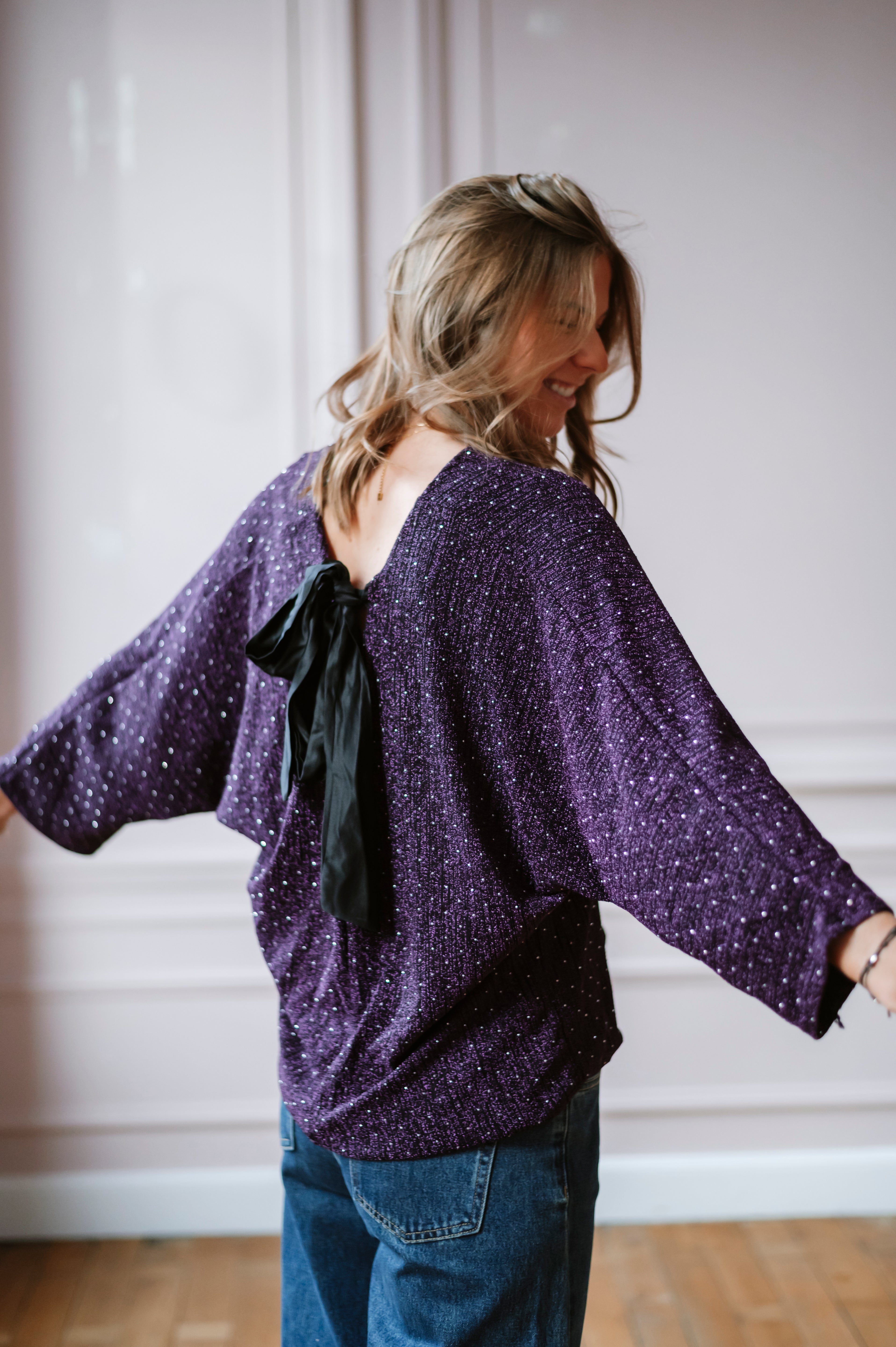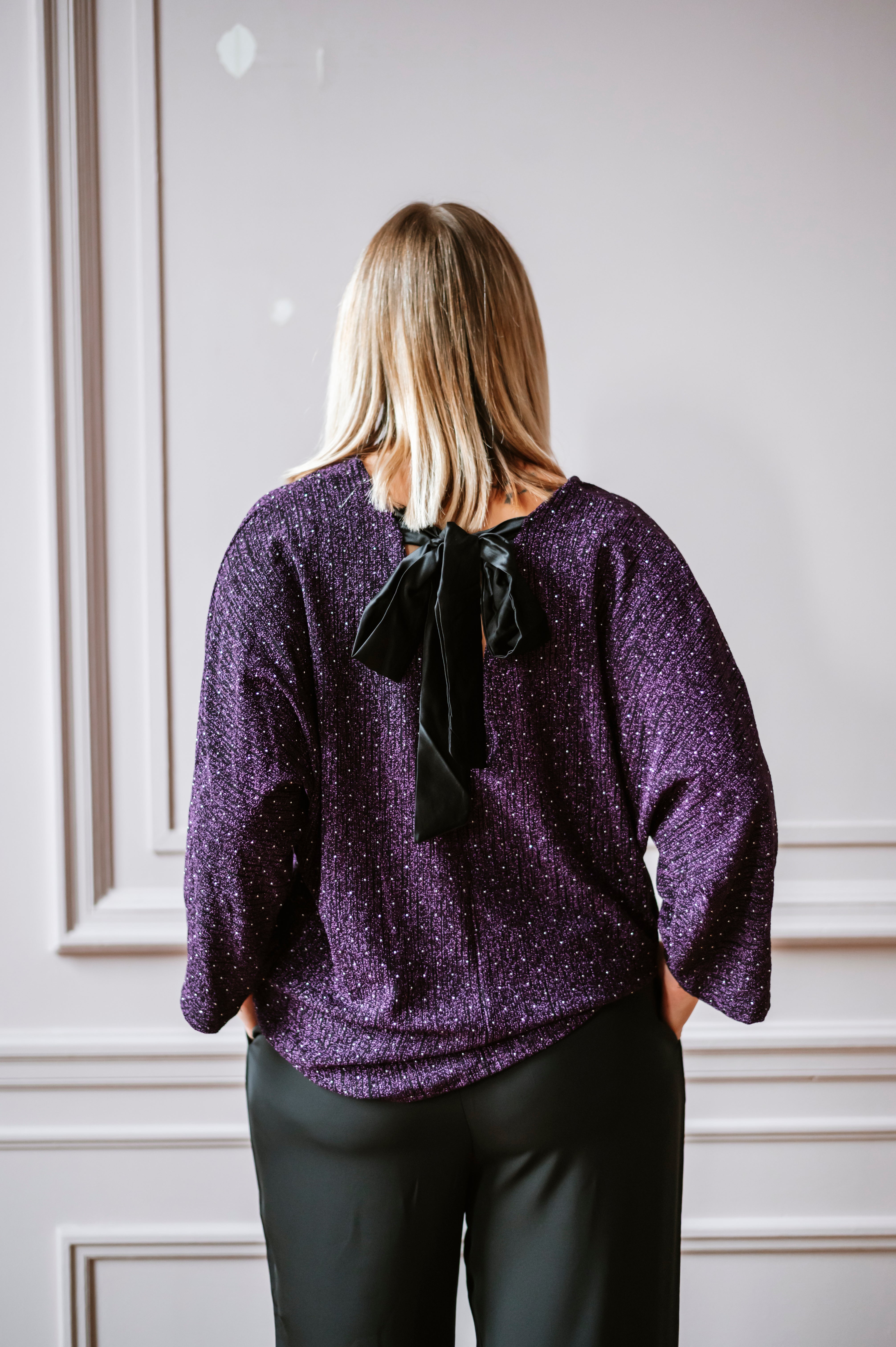 Découvrez la blouse EMILY, une pièce alliant élégance et sophistication. Ses manches chauve-souris ornées de paillettes et strass captent la lumière à chaque mouvement, tandis que le col V flatteuse et le nœud satiné dans le dos ajoutent une touche de féminité. Disponible en taille unique, cette blouse transforme instantanément votre silhouette pour un look irrésistible.