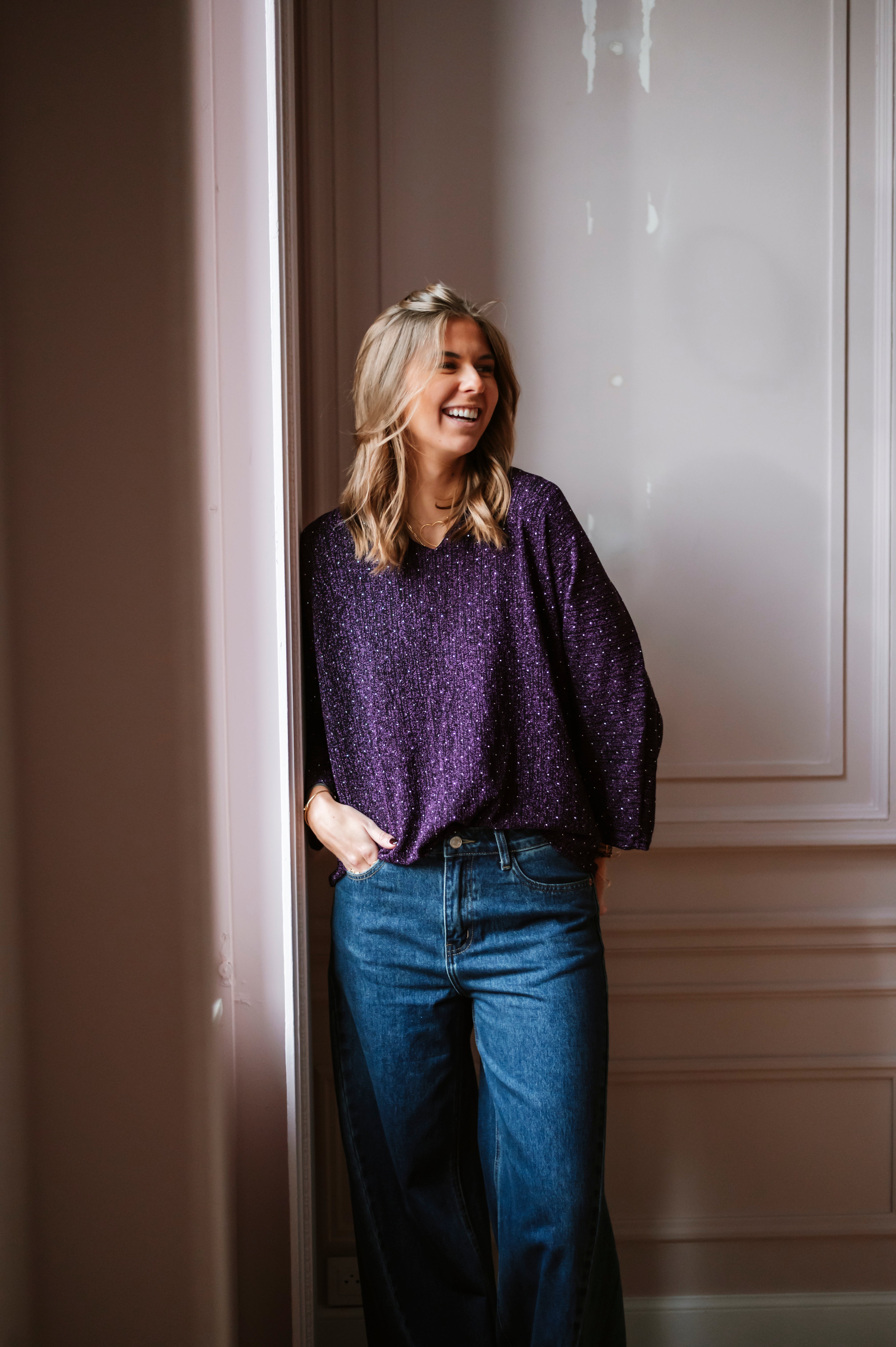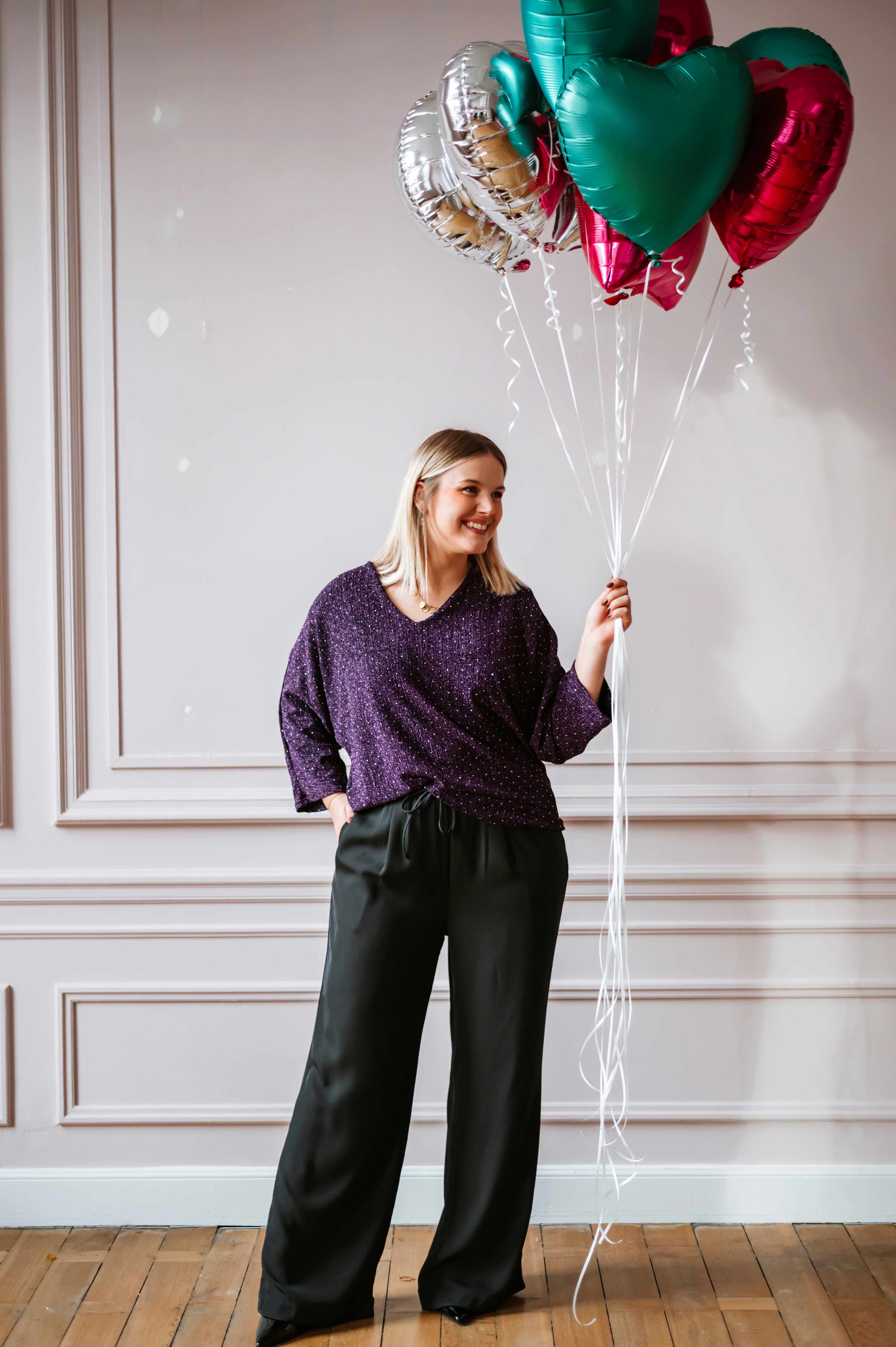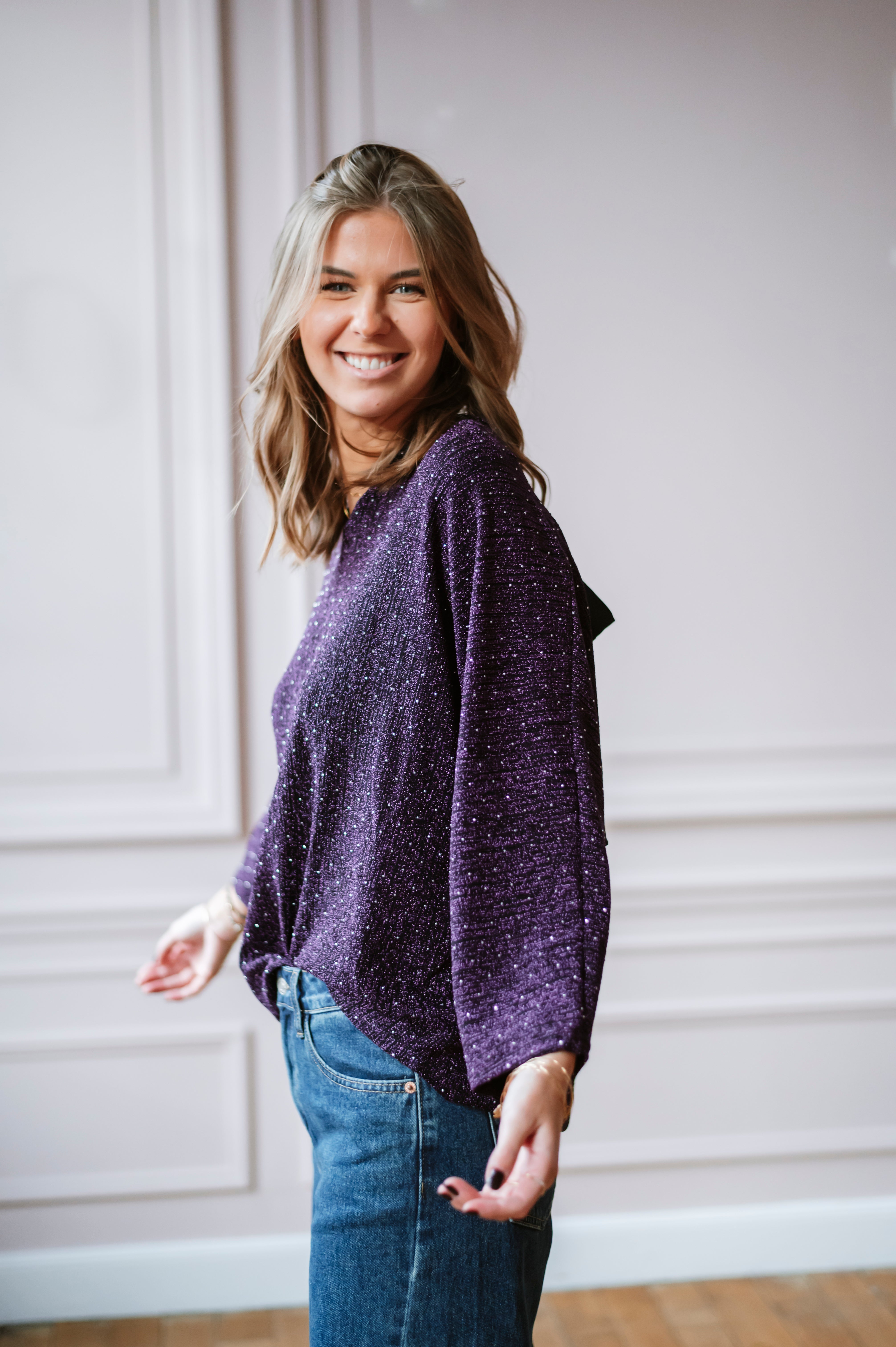 Découvrez la blouse EMILY, une pièce alliant élégance et sophistication. Ses manches chauve-souris ornées de paillettes et strass captent la lumière à chaque mouvement, tandis que le col V flatteuse et le nœud satiné dans le dos ajoutent une touche de féminité. Disponible en taille unique, cette blouse transforme instantanément votre silhouette pour un look irrésistible.