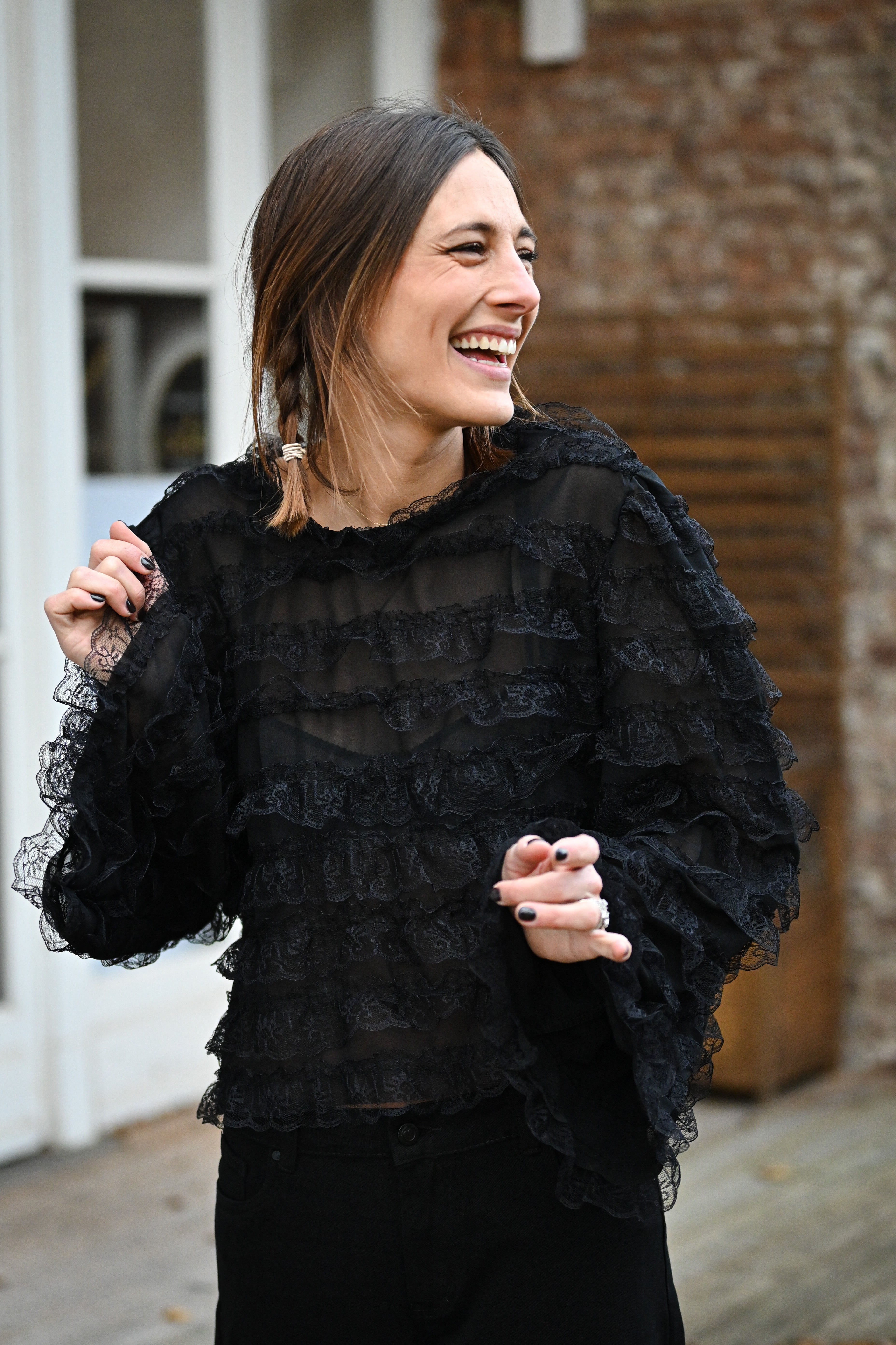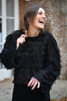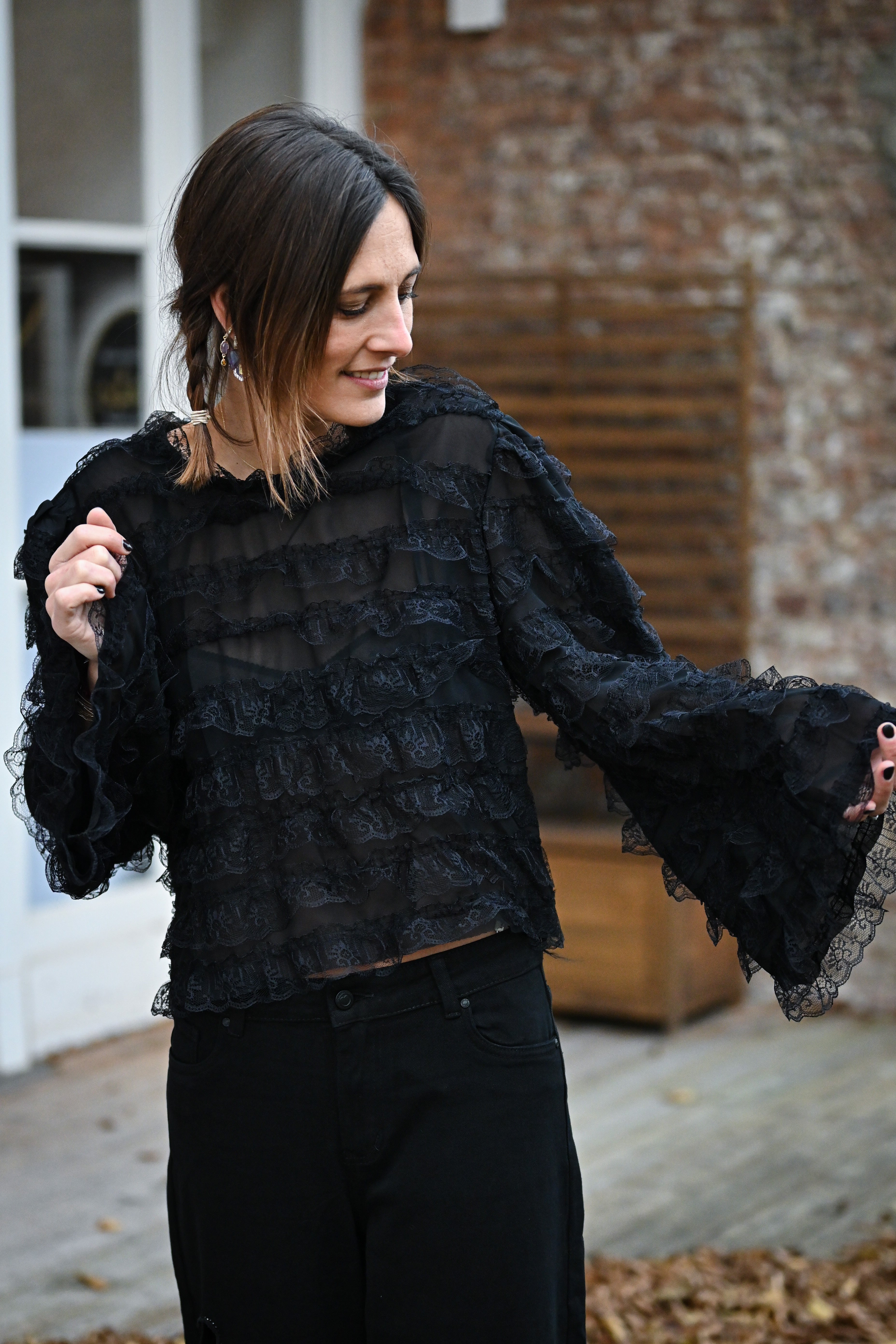 Découvrez la blouse TIANA, une pièce en noir total. Ses manches évasées ornées de volants ajoutent une touche de féminité et de mouvement à votre silhouette. Entièrement transparente, elle se porte facilement en superposition pour un style sophistiqué et tendance. Disponible en taille unique.