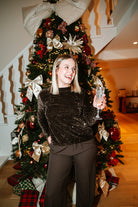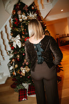Transformez votre silhouette avec cette blouse chocolat scintillante ornée de nœuds en satin noir. Portez-la dos nu ou classique selon vos envies – deux looks en un pour plus de polyvalence. Les sequins captent la lumière pour un effet glamour assuré, tandis que les nœuds ajoutent une touche de sophistication. Parfaite pour les occasions spéciales qui demandent du caractère.