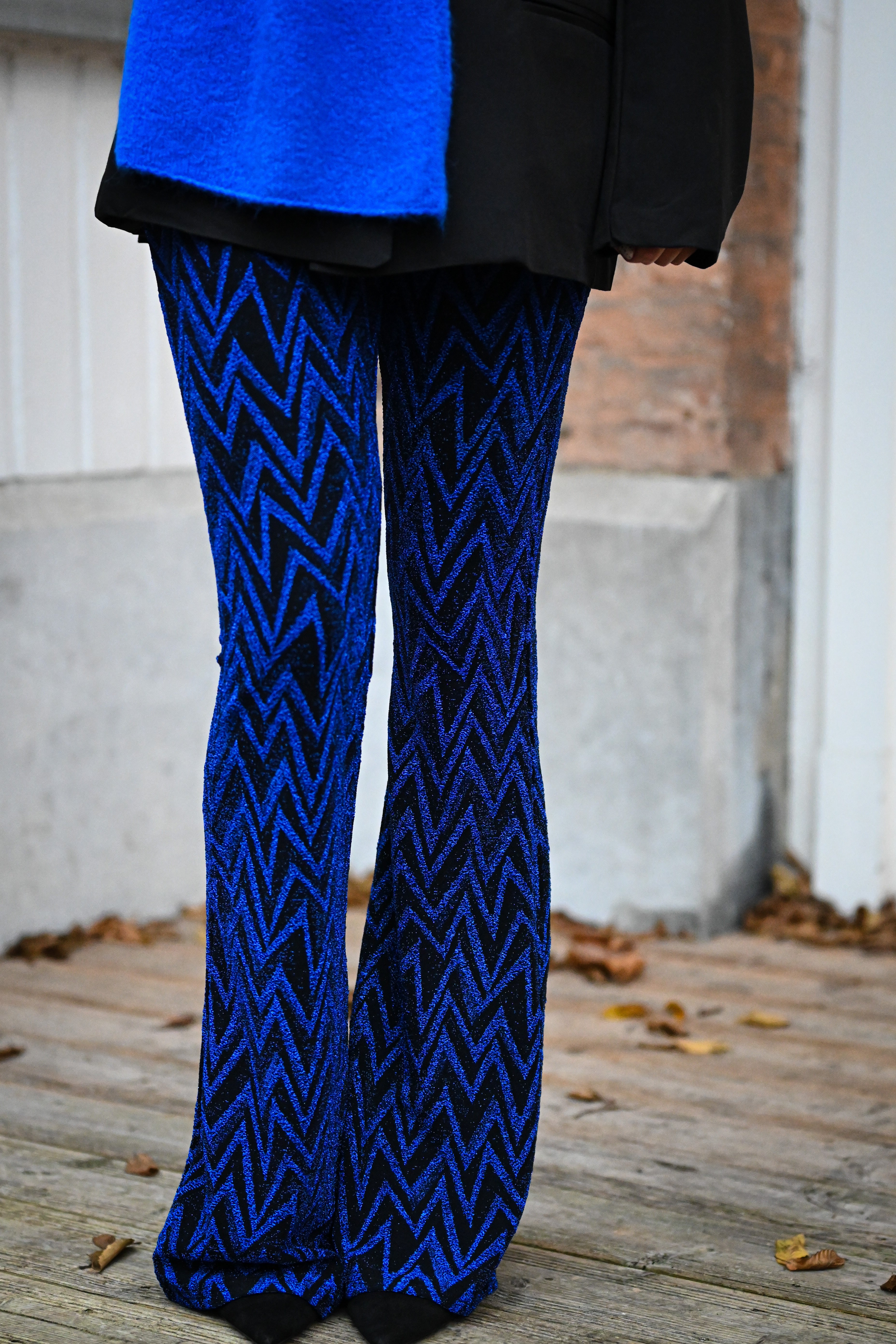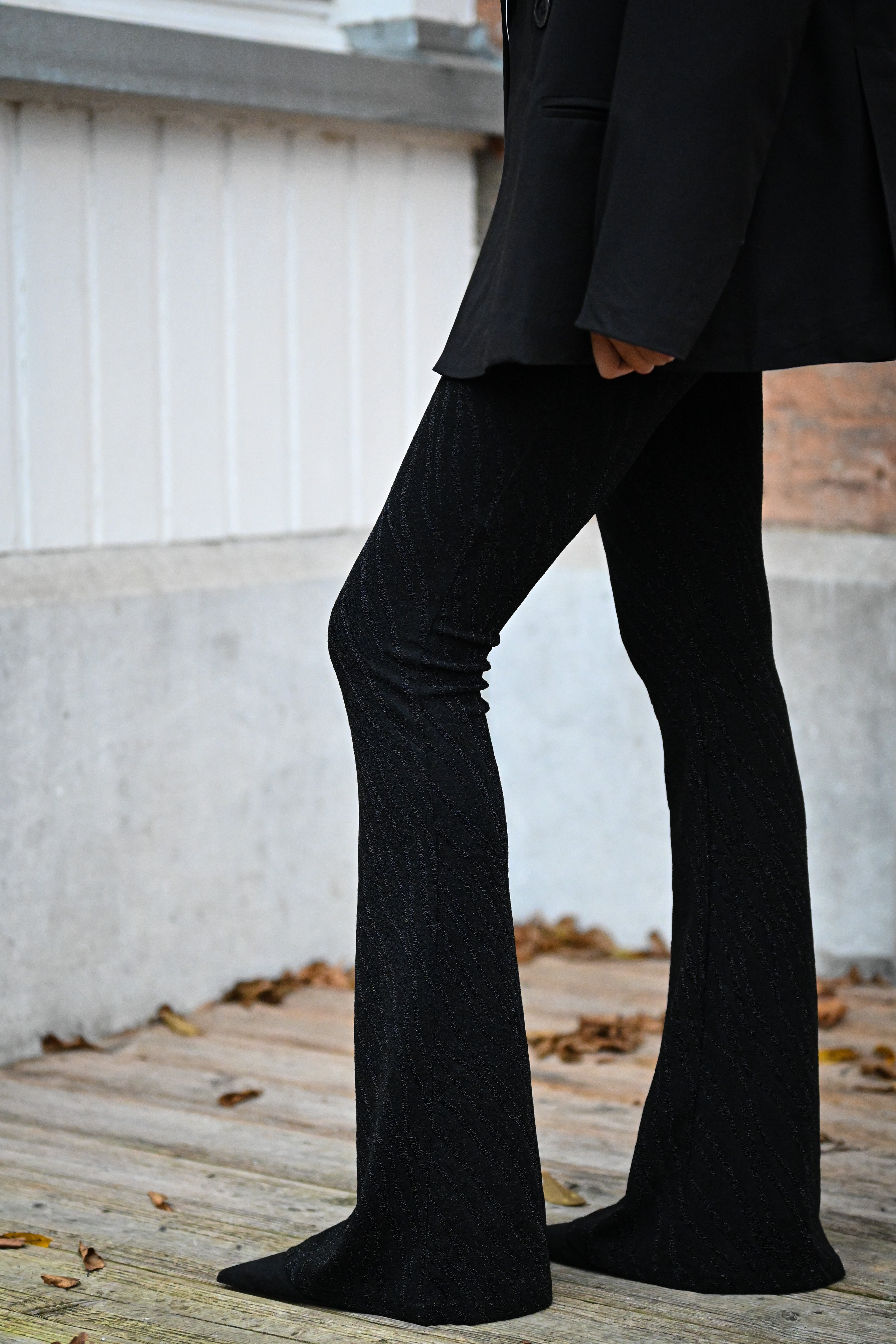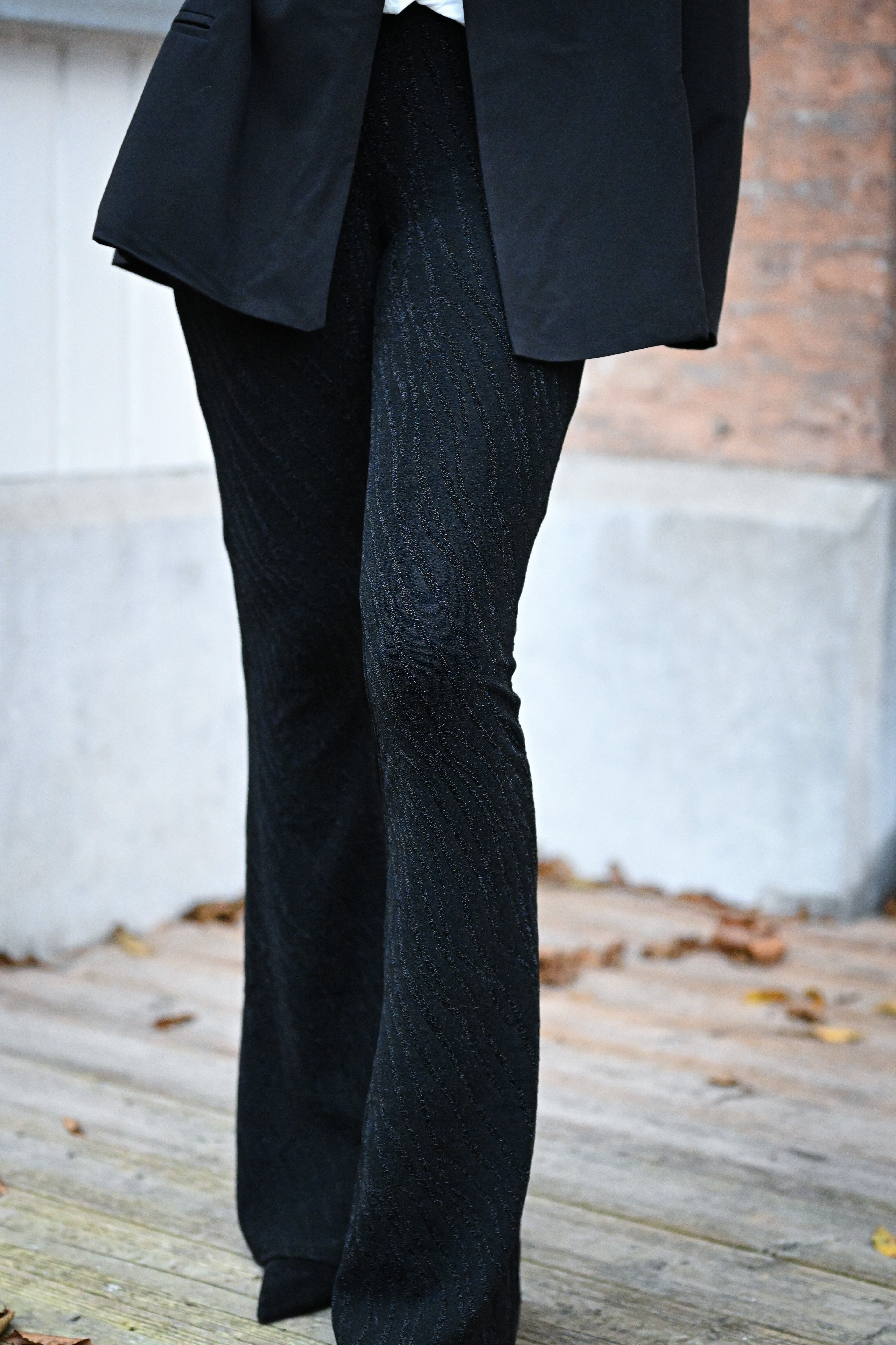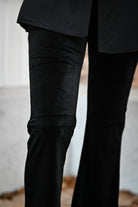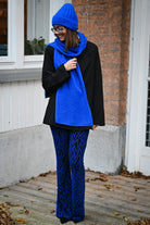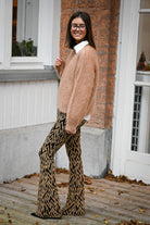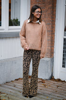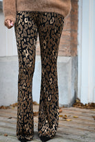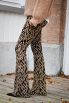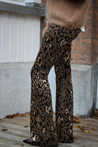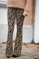 Ce pantalon est proposé en plusieurs couleurs et motifs, avec une coupe ajustée sur les cuisses et évasée en bas. Confectionné dans une matière douce et extensible, il assure un confort optimal. Disponible en tailles S, M et L.