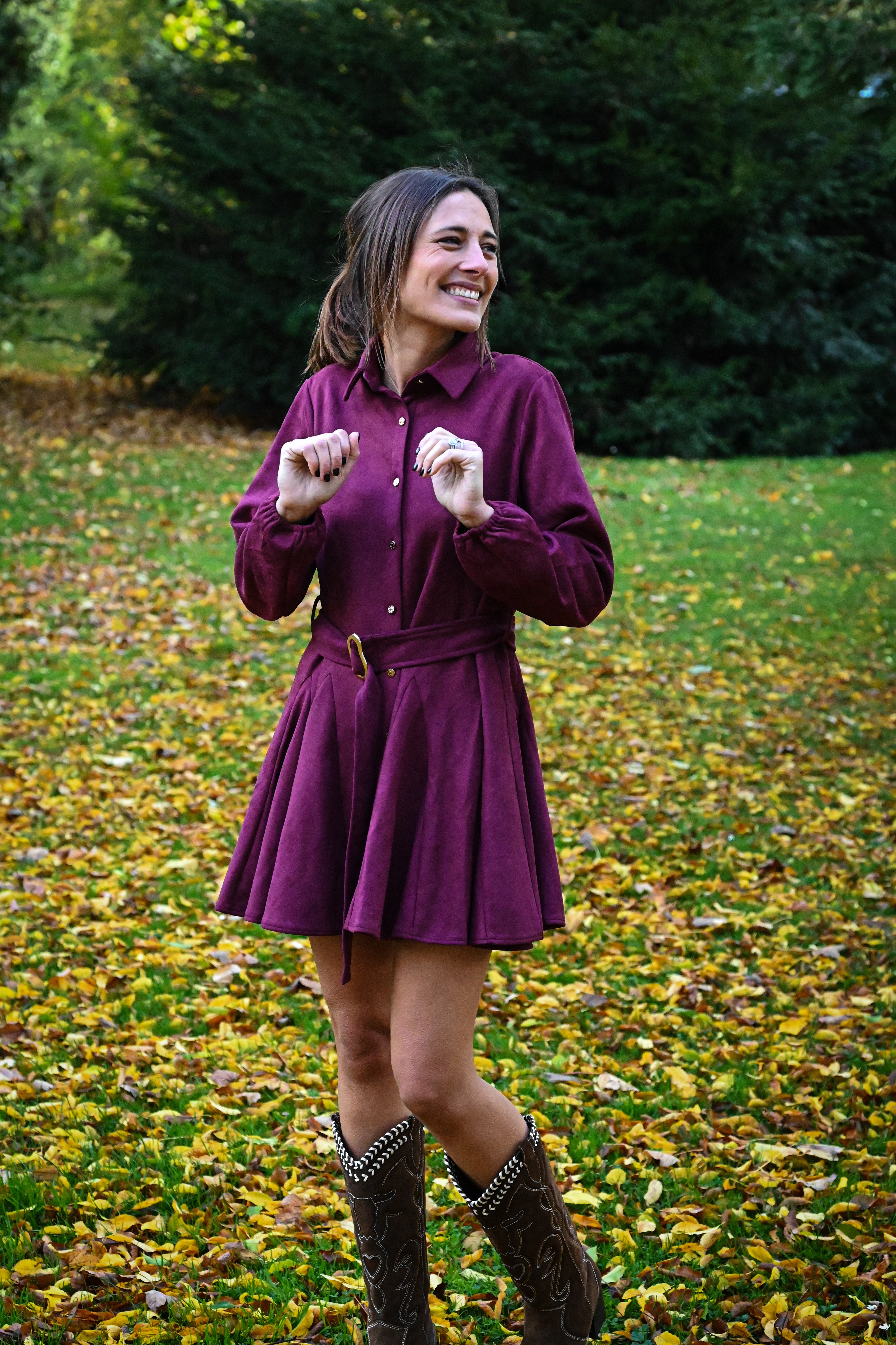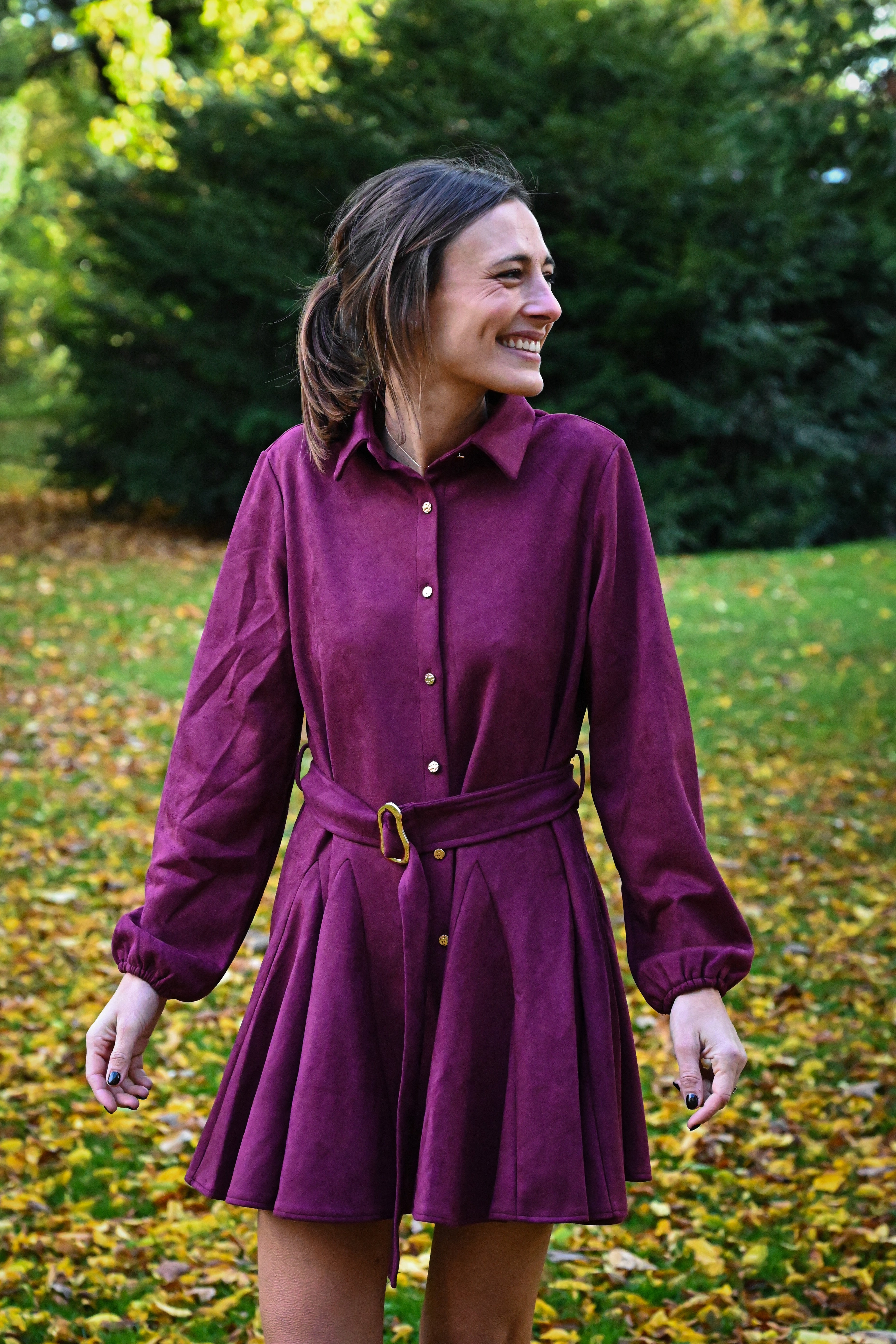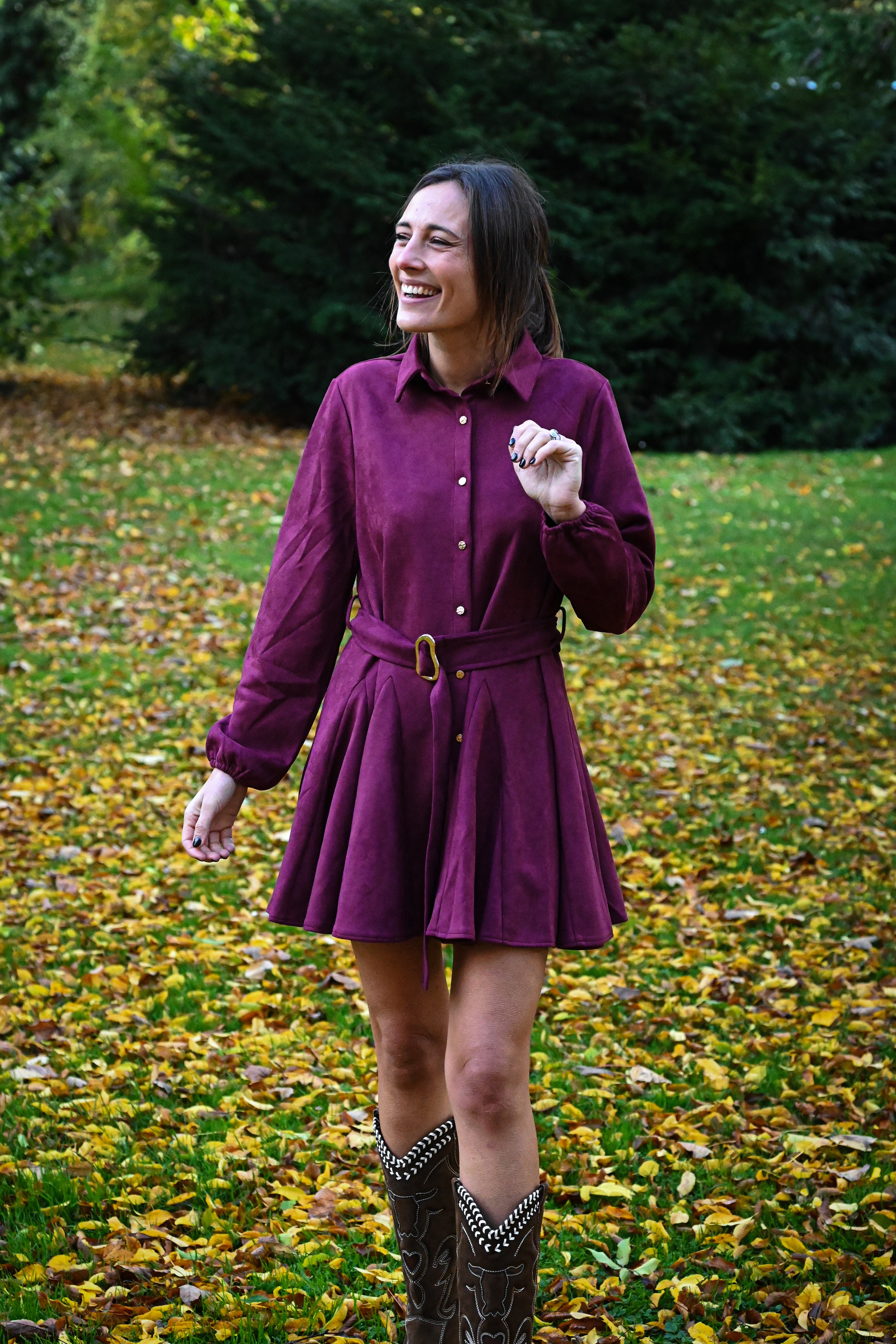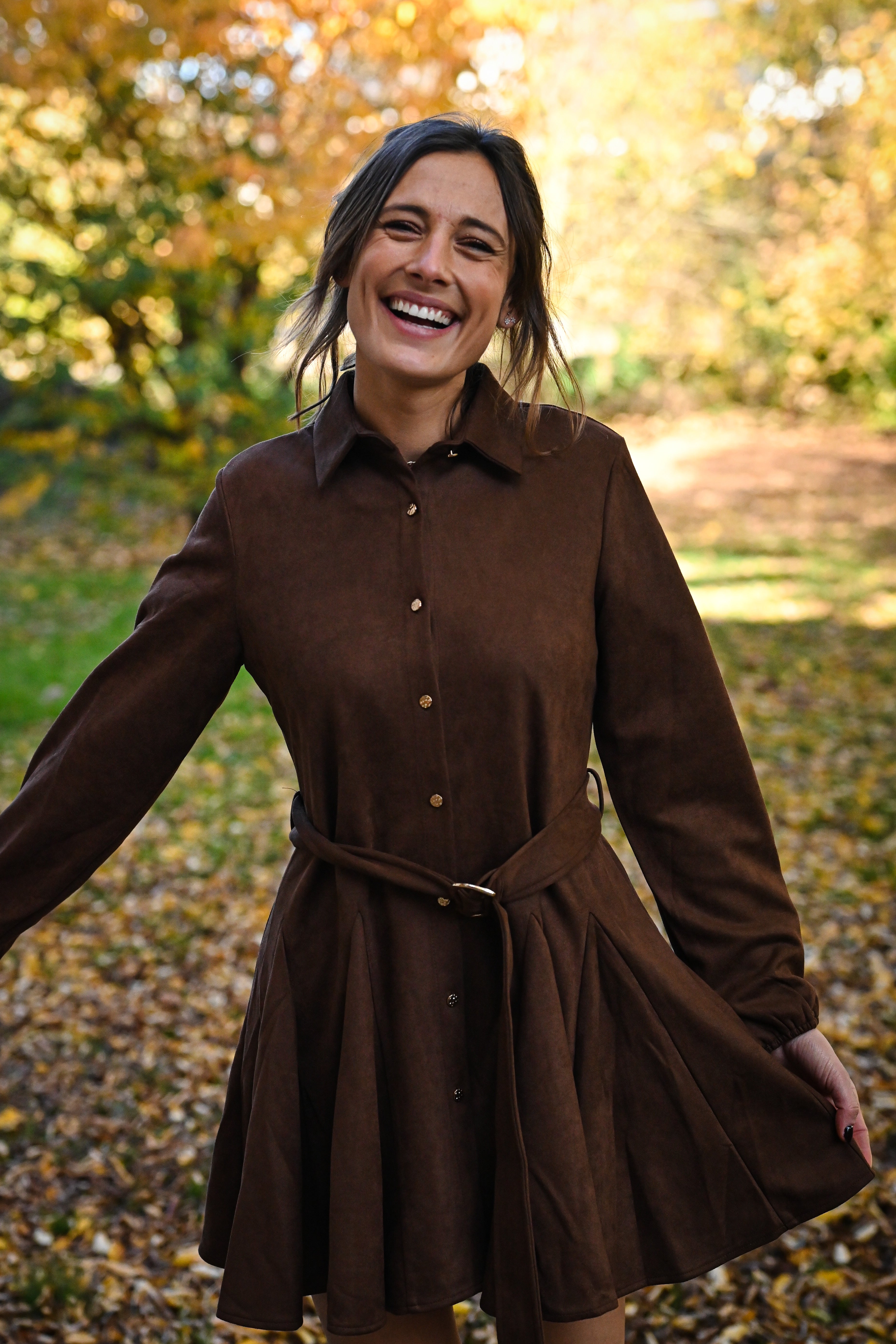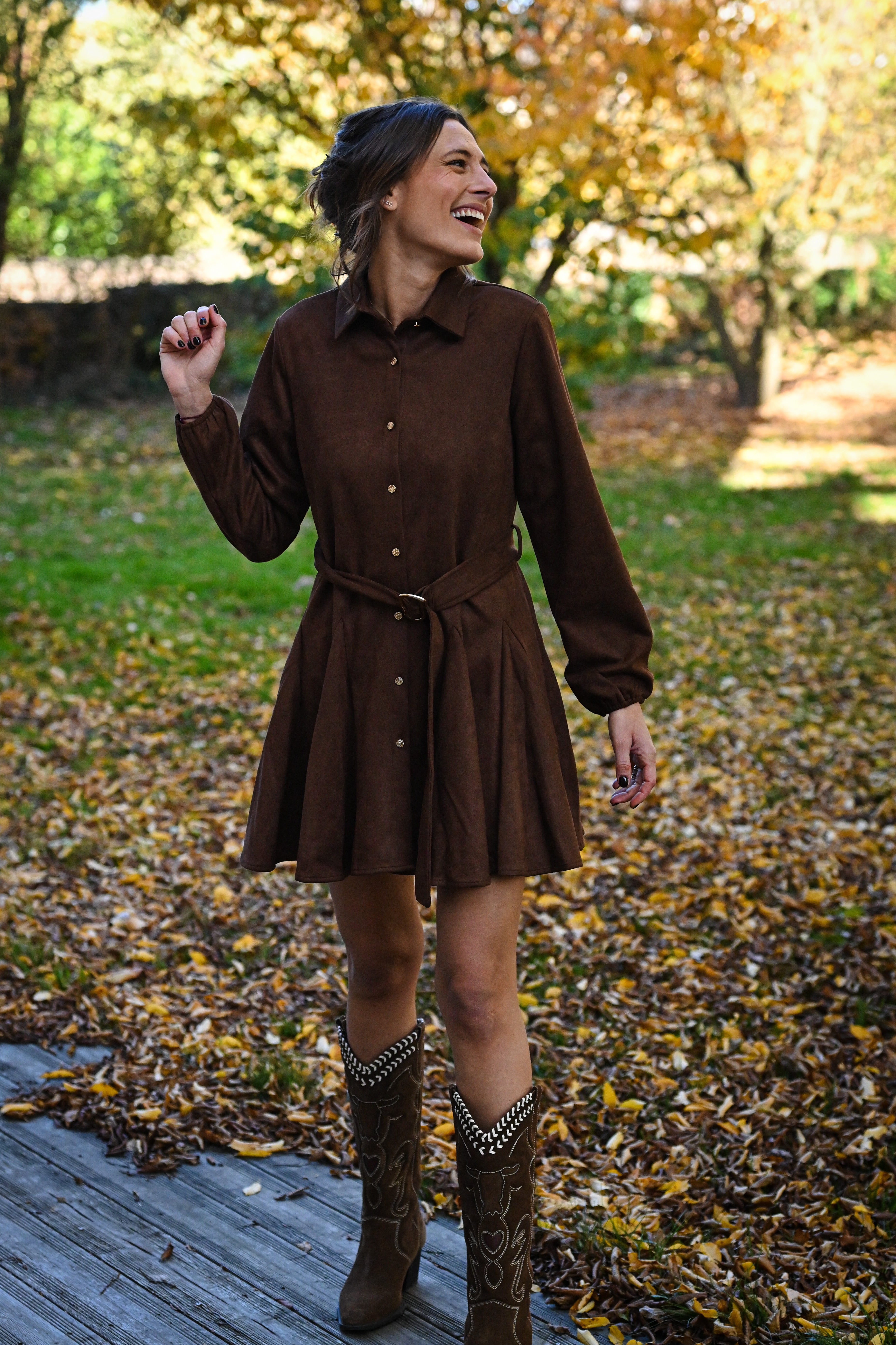 Découvrez la robe courte DANA en daim, élégamment conçue avec des manches longues et des volants délicats. Son col chemise sophistiqué et la ceinture ornée d'une boucle dorée soulignent la silhouette avec raffinement. Disponible en tailles S, M et L, cette robe allie style et confort pour toutes vos occasions.