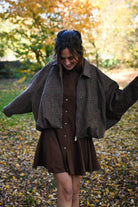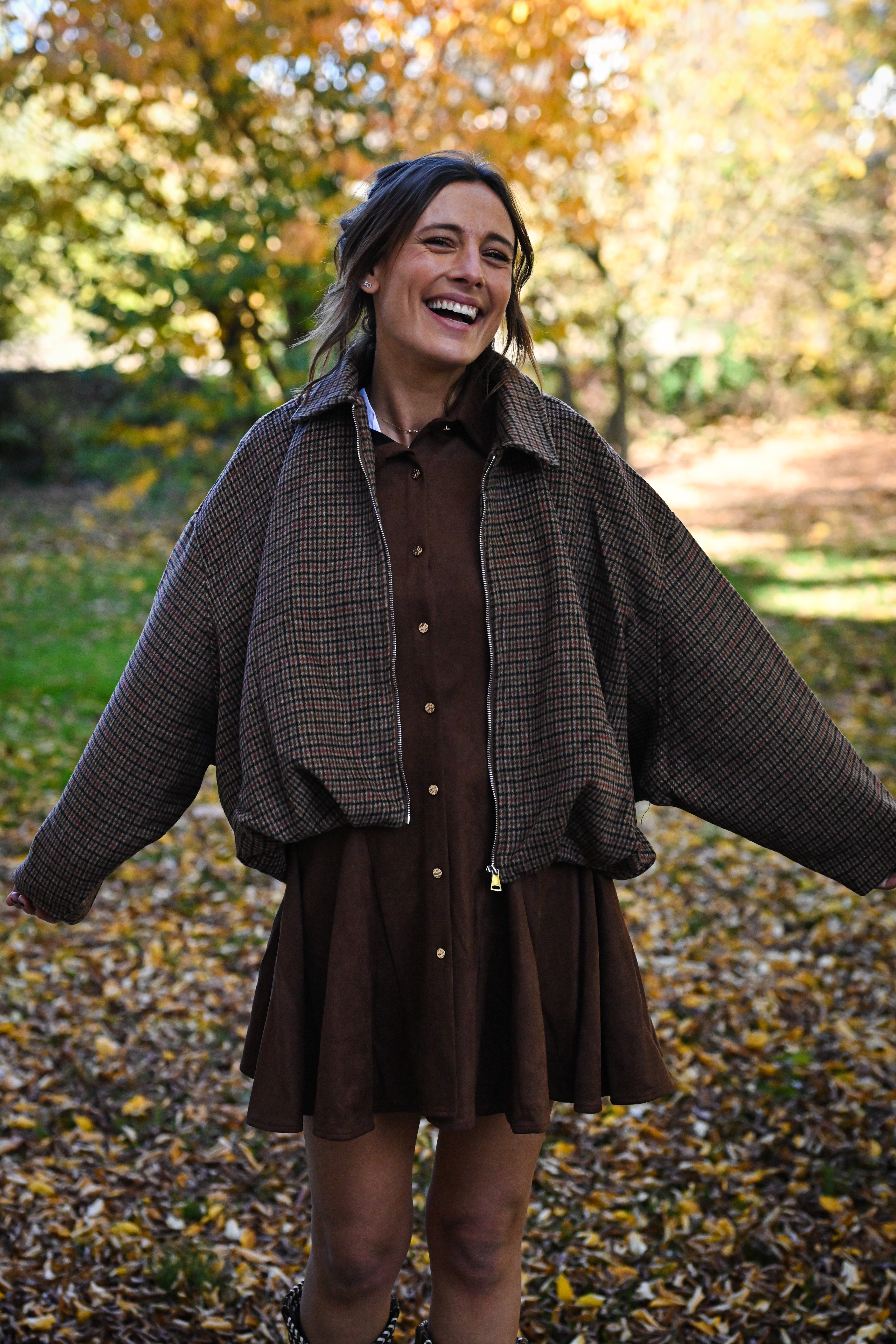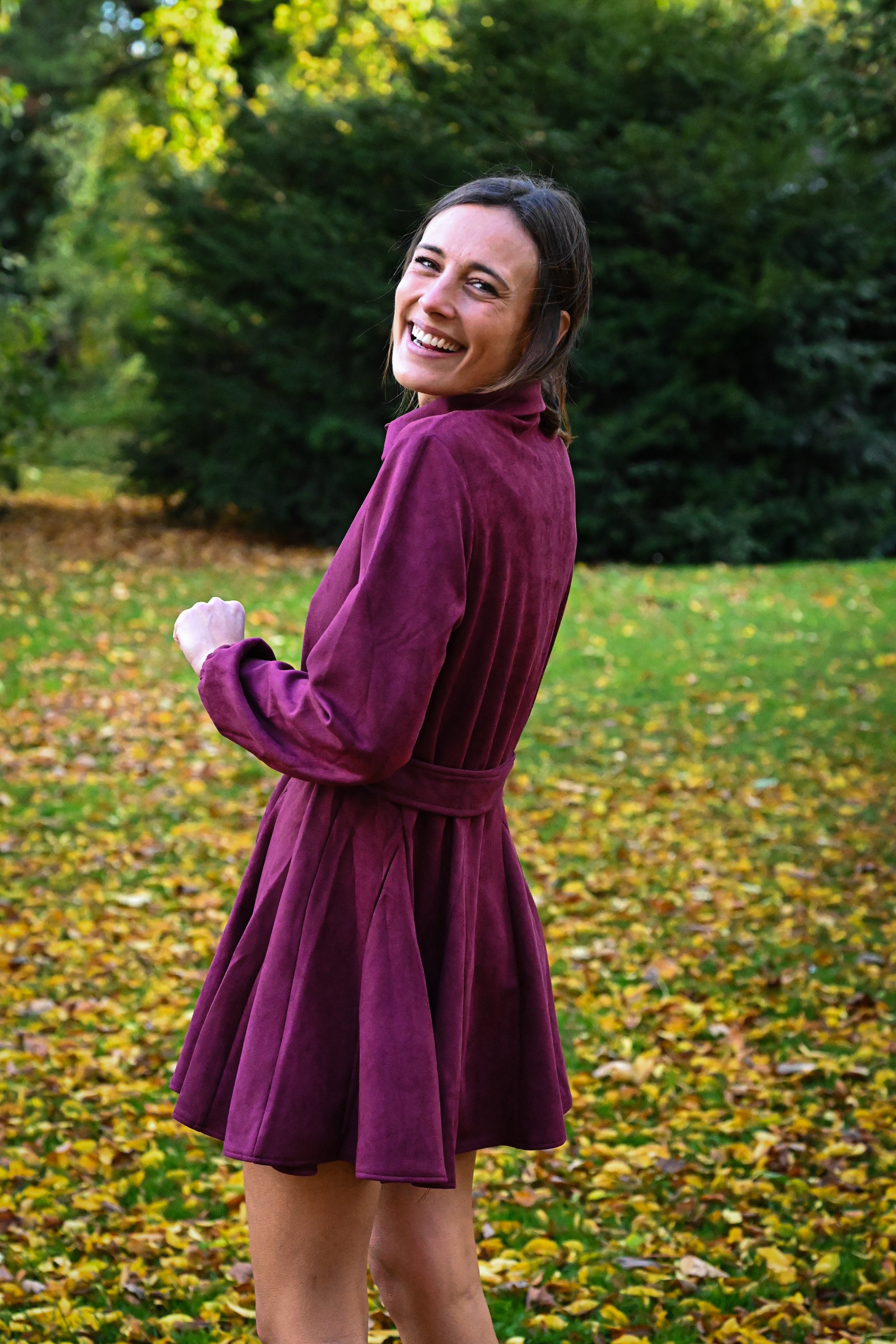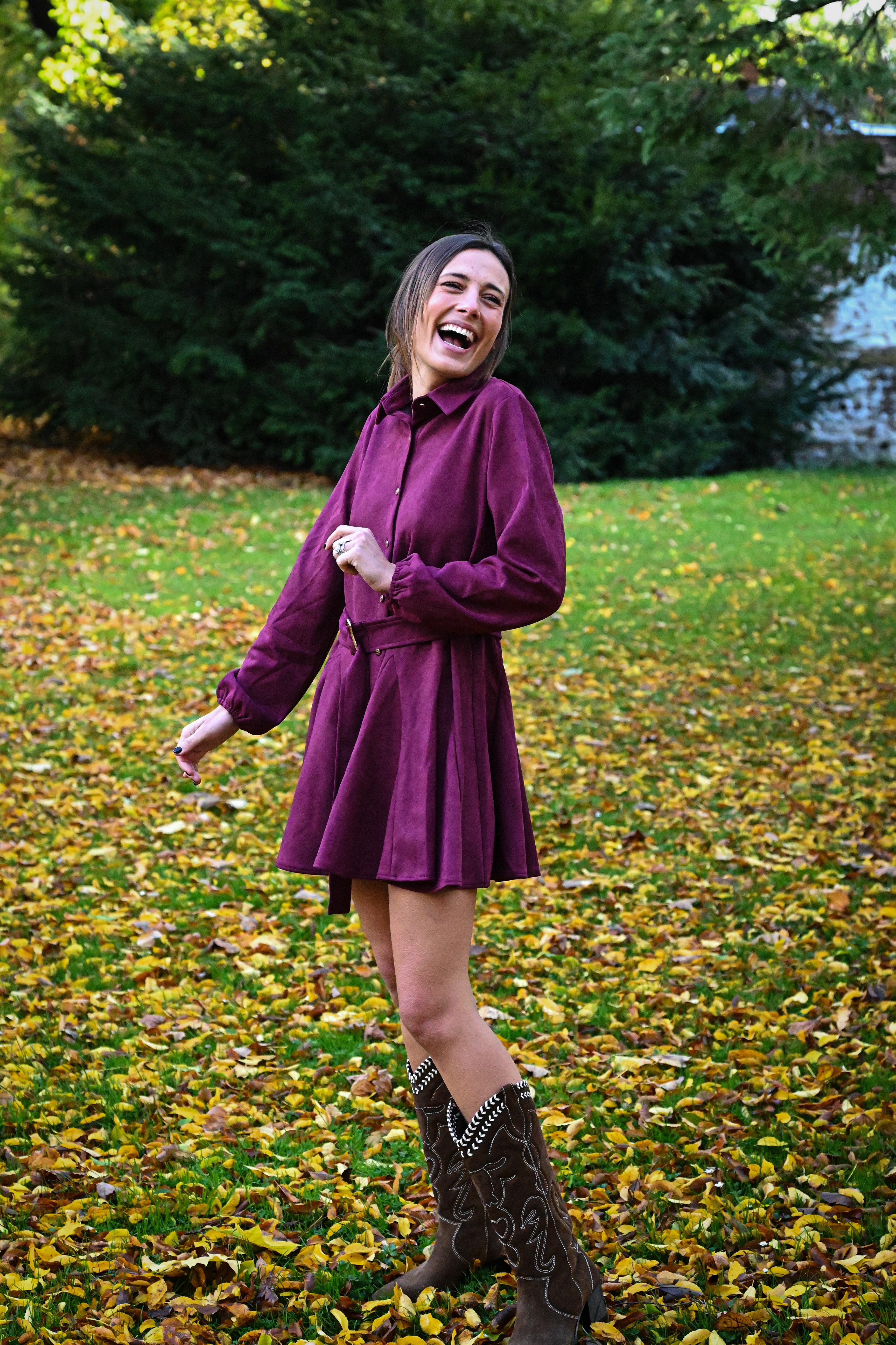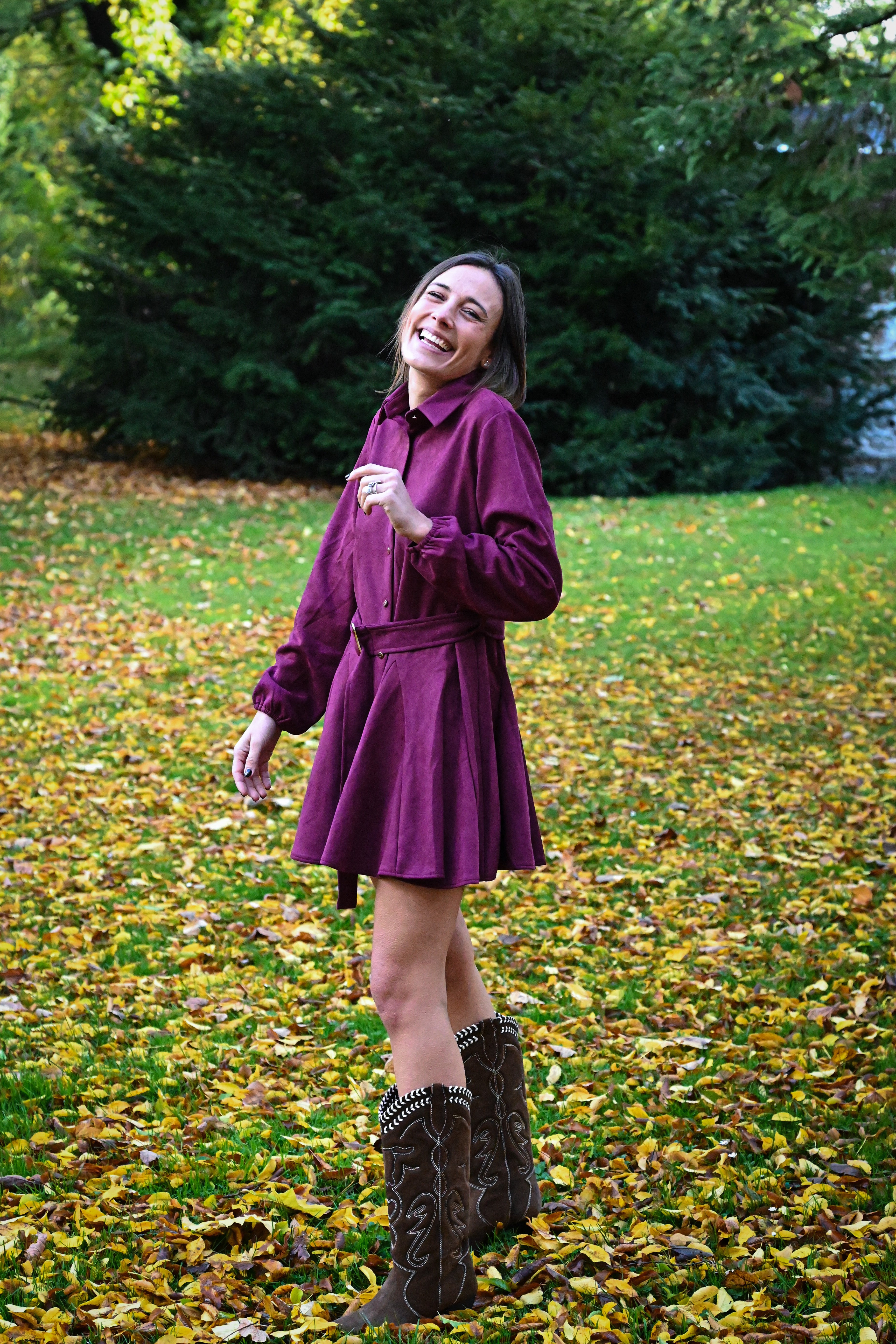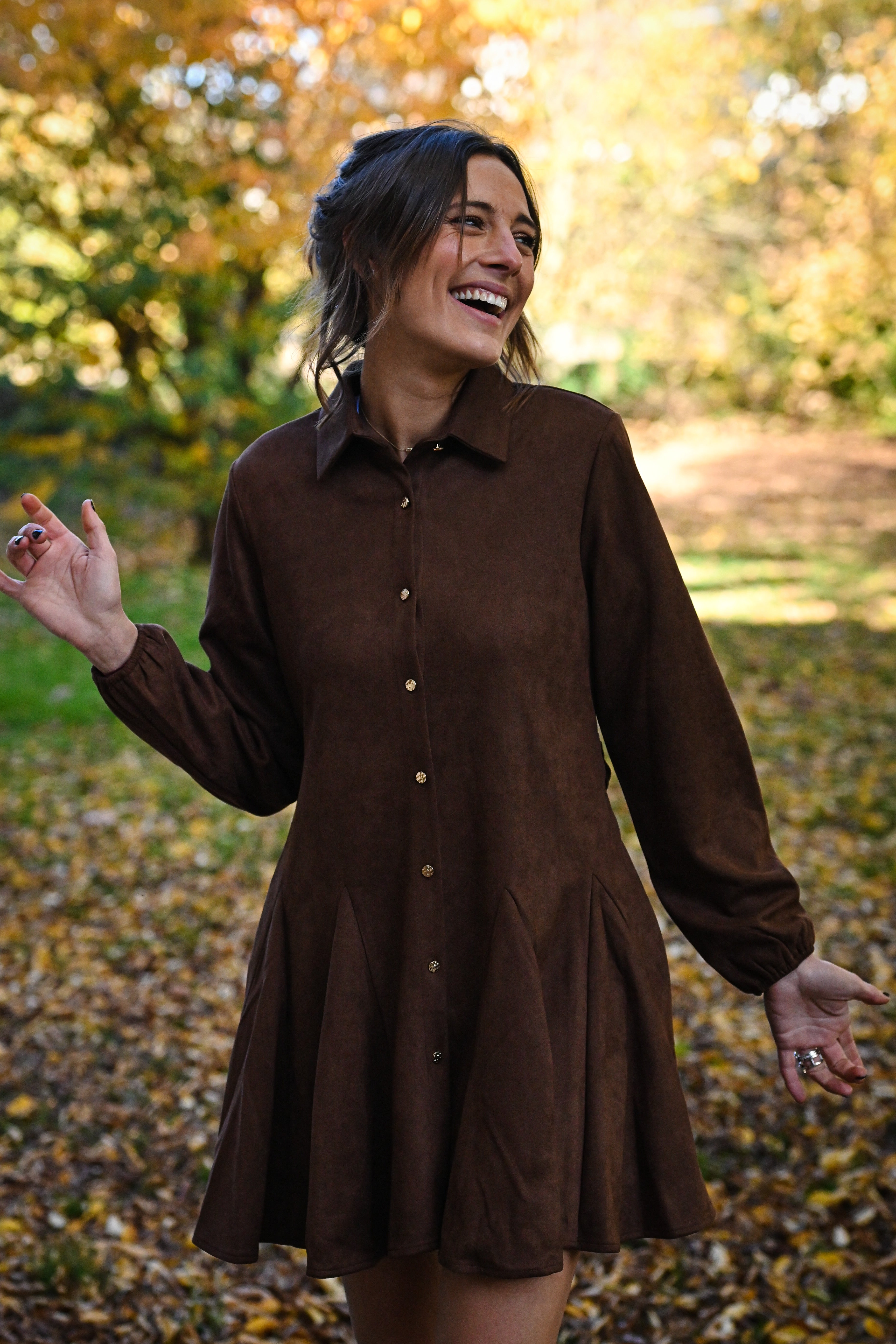 Découvrez la robe courte DANA en daim, élégamment conçue avec des manches longues et des volants délicats. Son col chemise sophistiqué et la ceinture ornée d'une boucle dorée soulignent la silhouette avec raffinement. Disponible en tailles S, M et L, cette robe allie style et confort pour toutes vos occasions.