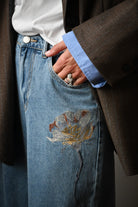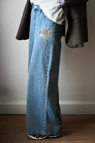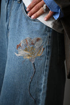 Découvrez le jean bleu orné de fleurs en strass rose ou d'une fleur brodée chocolat, alliant style et éclat. Sa taille élastique garantit un ajustement confortable pour toutes les silhouettes. Disponible en tailles S, M et L, ce modèle s’adapte parfaitement à vos envies.