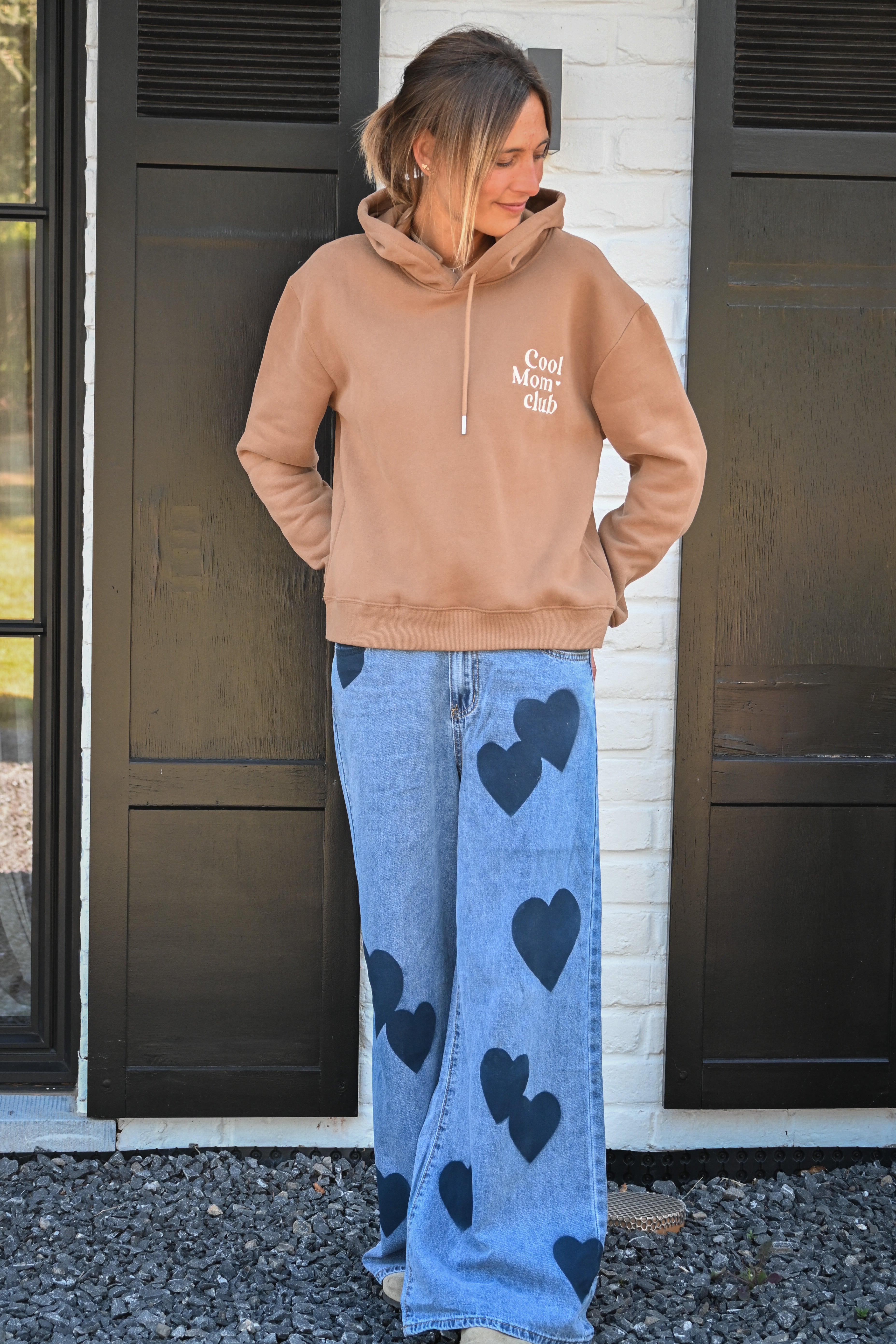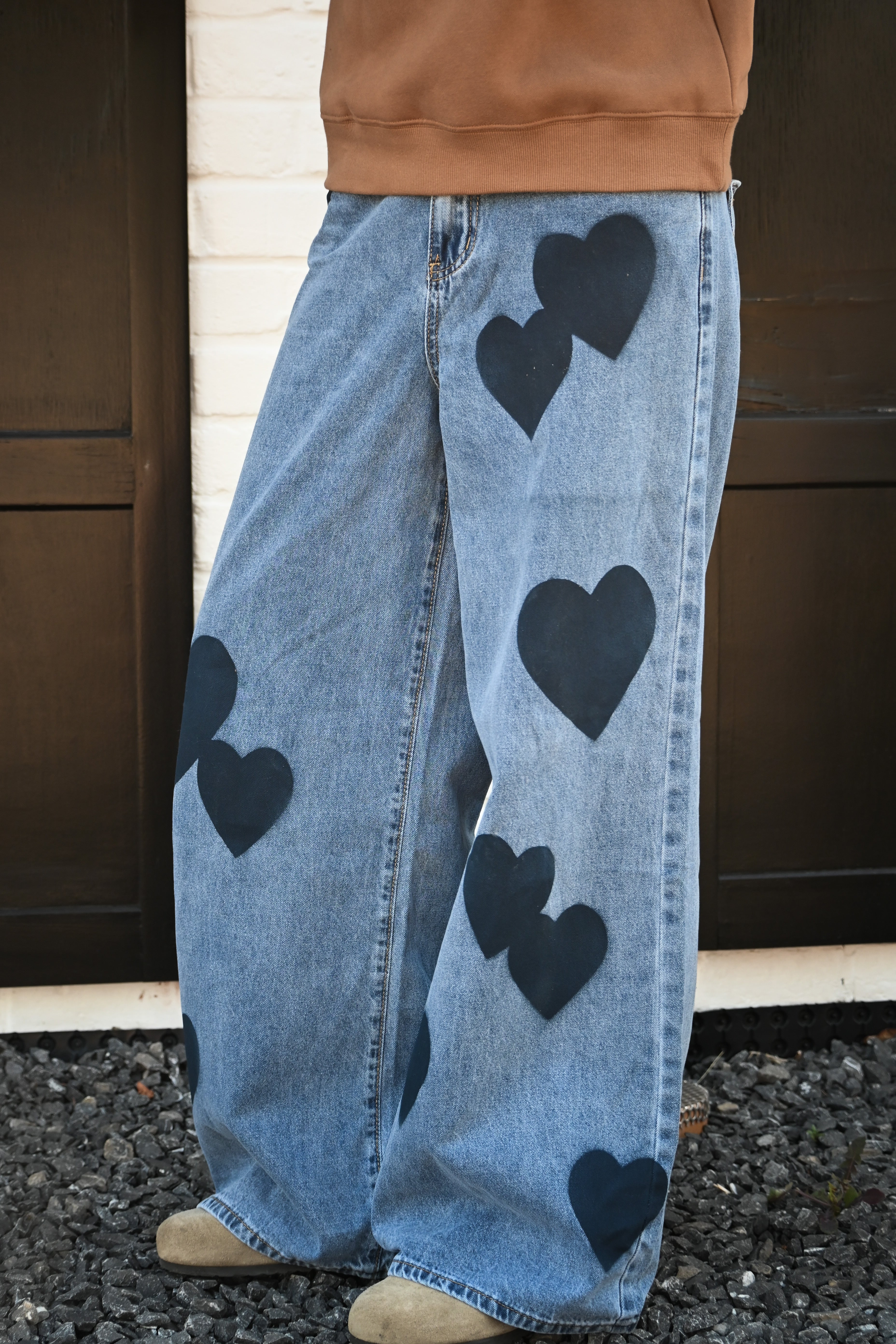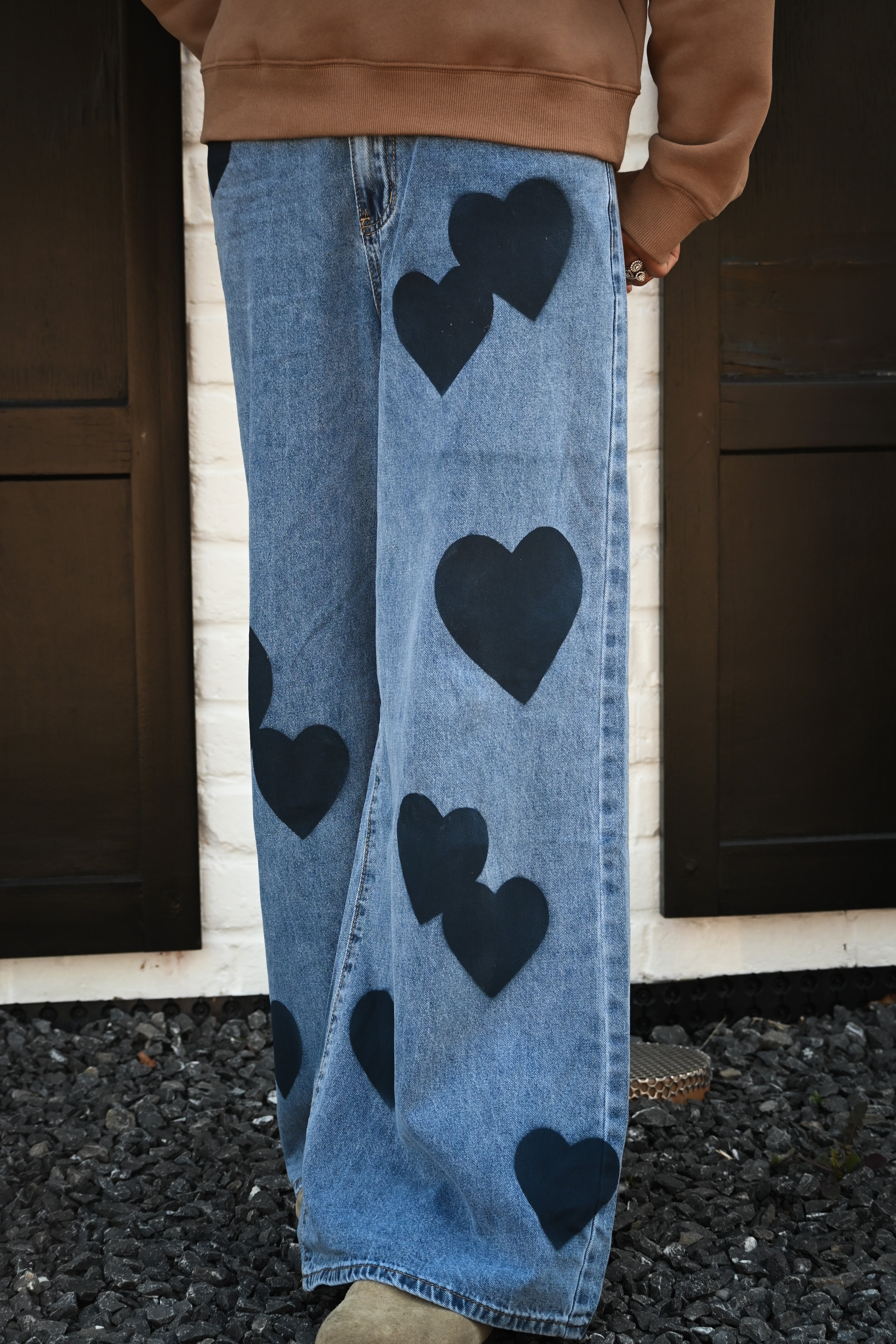 Découvrez ce jean bleu ample orné de cœurs devant et derrière, alliant style et confort. Sa taille est équipée d’un élastique à l’arrière pour un ajustement parfait. Disponible en tailles S à L, il s’adapte à toutes vos envies mode.