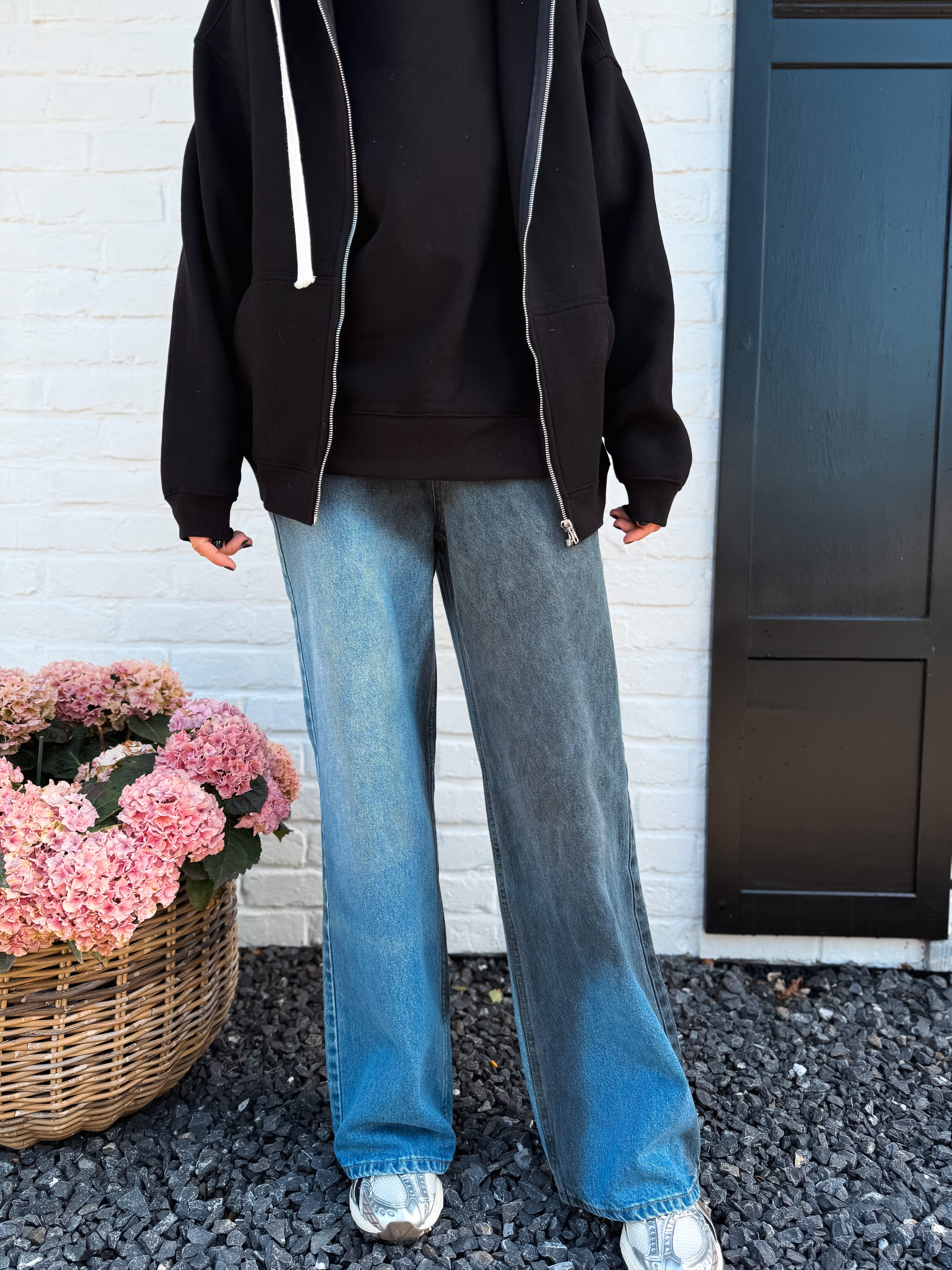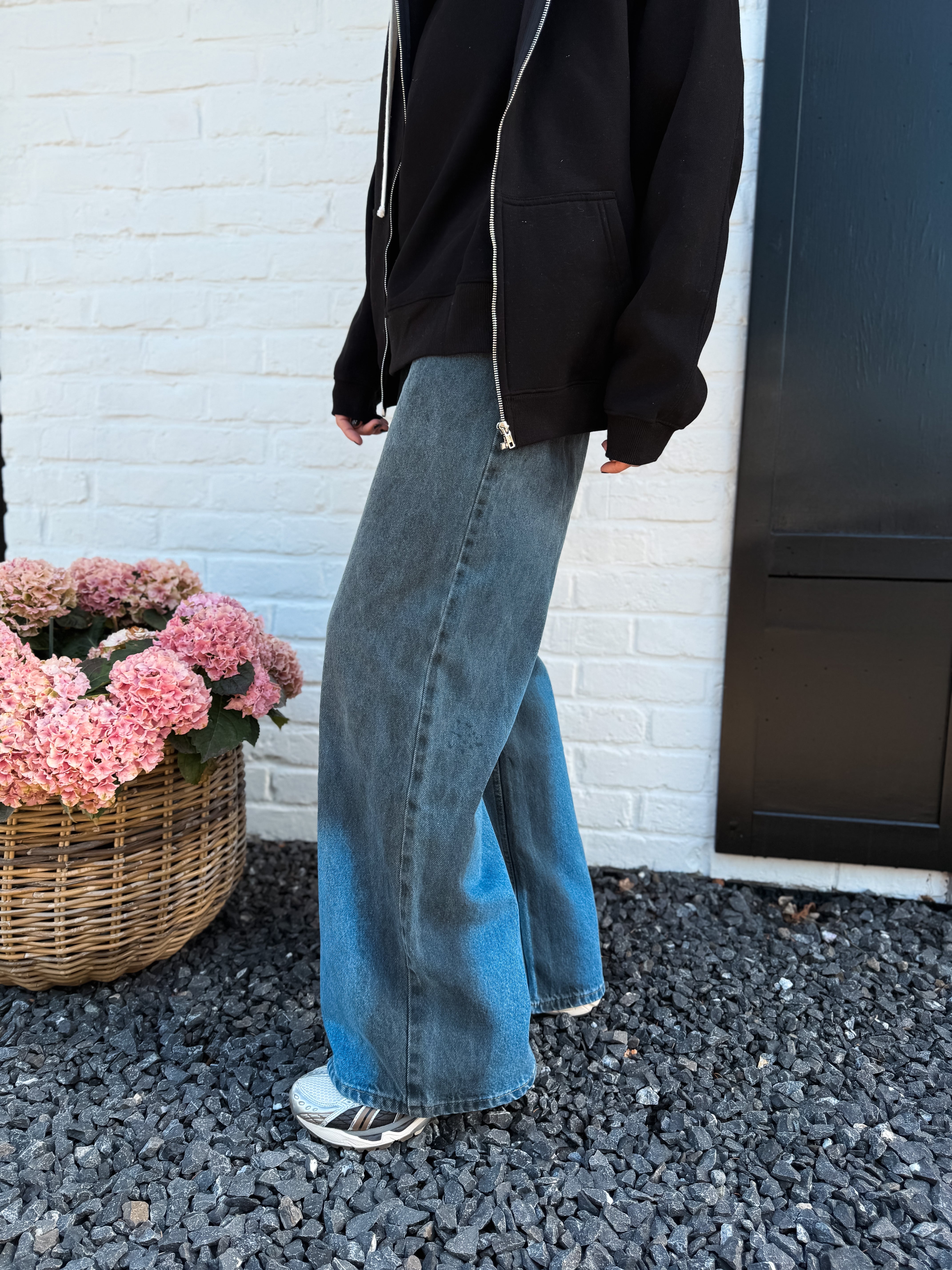 Ce pantalon en jean bleu présente un effet délavé gris et une coupe ample, offrant un style décontracté et confortable. Disponible en tailles S, M, L et XL, il s’adapte parfaitement à différentes morphologies.