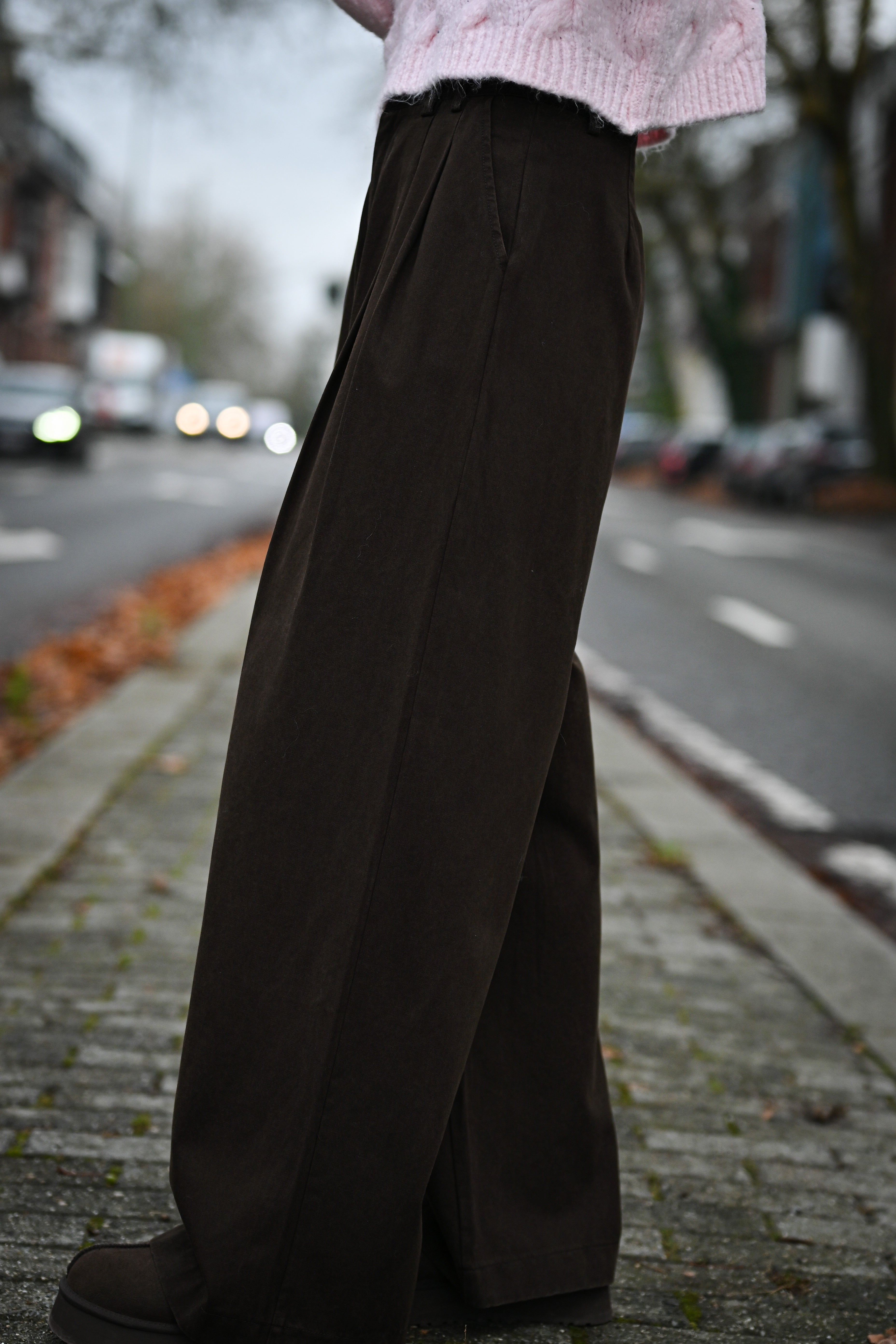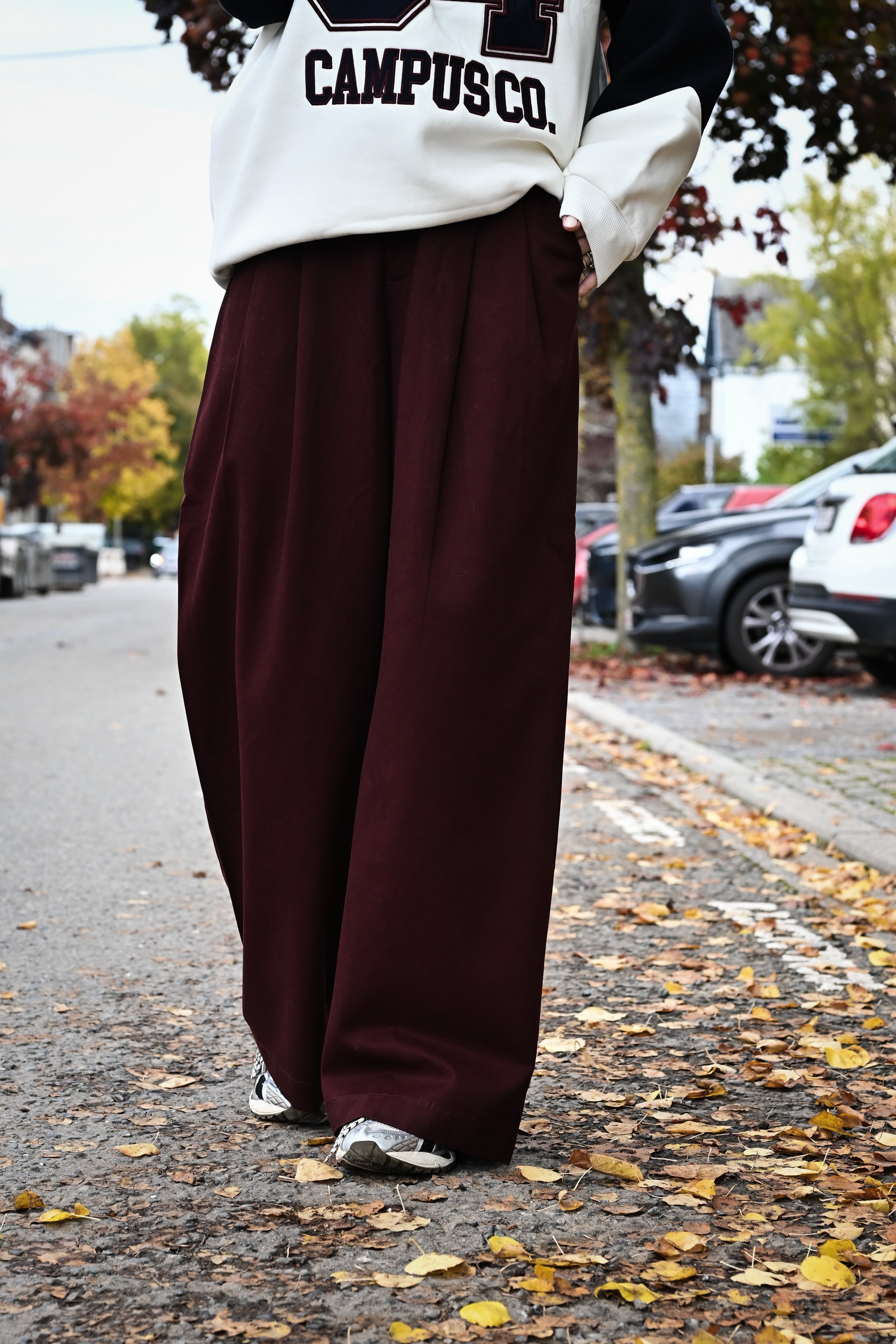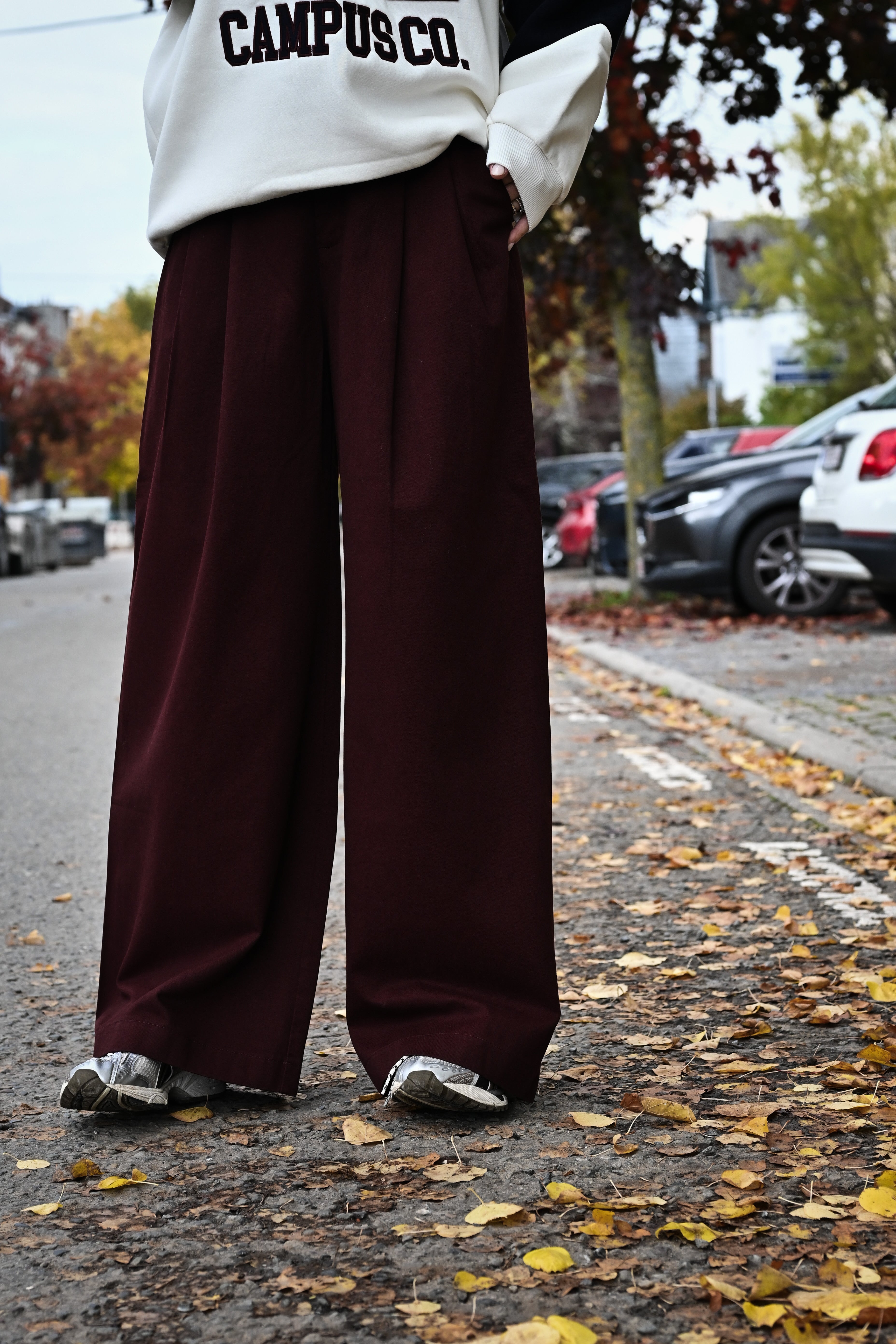 Découvrez le pantalon MARIE, délicieusement doux et bordeaux, avec une coupe ample élégante agrémentée de pinces. Disponible aux tailles XS, S, M et L, il allie confort et style pour toutes les occasions.