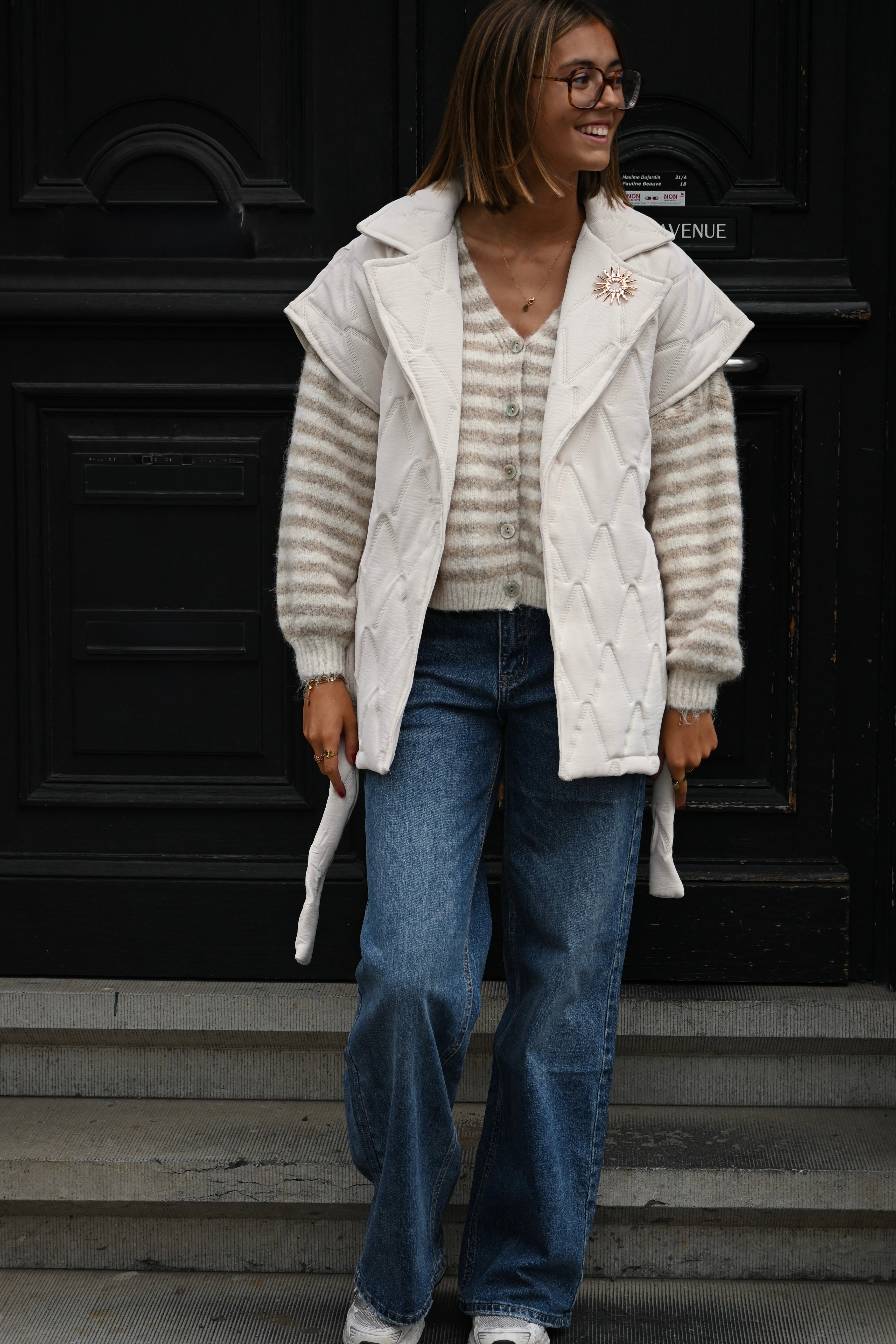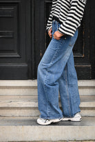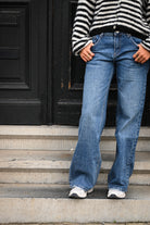 Jean en toile bleue avec une coupe droite et ample, proposé du 34 au 42 pour un style à la fois confortable et tendance.