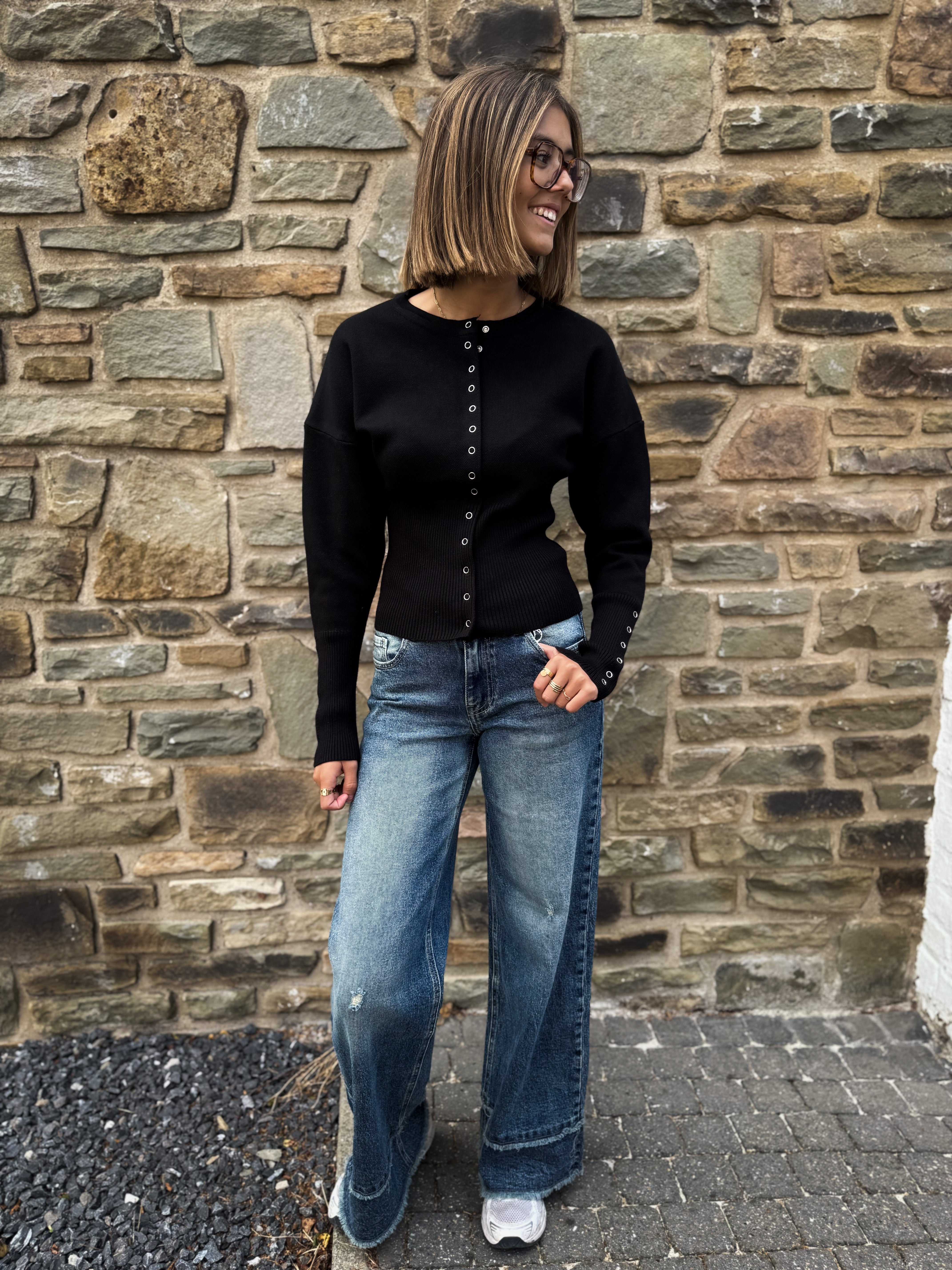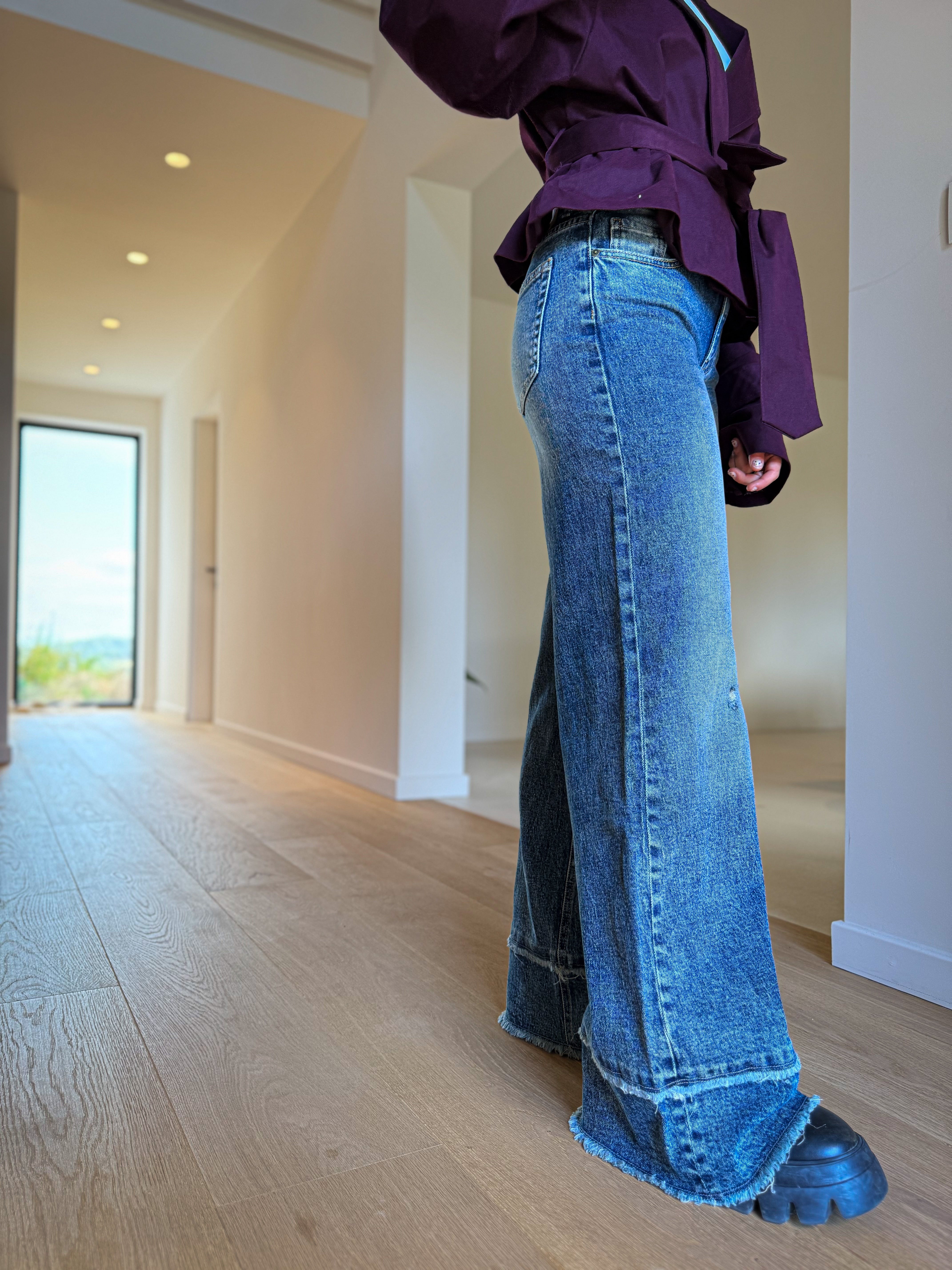 Ce jean bleu à coupe droite se distingue par un détail unique au niveau de l’ourlet. Il est proposé dans les tailles 34 à 42, offrant un style moderne et adaptable à toutes les morphologies.