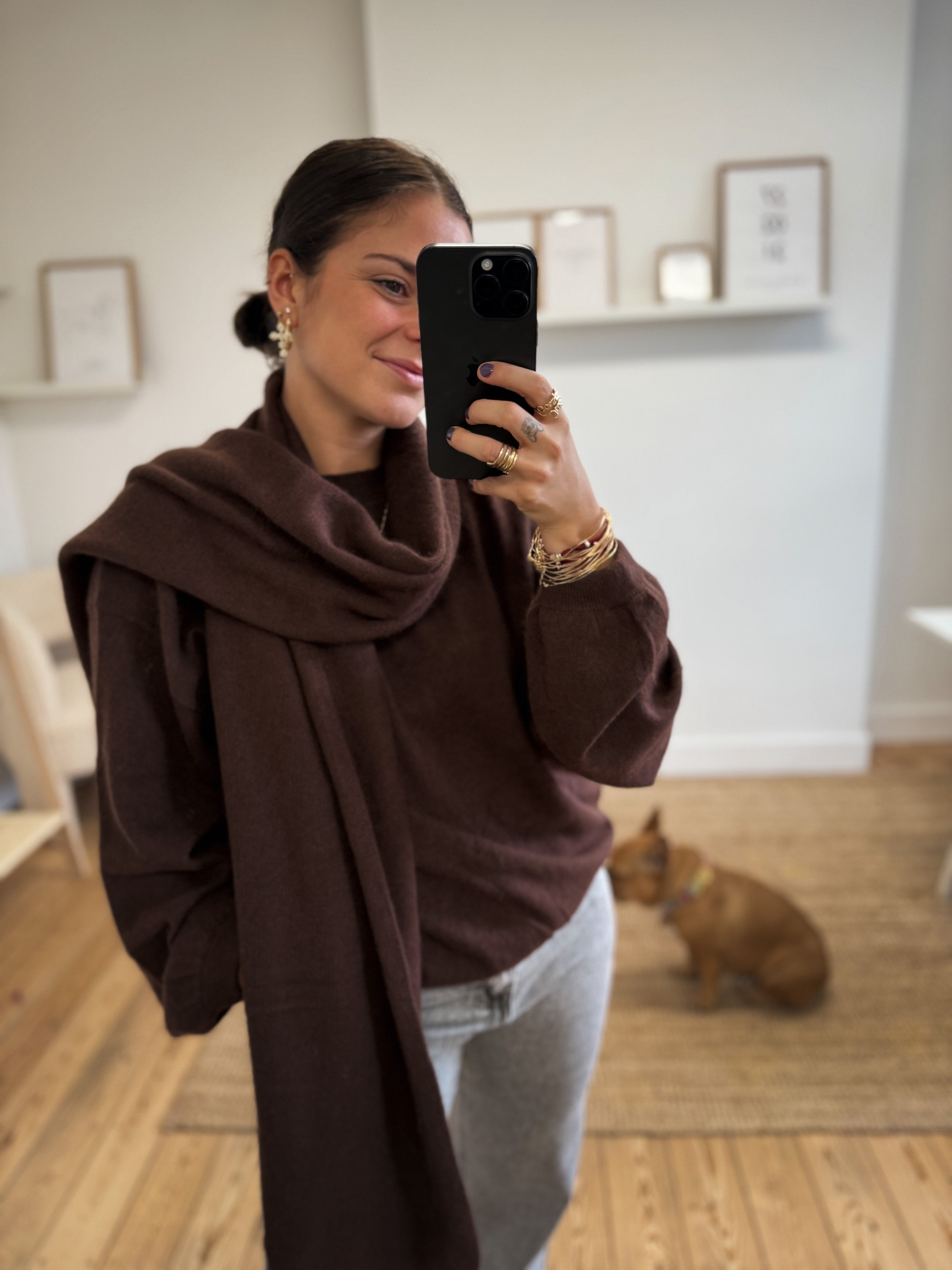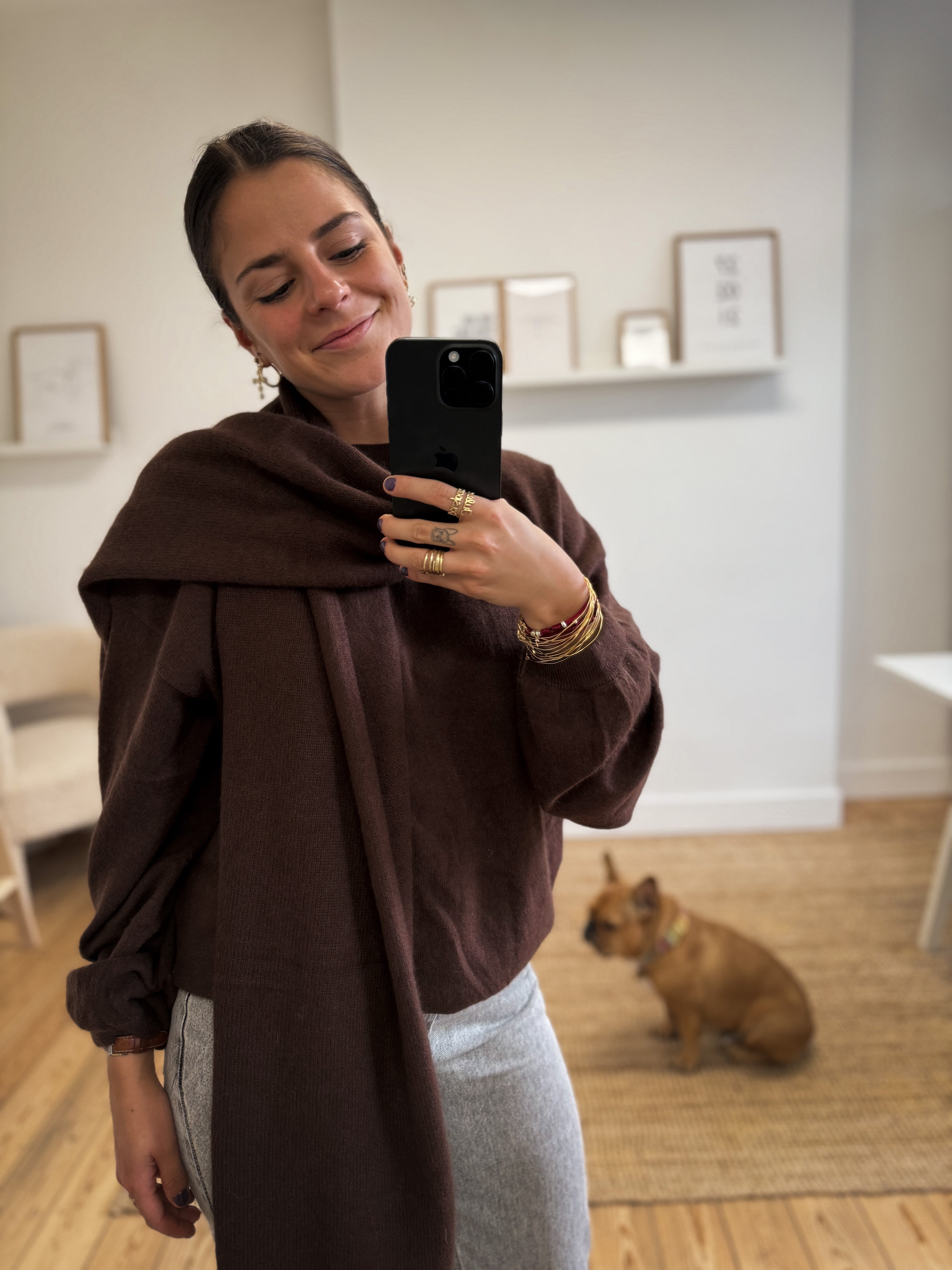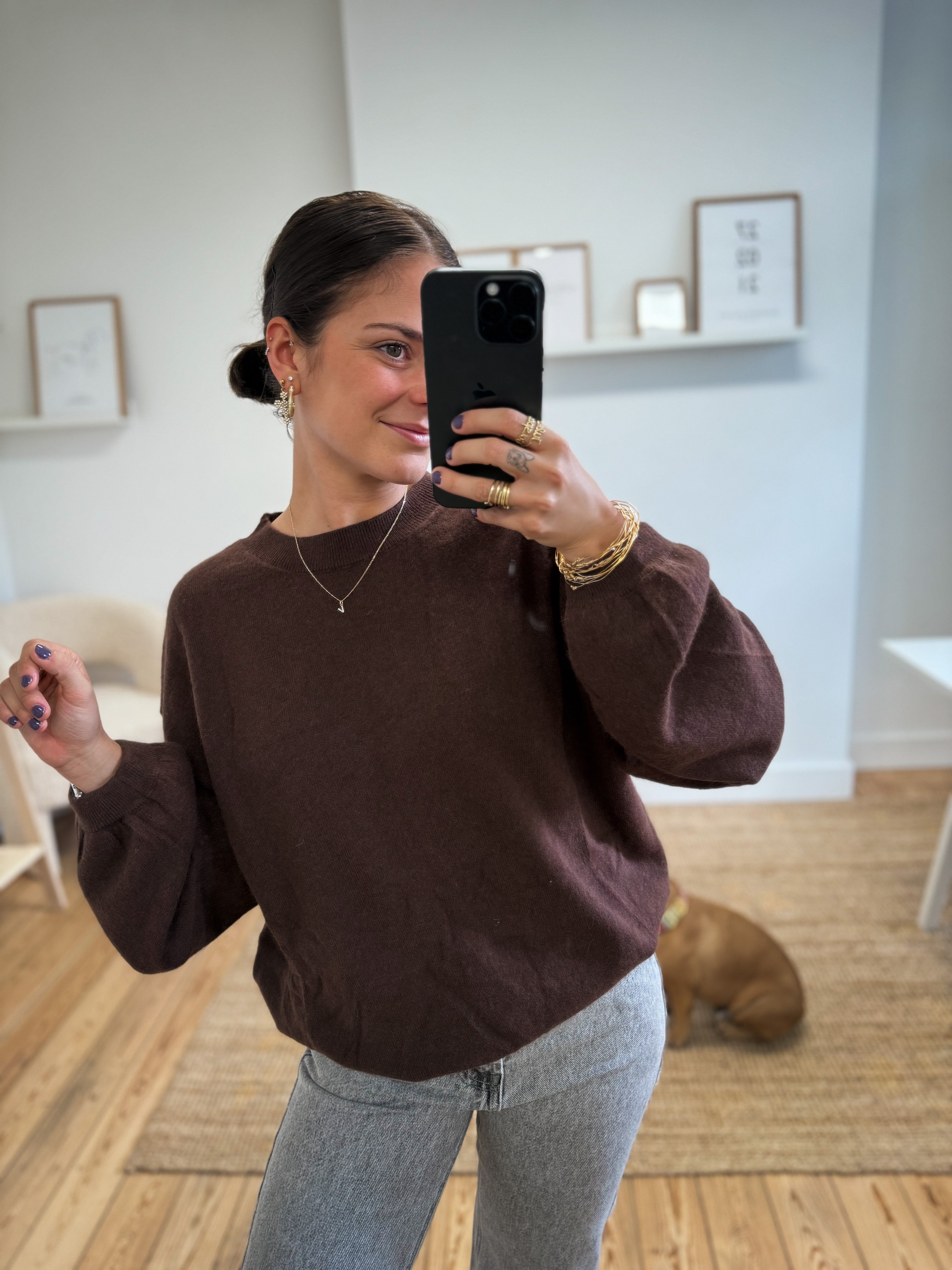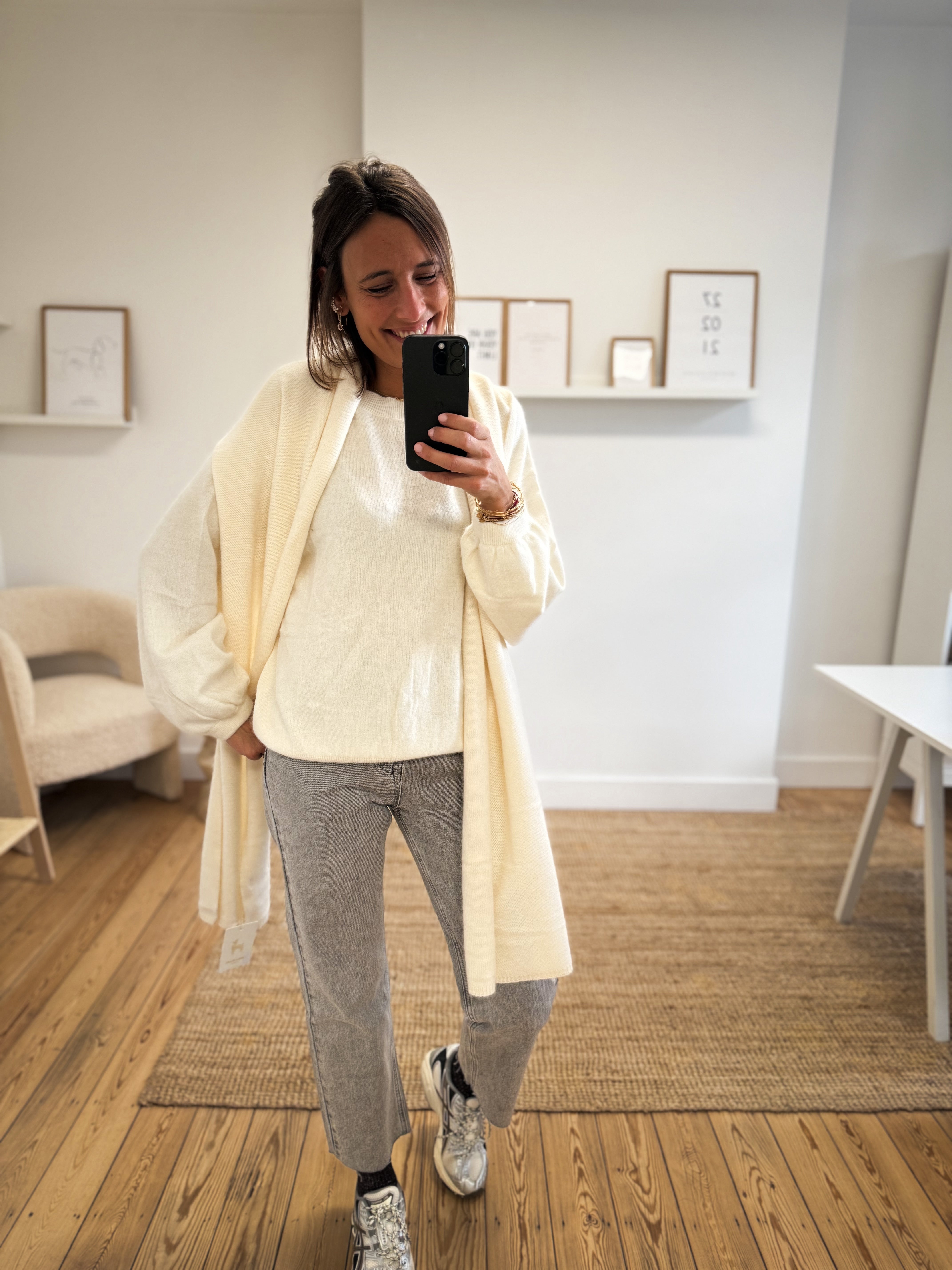 Ce pull en maille ultra douce, à col rond et manches longues est proposé en taille S/M ou M/L pour un style élégant et confortable.