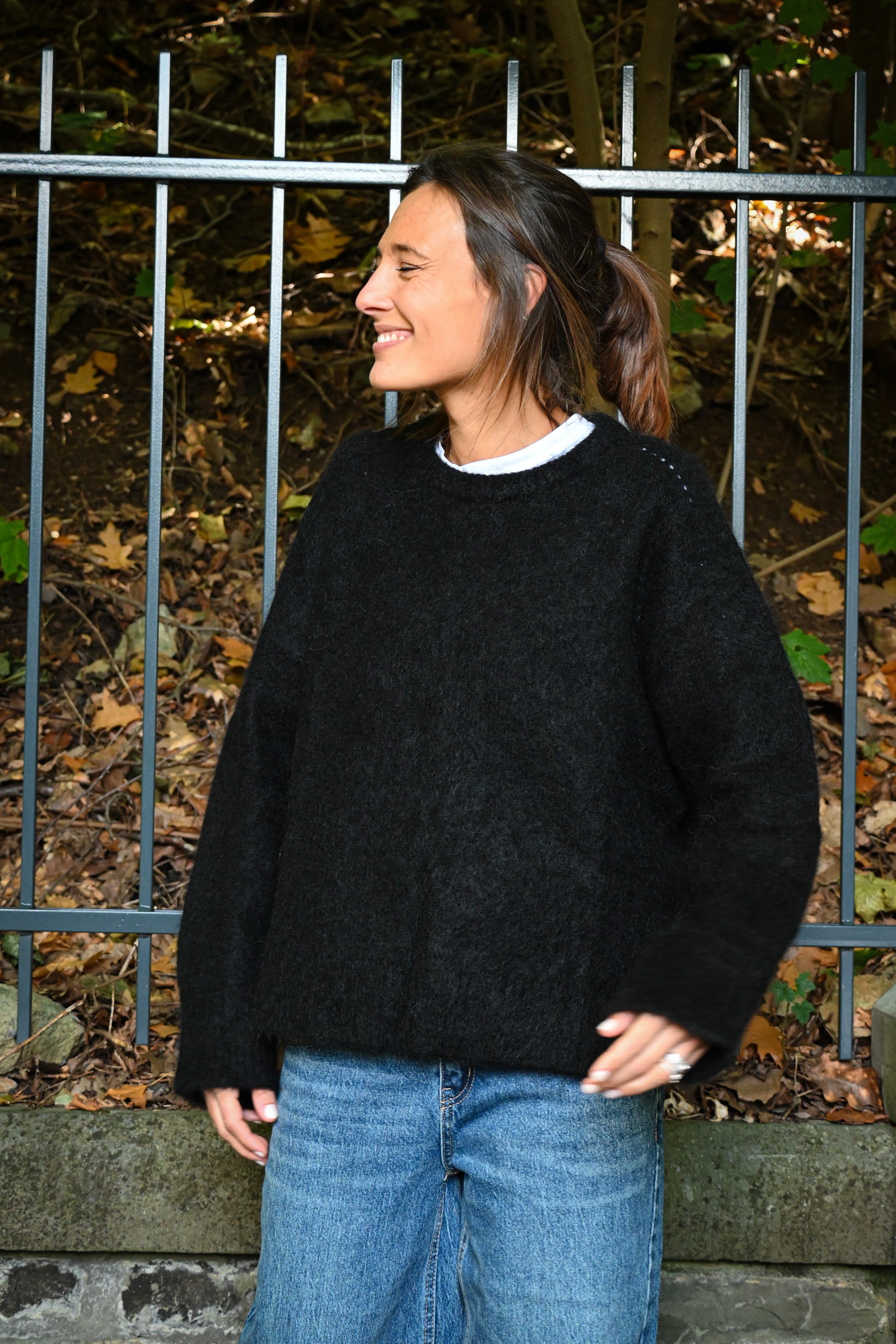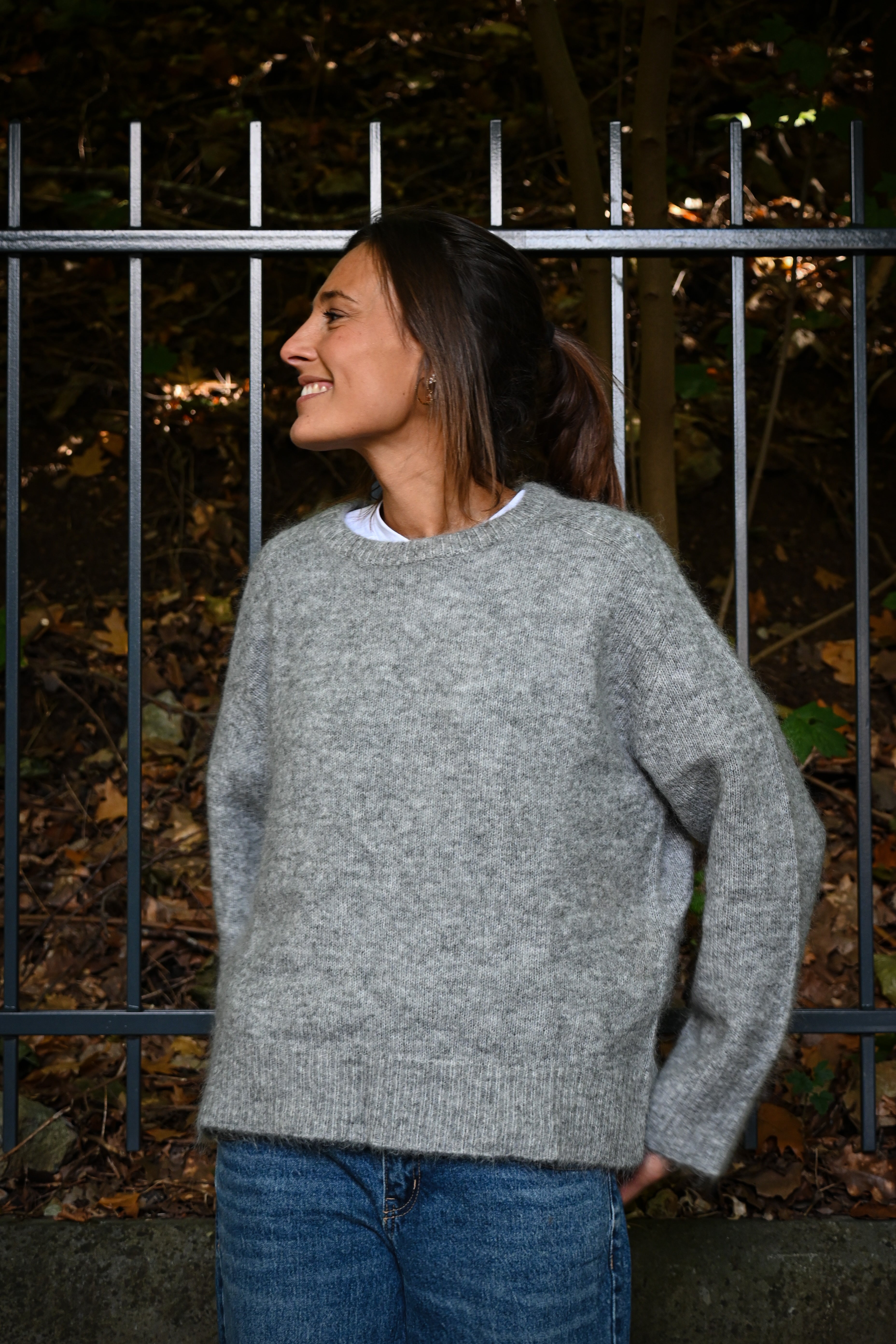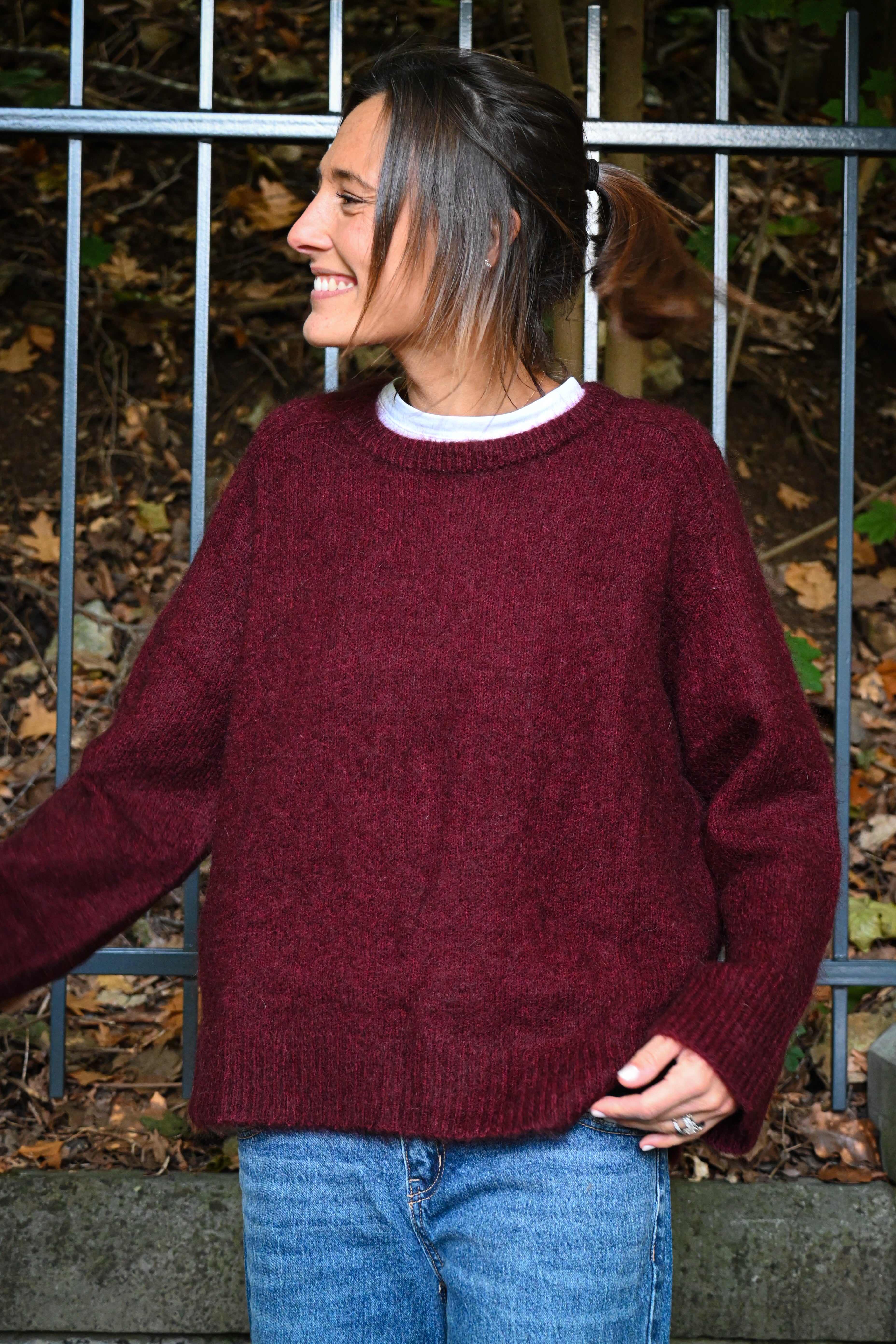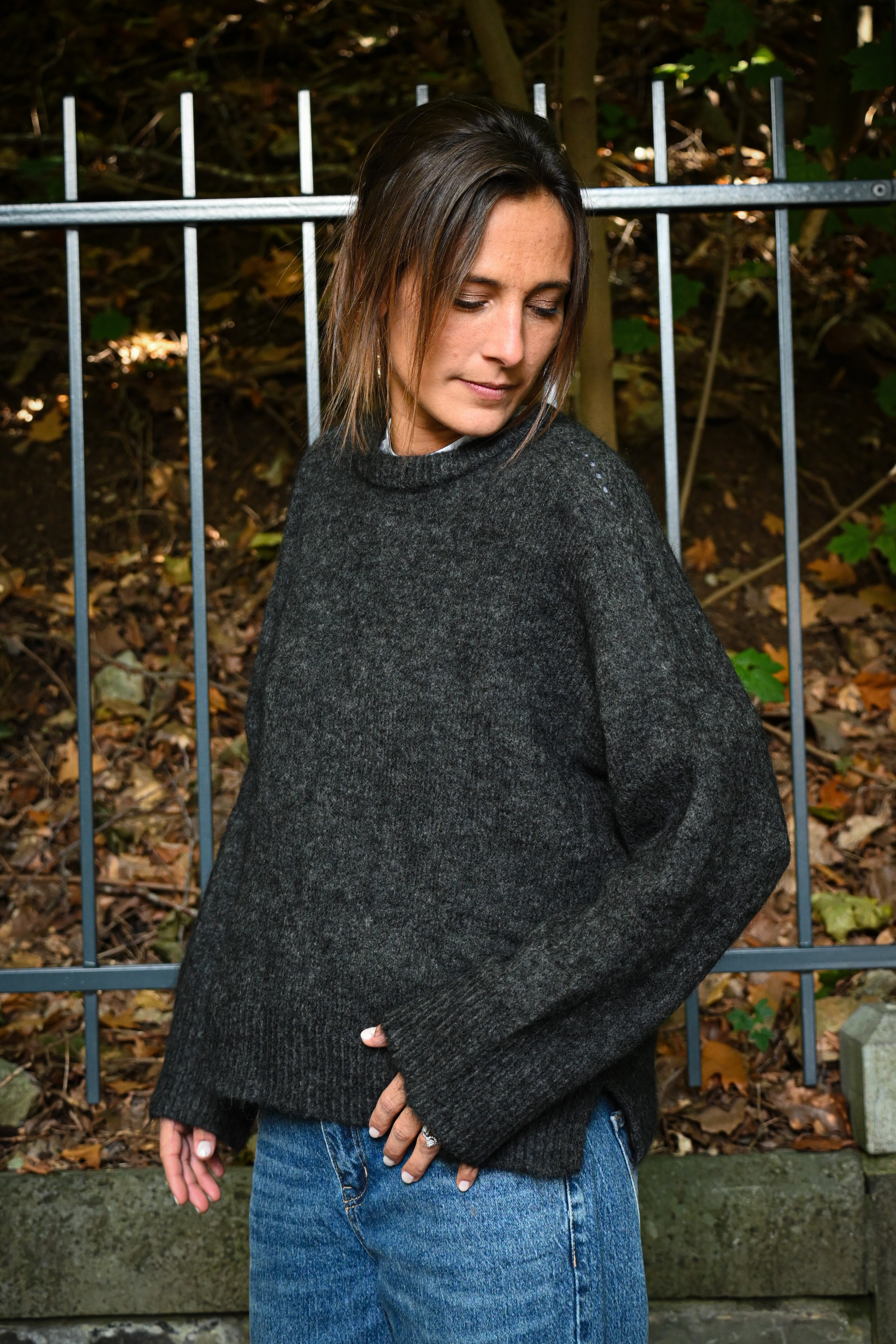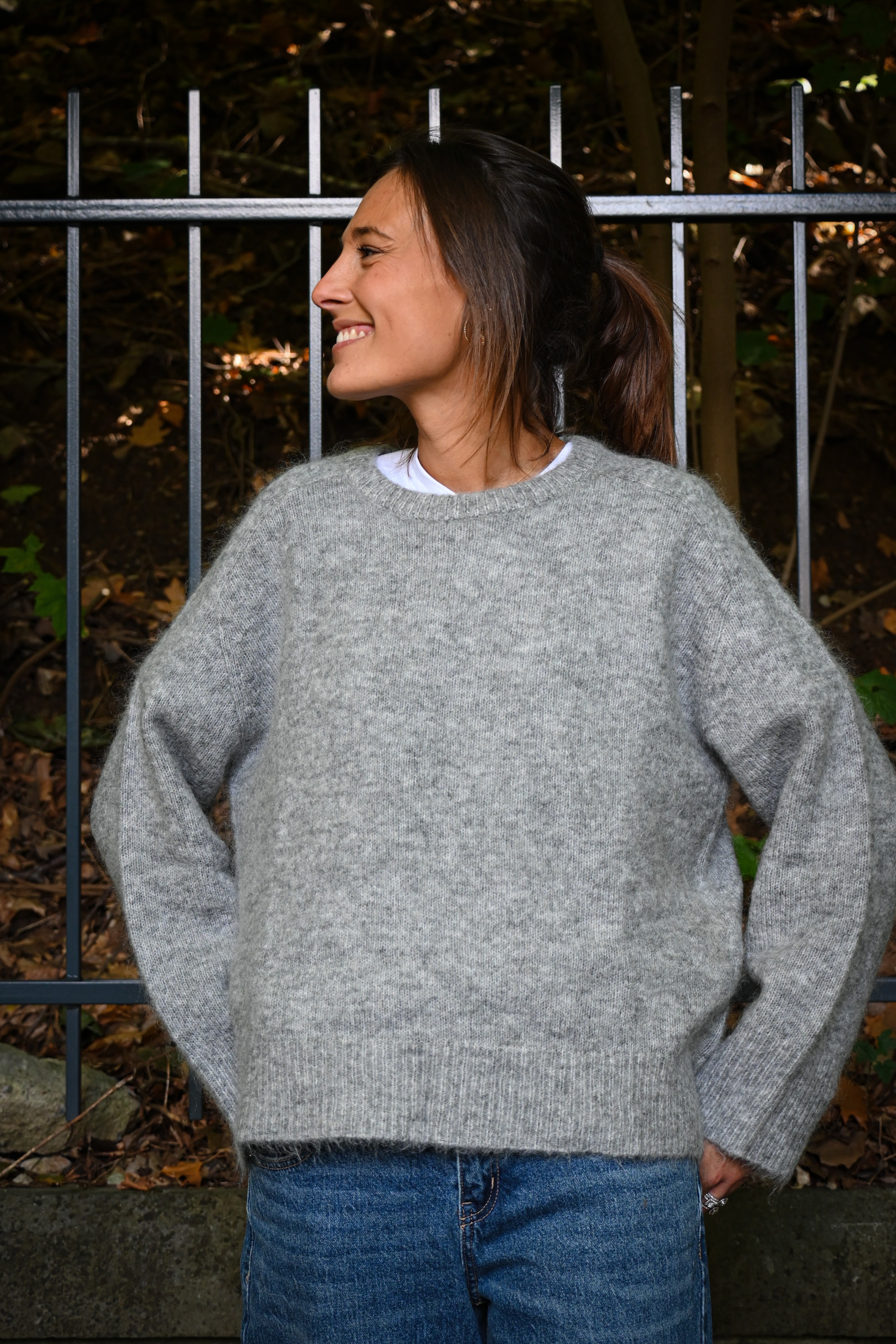 Ce pull en maille présente un col rond ample et des manches longues larges avec des petites surpiqûres à hauteur de l’épaule, subtilement ajustées aux poignets pour un confort optimal et un style décontracté chic. Il est légèrement cranté sur le côté.