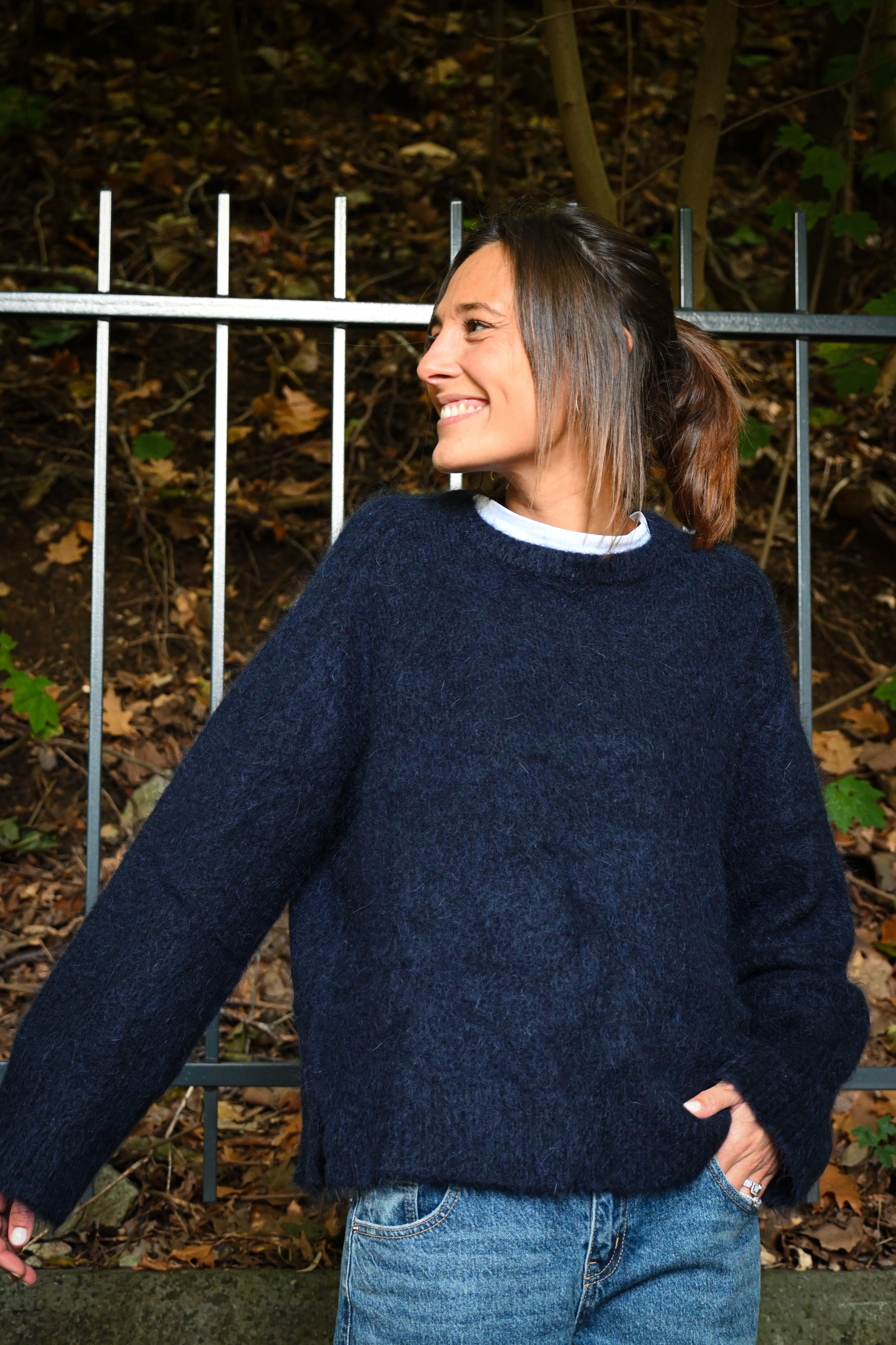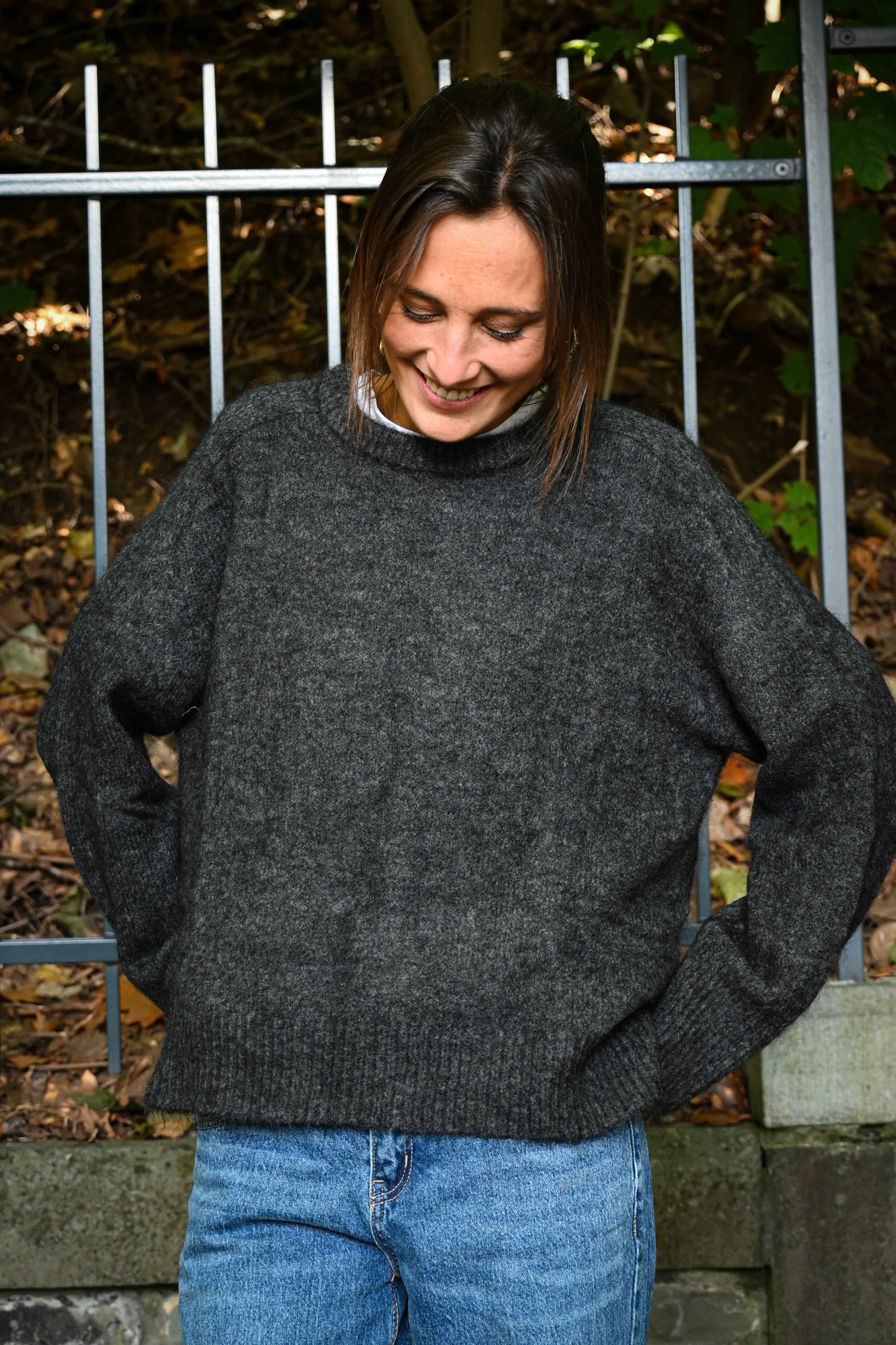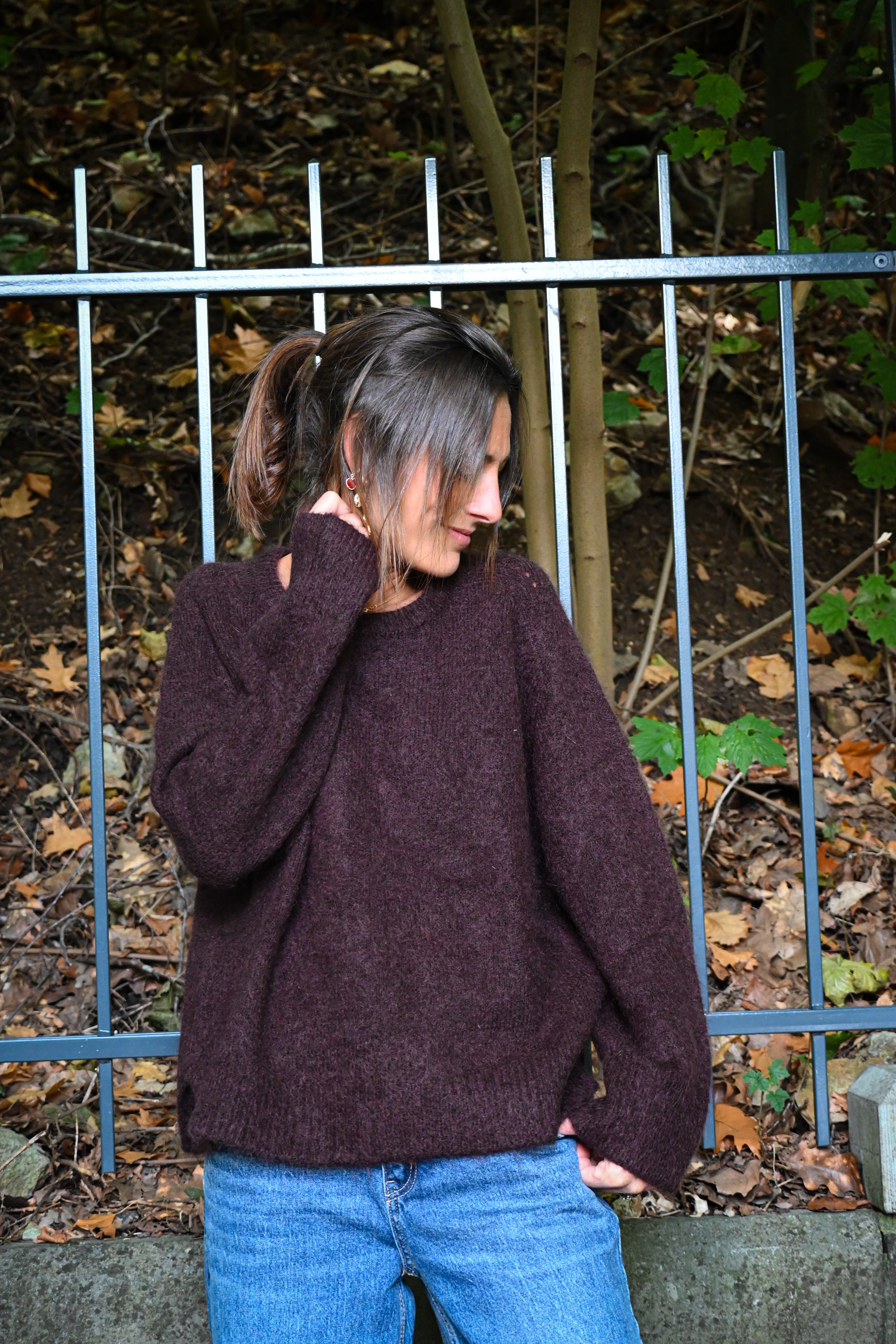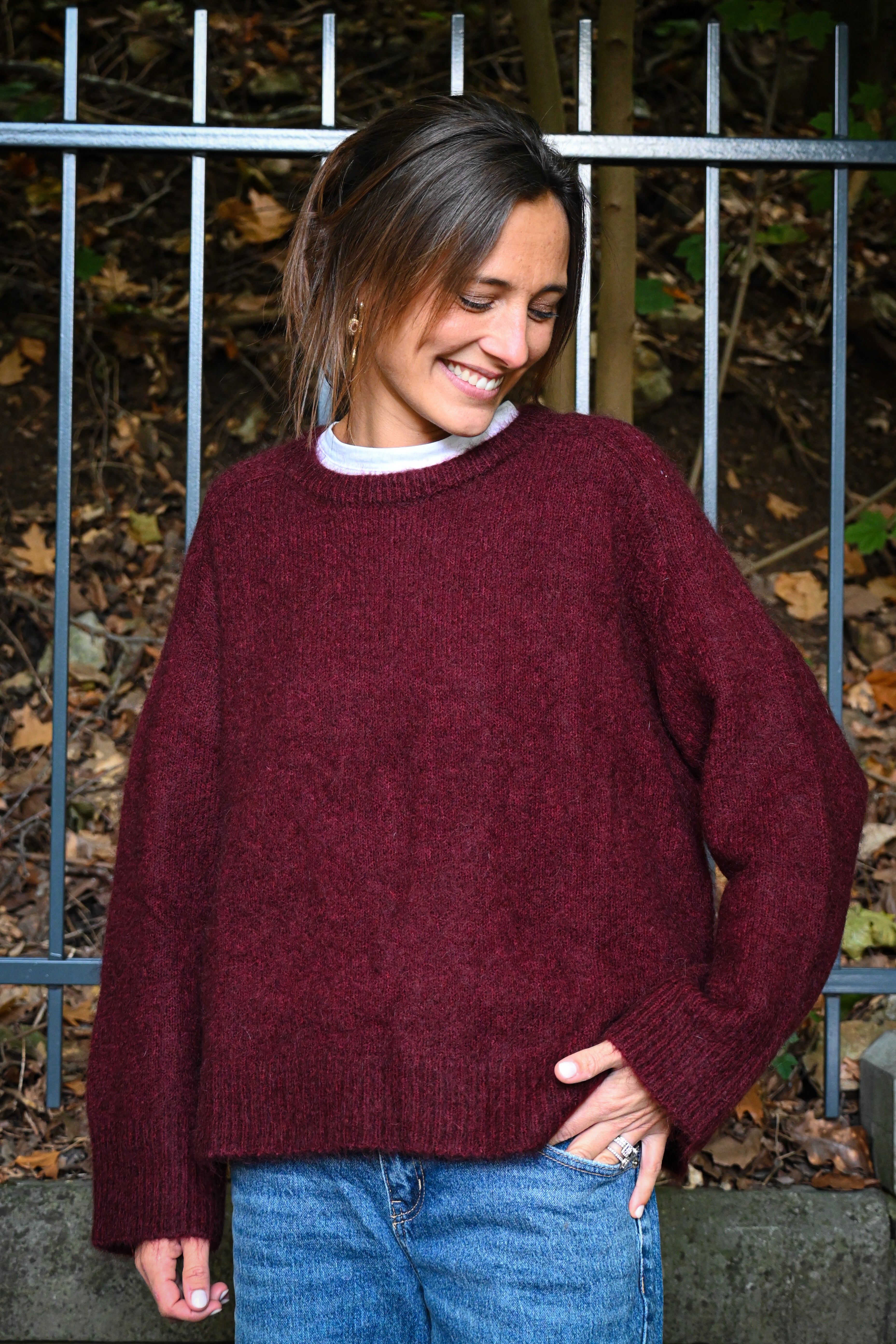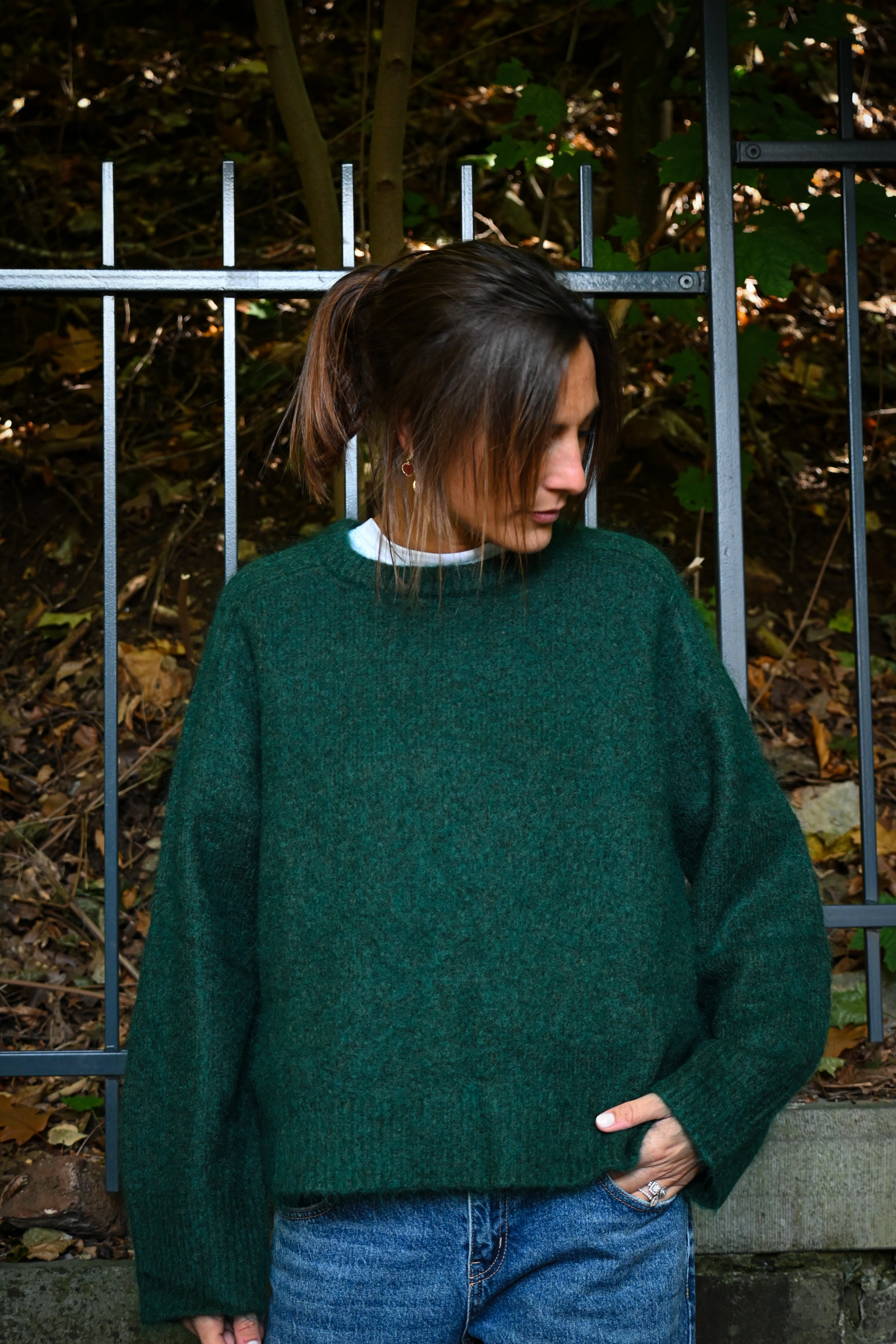 Ce pull en maille présente un col rond ample et des manches longues larges avec des petites surpiqûres à hauteur de l’épaule, subtilement ajustées aux poignets pour un confort optimal et un style décontracté chic. Il est légèrement cranté sur le côté.