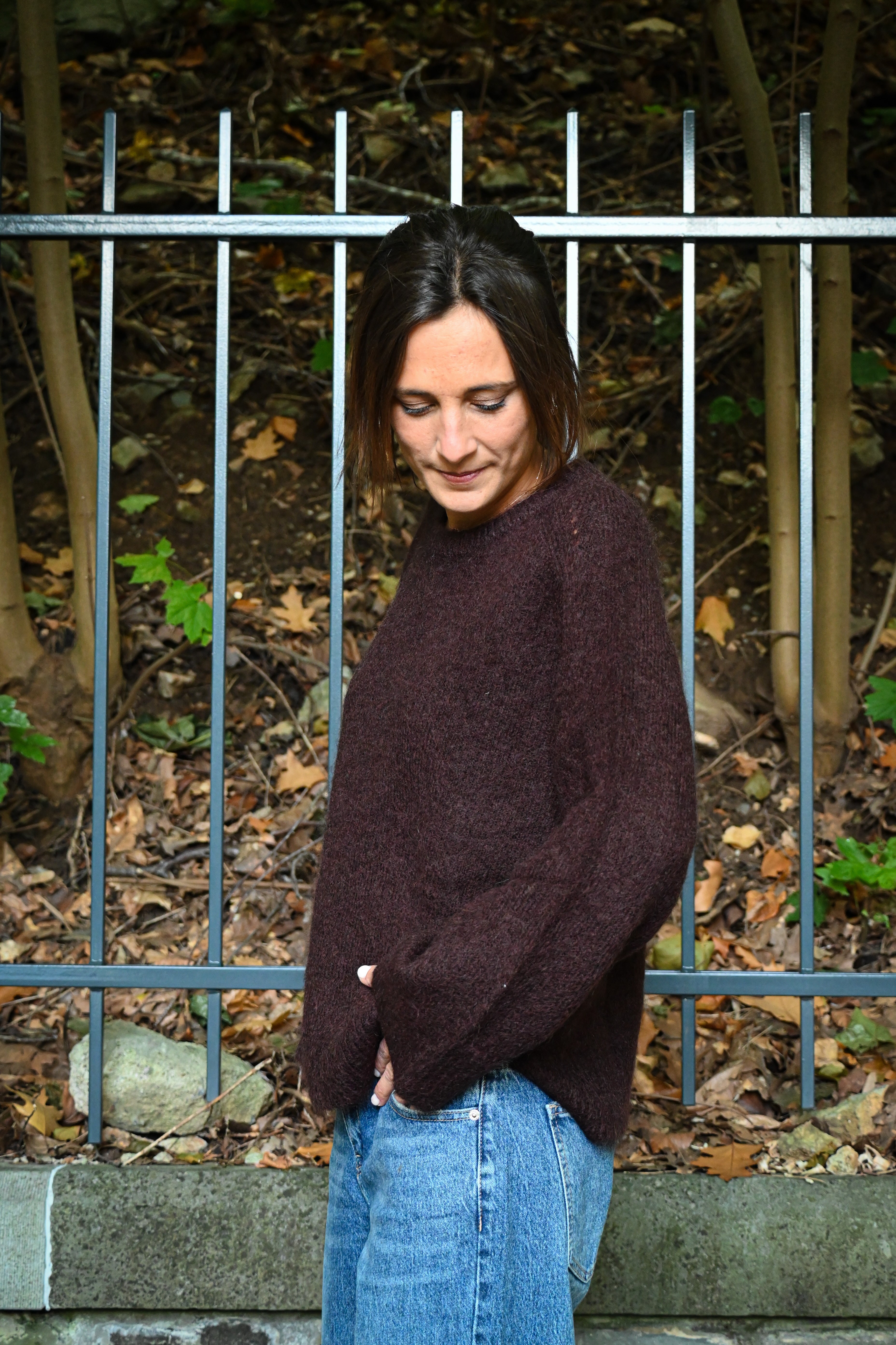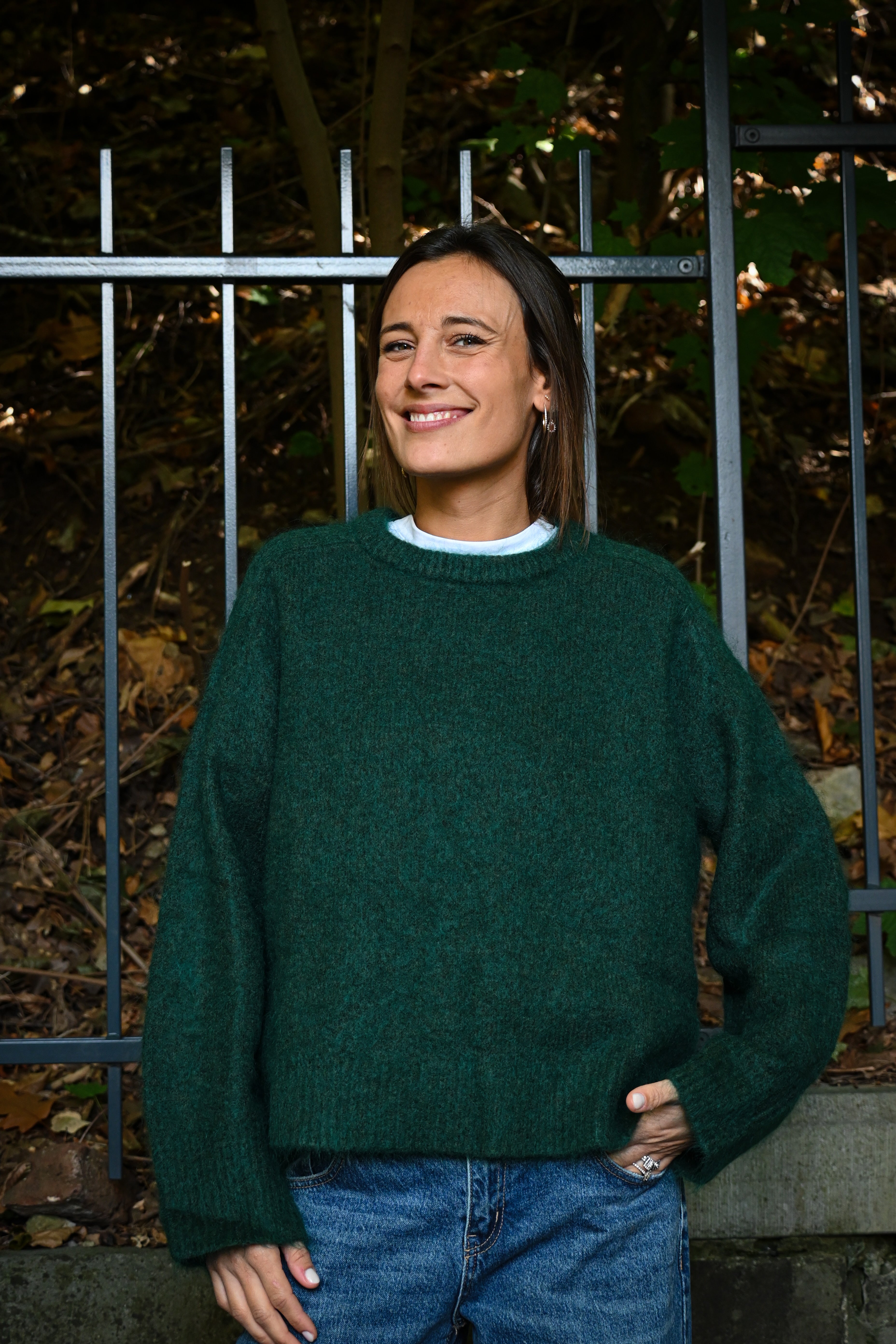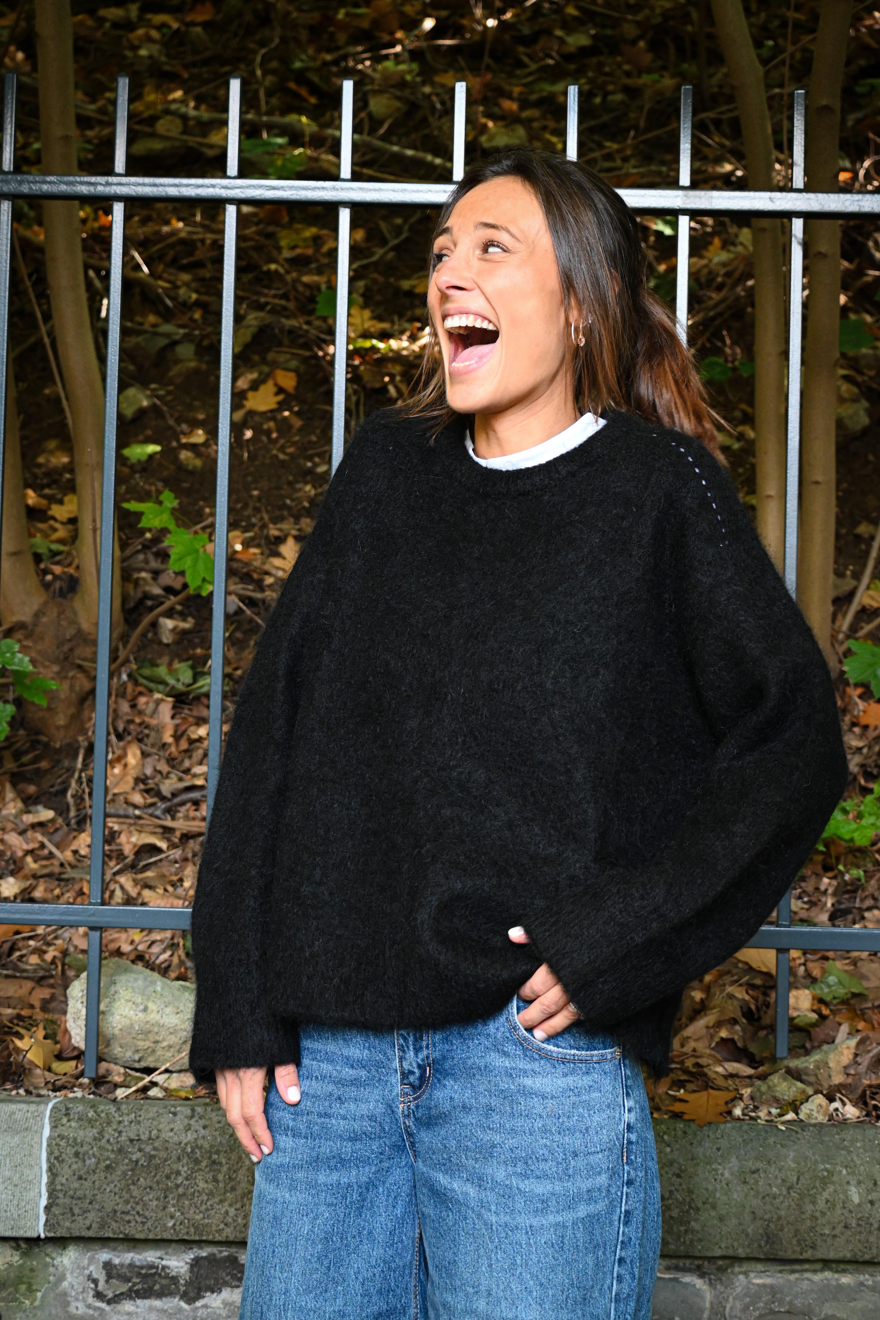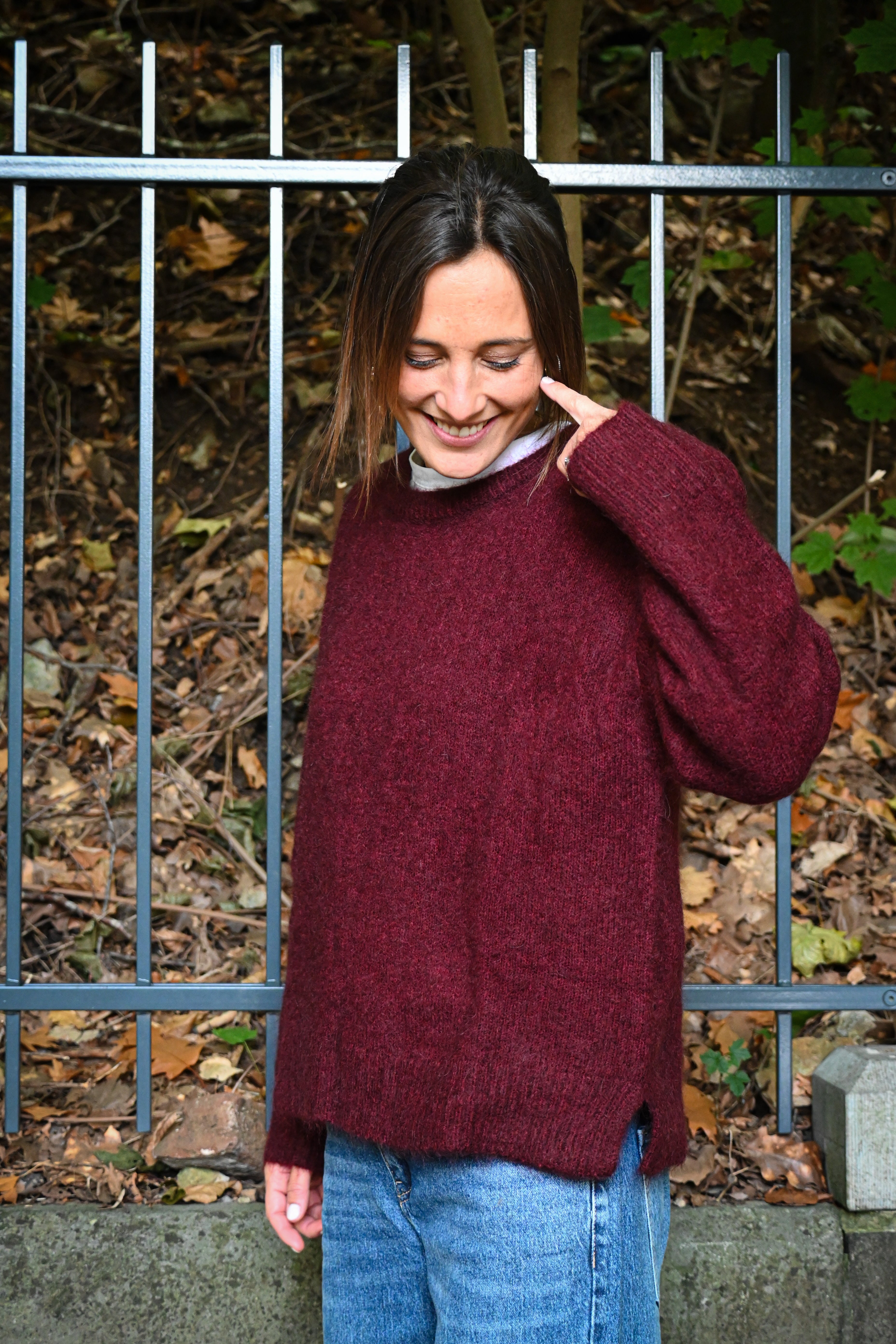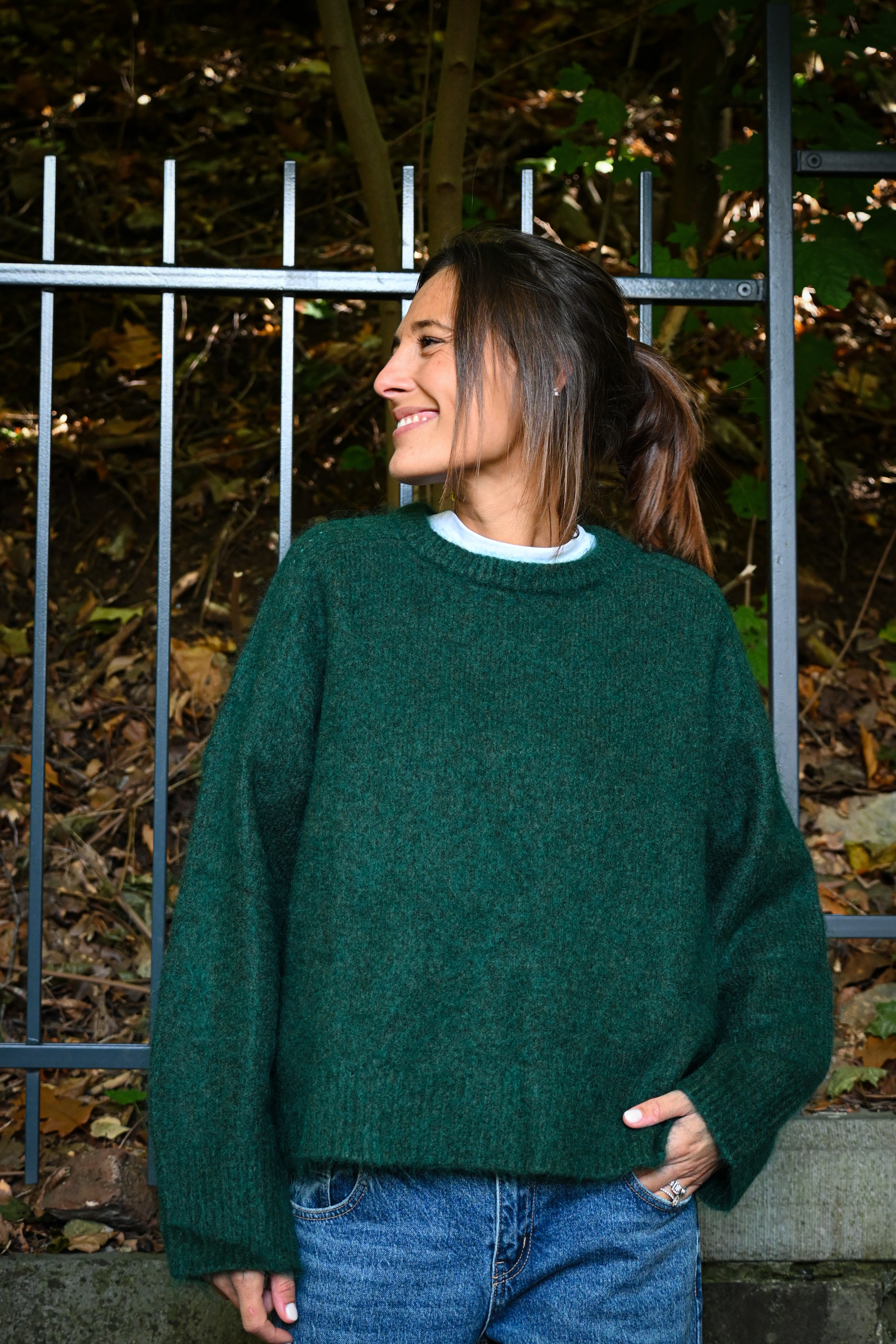 Ce pull en maille présente un col rond ample et des manches longues larges avec des petites surpiqûres à hauteur de l’épaule, subtilement ajustées aux poignets pour un confort optimal et un style décontracté chic. Il est légèrement cranté sur le côté.