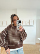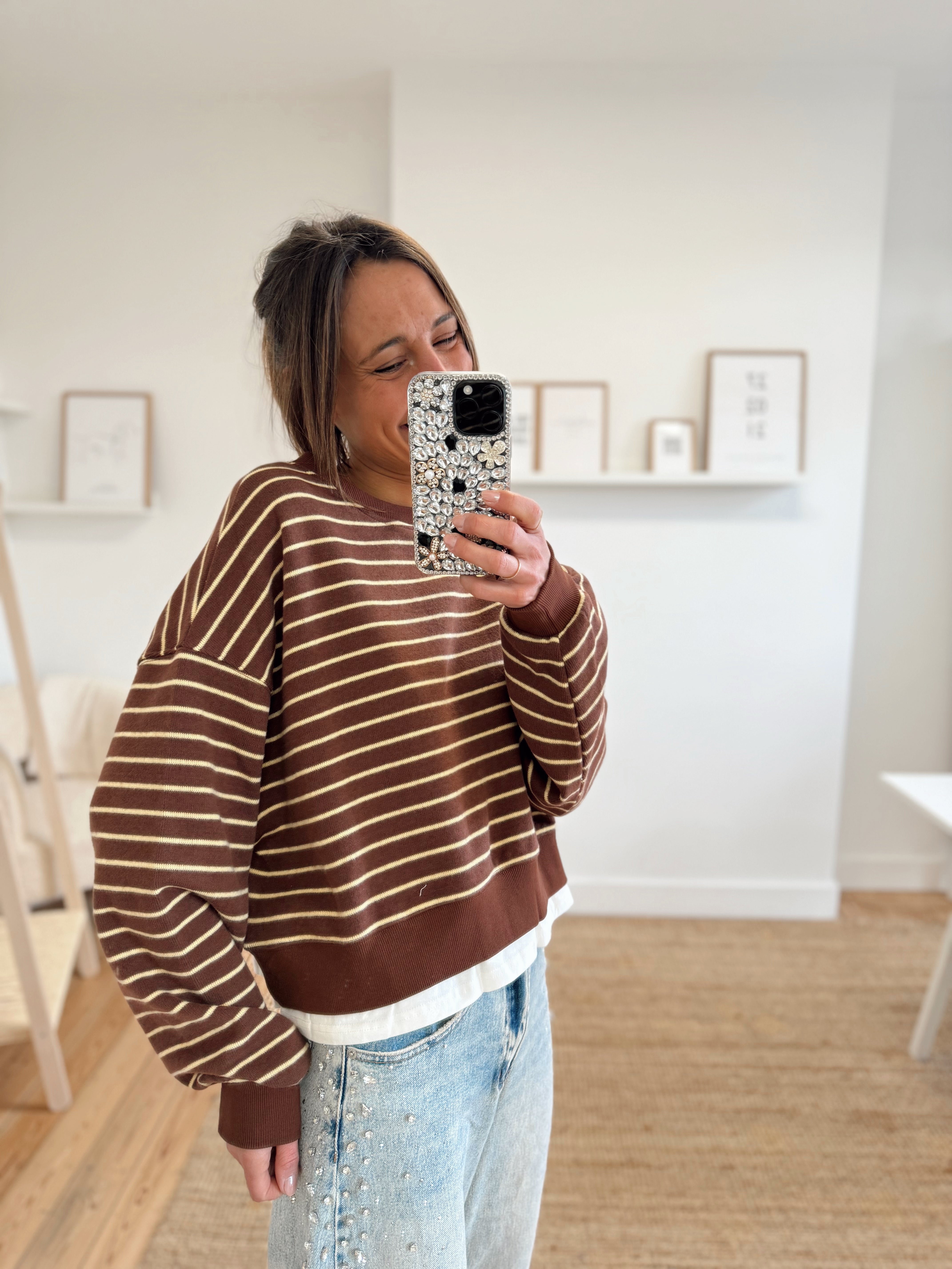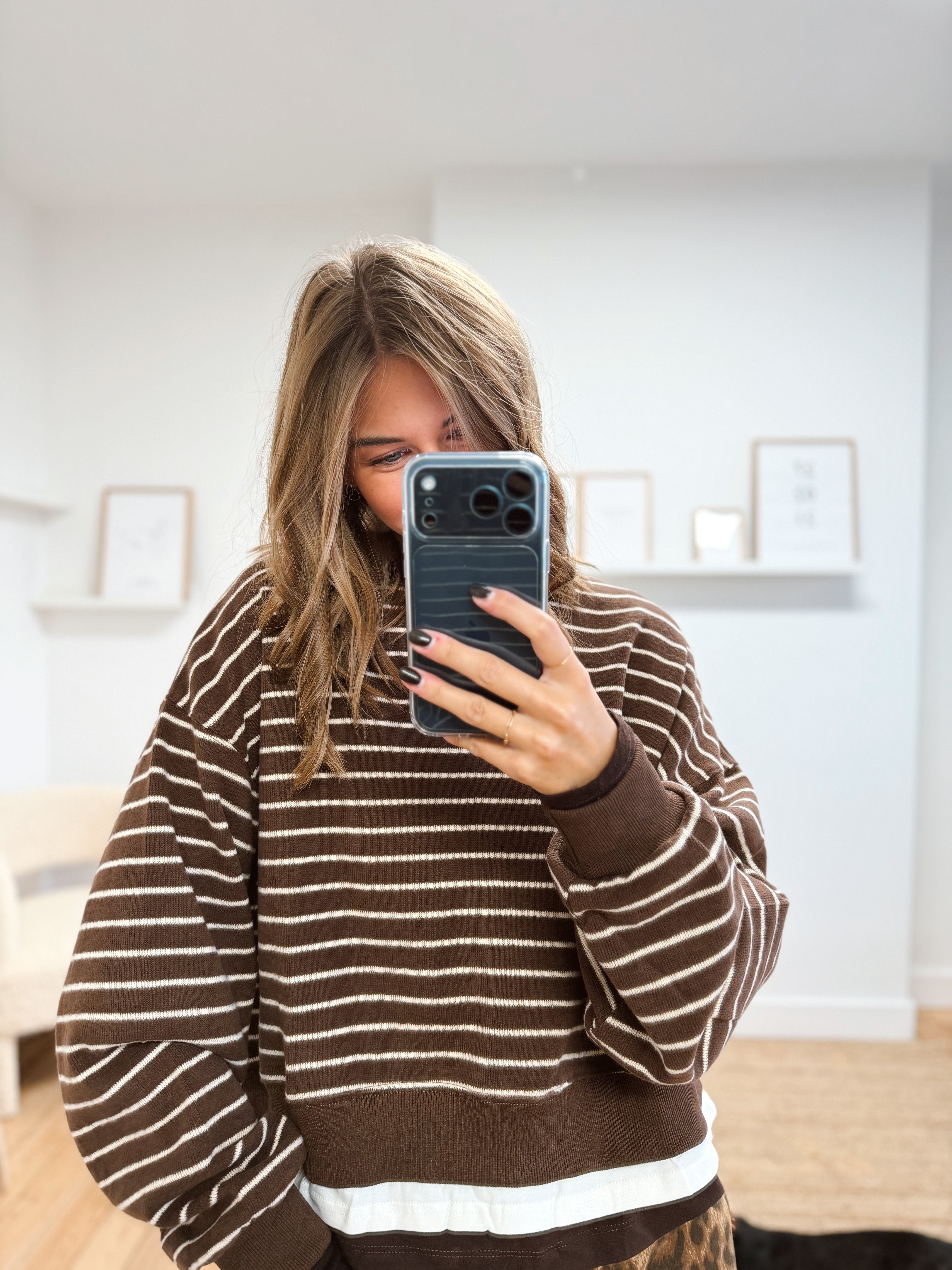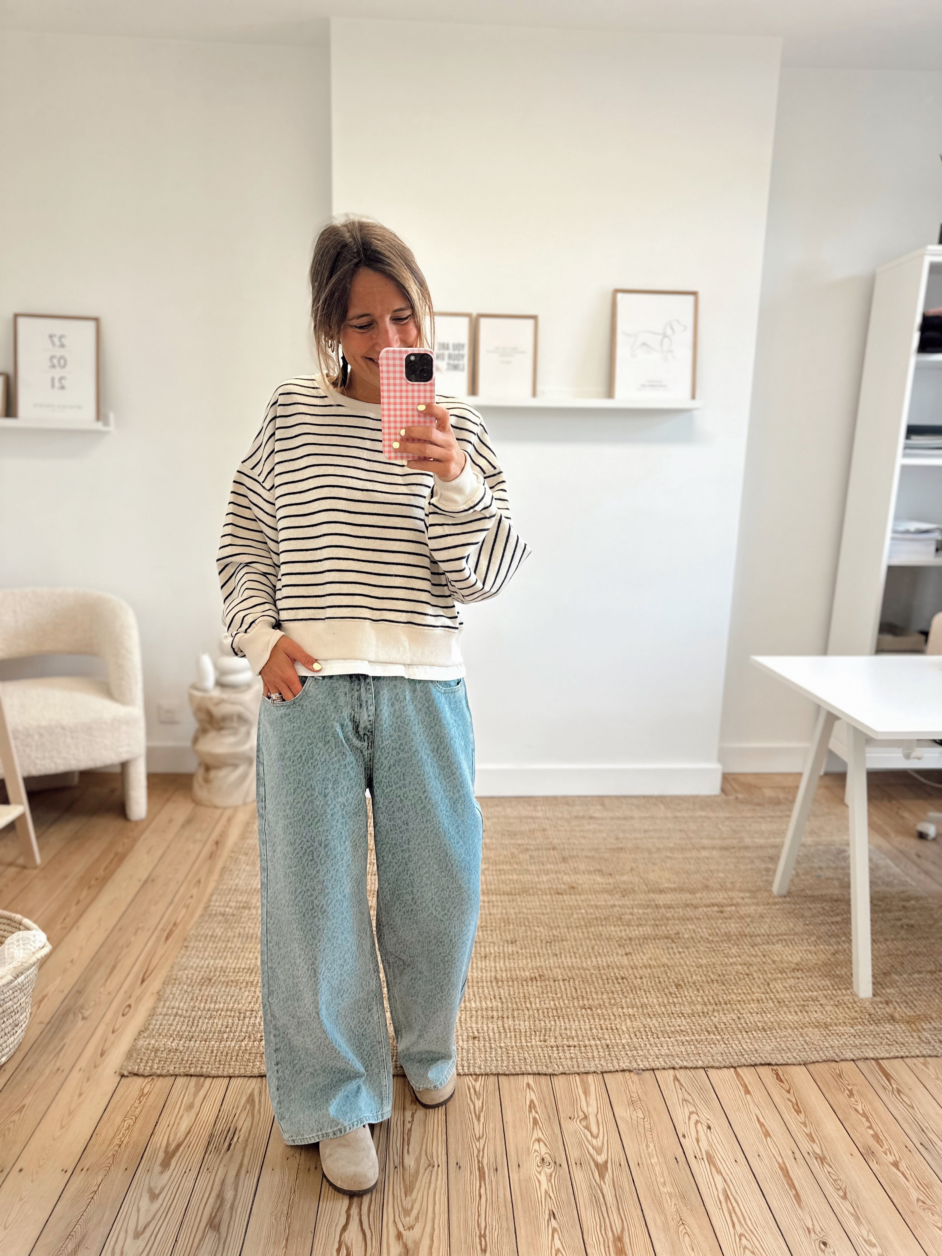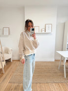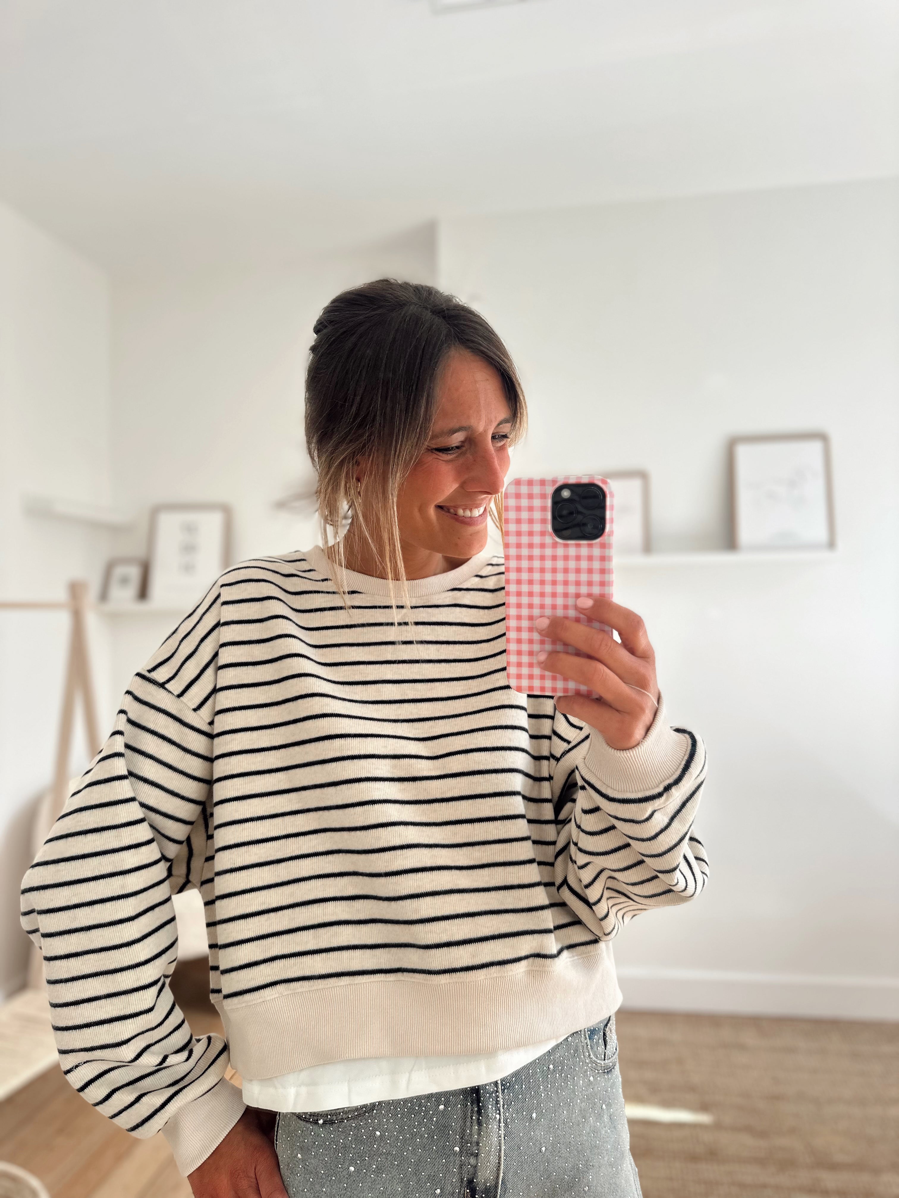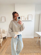 Sweat ligné beige et bleu marine foncé avec un bord de t-shirt qui dépasse dans le bas. Matière douce, il est disponible seulement en taille unique mais s'adapte facilement à toutes les tailles et morphologies.