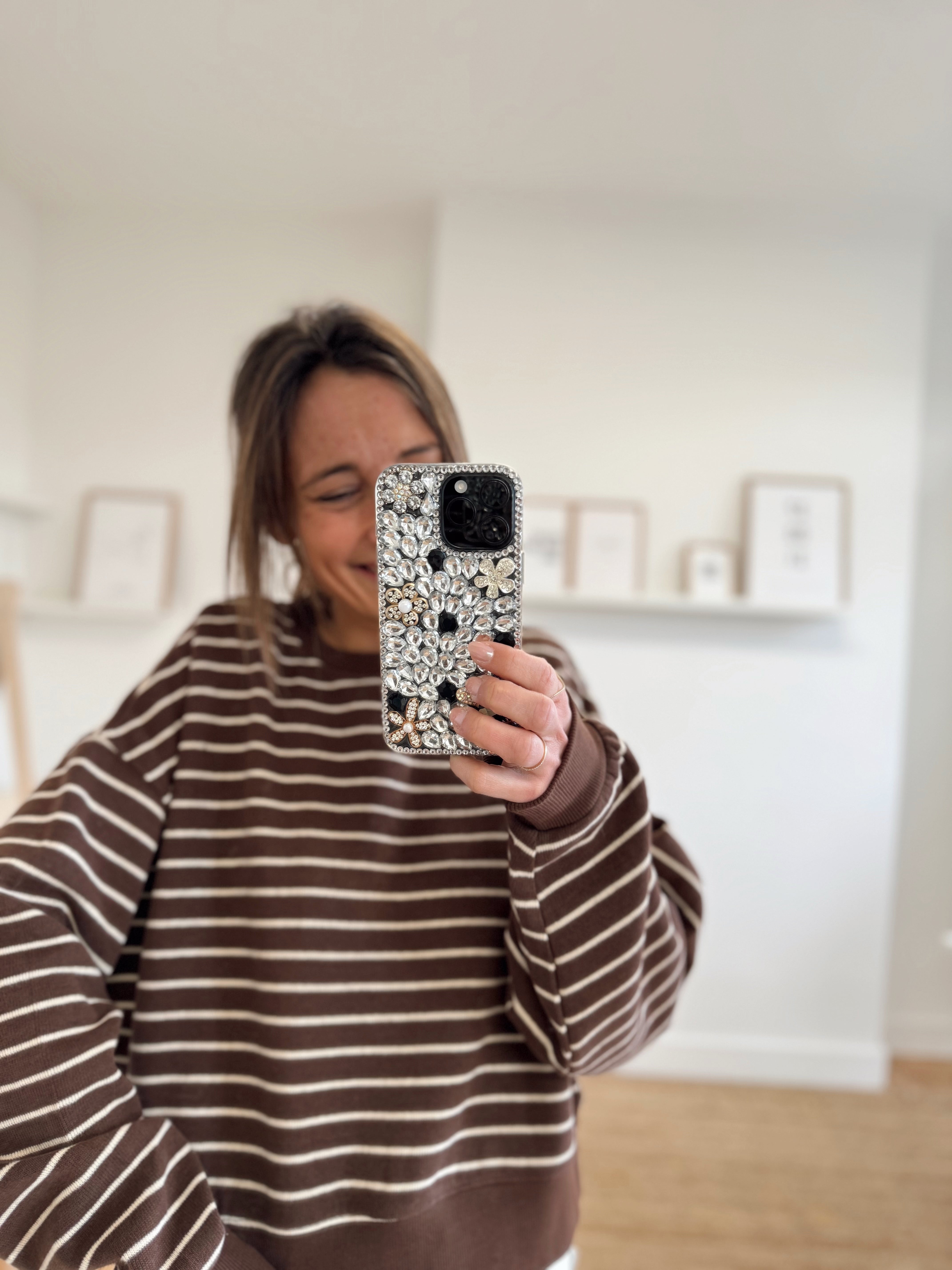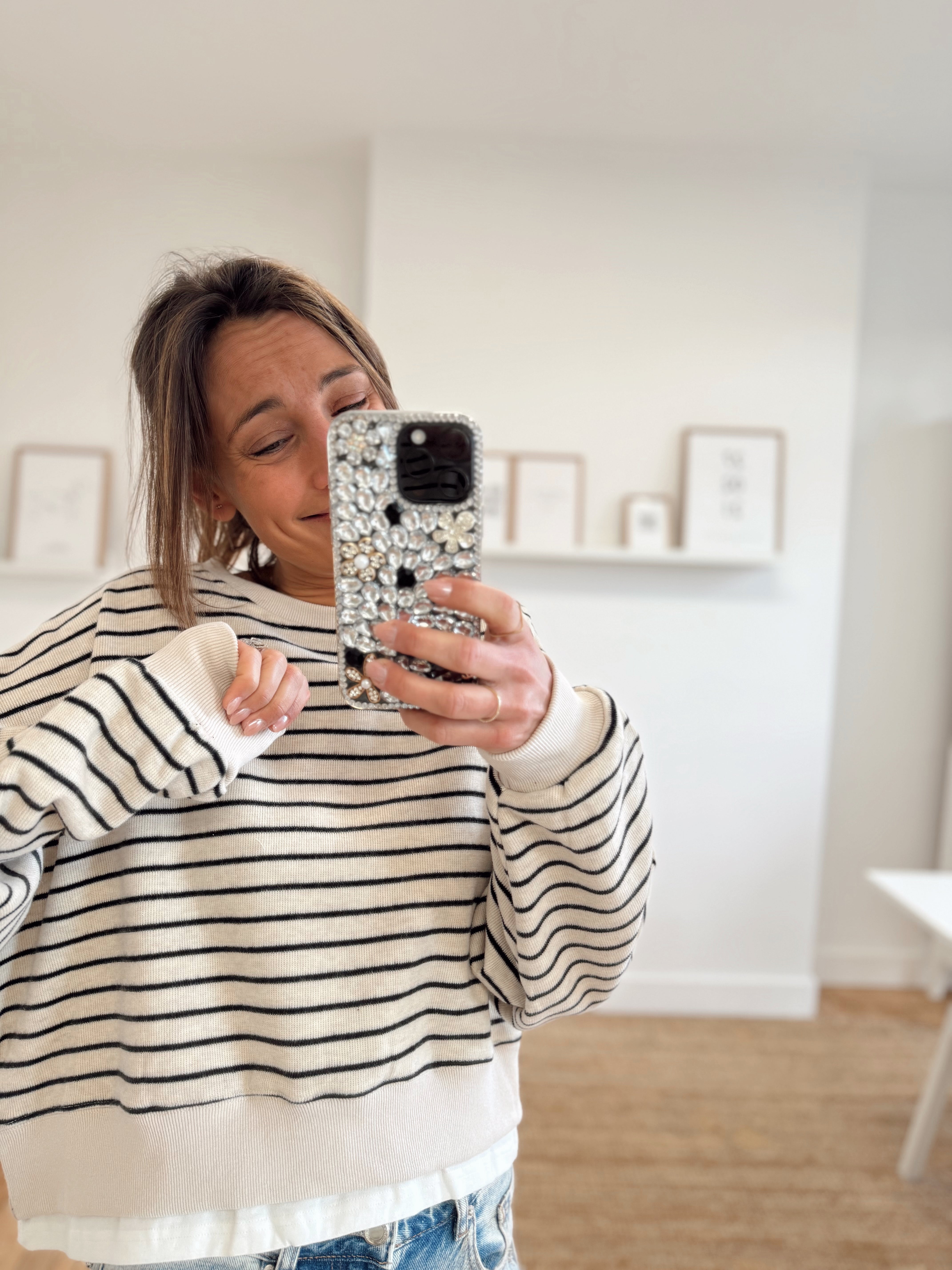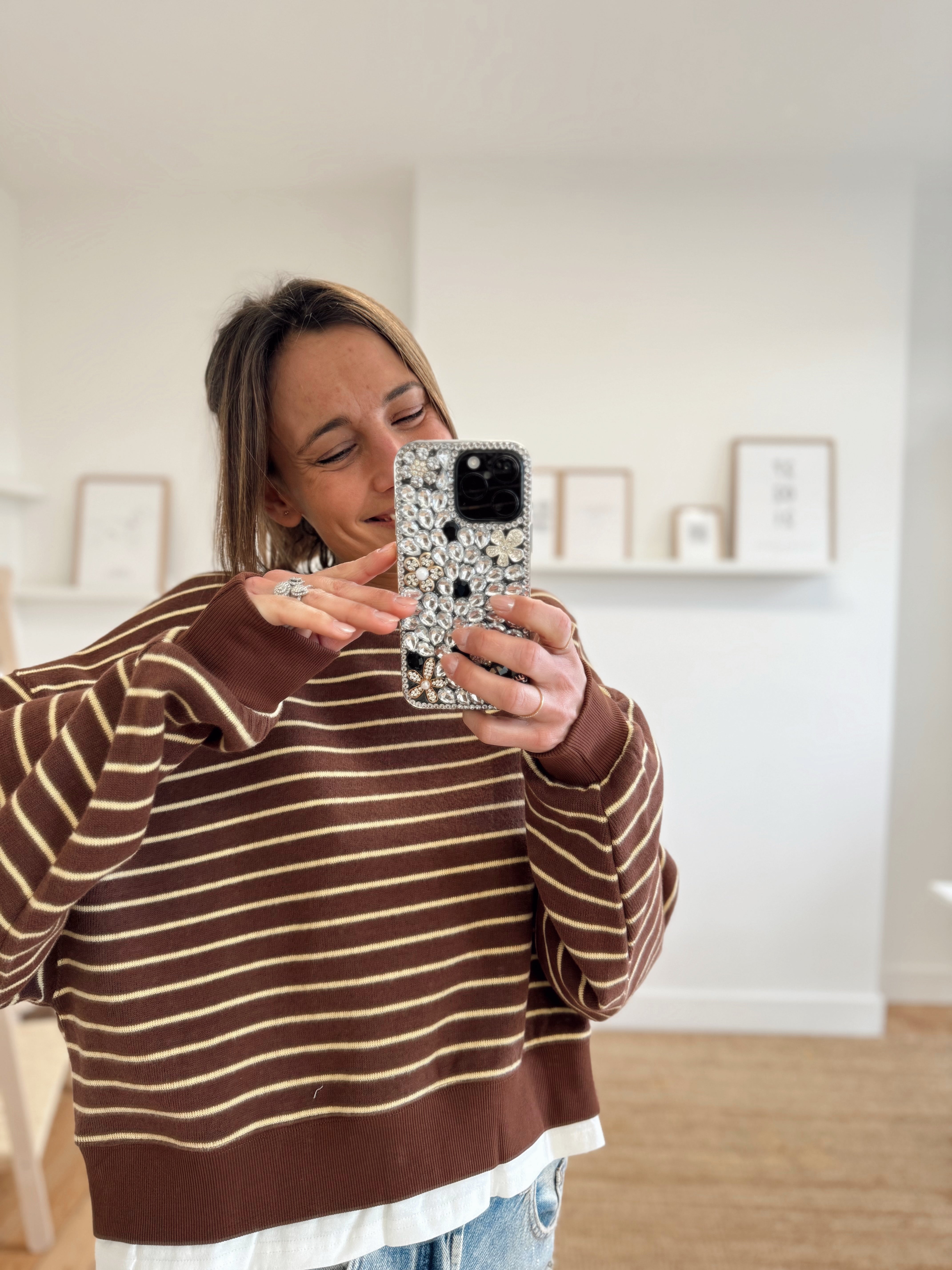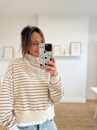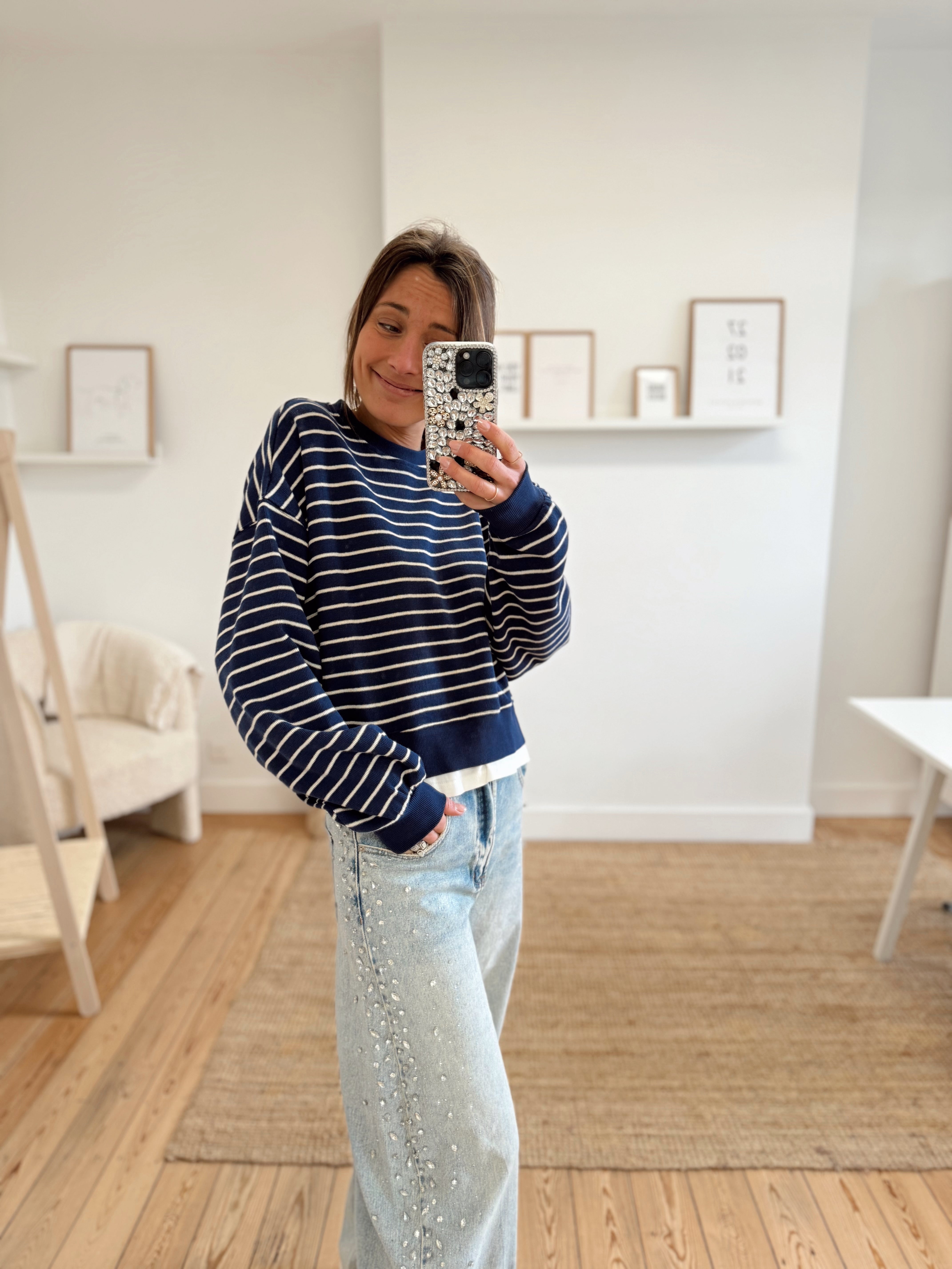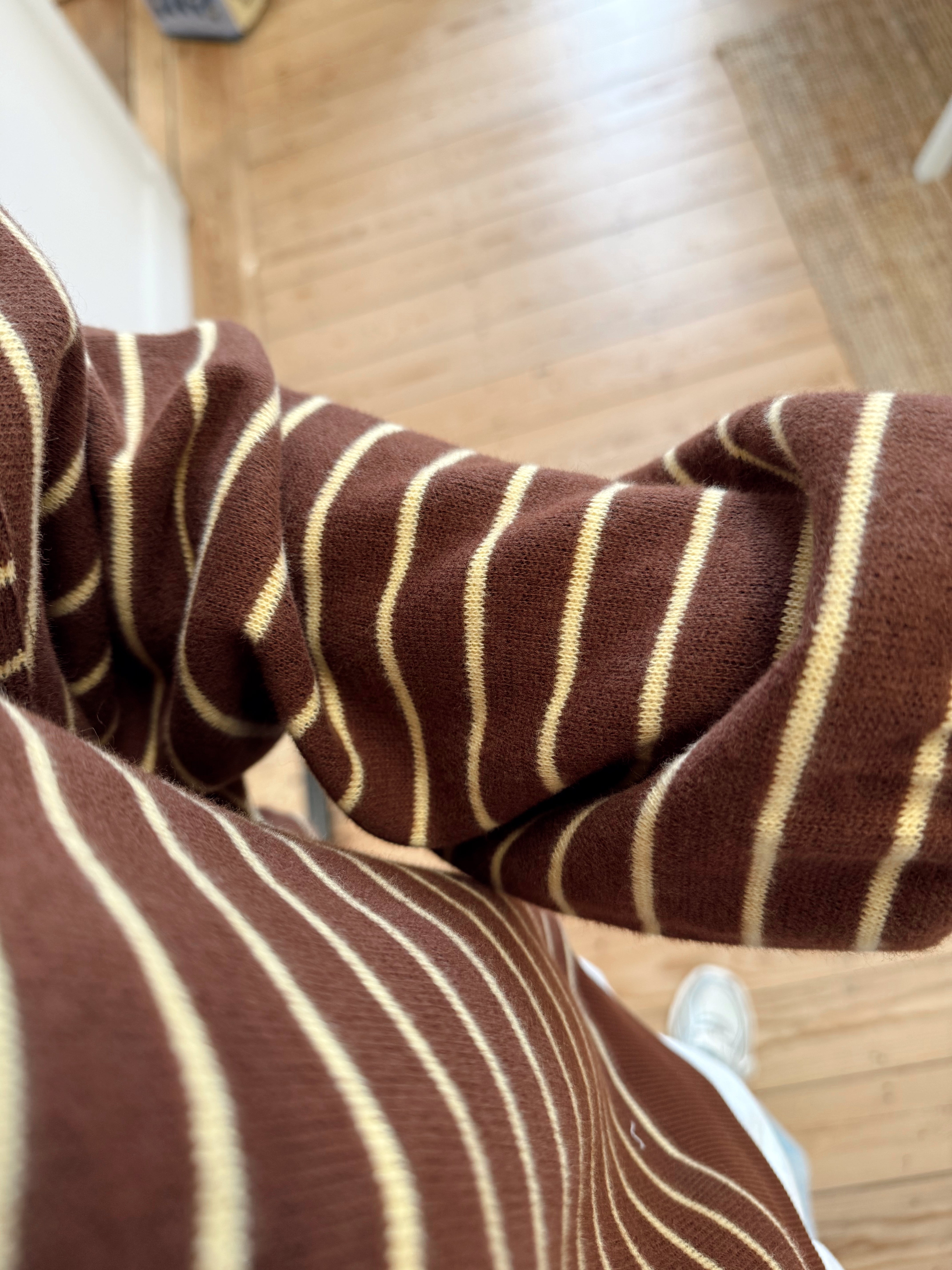 Sweat ligné beige et bleu marine foncé avec un bord de t-shirt qui dépasse dans le bas. Matière douce, il est disponible seulement en taille unique mais s'adapte facilement à toutes les tailles et morphologies.