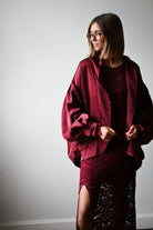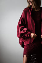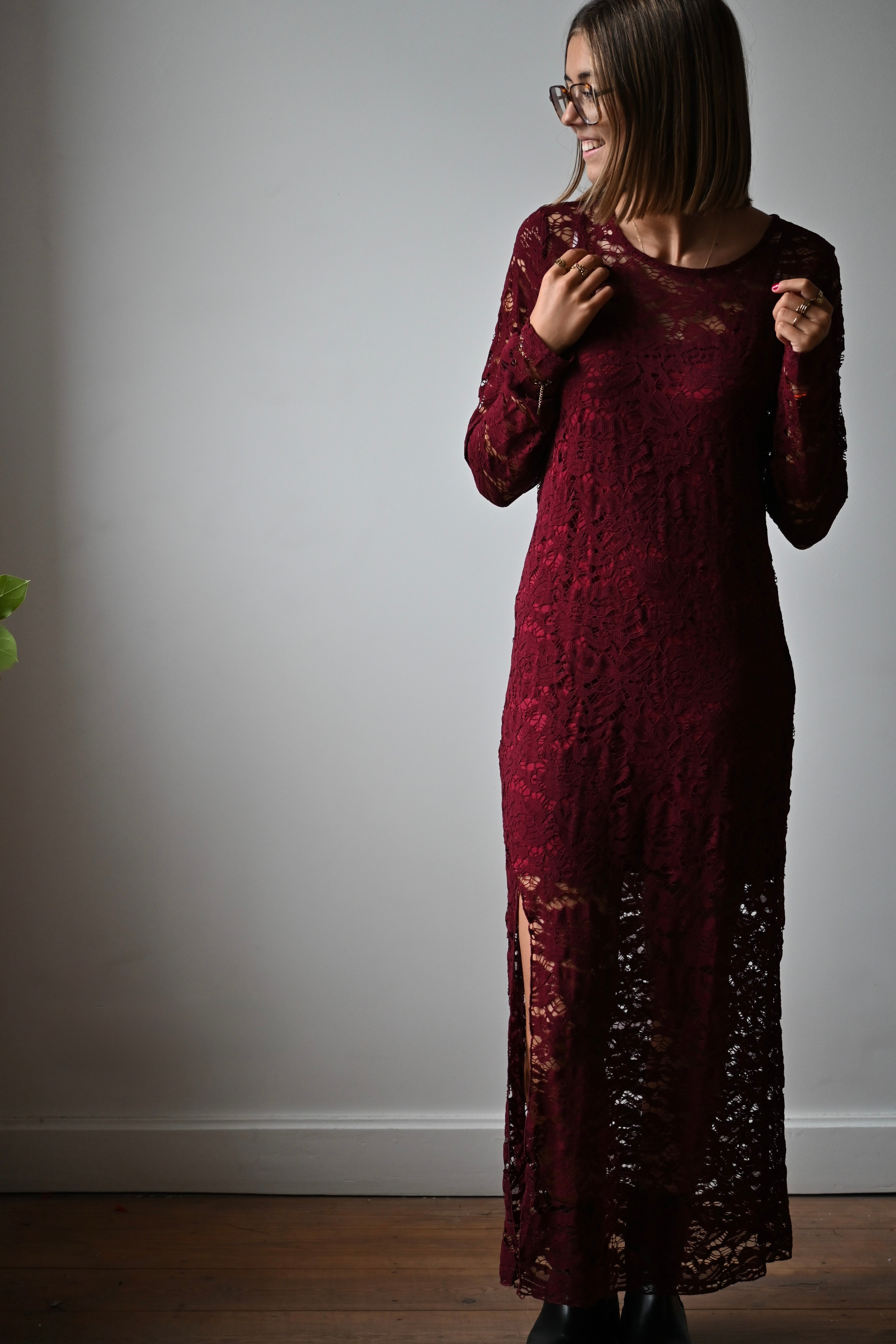 Robe longue à manches longues, entièrement en dentelle, accompagnée d'une sous-robe mi-longue avec une fente sur le côté, disponible en taille unique.