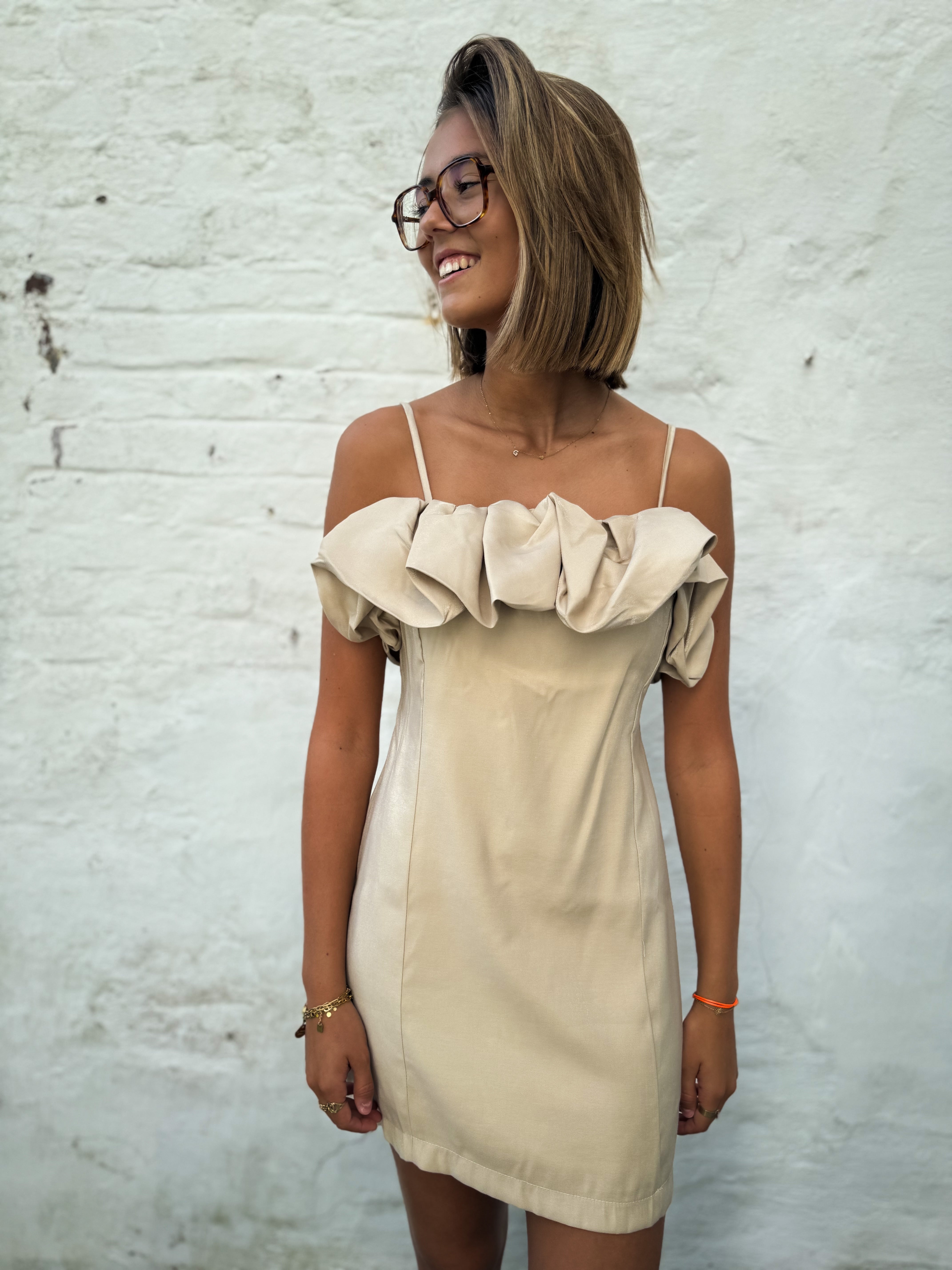 Cette robe courte beige, dotée de fines bretelles et d’un large volant sur le buste, présente une légère brillance satinée. Composée à 80 % de viscose et 20 % de polyester, elle se lave facilement à 30 degrés.