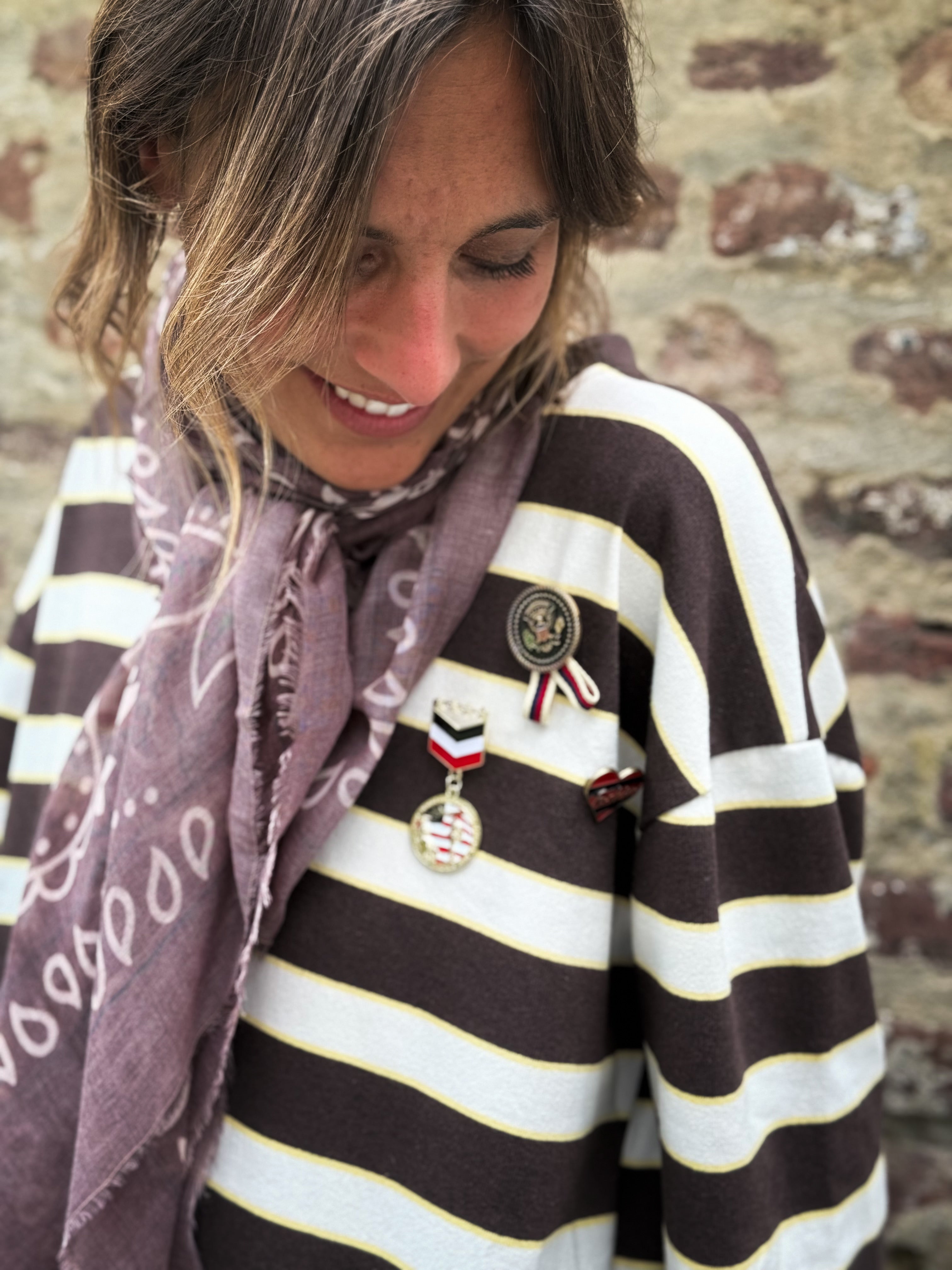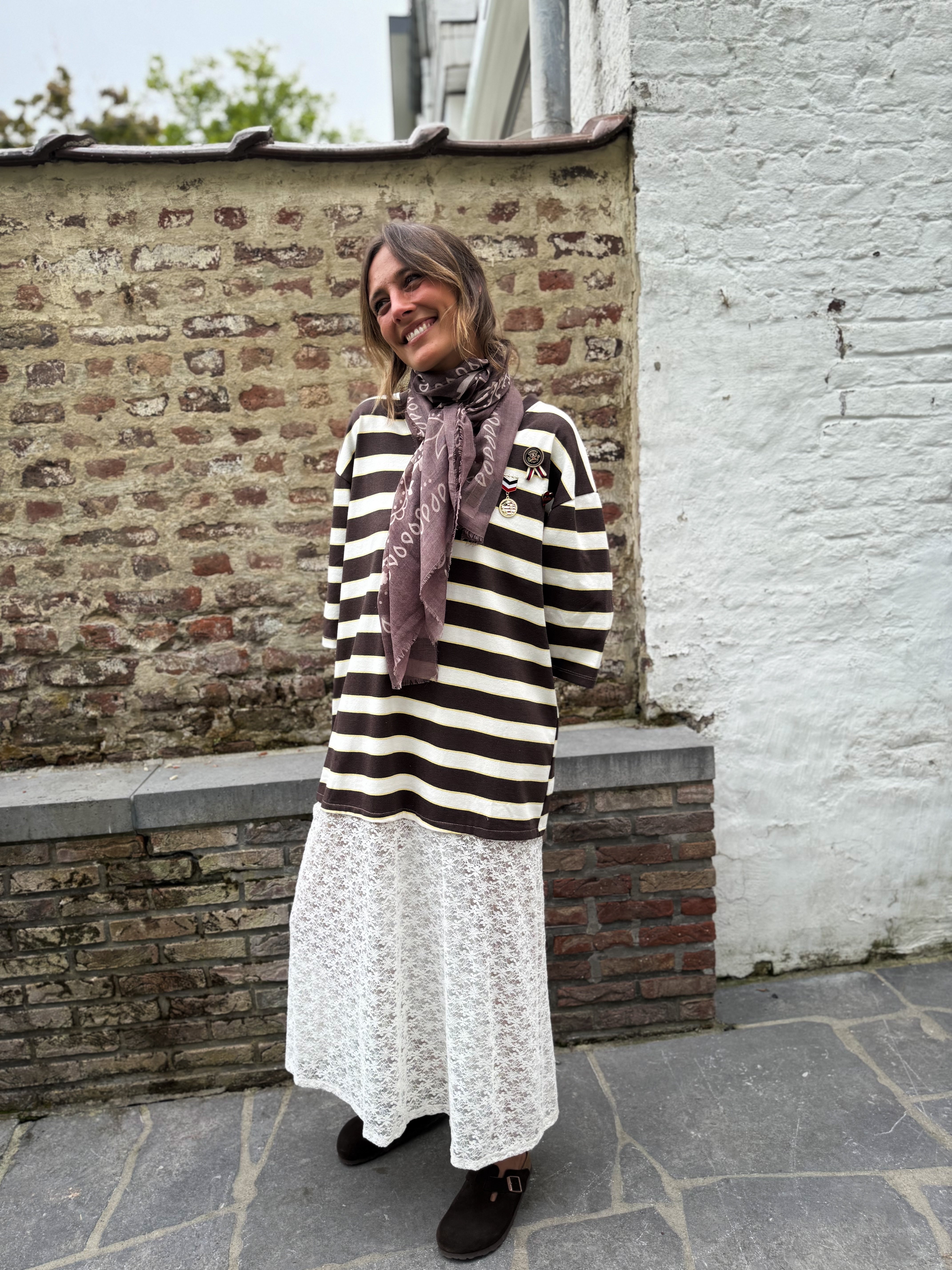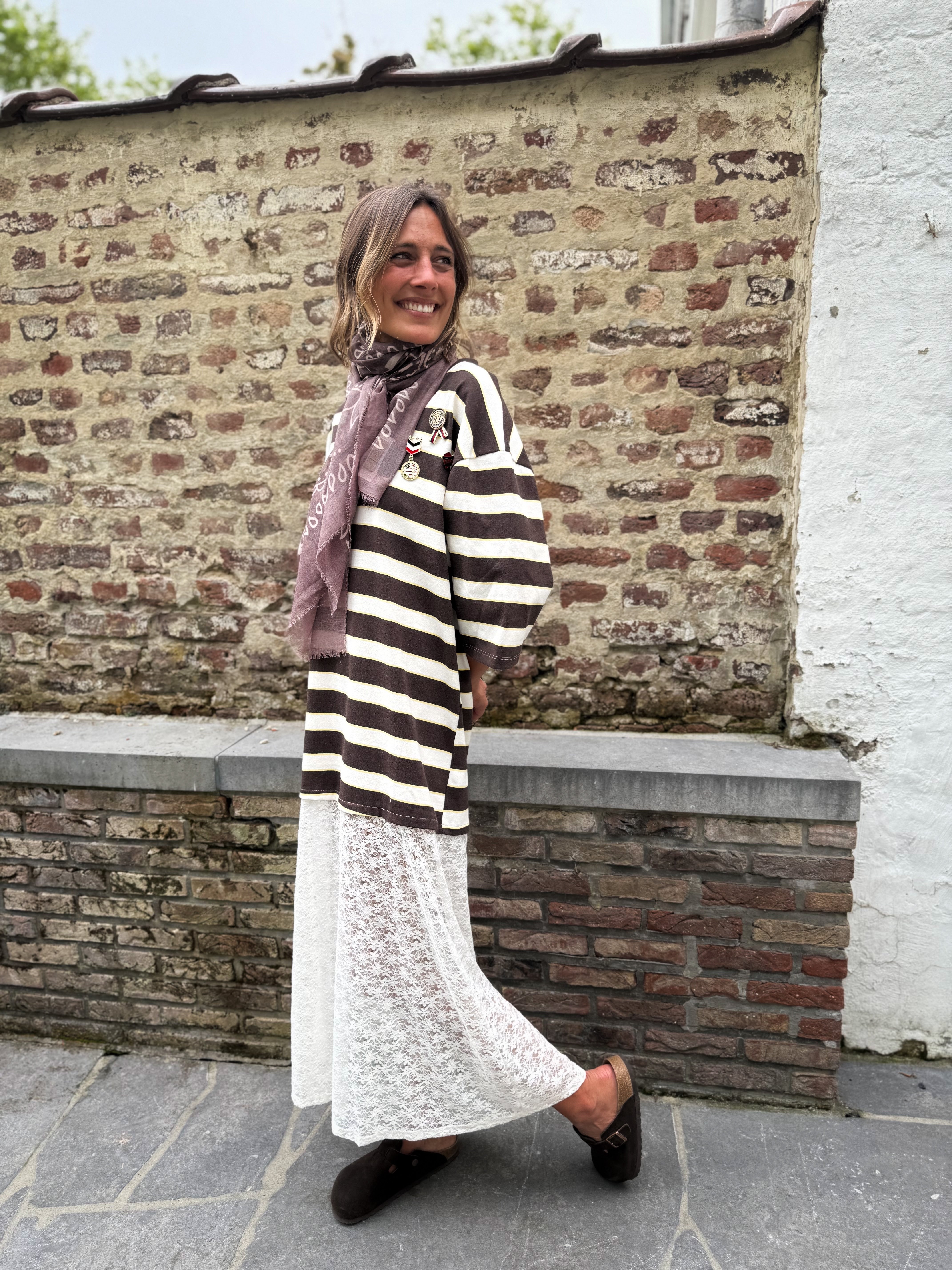 Cette robe t-shirt longue présente des rayures jaunes, beiges et chocolat, agrémentée d'une dentelle blanche délicate sur le bas. Des pins décoratifs ajoutent une touche originale. Disponible en taille unique, elle allie confort et style avec élégance.