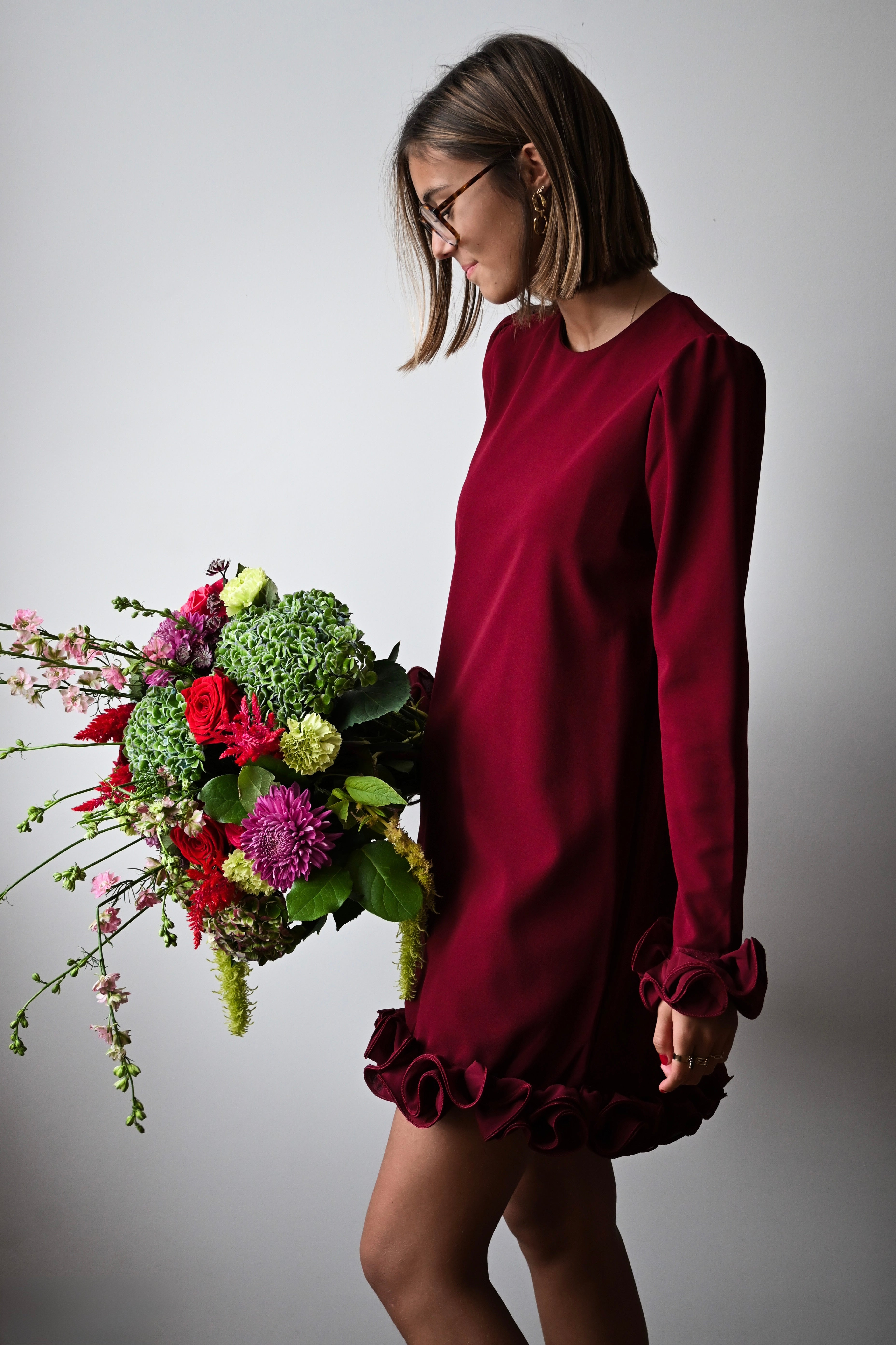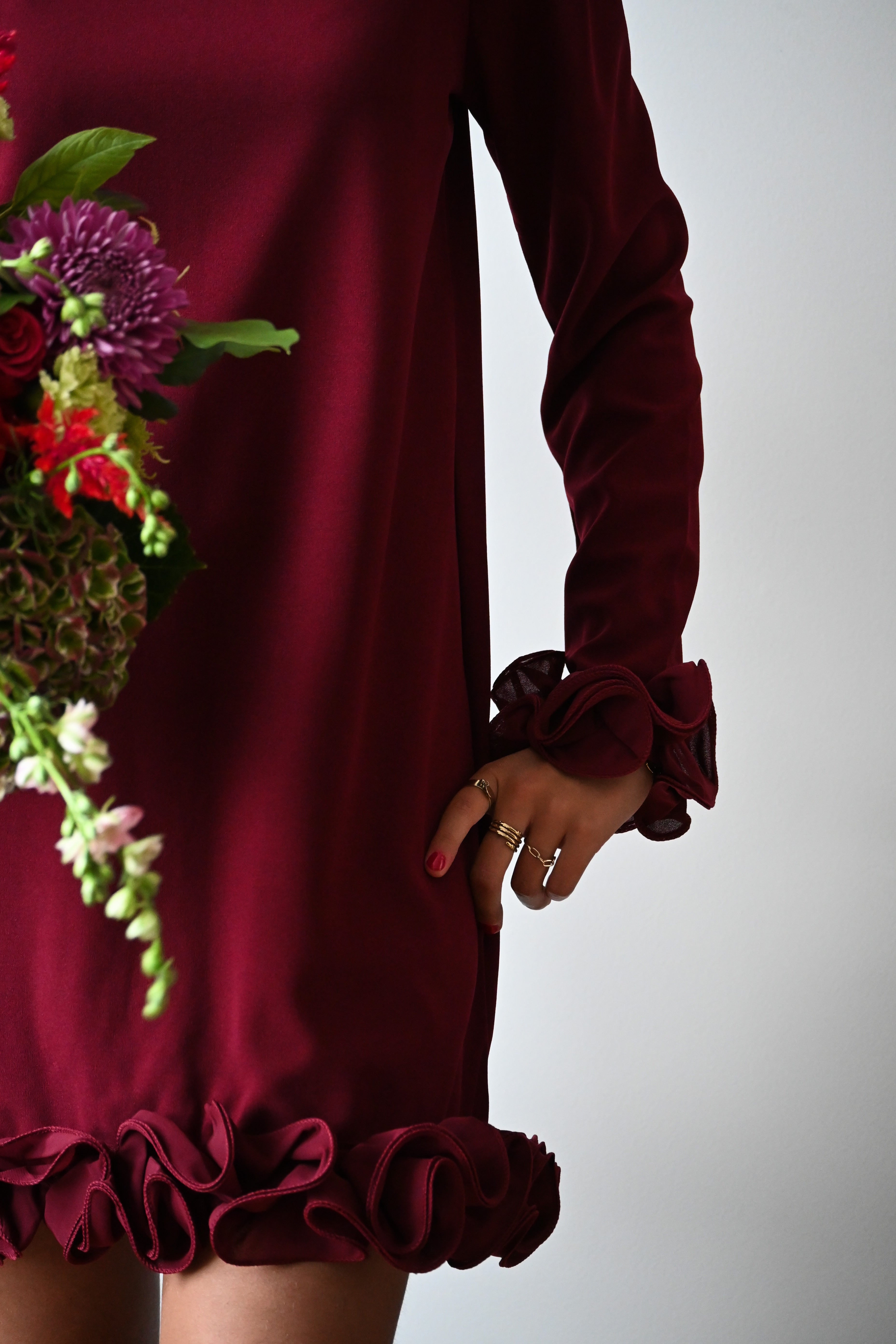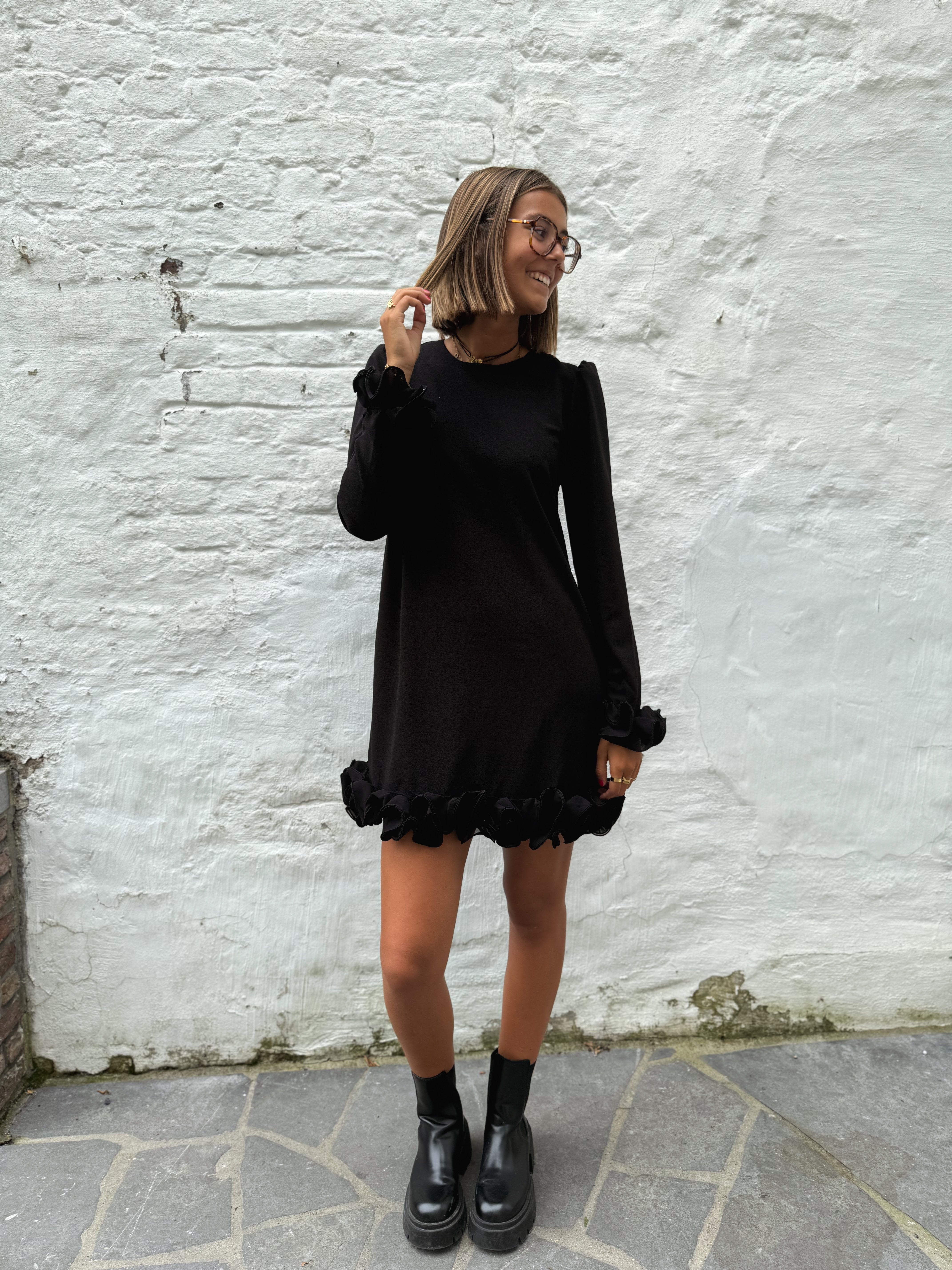 Cette robe noire courte à manches longues se distingue par ses délicats froufrous au bas de la jupe et des manches, offrant une touche féminine et élégante. Disponible en tailles S, M et L, elle est parfaite pour sublimer votre silhouette avec style.