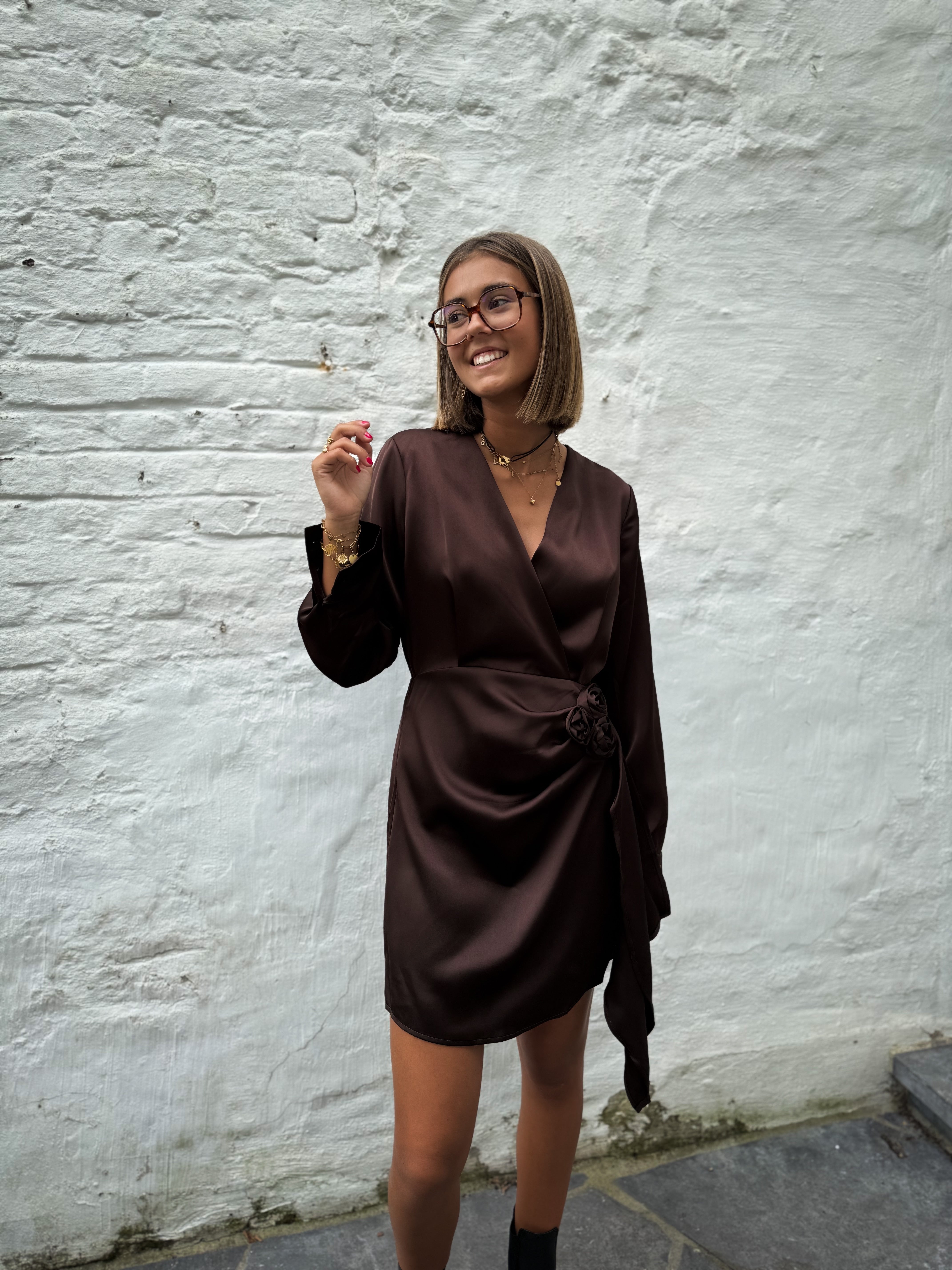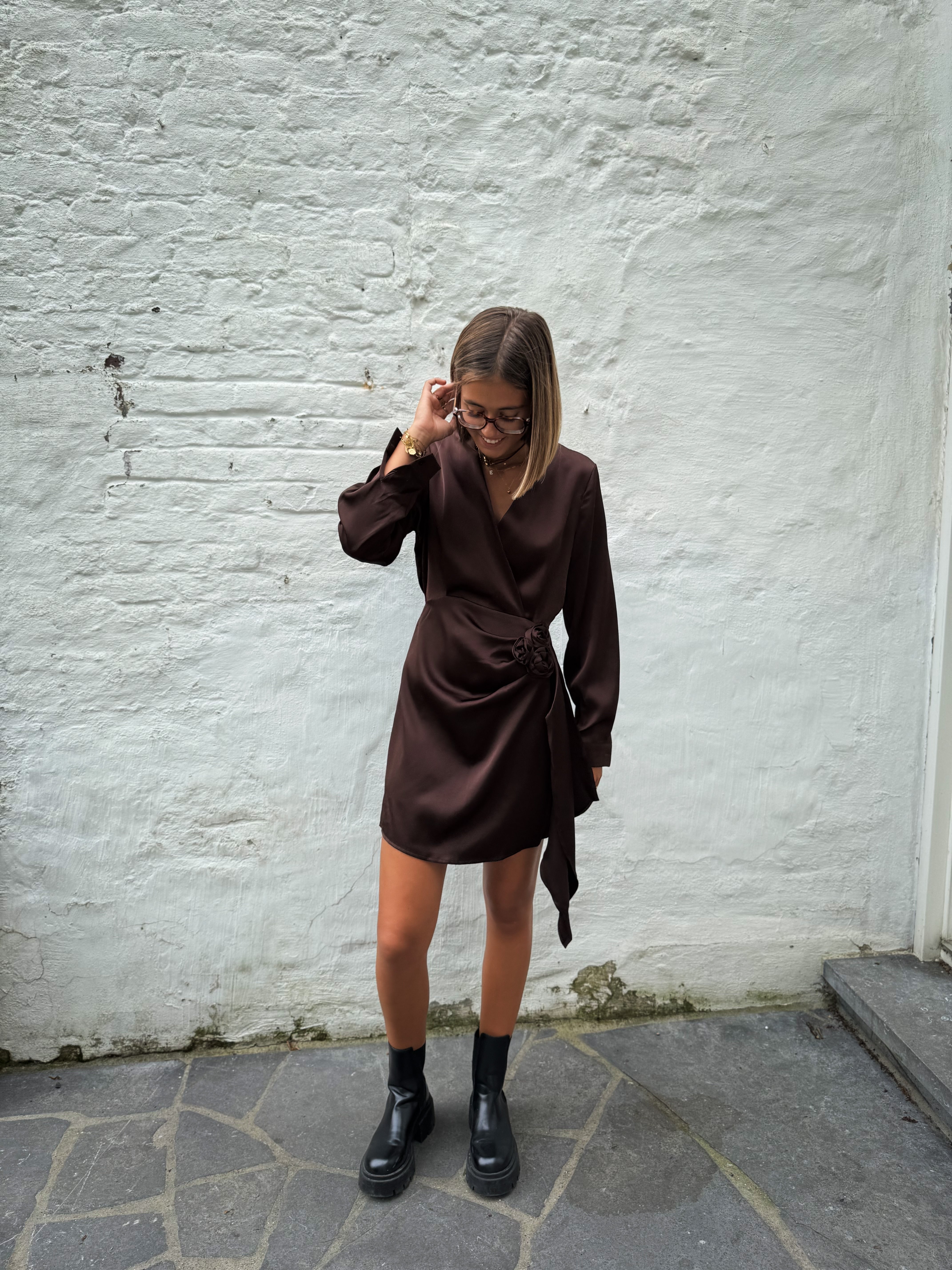 Cette robe chocolat en satin, courte et dotée de manches longues, se distingue par une élégante fleur placée sur le côté et un pan asymétrique plus long. Disponible en tailles S, M et L, elle allie charme et sophistication pour sublimer votre silhouette.
