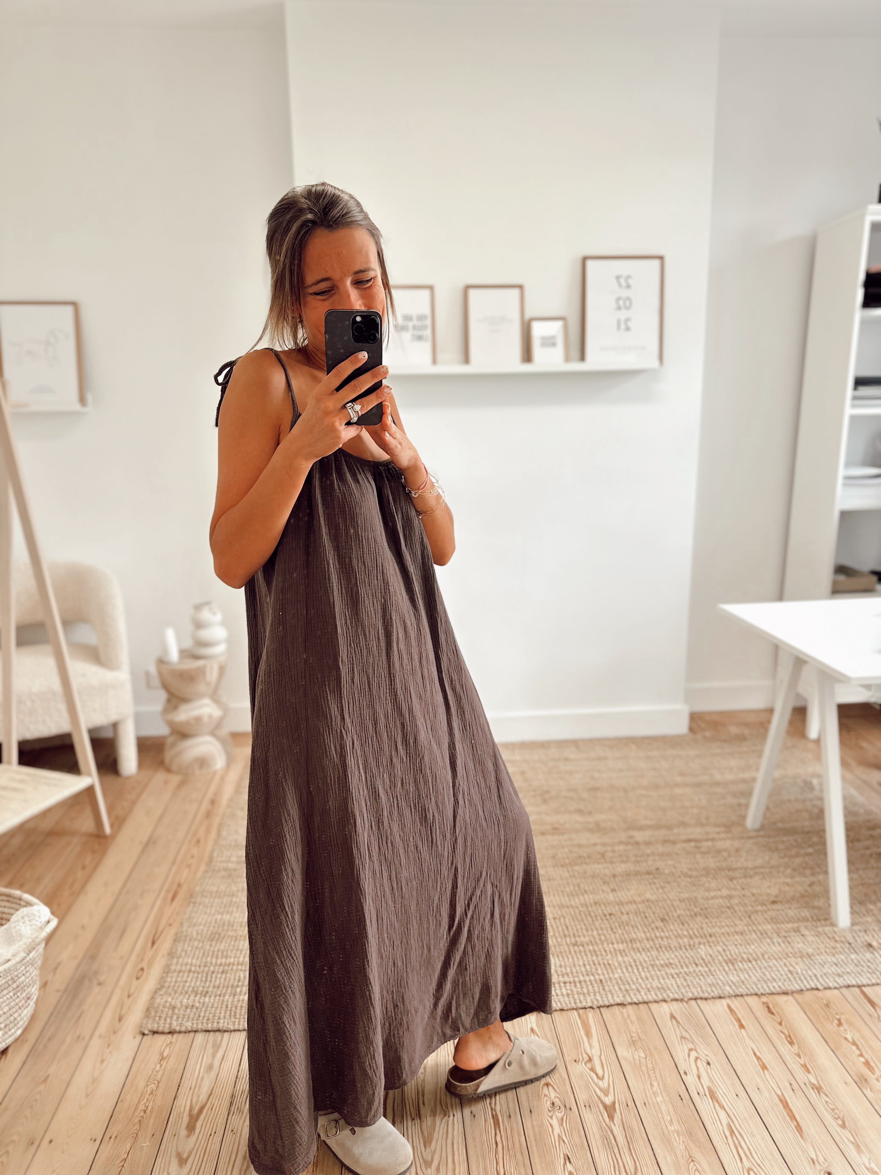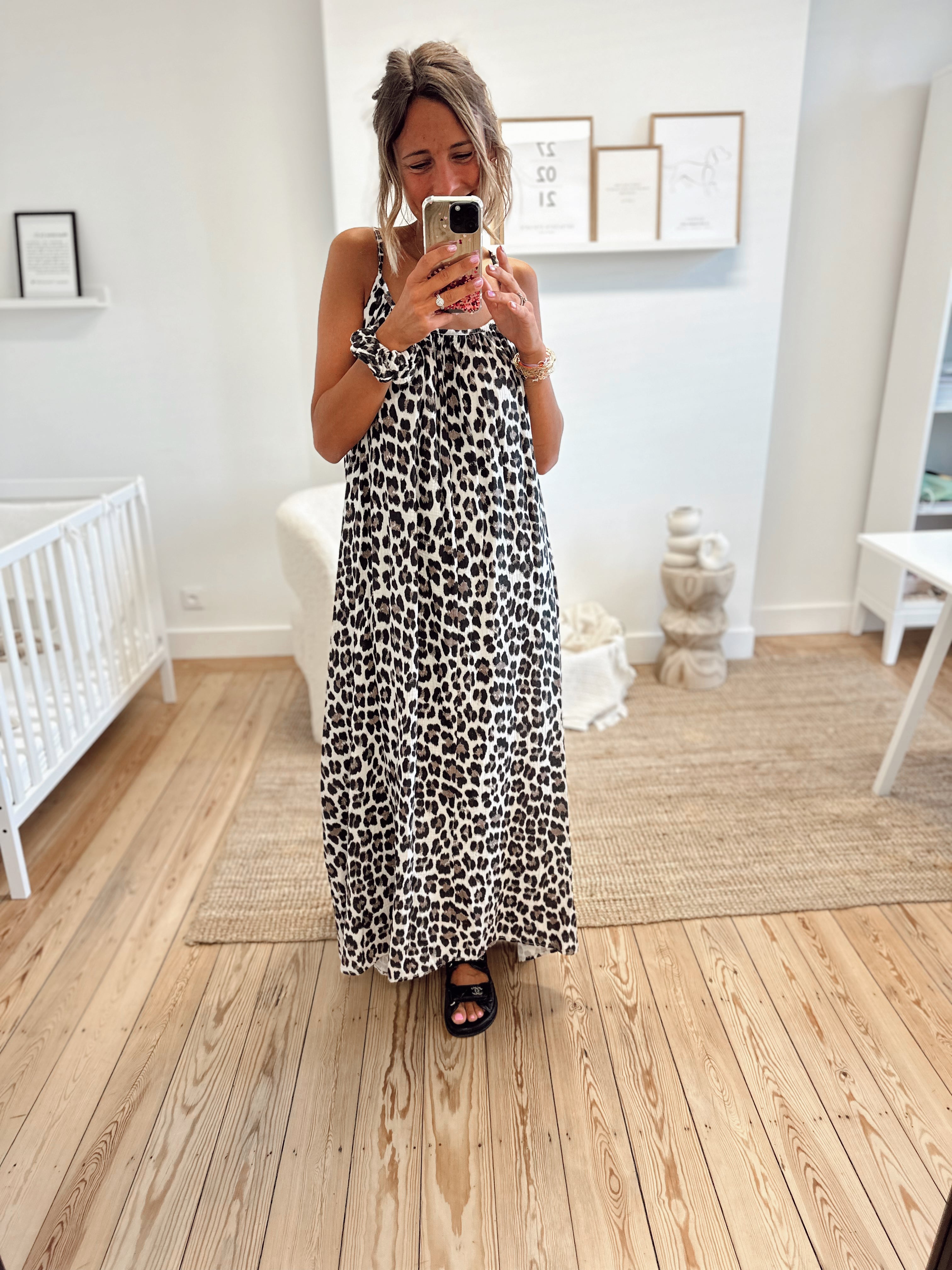 Robe longue en gaze de coton léopard. Robe légèrement échancrée dans le dos. Elle est disponible seulement en taille unique mais s'adapte à toutes les tailles et morphologies.