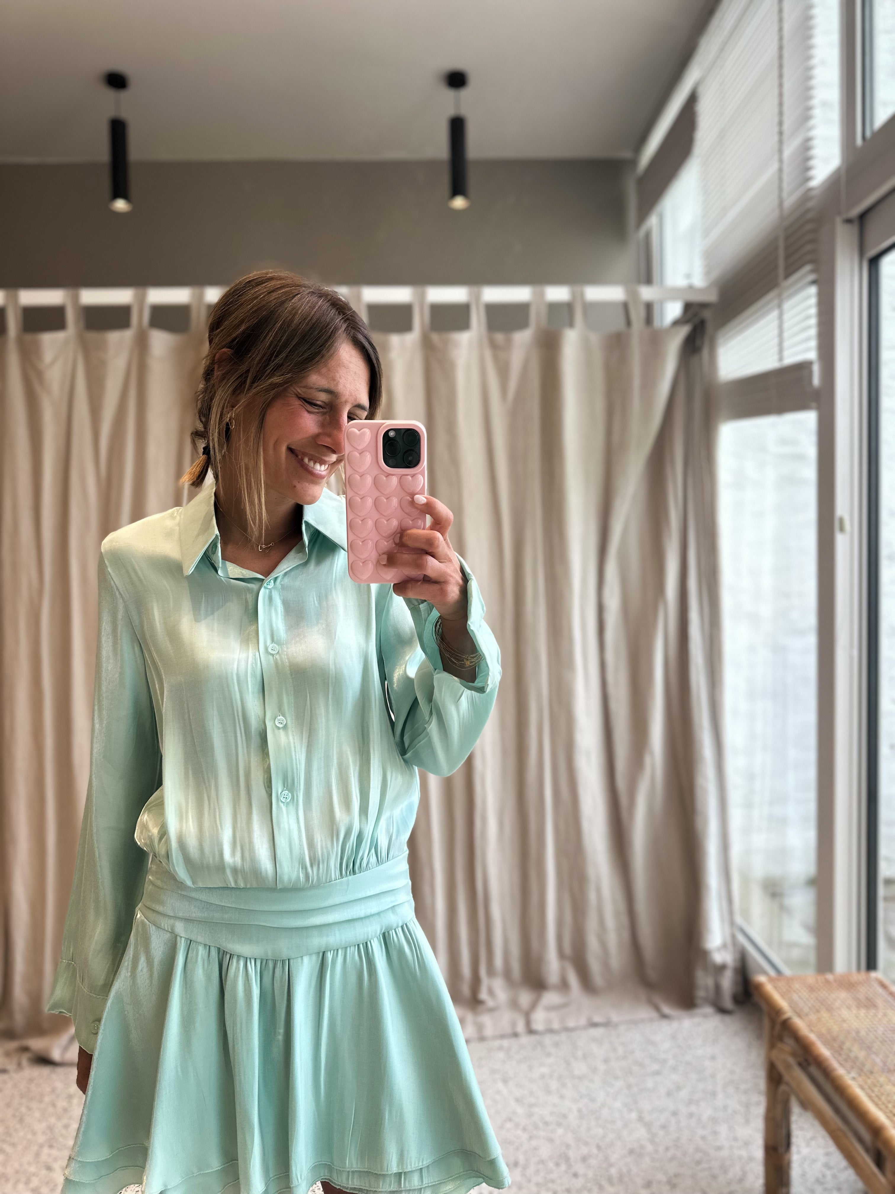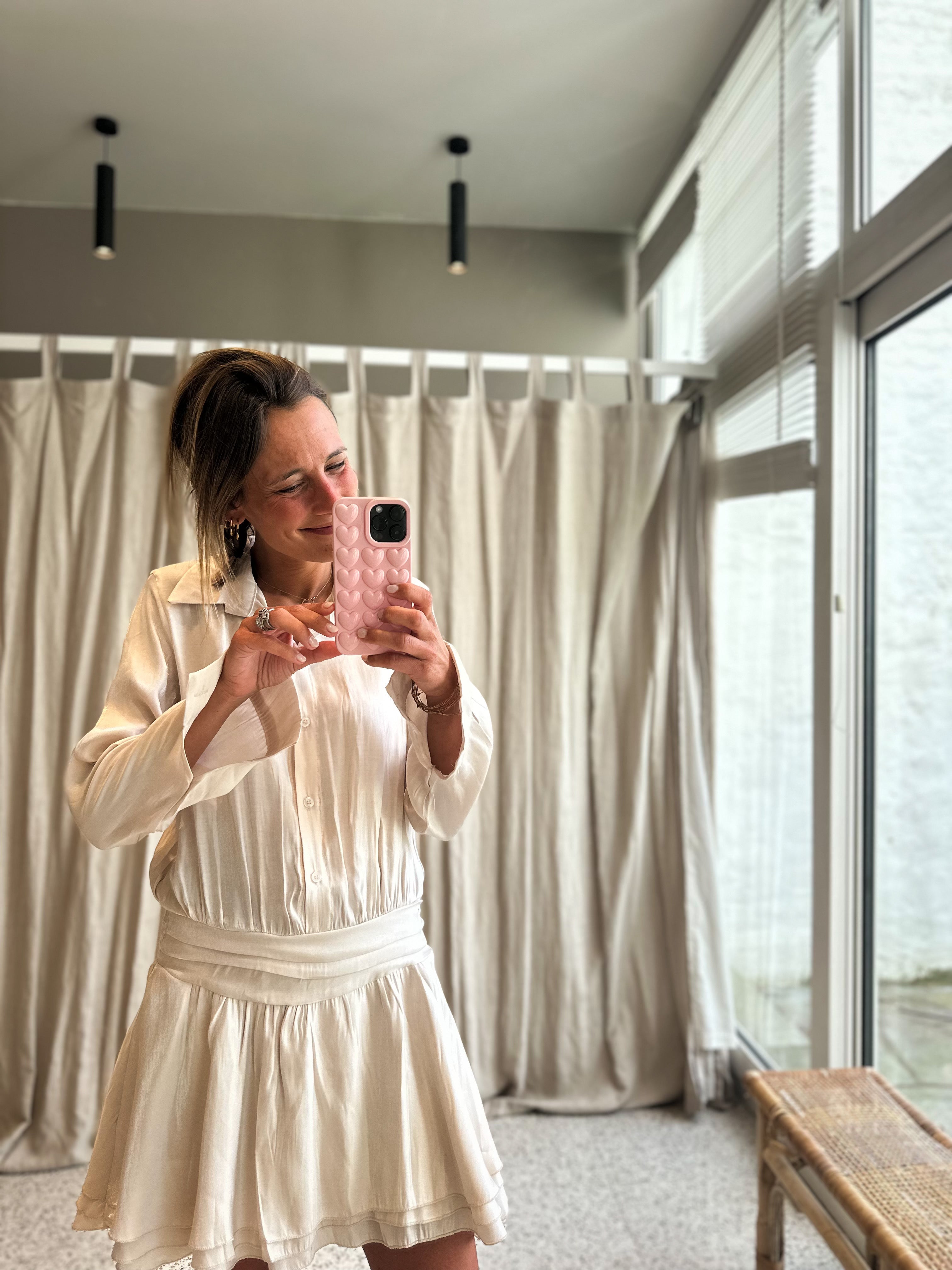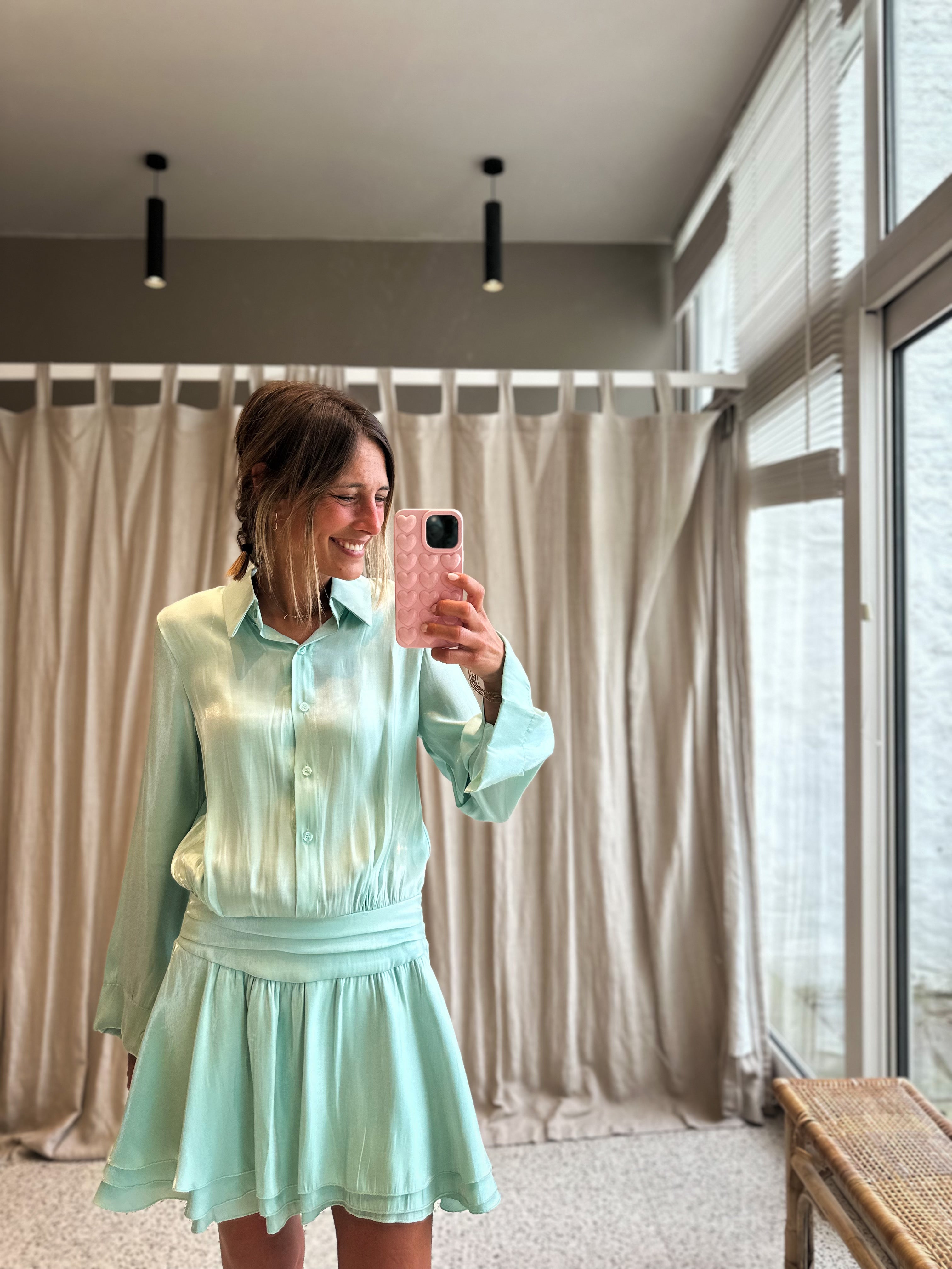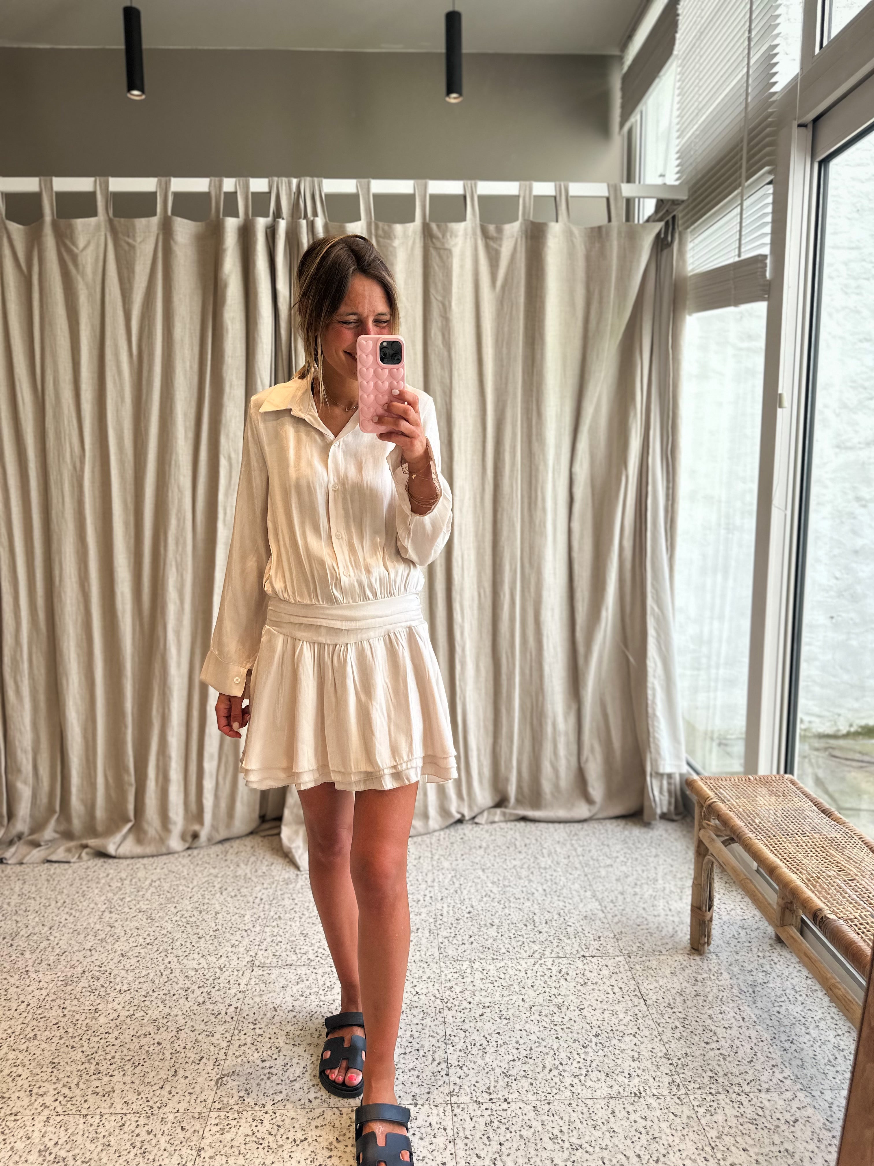 Robe courte longues manche. La matière est légèrement scintillante et il y a un élastique à la taille.