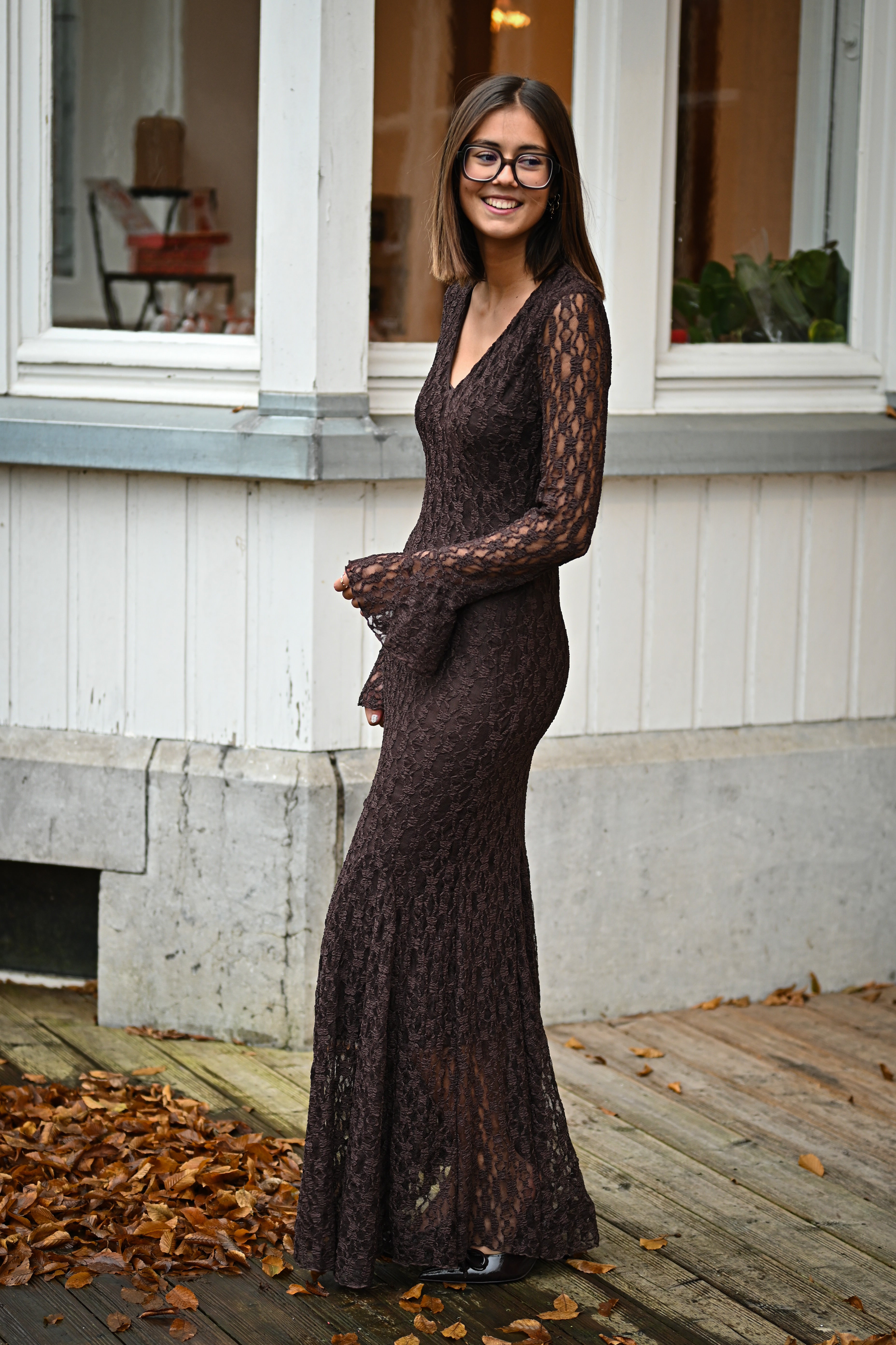 Élégante robe longue en dentelle délicate, dotée de manches évasées généreuses pour une silhouette fluide et sophistiquée. Disponible en tailles S, M et L pour un ajustement parfait. Une pièce intemporelle qui allie féminité et confort.