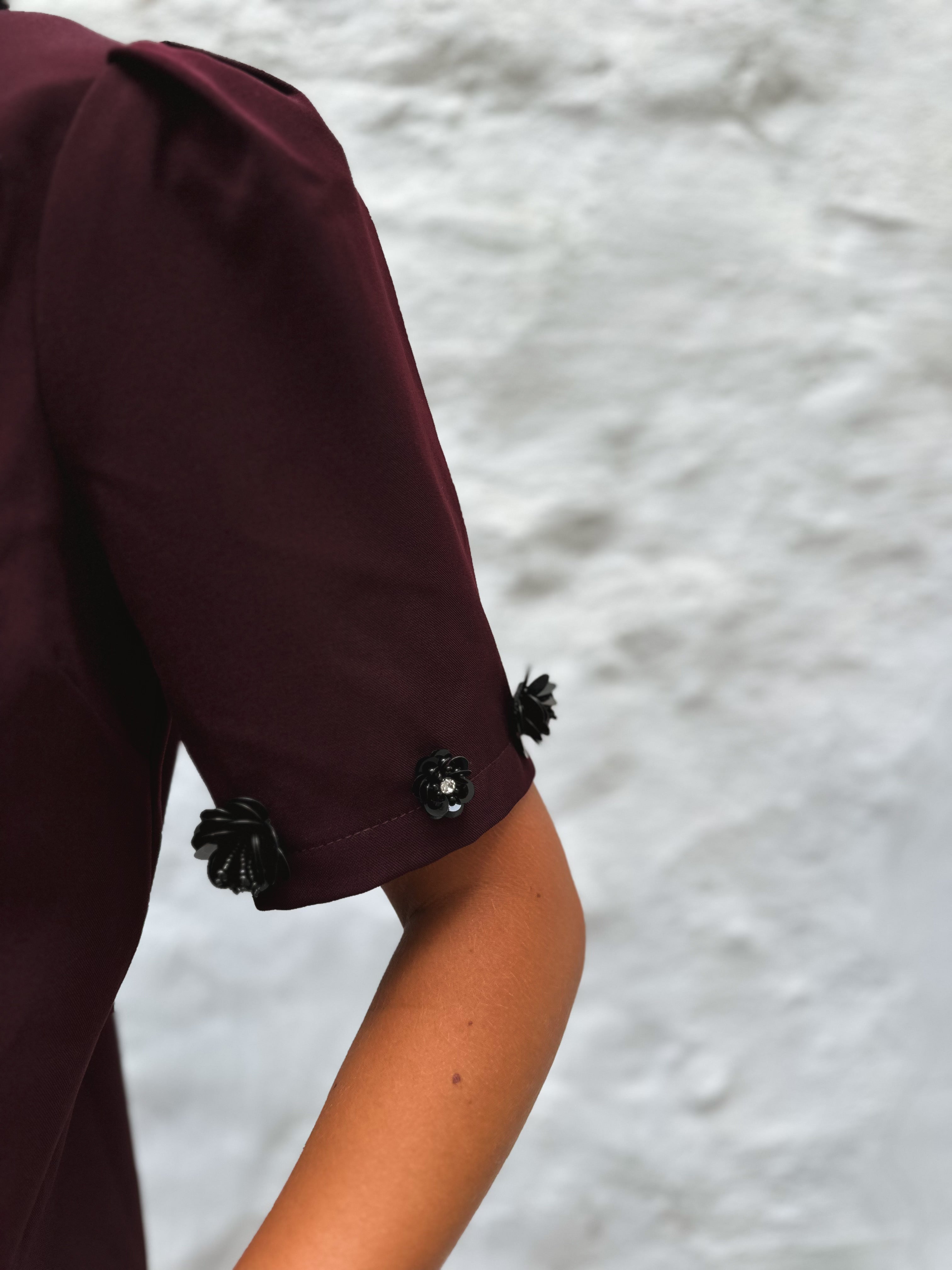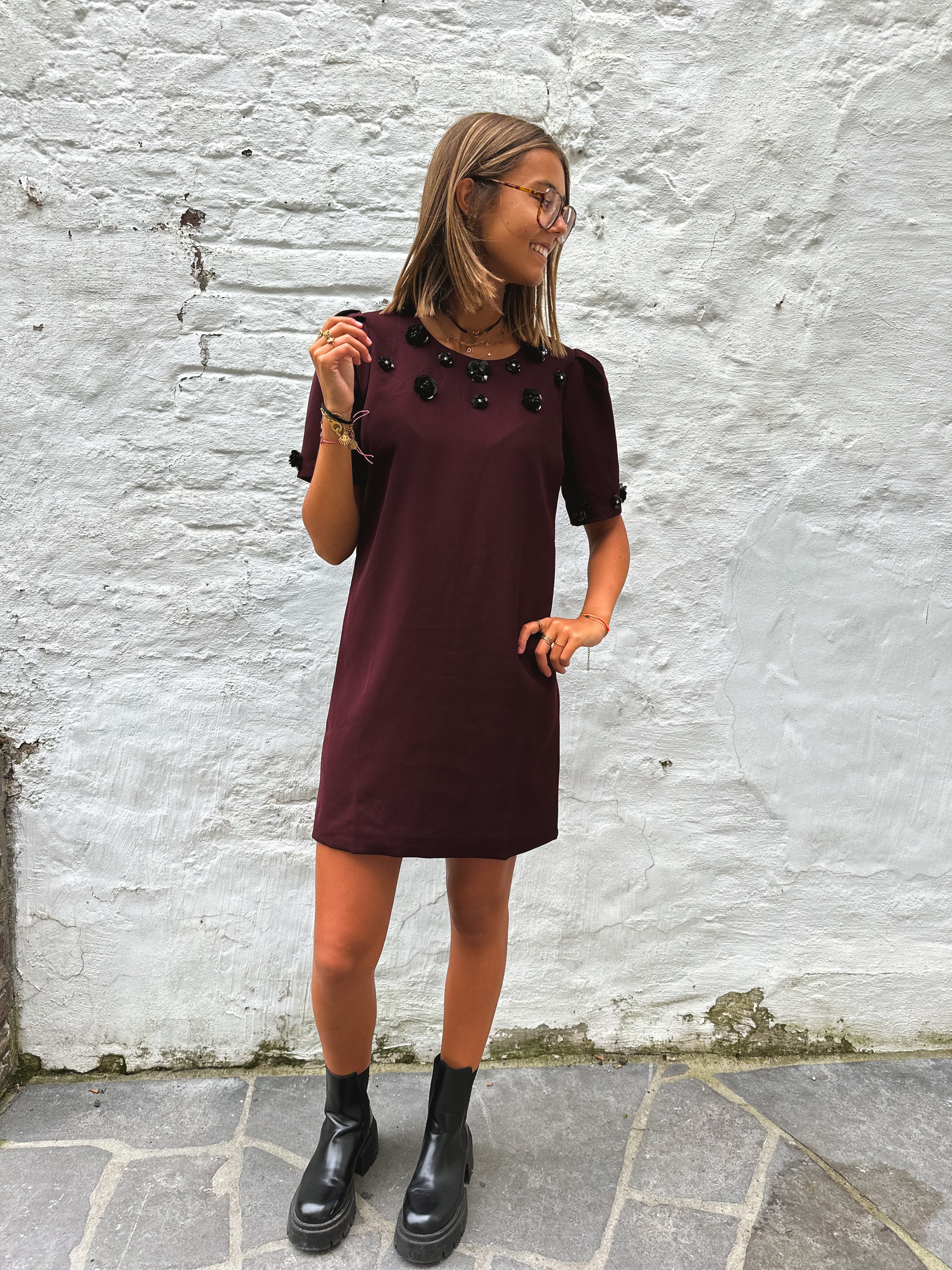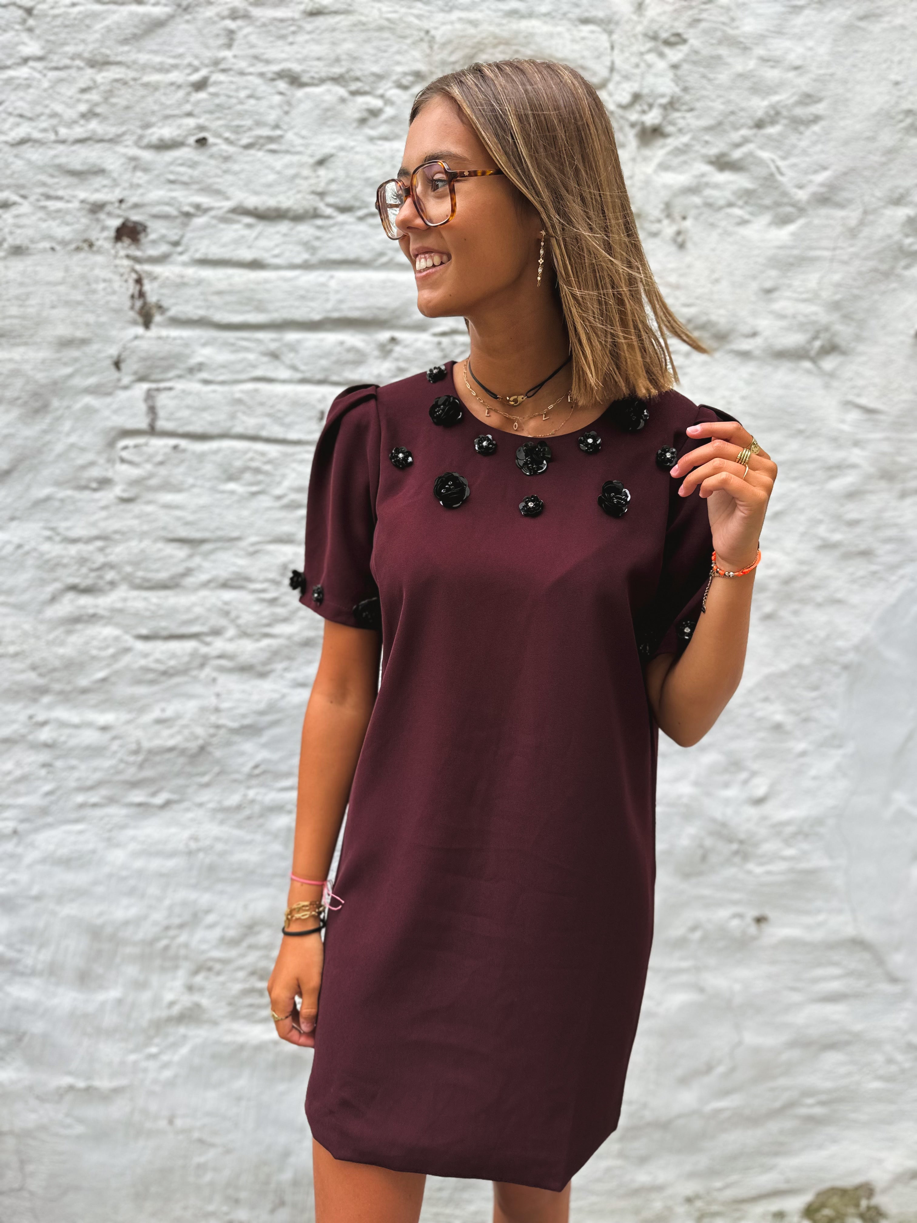 Cette robe droite couleur bordeaux profond séduit par ses plis délicats aux épaules et ses élégantes perles noires en forme de fleurs. Disponible en tailles S, M et L, elle allie sophistication et féminité pour sublimer votre silhouette.