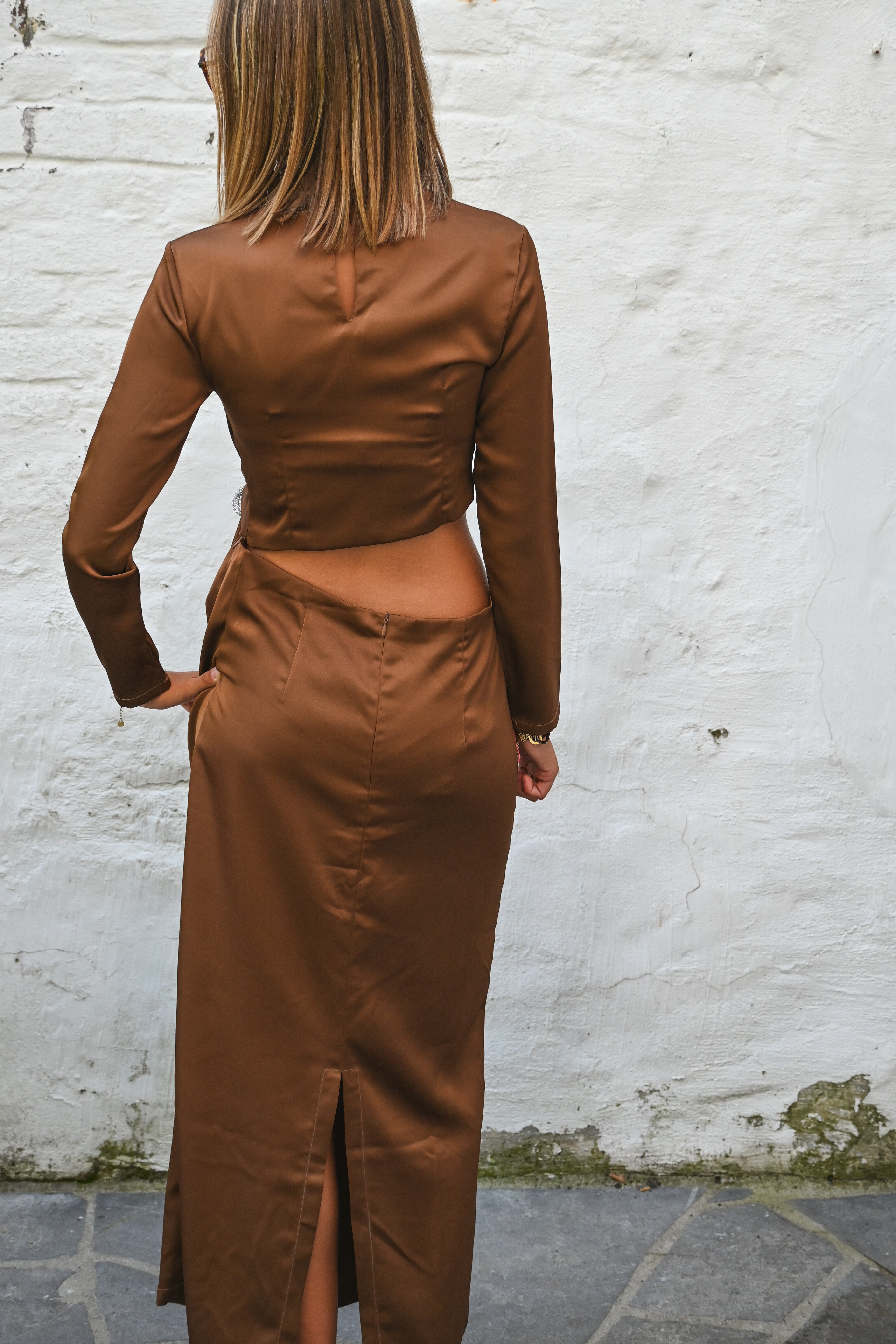 Cette robe longue en satin, dotée de manches longues et d'une découpe subtilement dévoilant un côté du ventre orné d’un bijou scintillant, est disponible en tailles S, M et L. Élégante et sophistiquée, elle sublimera votre silhouette avec charme.