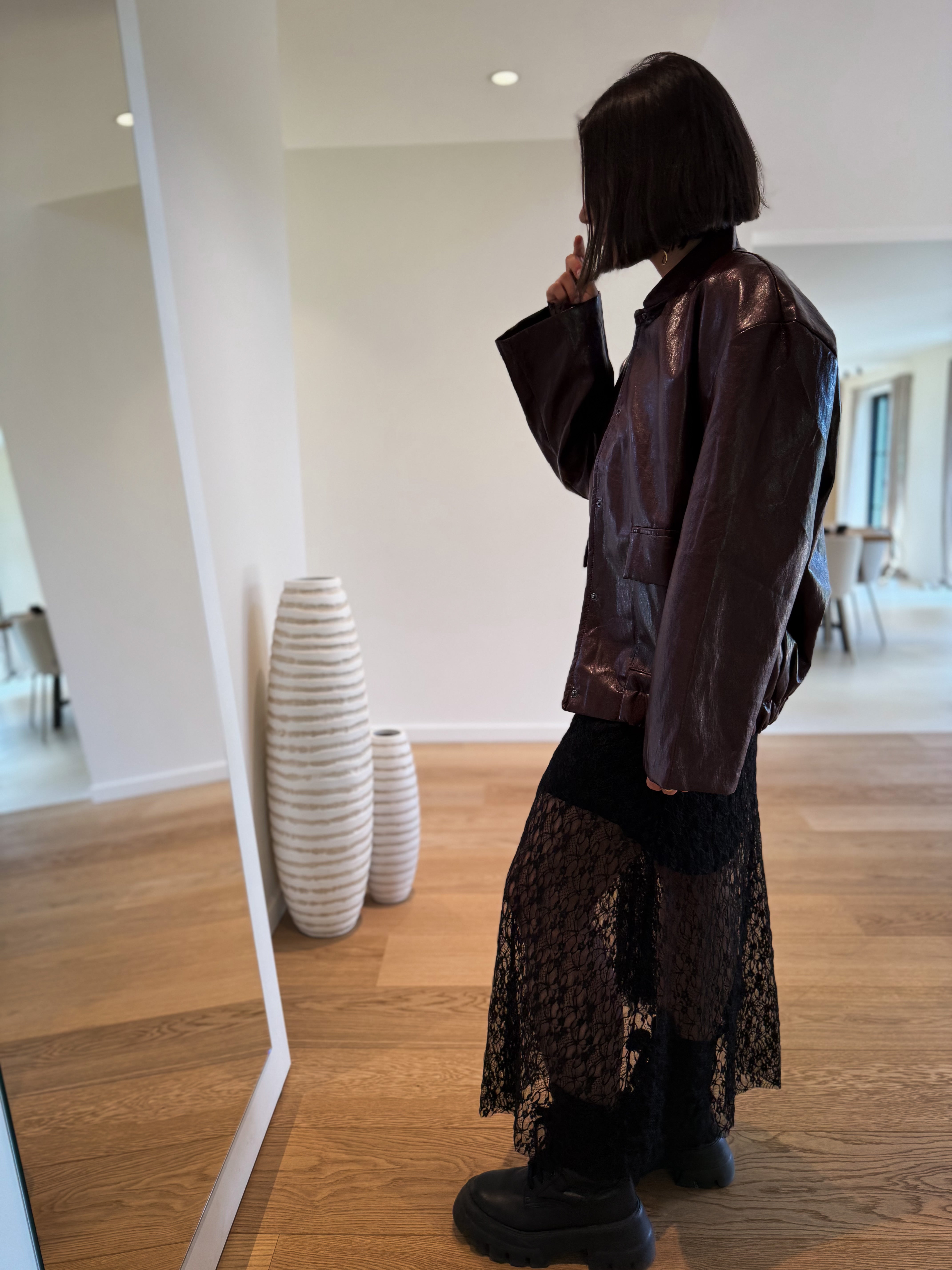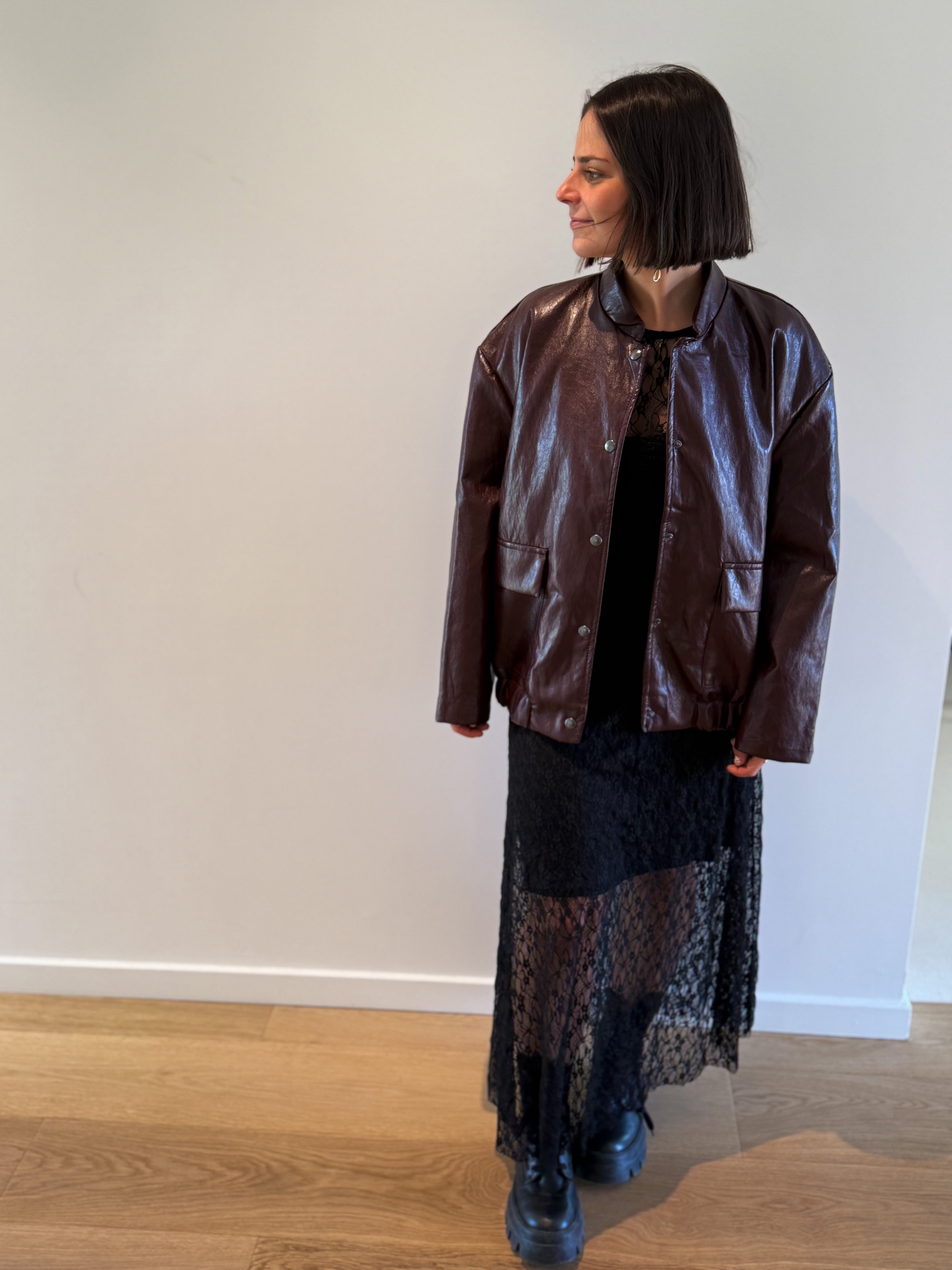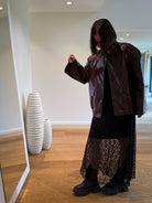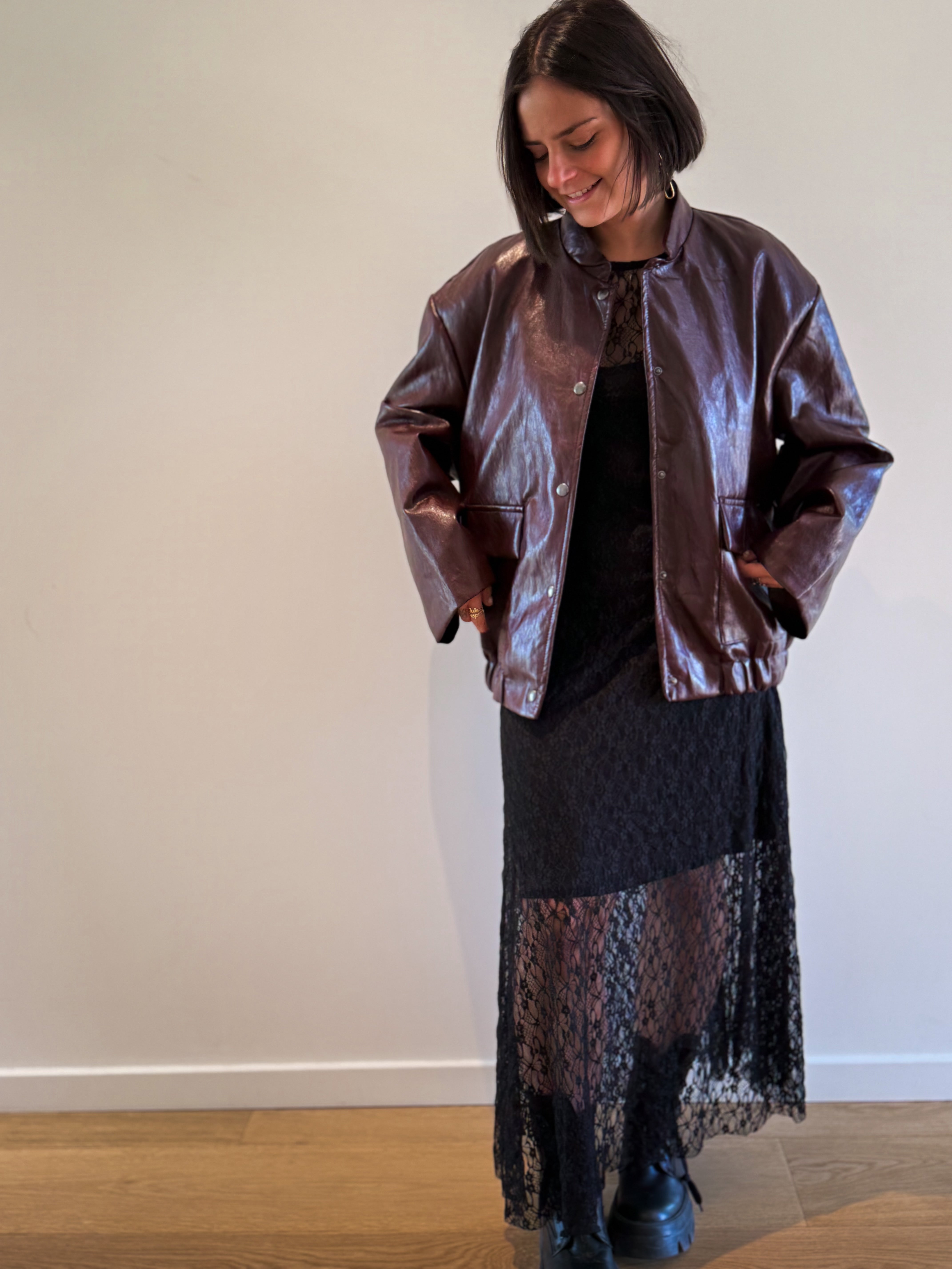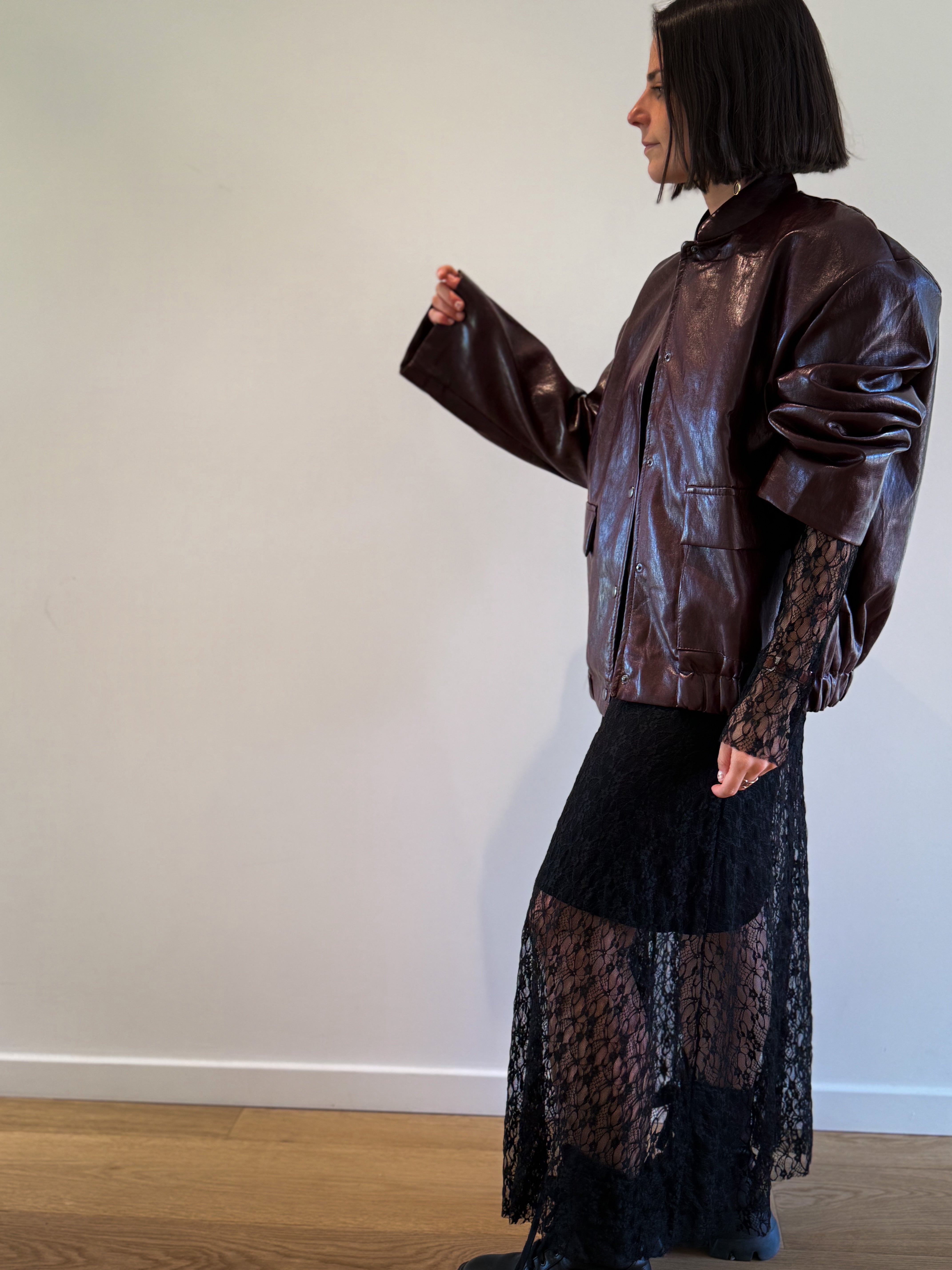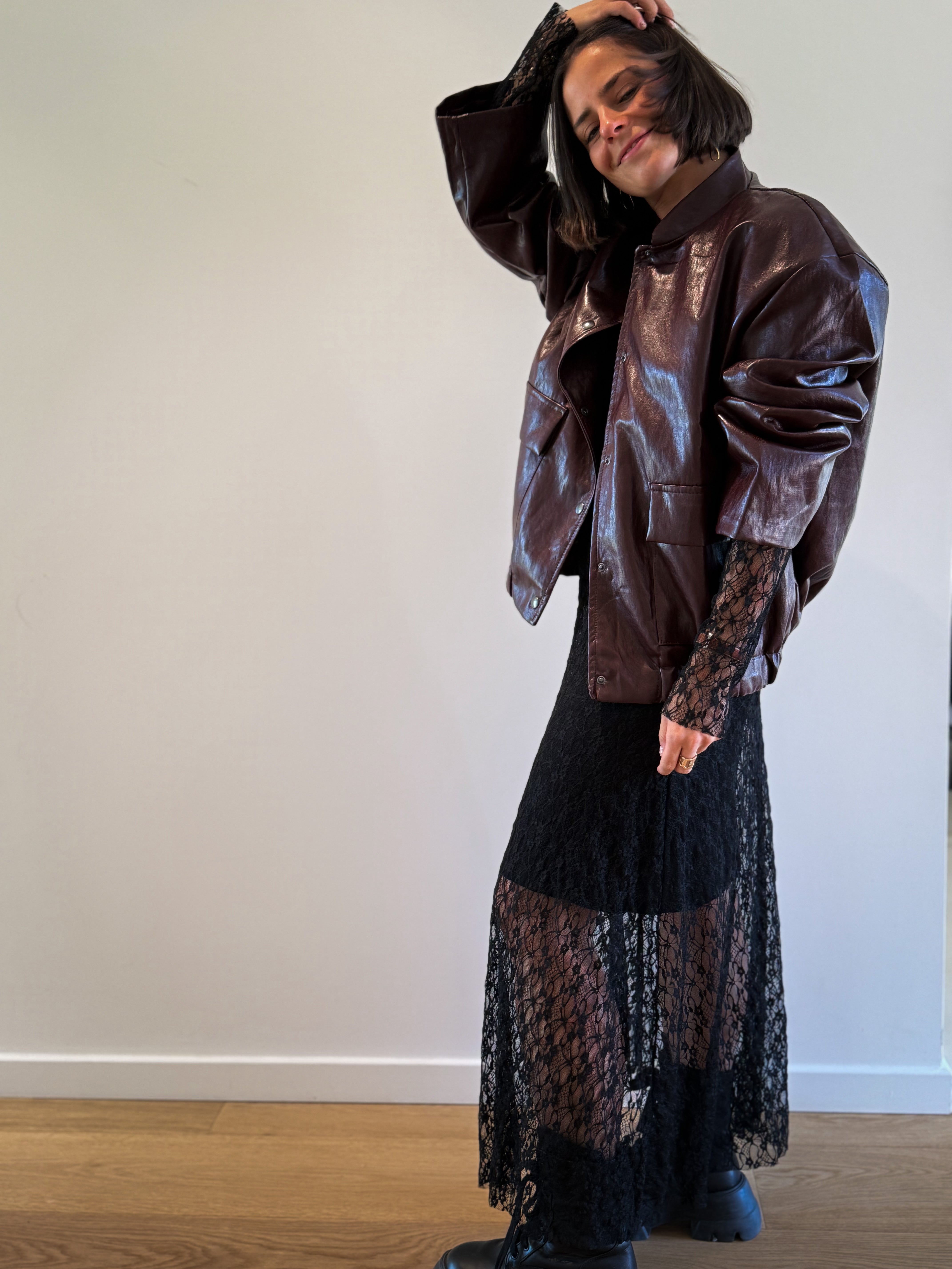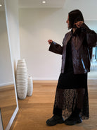 Longue robe noire en dentelle avec manches longues, comprenant une sous-robe. Disponible en taille unique, elle s’ajuste parfaitement grâce à son tissu extensible.