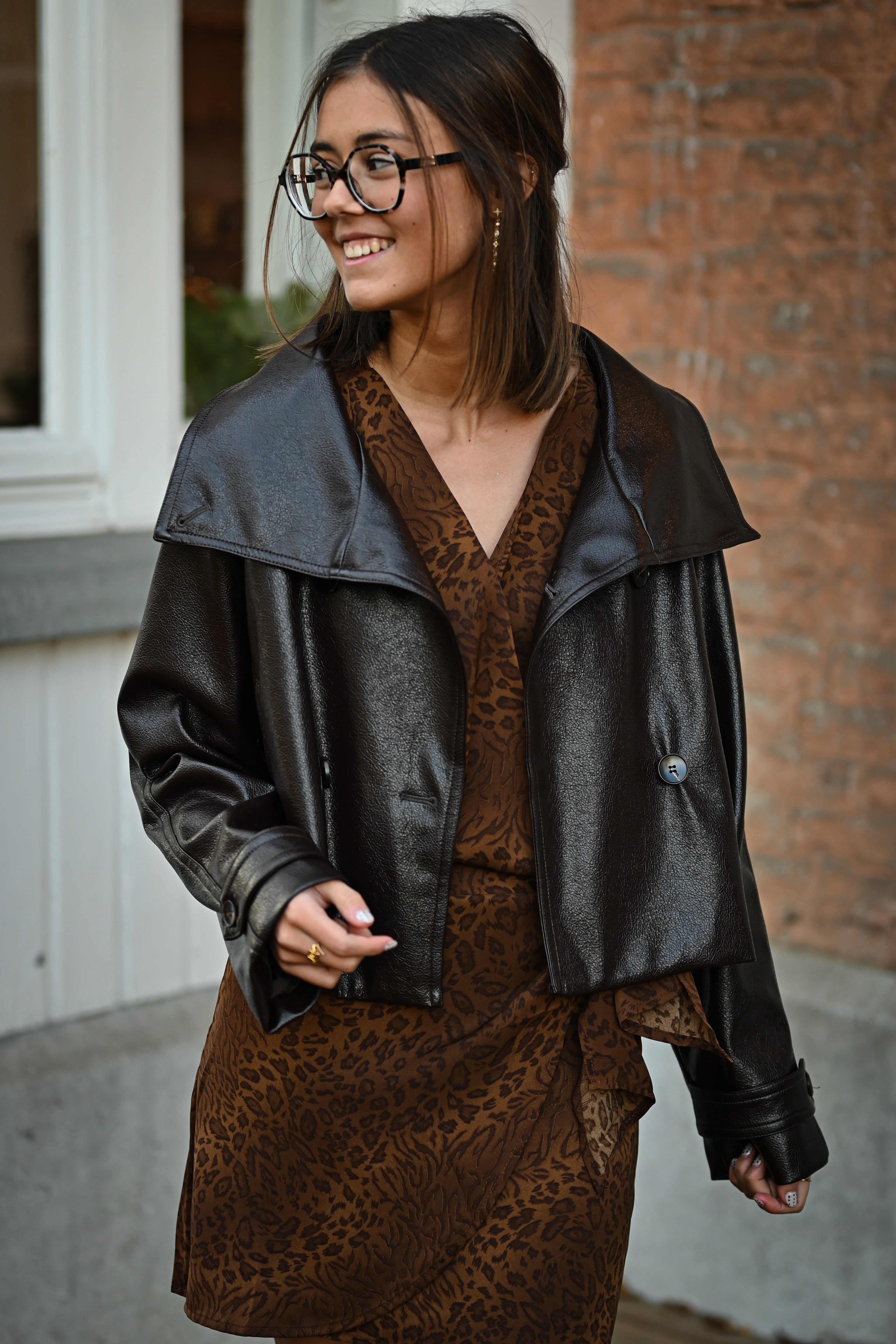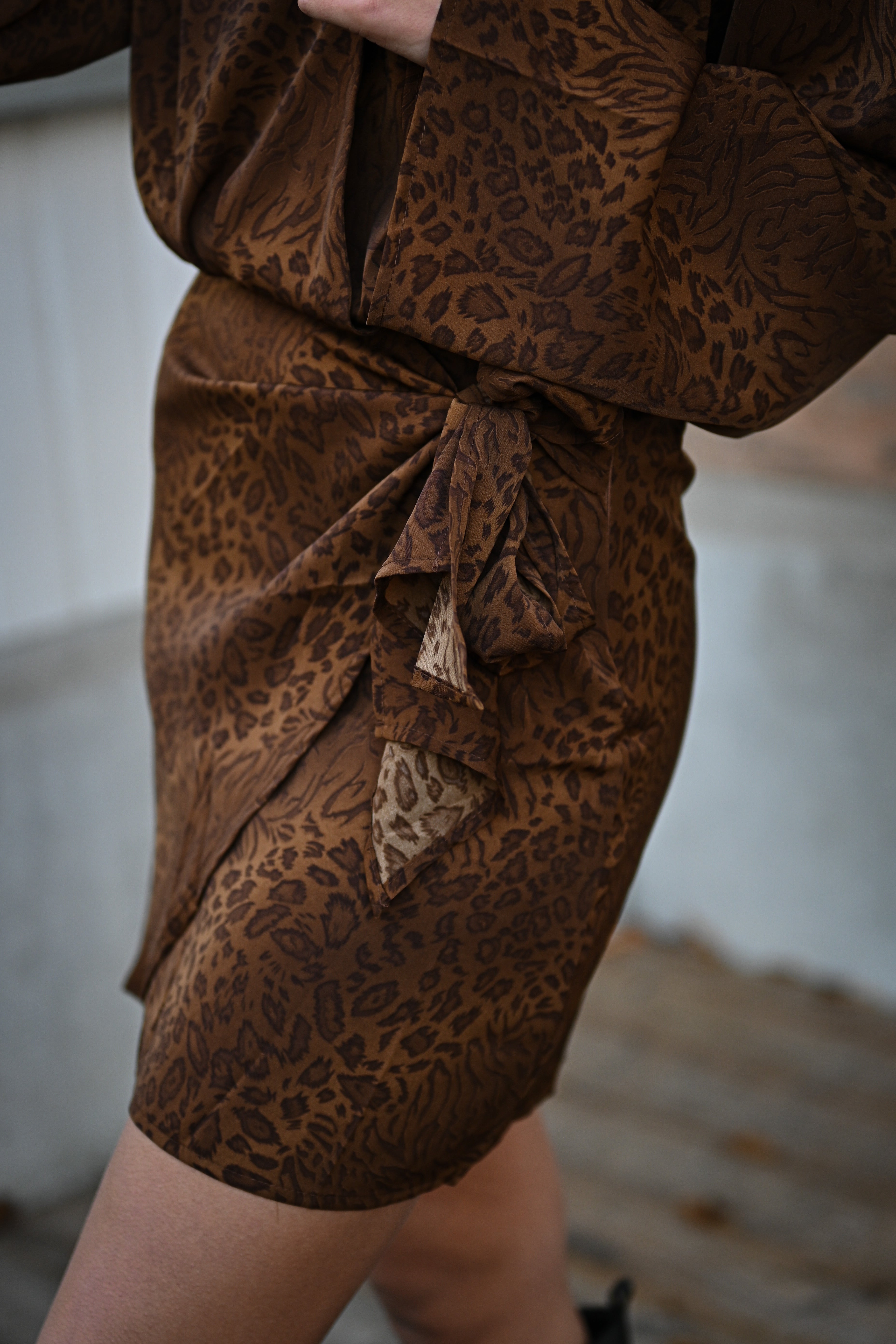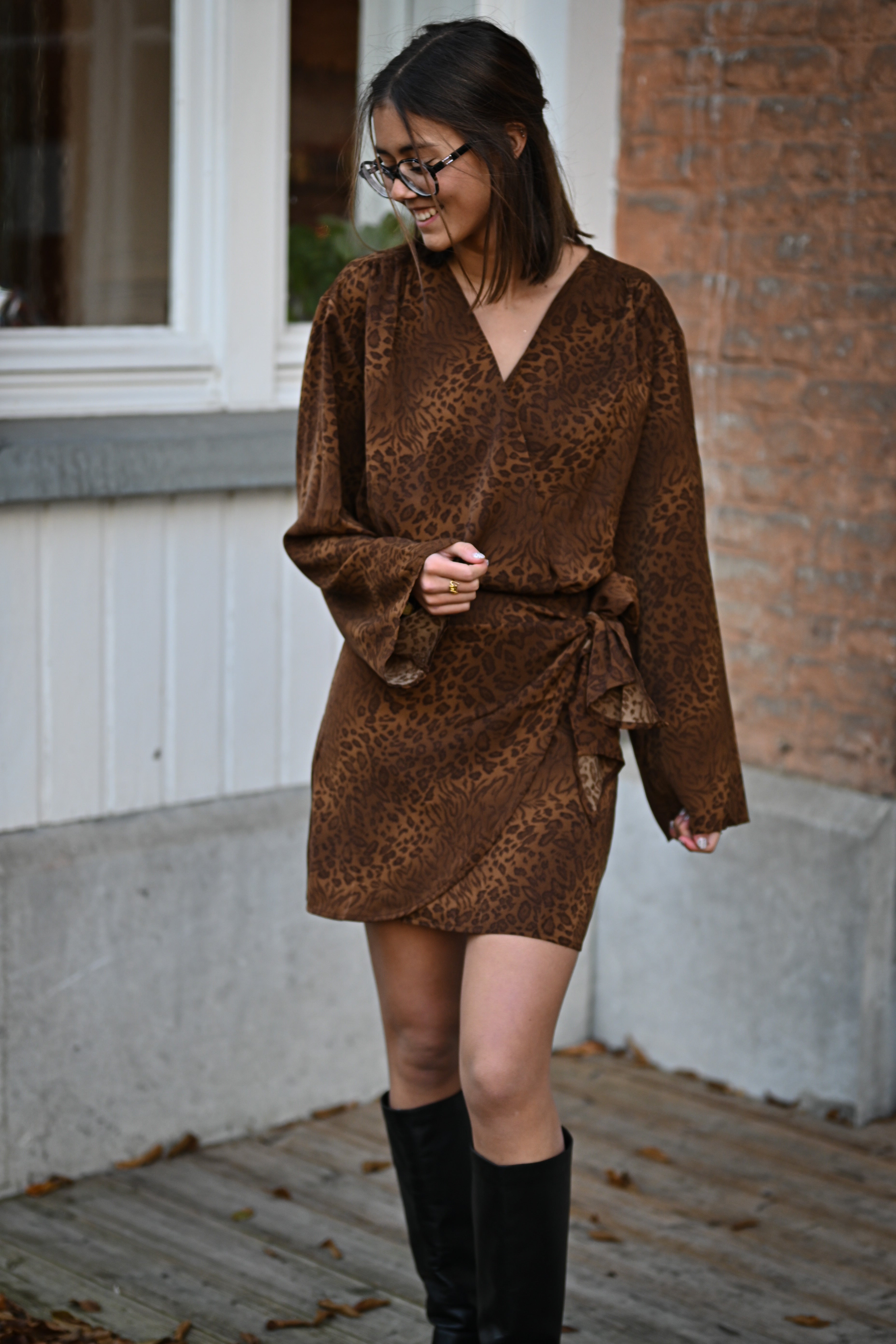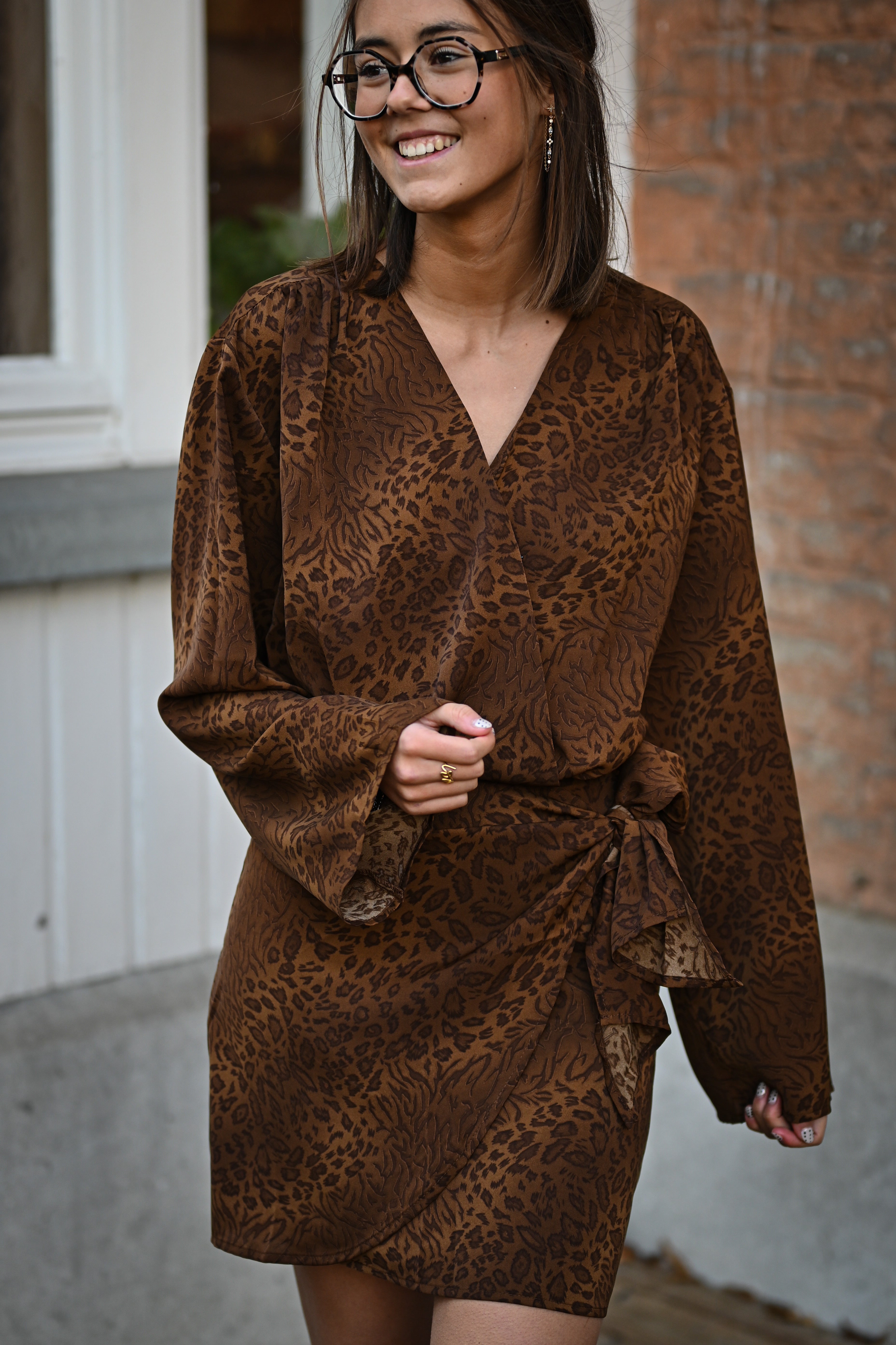 Découvrez cette robe portefeuille chocolat aux finitions satinées, sublimée par un discret motif léopard. Coupée court pour une silhouette élégante et moderne, elle épouse vos formes avec grâce. Disponible en tailles S, M et L, elle s'adapte à votre morphologie pour un confort optimal et un style intemporel.