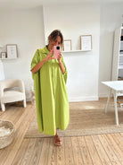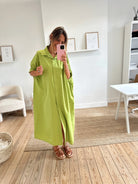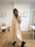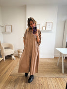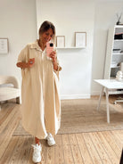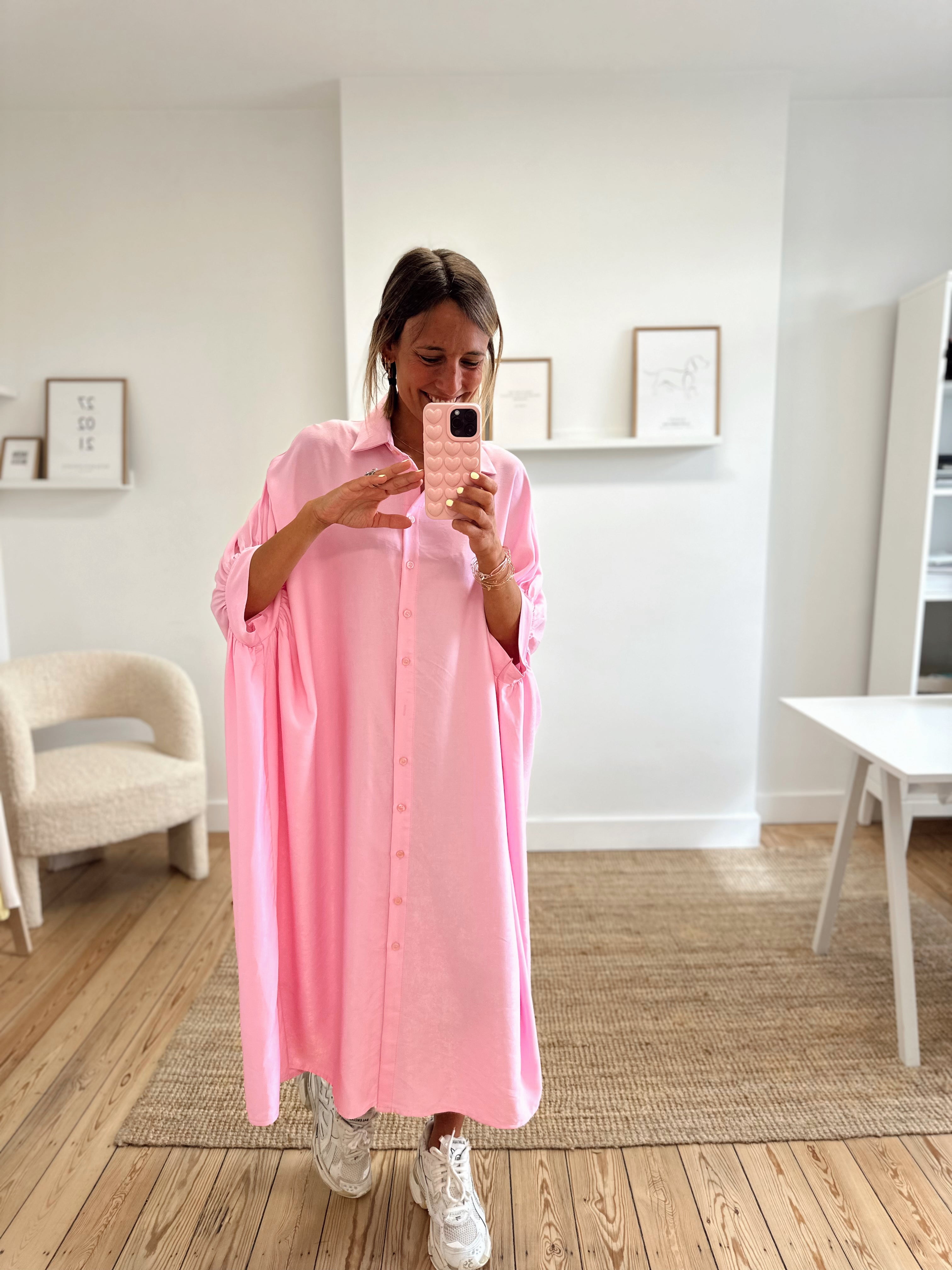 Robe chemise, longue et très large. Manches courtes, elle est disponible en blanc, beige et en noir seulement en taille unique et s'adapte à toutes les tailles et morphologies.