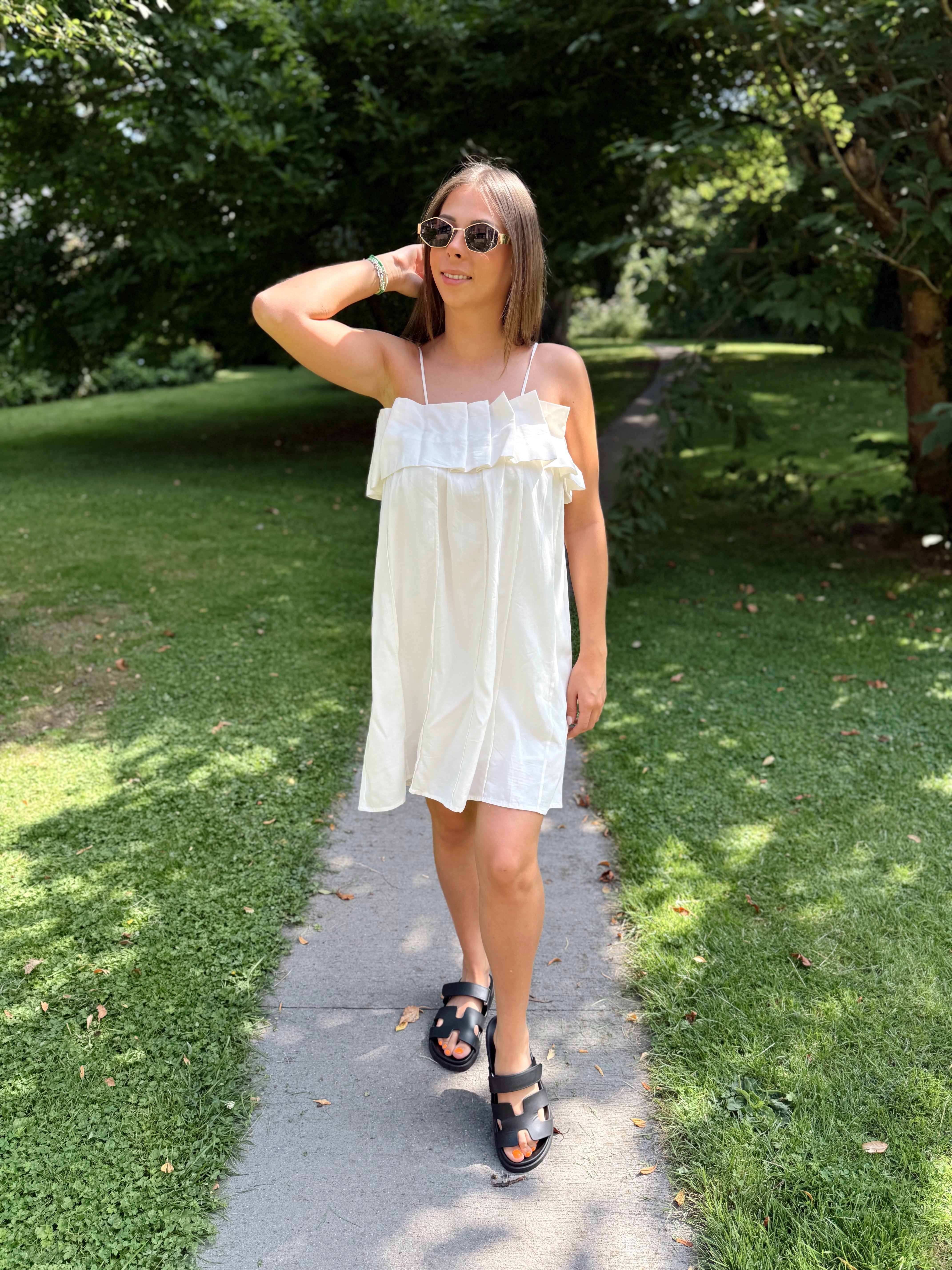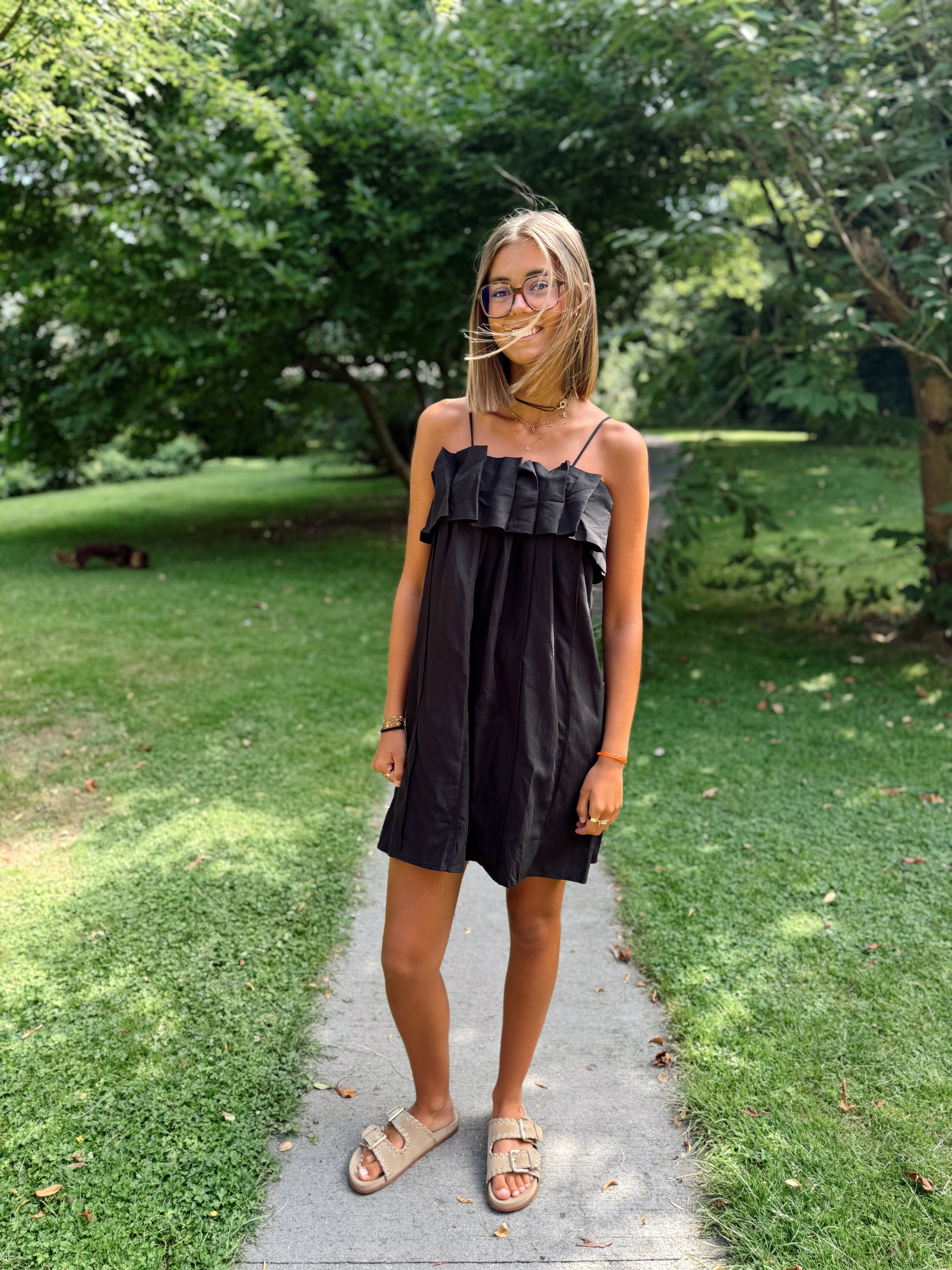 Cette robe courte à fines bretelles se distingue par son encolure bouffante élégante et sa coupe droite qui sublime la silhouette avec simplicité et charme. Elle est disponible en S-M ou L.