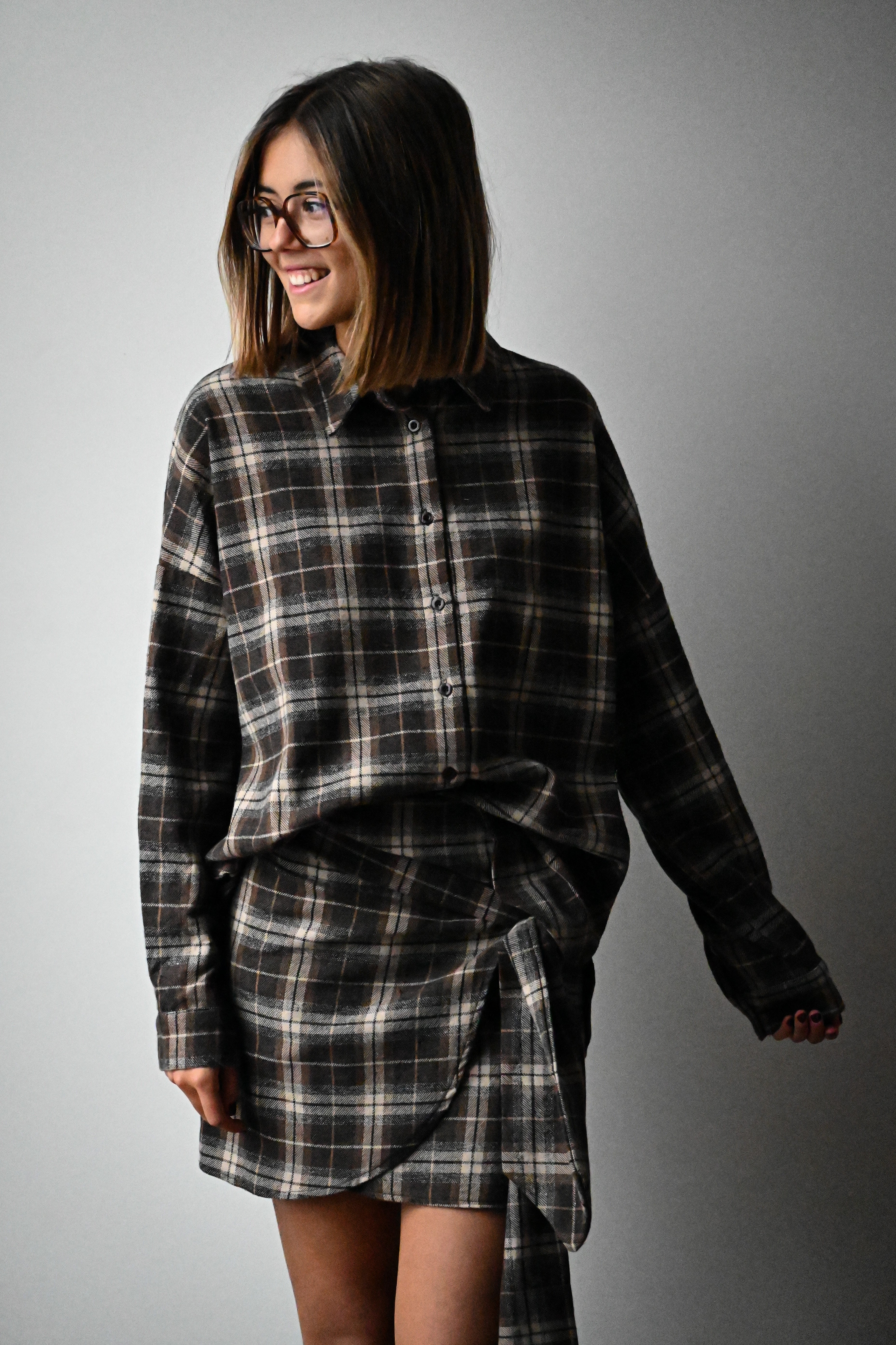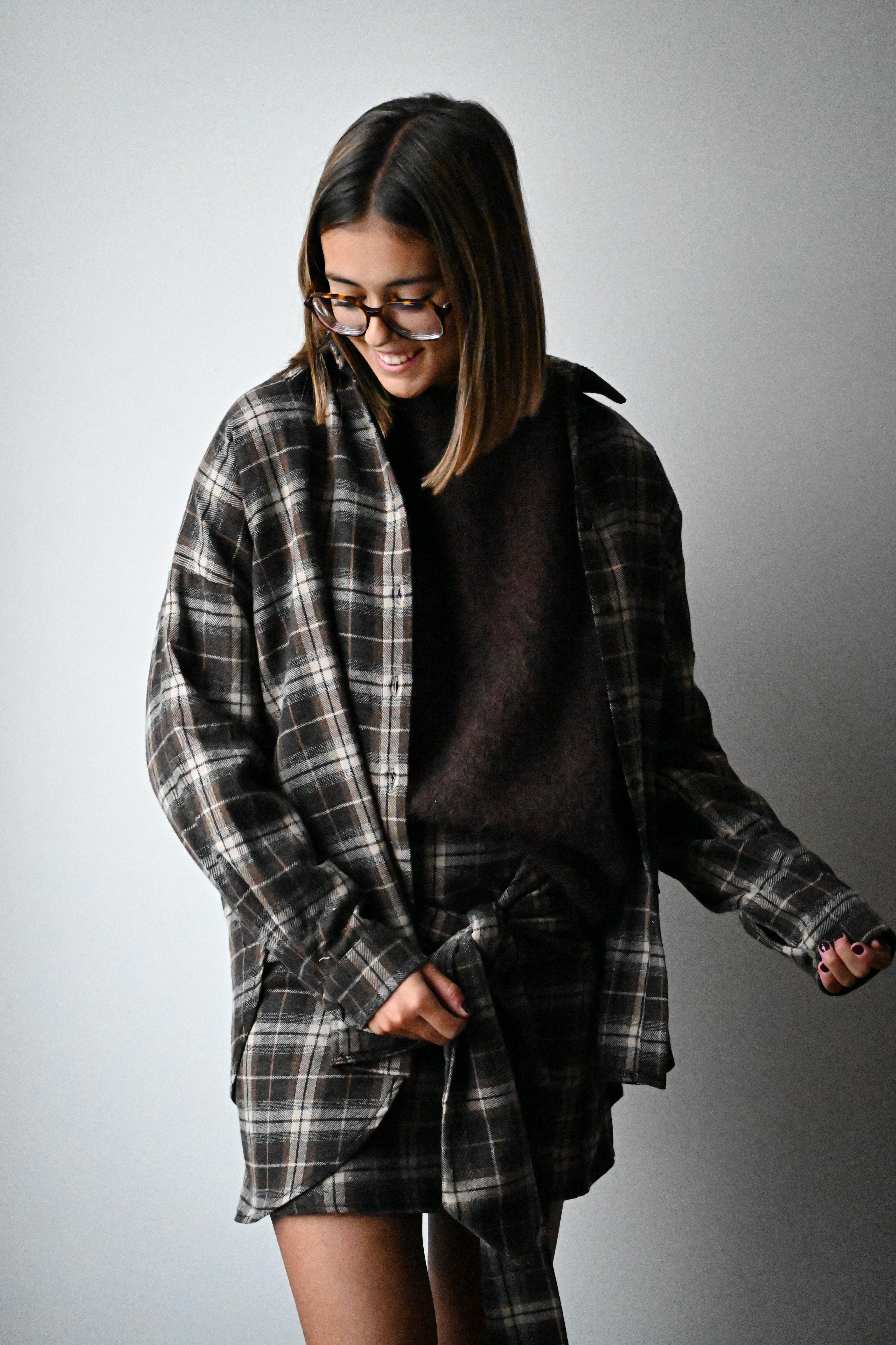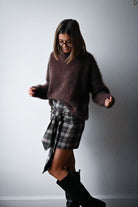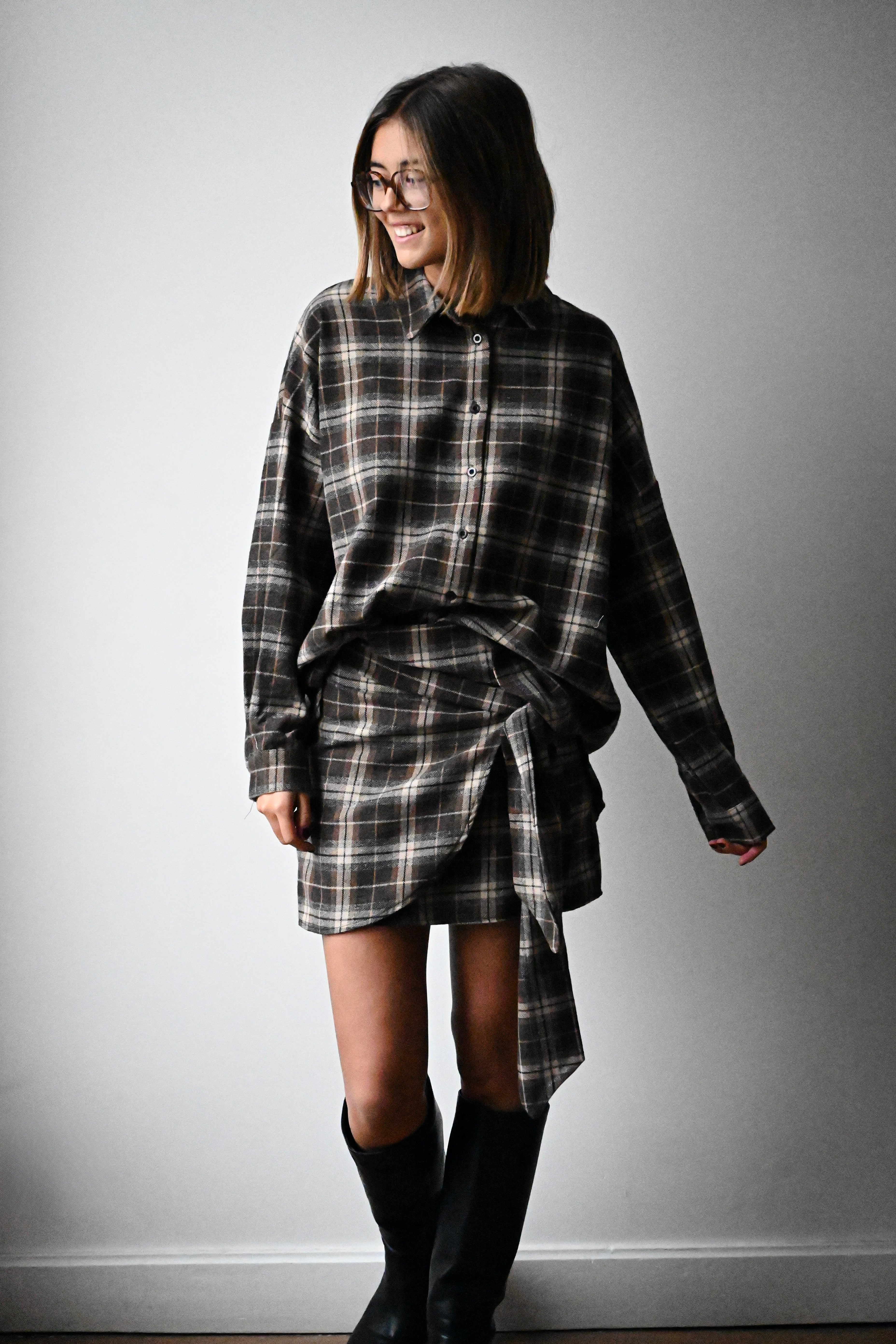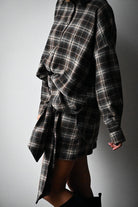 Cette jupe courte à carreaux se distingue par son tissu épais et son élégant noeud placé à l’avant, ajoutant une touche raffinée à votre tenue. Elle est disponible en SM ou ML.