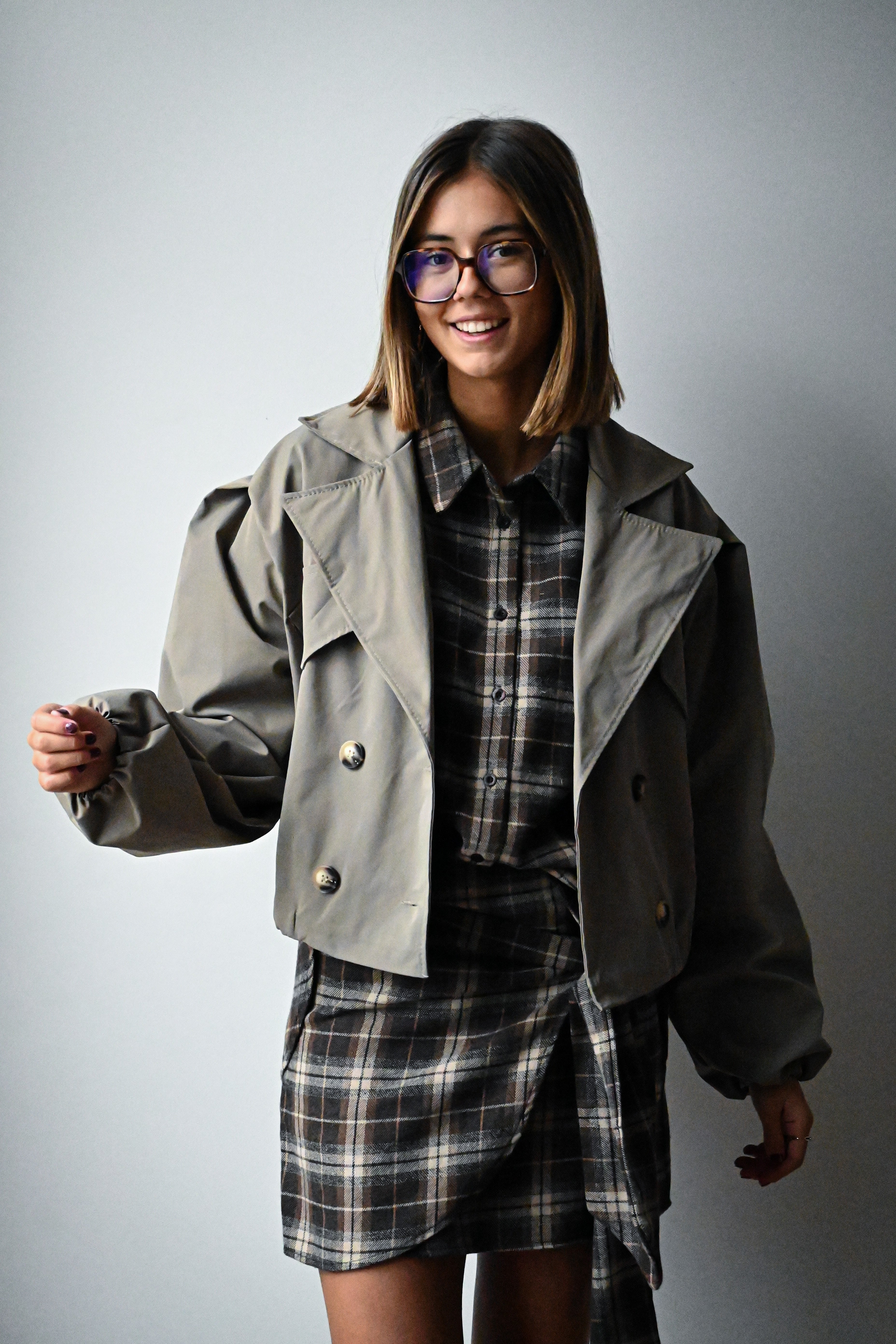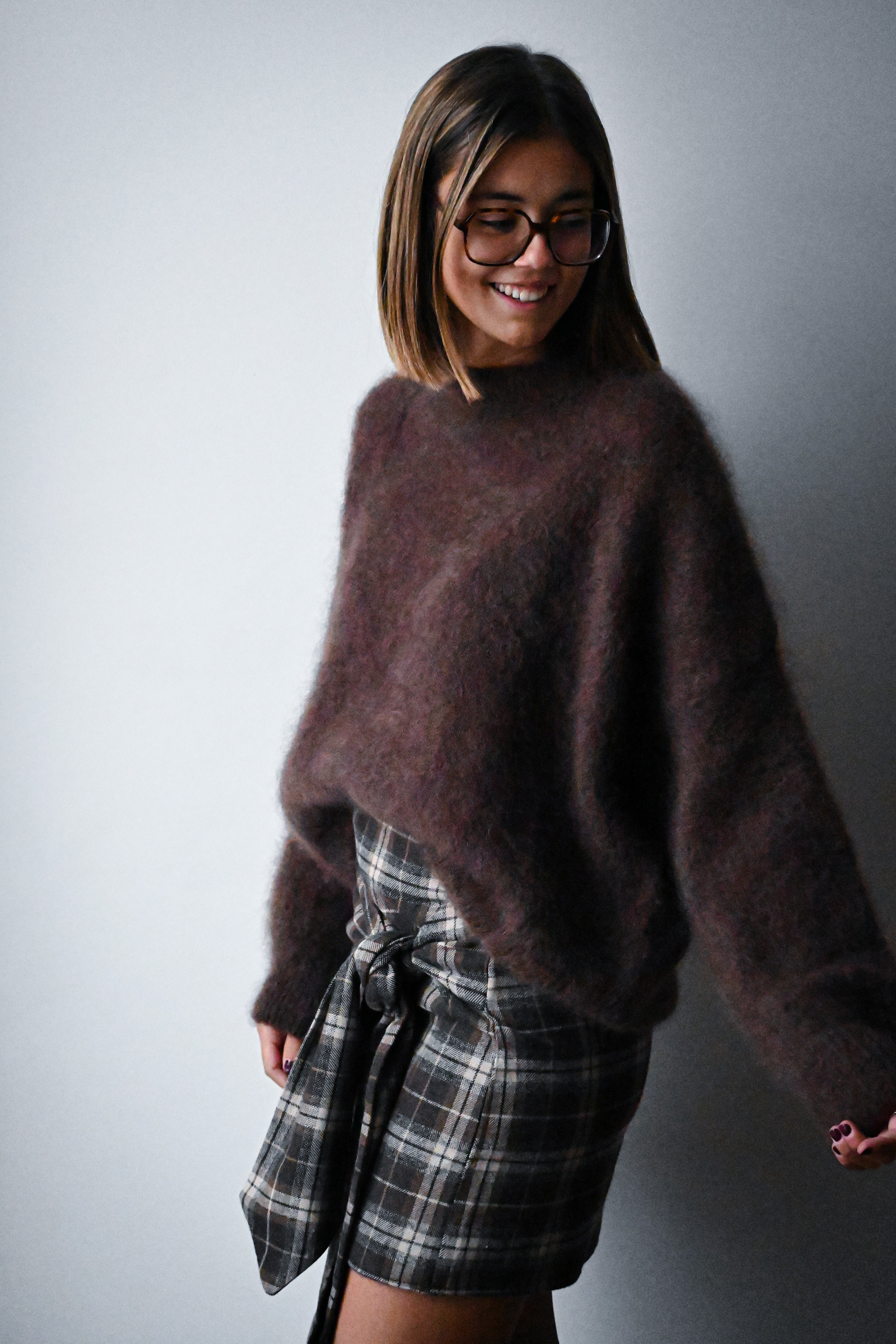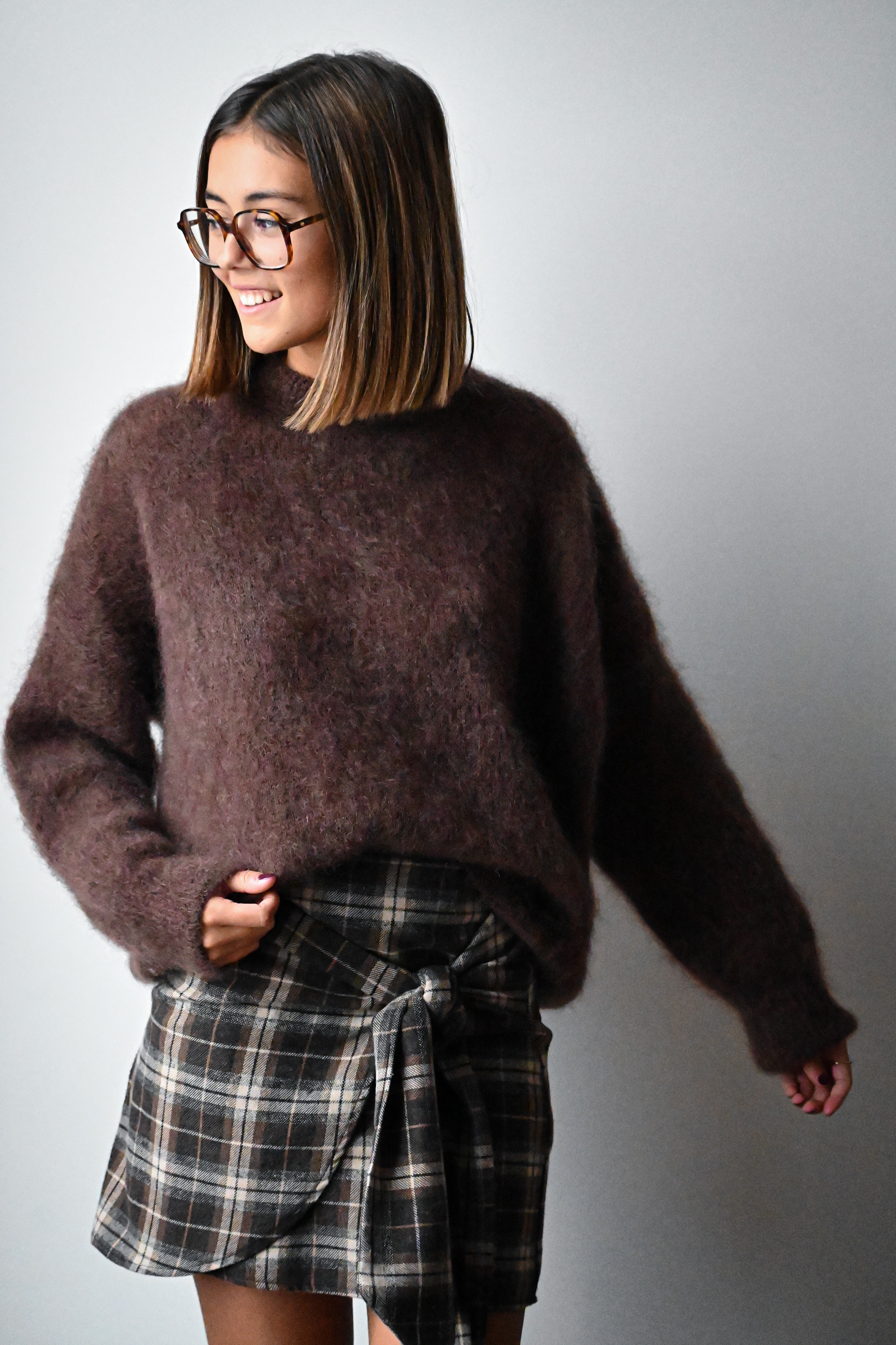 Cette jupe courte à carreaux se distingue par son tissu épais et son élégant noeud placé à l’avant, ajoutant une touche raffinée à votre tenue. Elle est disponible en SM ou ML.