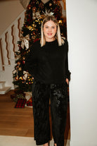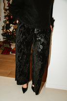 Découvrez le Pantalon ESMEE, confectionné en velours noir généreux, il épouse votre silhouette grâce à son élastique confortable à la taille. Le cordon orné de motifs floraux ajoute une touche de charme et de féminité. Taille unique pour un ajustement parfait. Confort et style réunis.