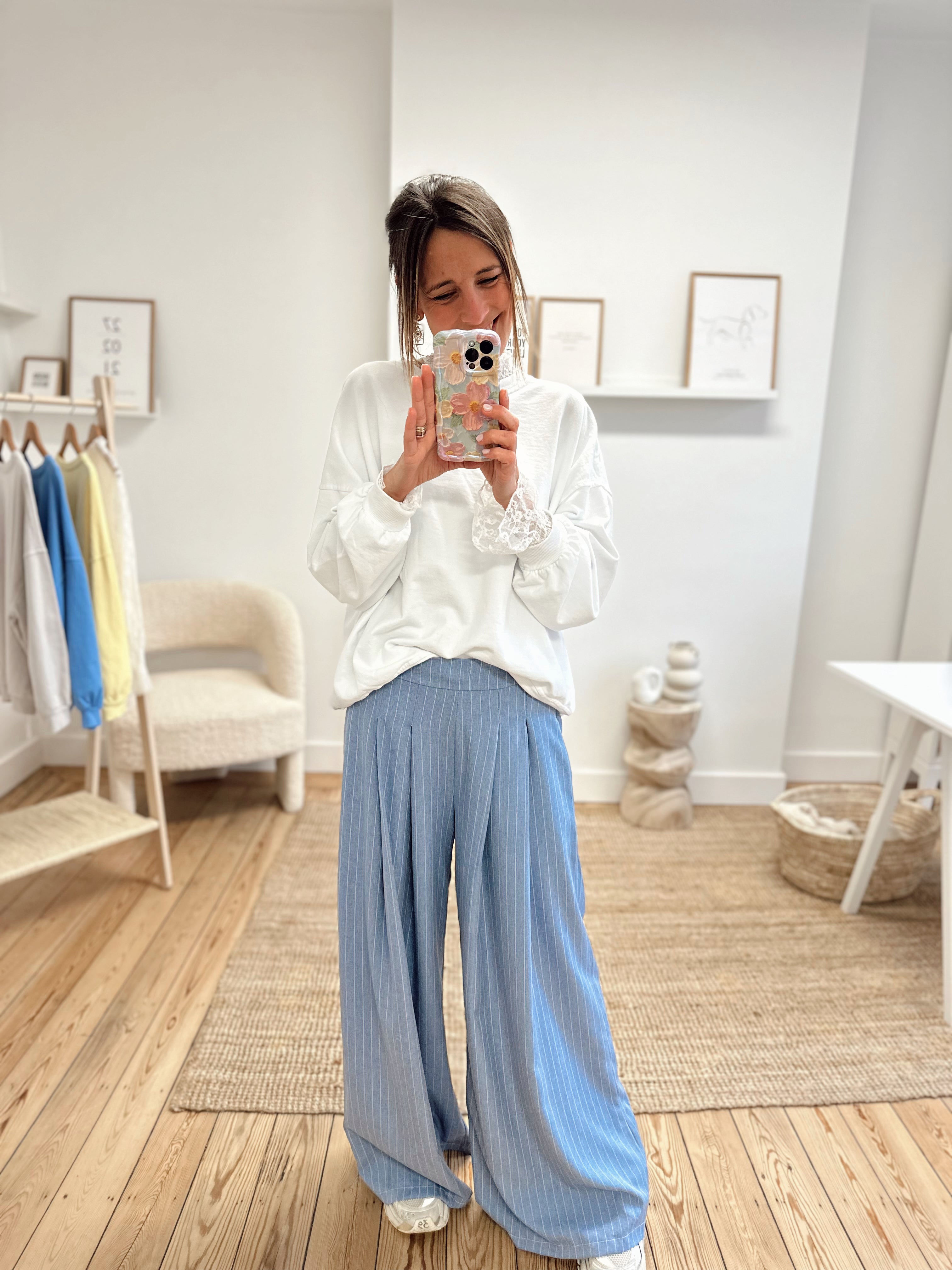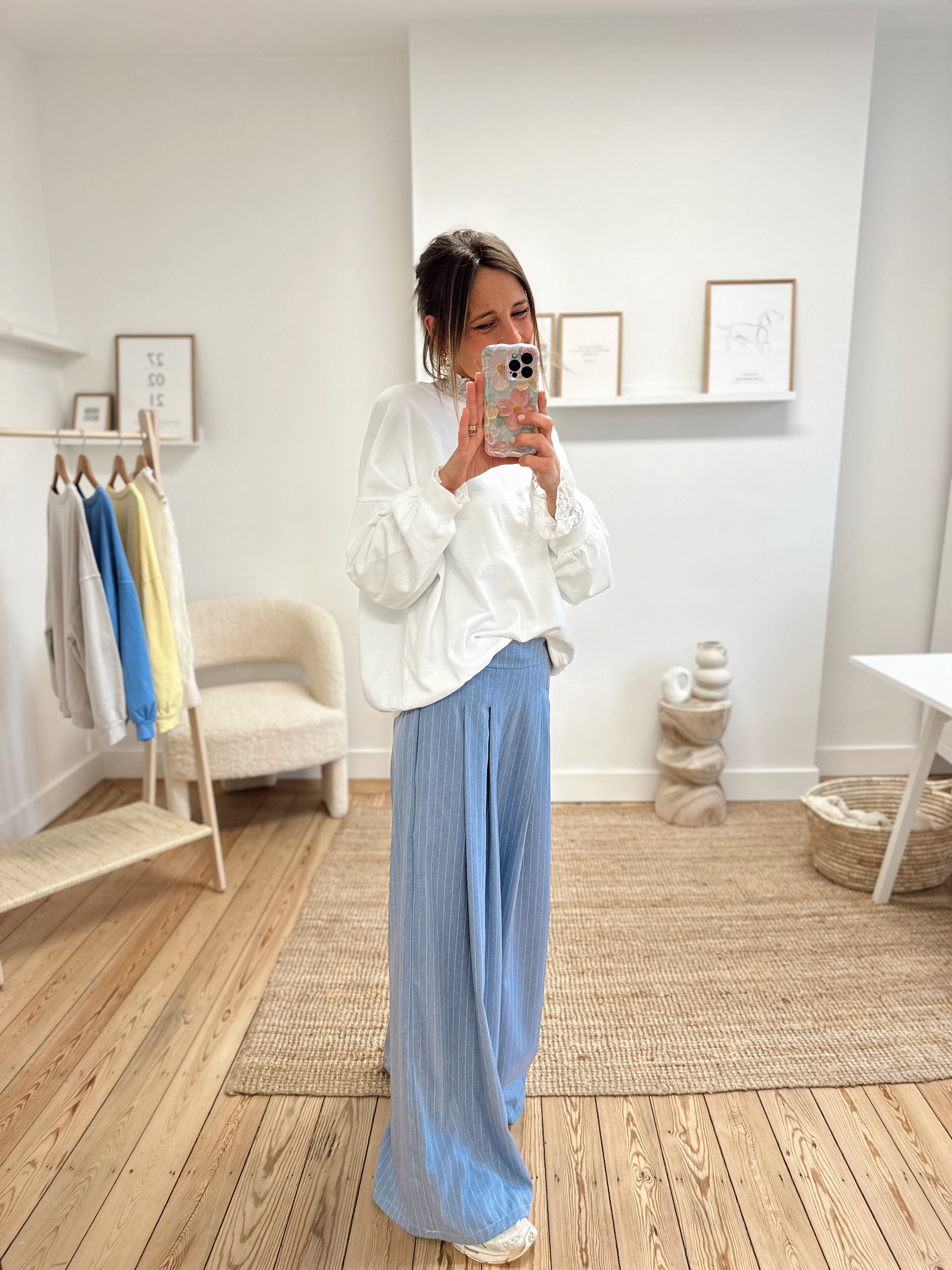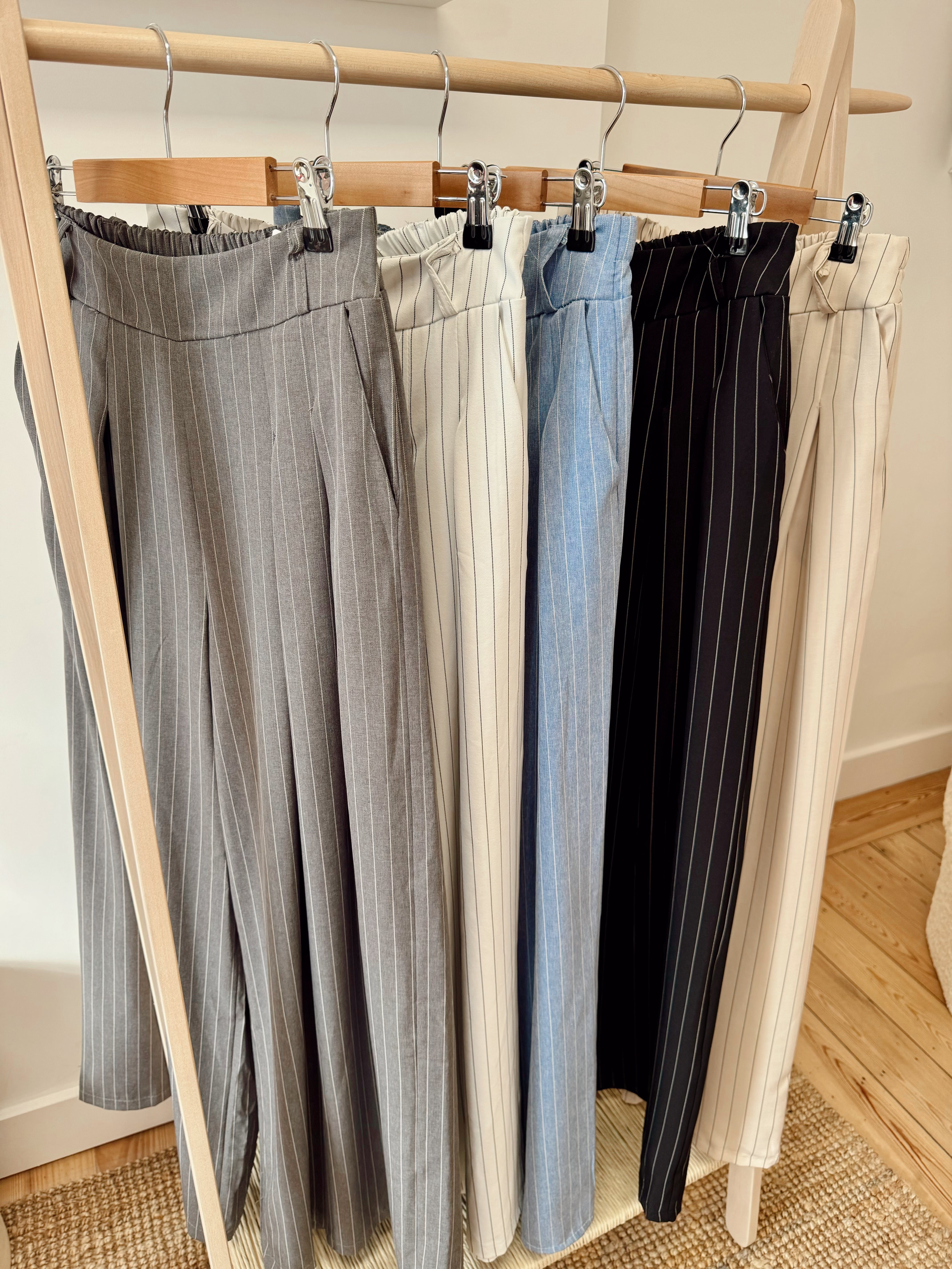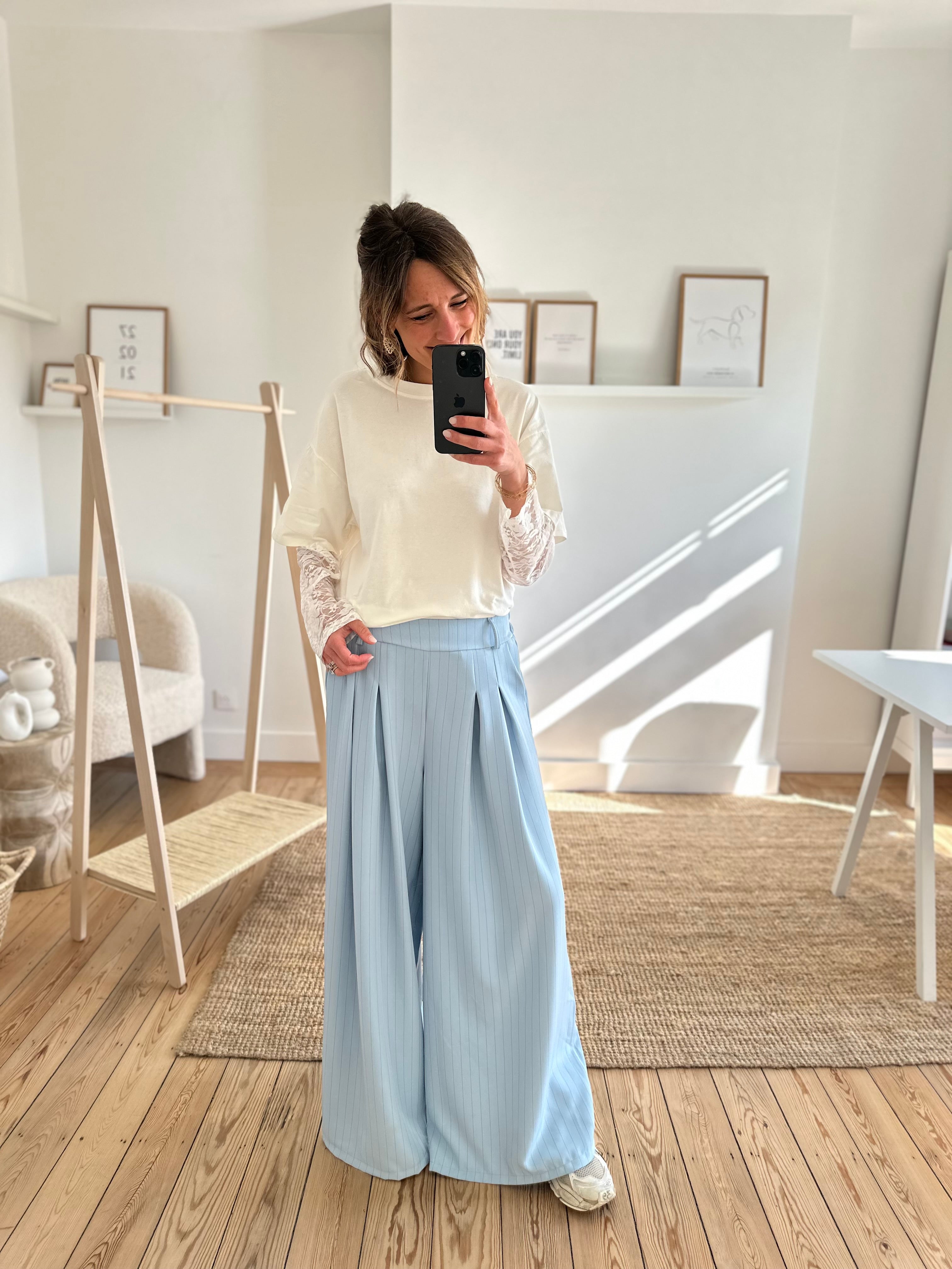 Pantalon ligné bleu et blanc. Avec un élastique à la taille, il est disponible seulement en taille unique et taille assez grand.