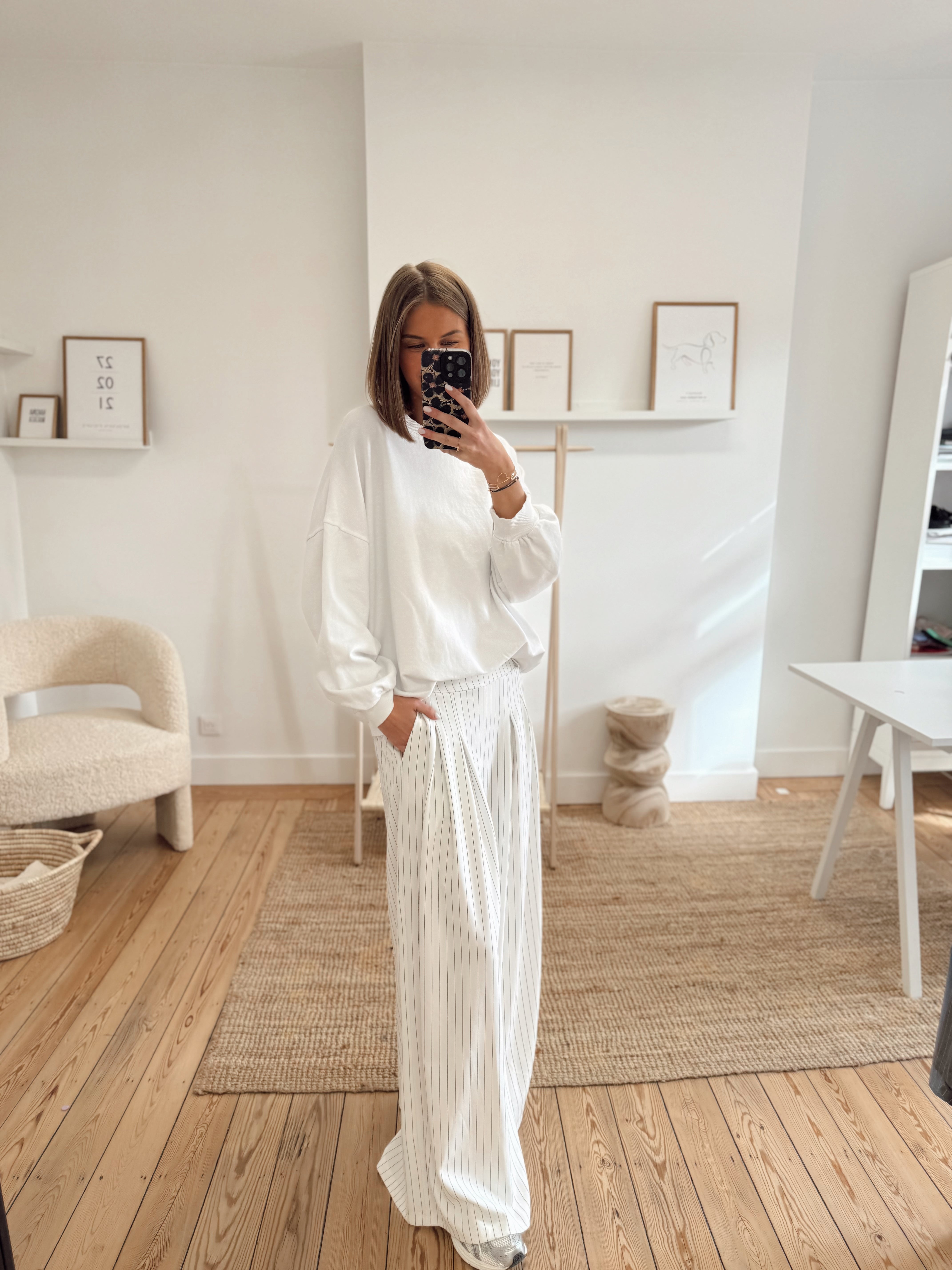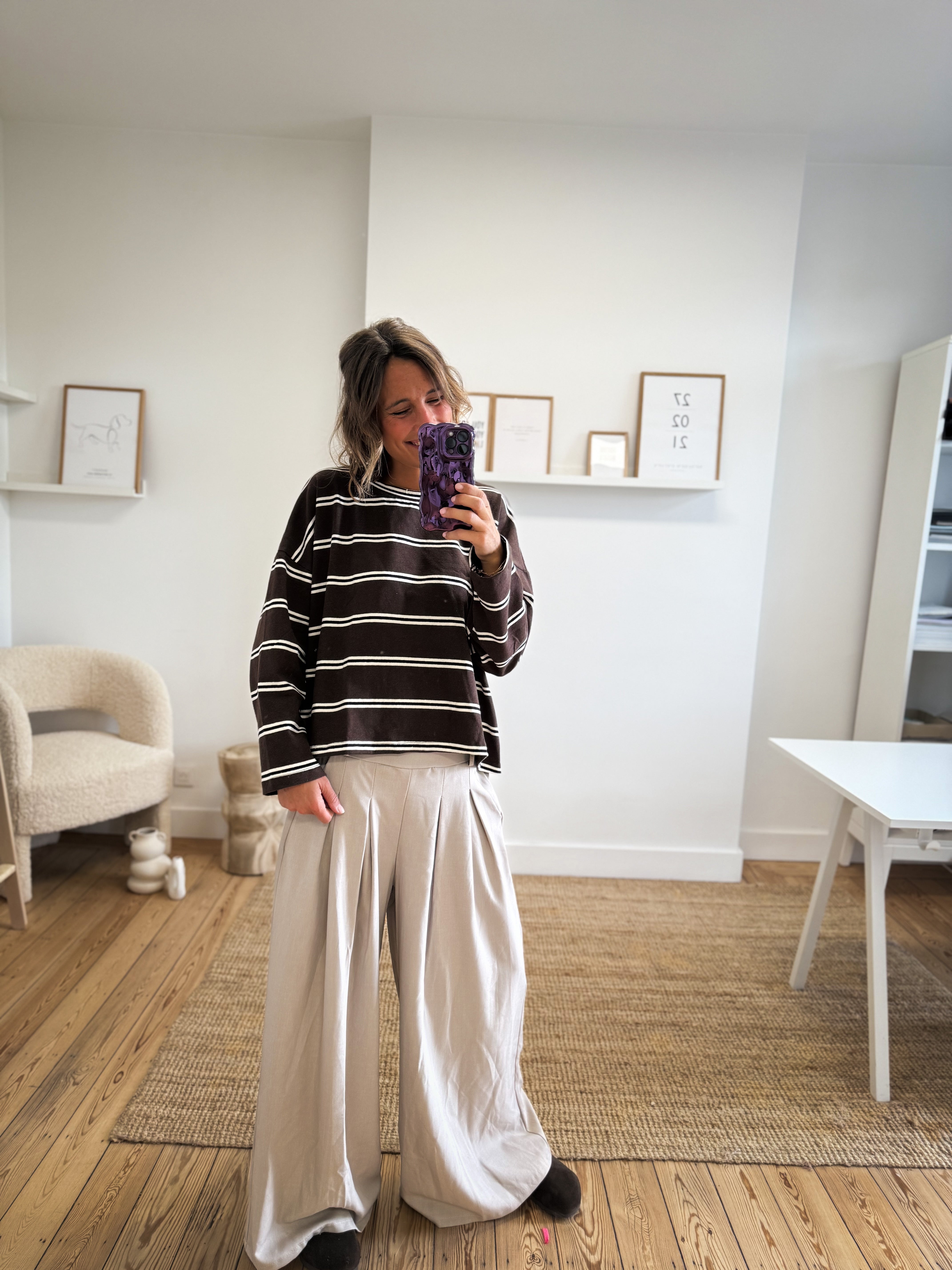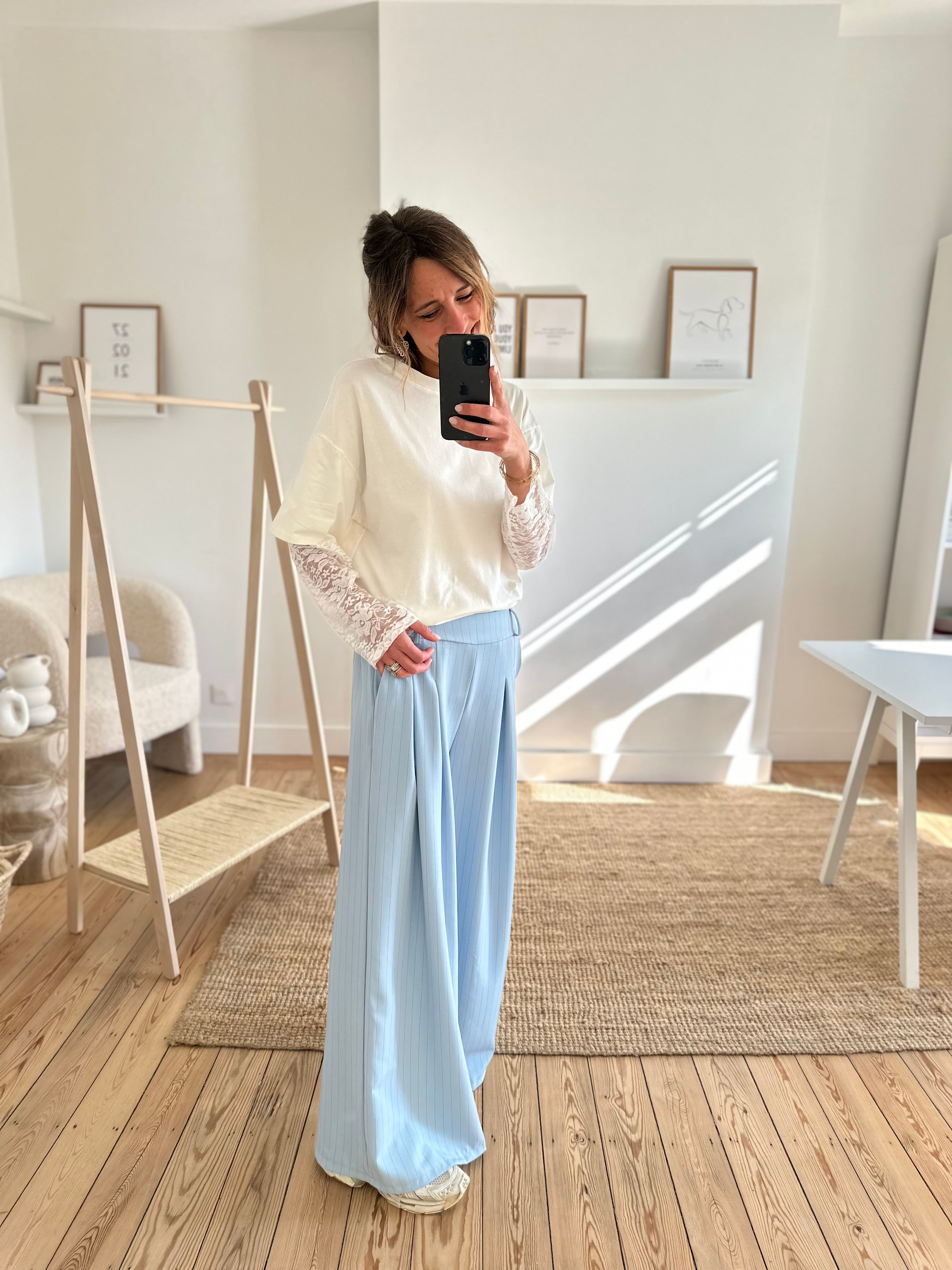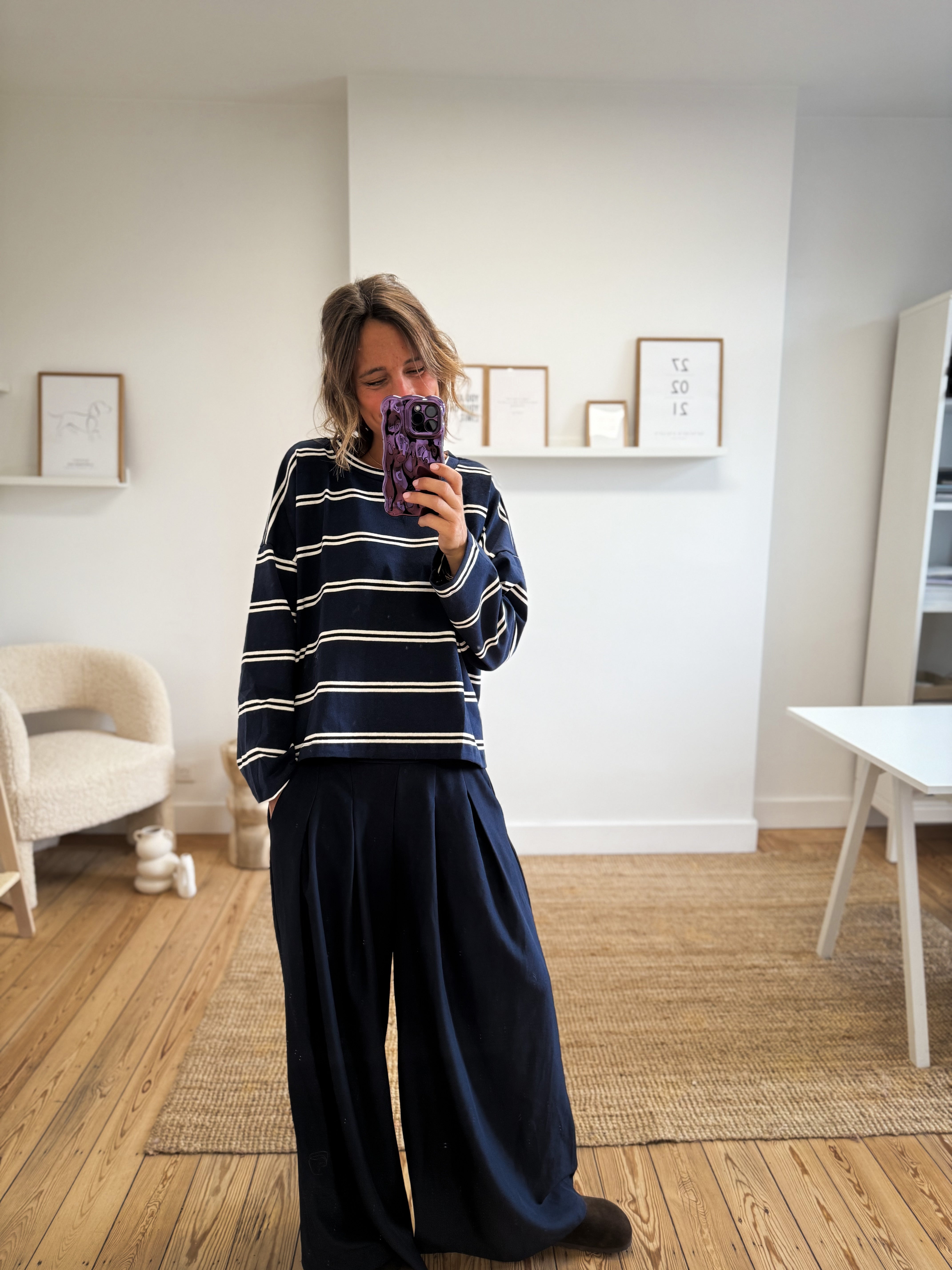 Pantalon ligné bleu et blanc. Avec un élastique à la taille, il est disponible seulement en taille unique et taille assez grand.