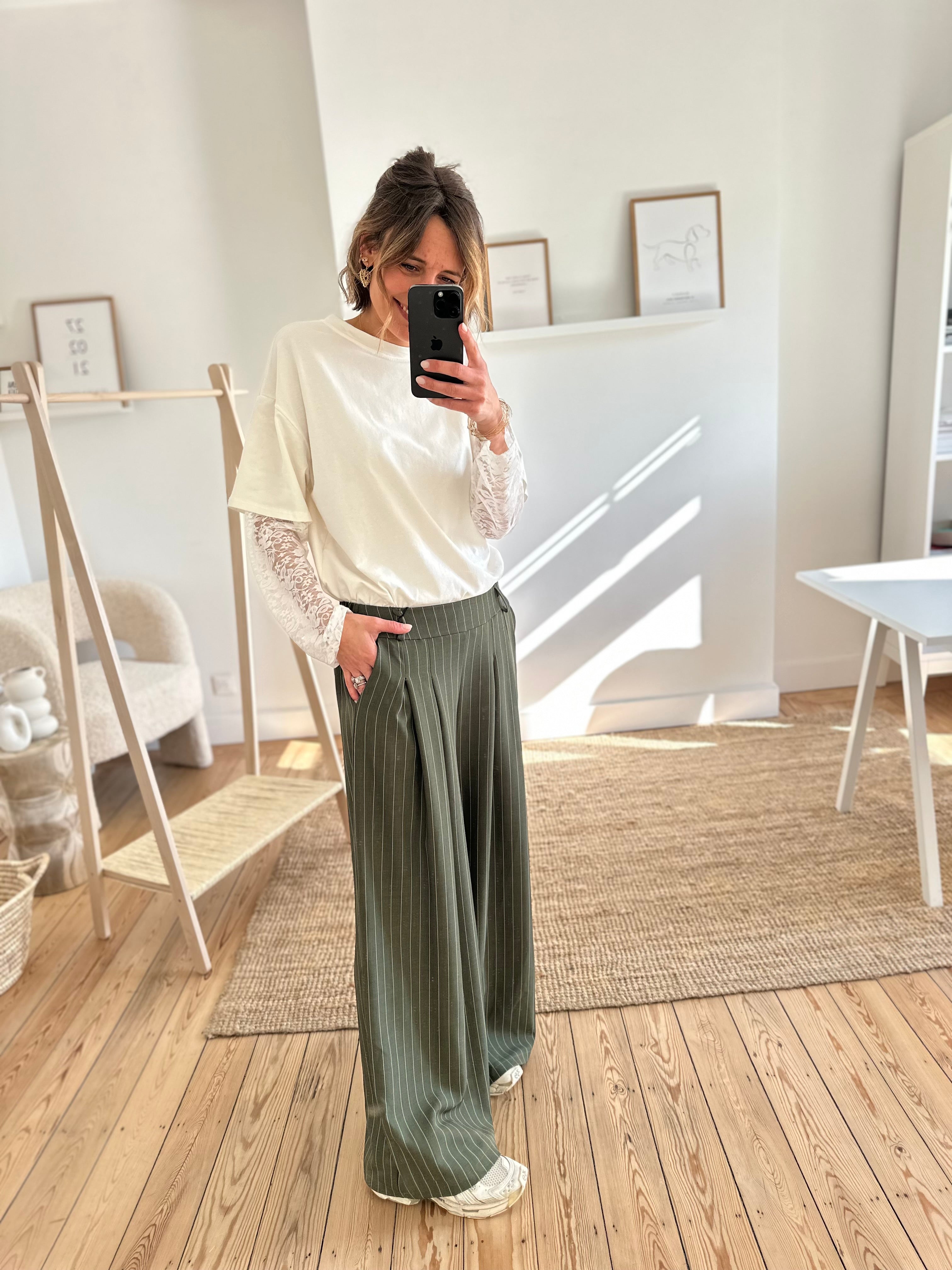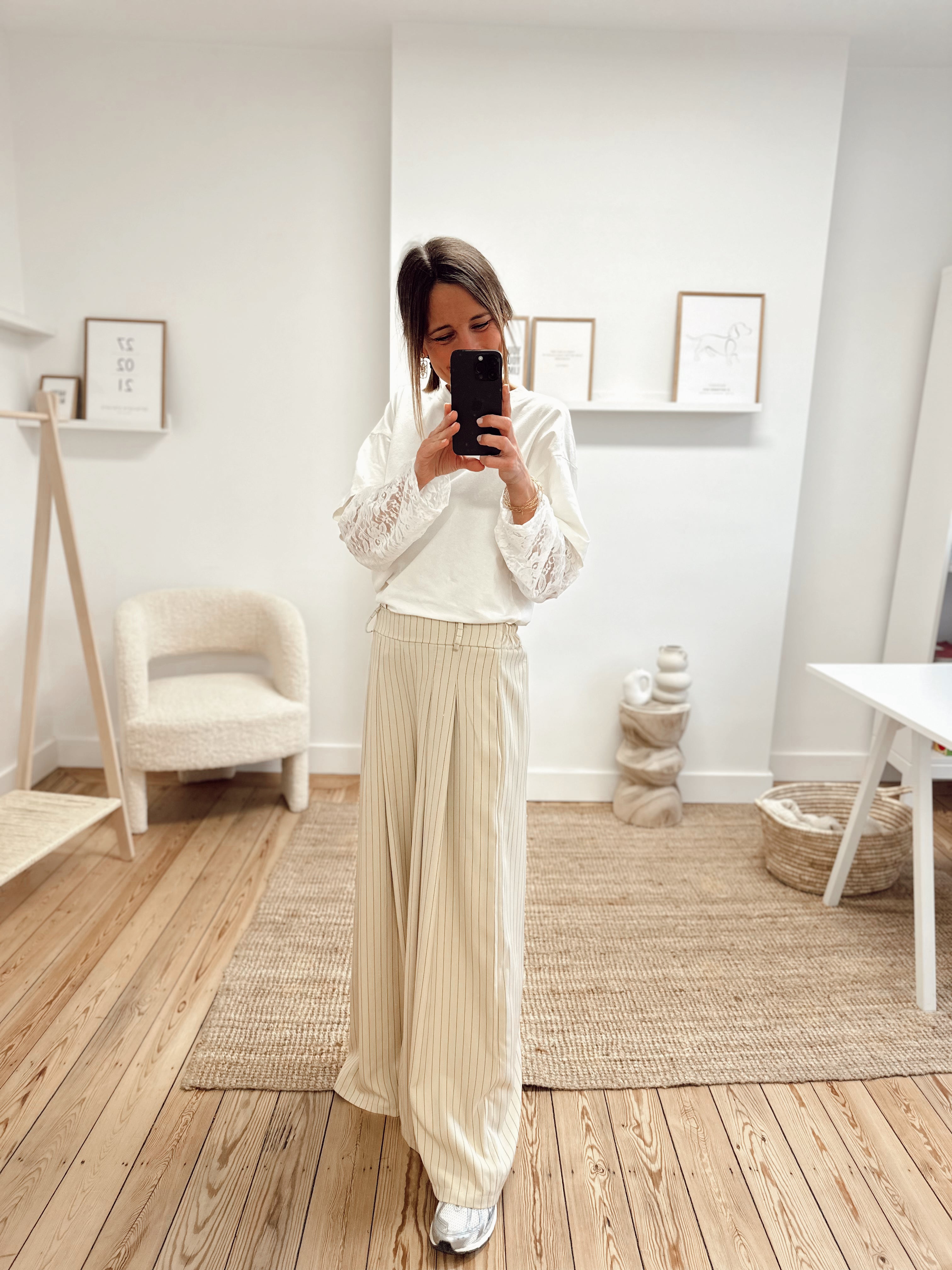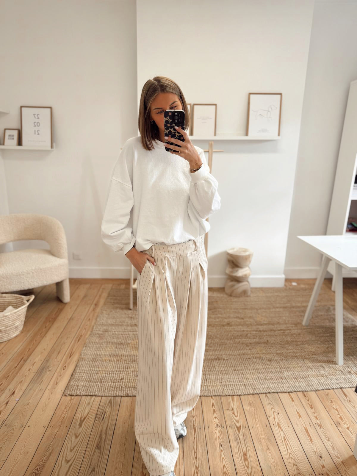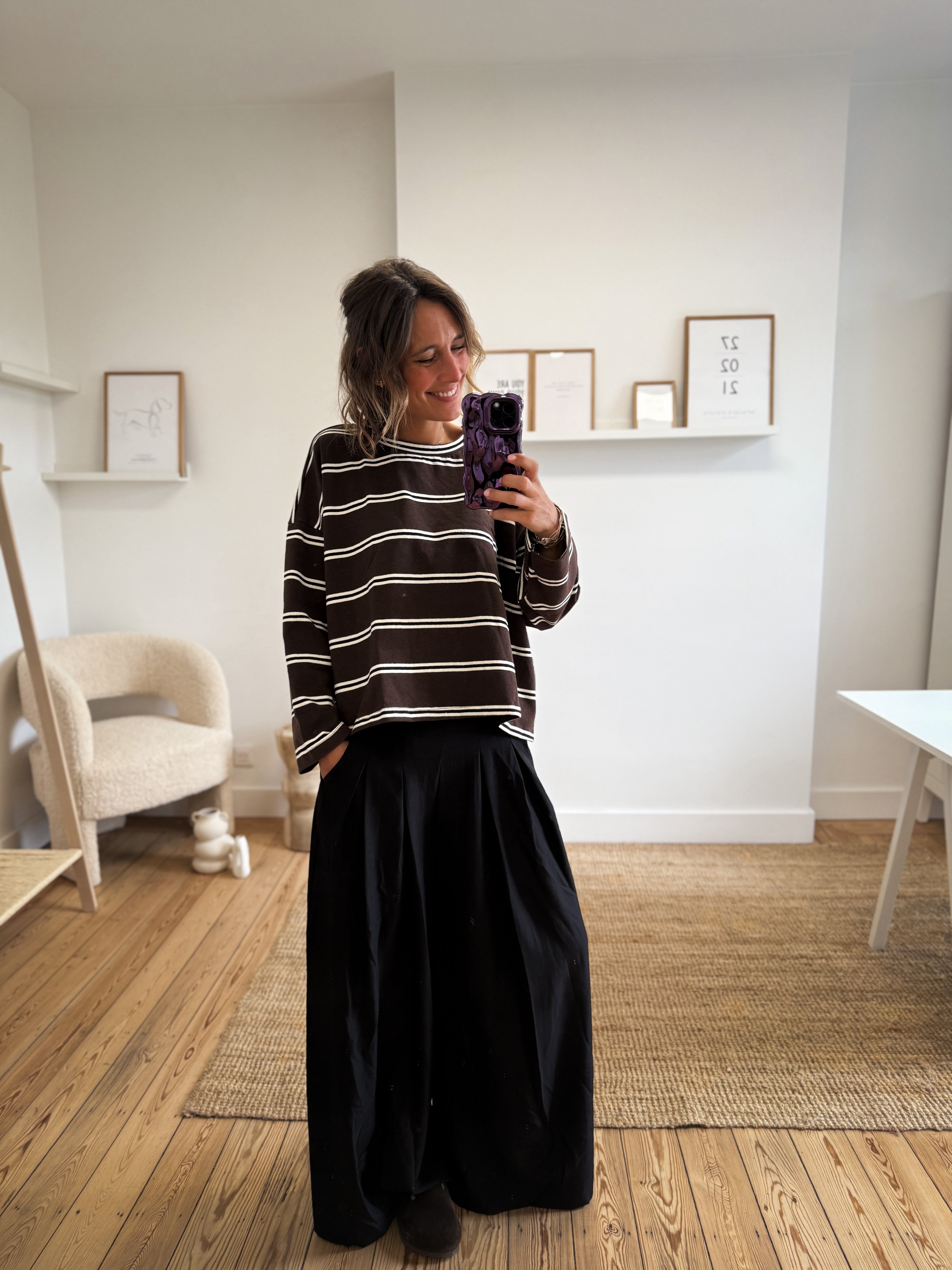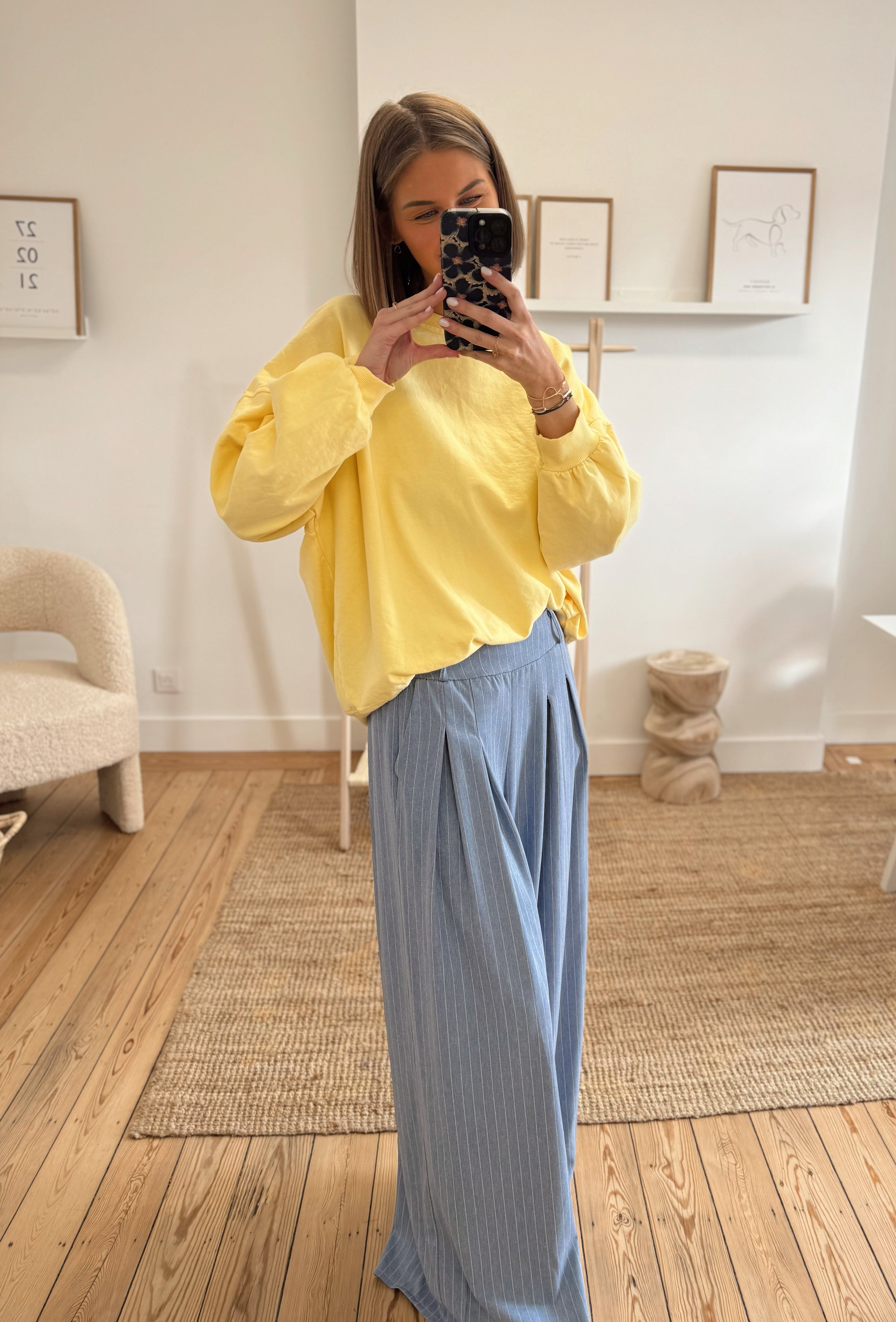 Pantalon ligné bleu et blanc. Avec un élastique à la taille, il est disponible seulement en taille unique et taille assez grand.