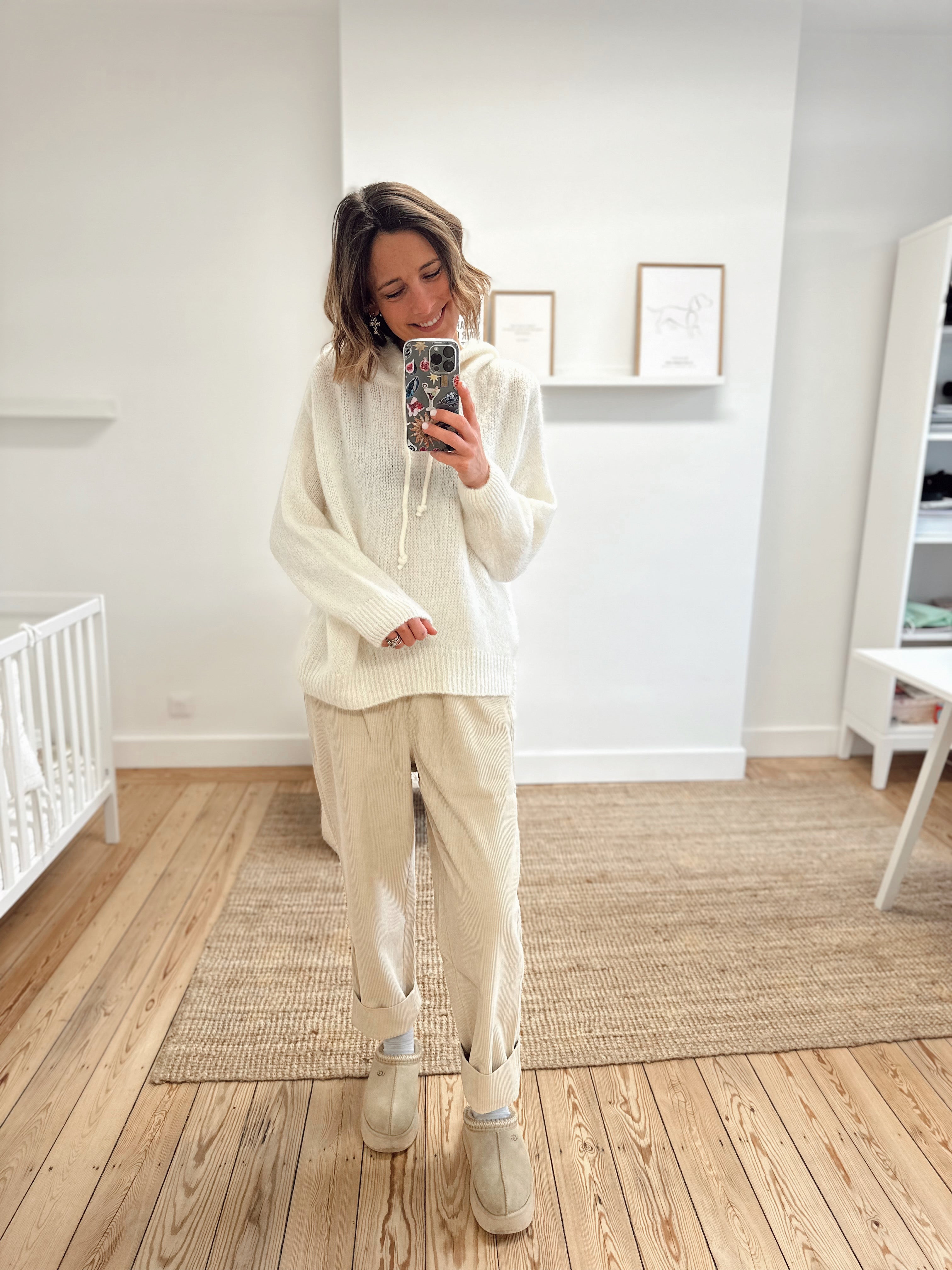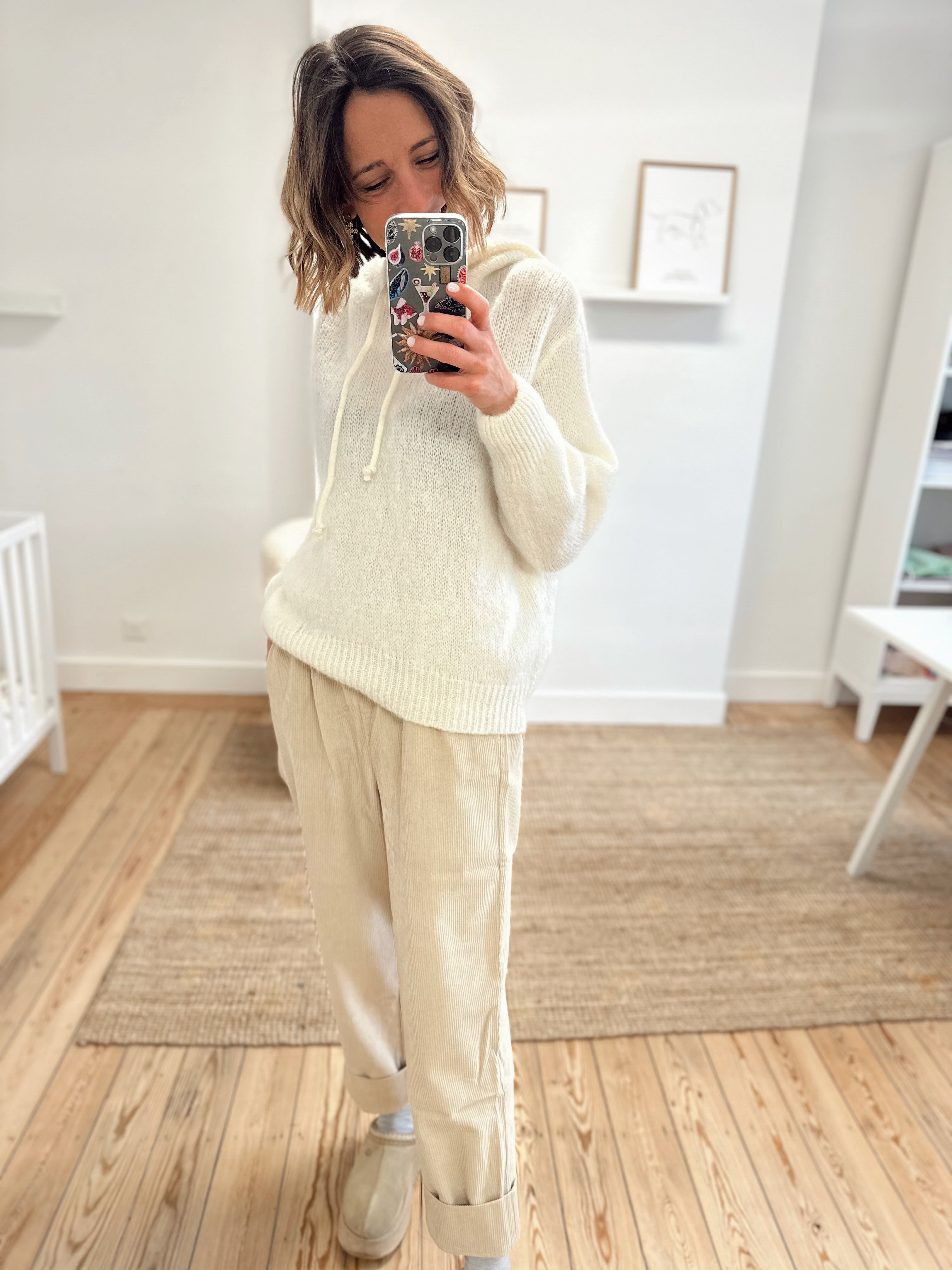 Pantalon en velours côtelé beige, élastique à la taille. Revers à l'ourlet. Il est disponible en taille S, M et L. Le mannequin mesure 1m75 et porte la taille S.