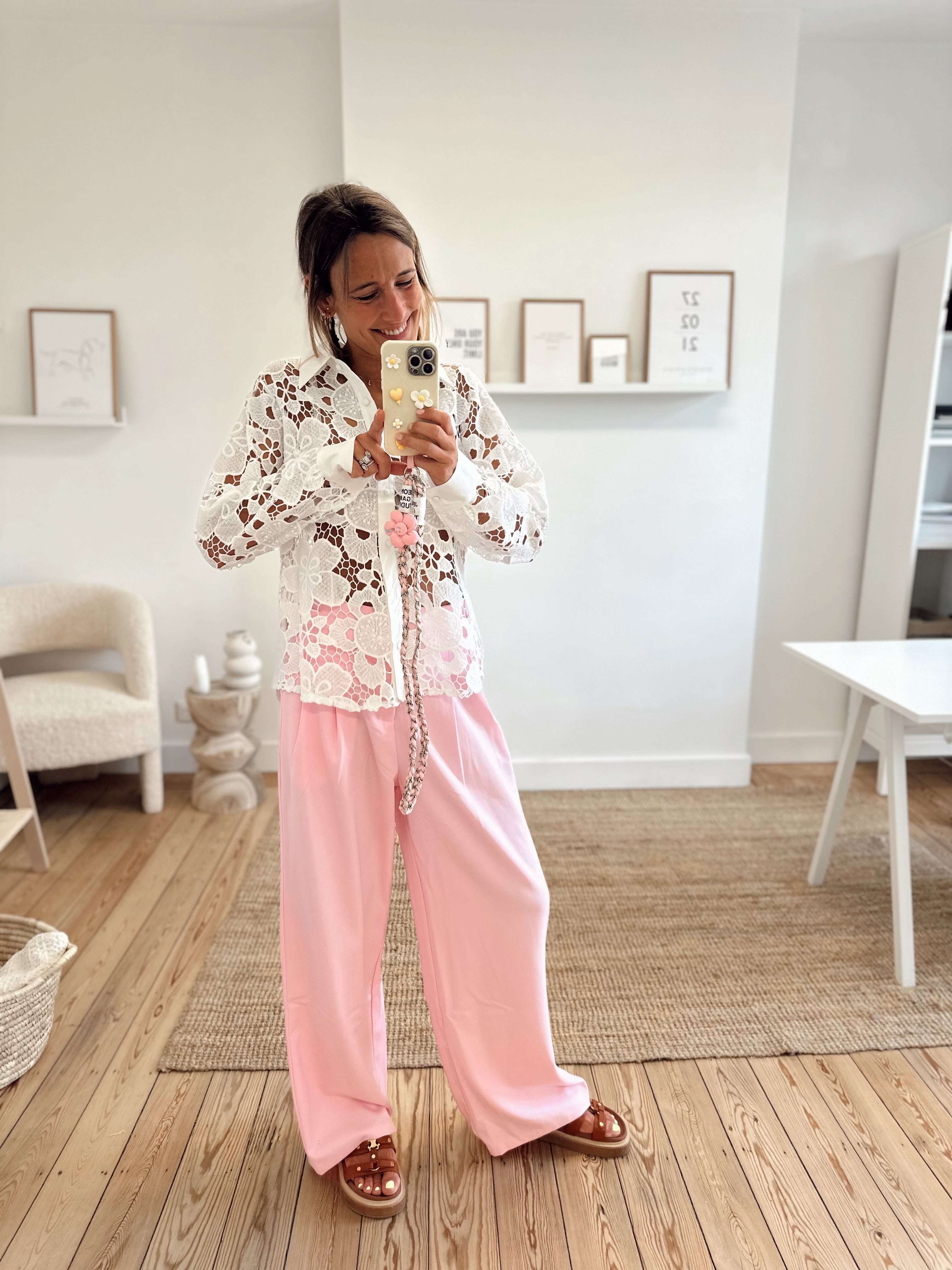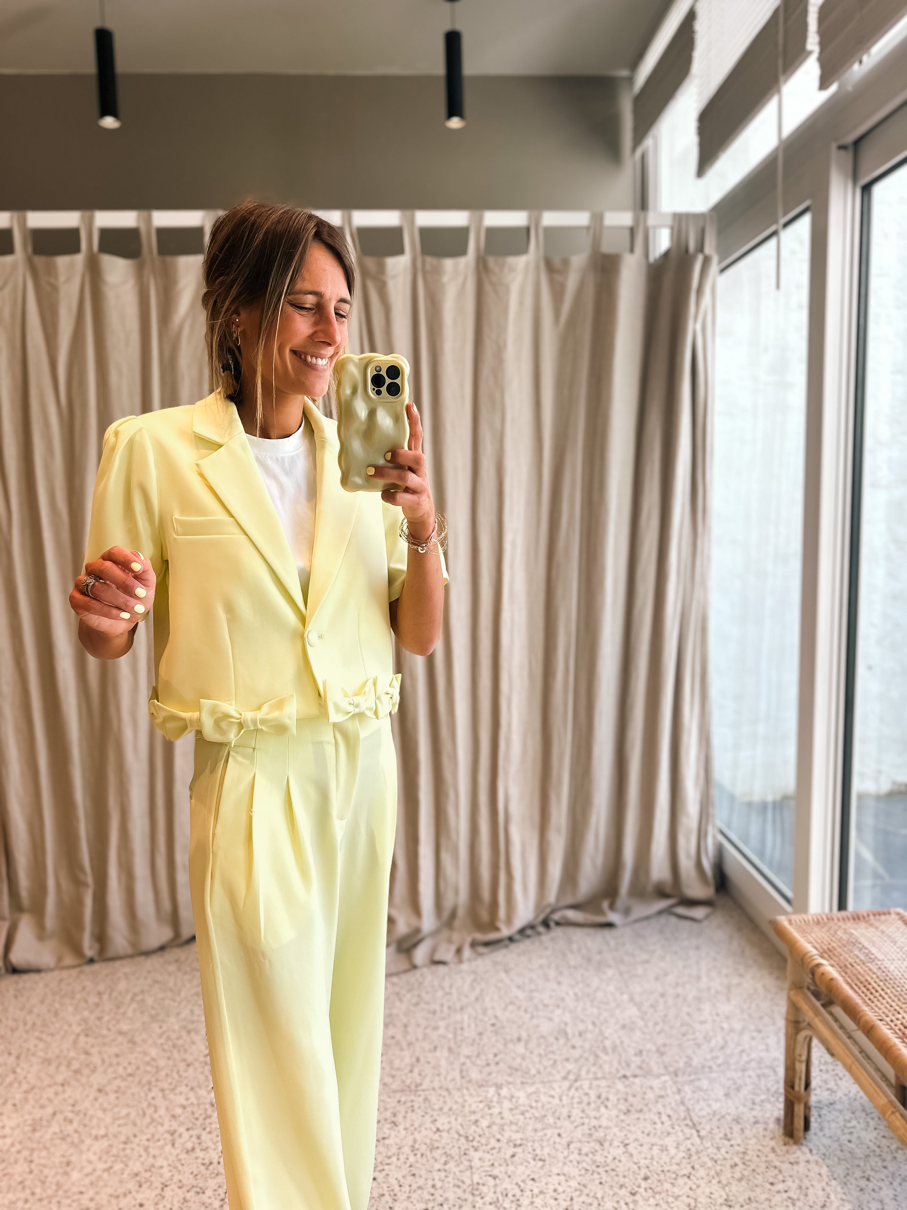 Pantalon à pince droit, avec une fermeture sous forme de tirette et d'un bouton. Il est de couleur jaune pastel et est disponible de la taille XS à L.