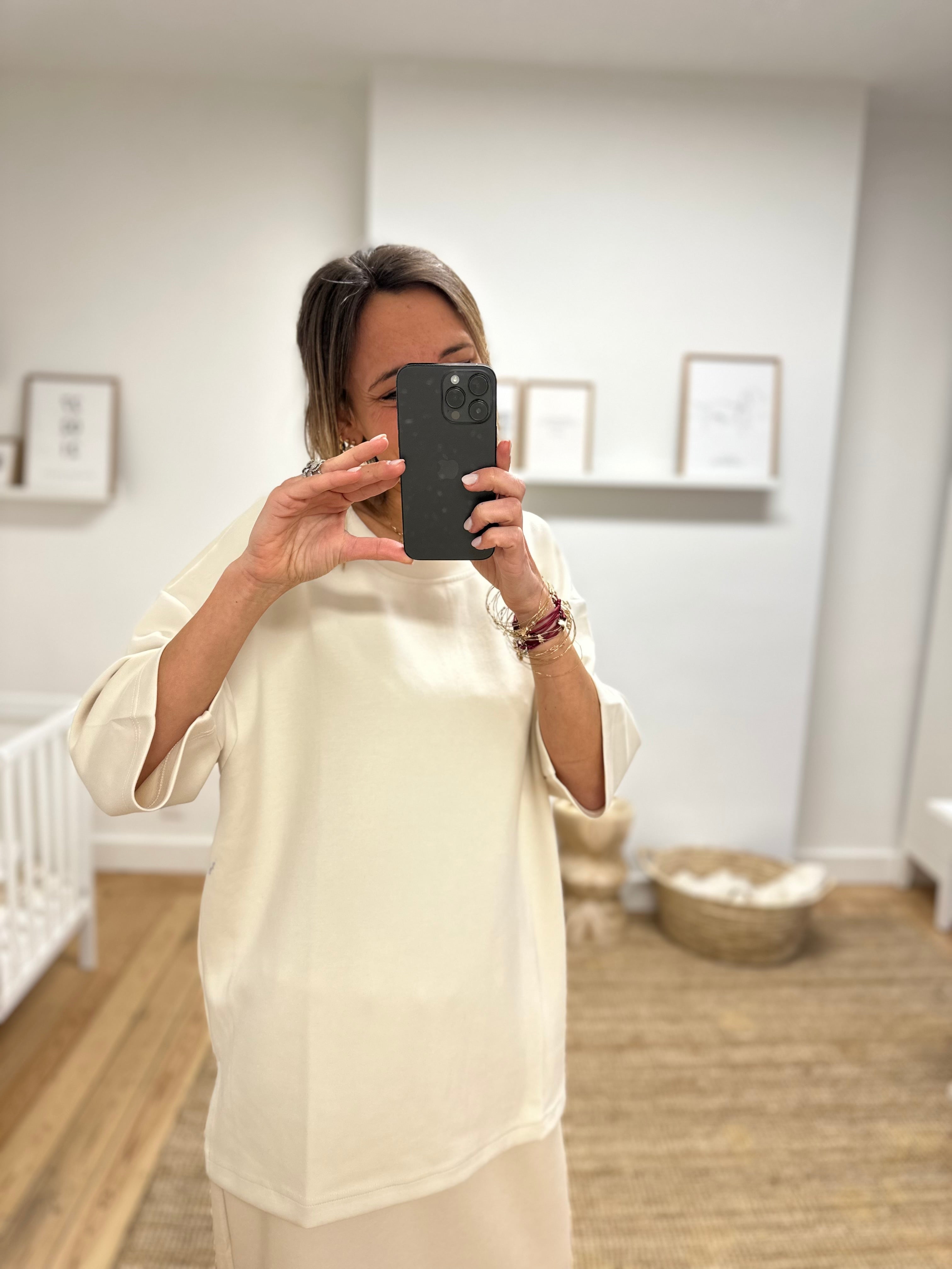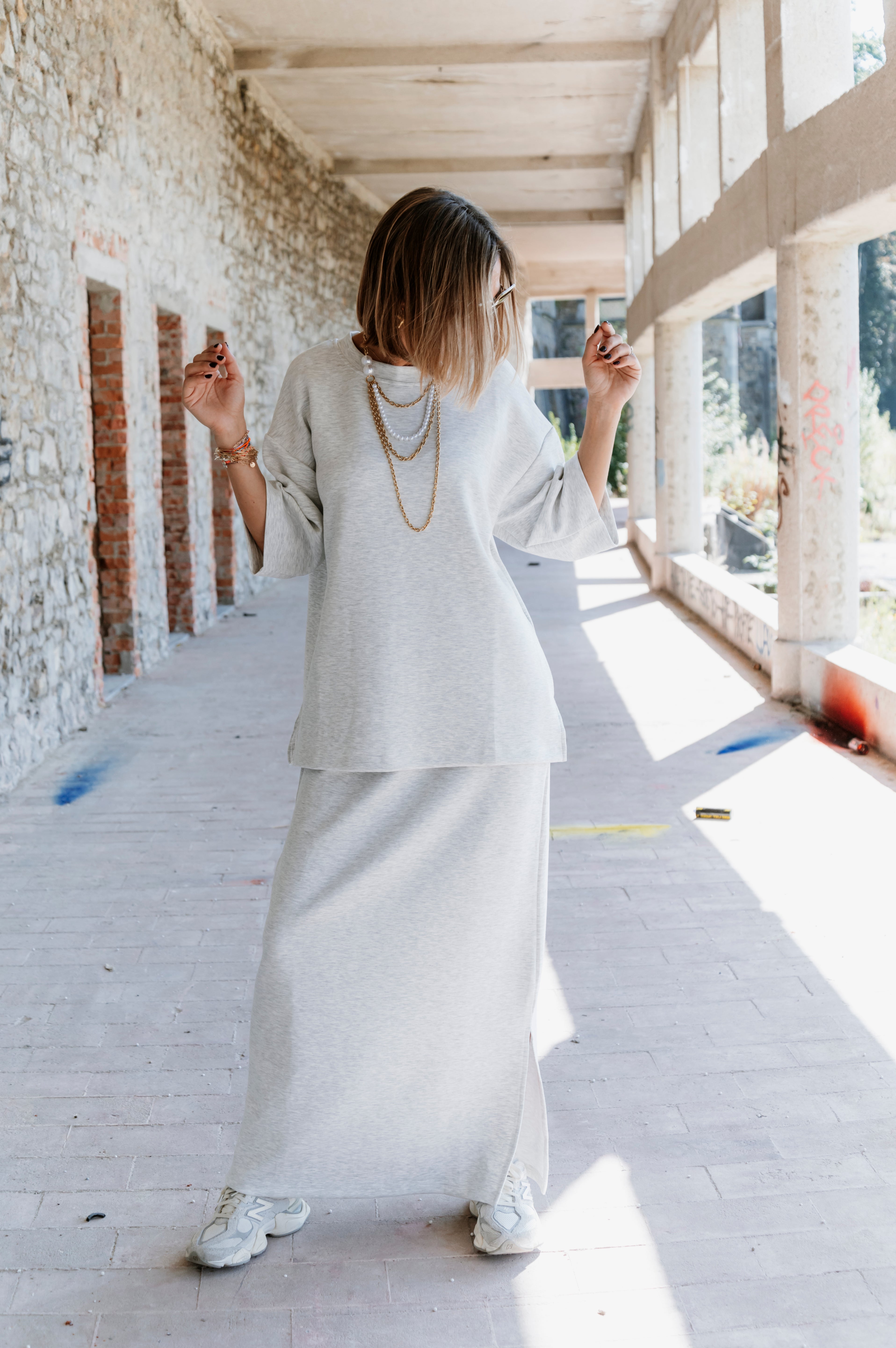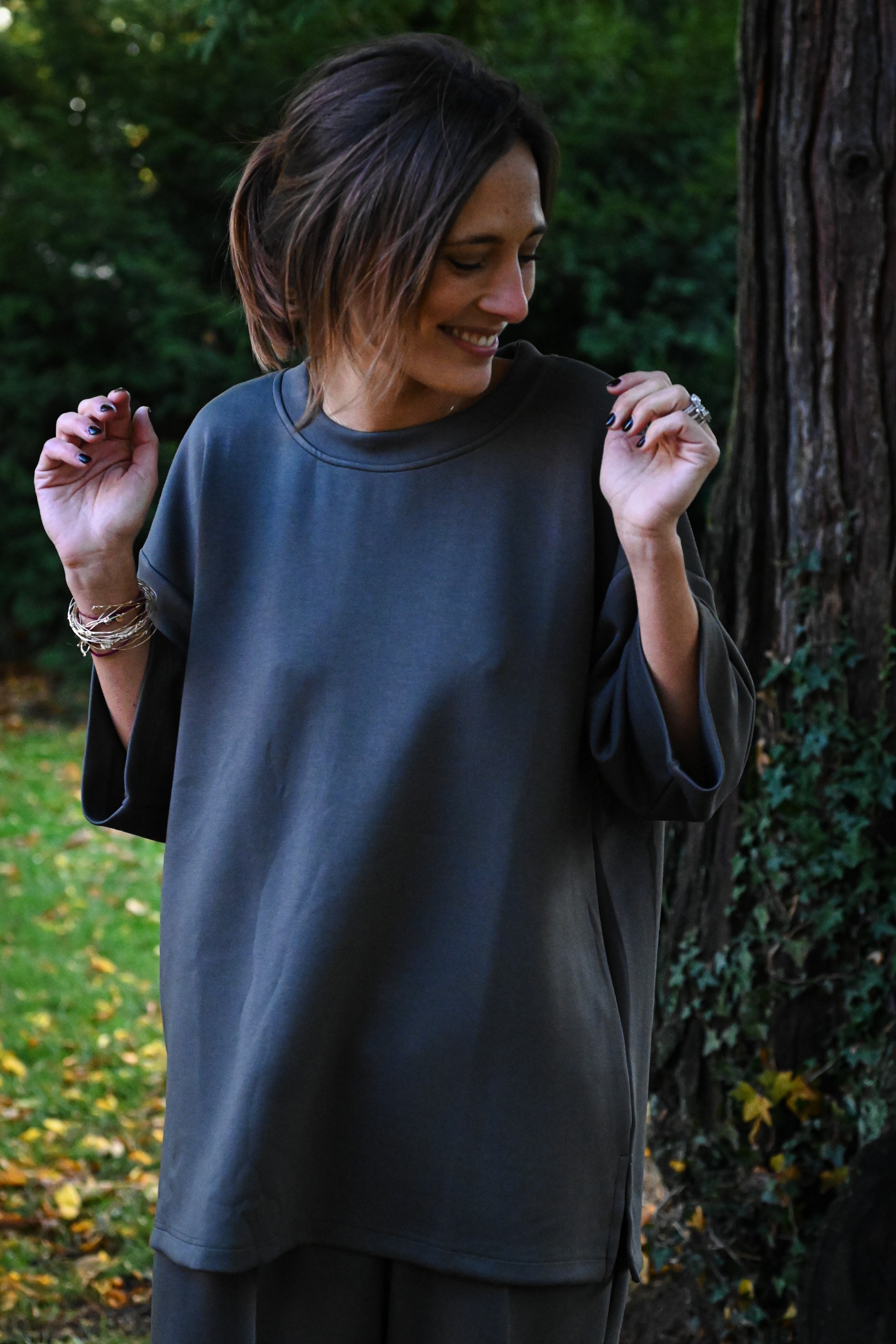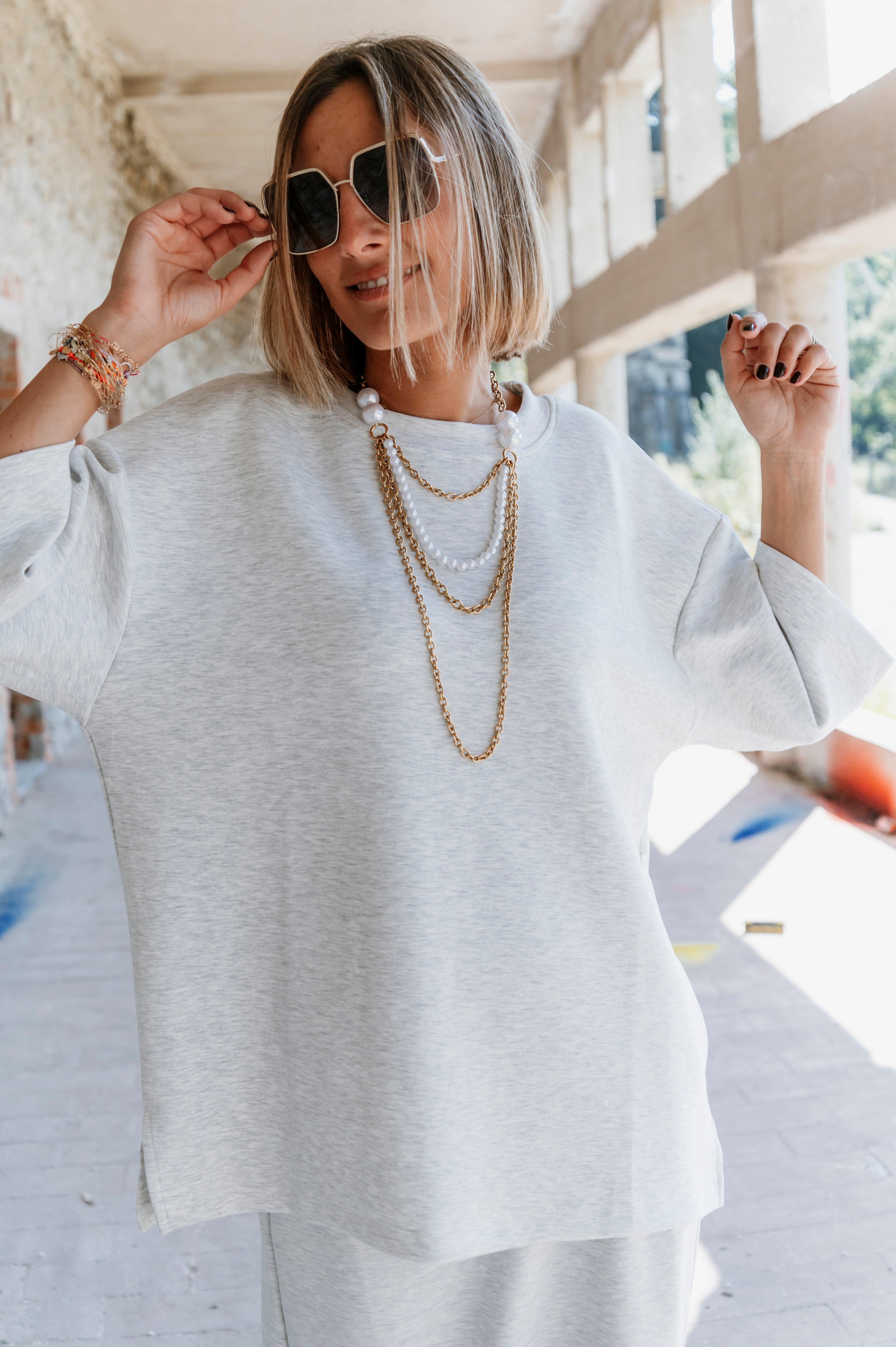 Sweat à courtes manches gris clair, look très oversize et matière très agréable. Il est disponible seulement en taille unique mais s'adapte facilement à toutes les tailles et morphologies. Le mannequin mesure 1m75.