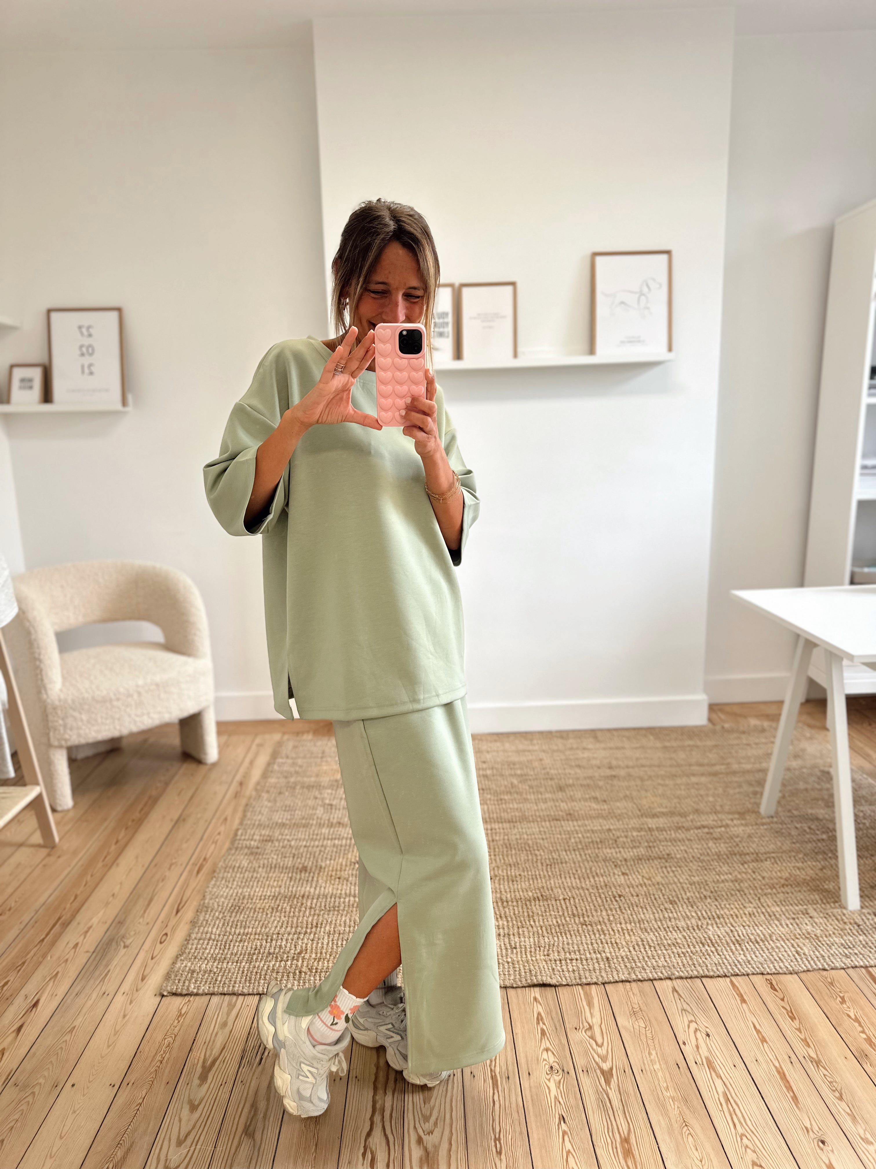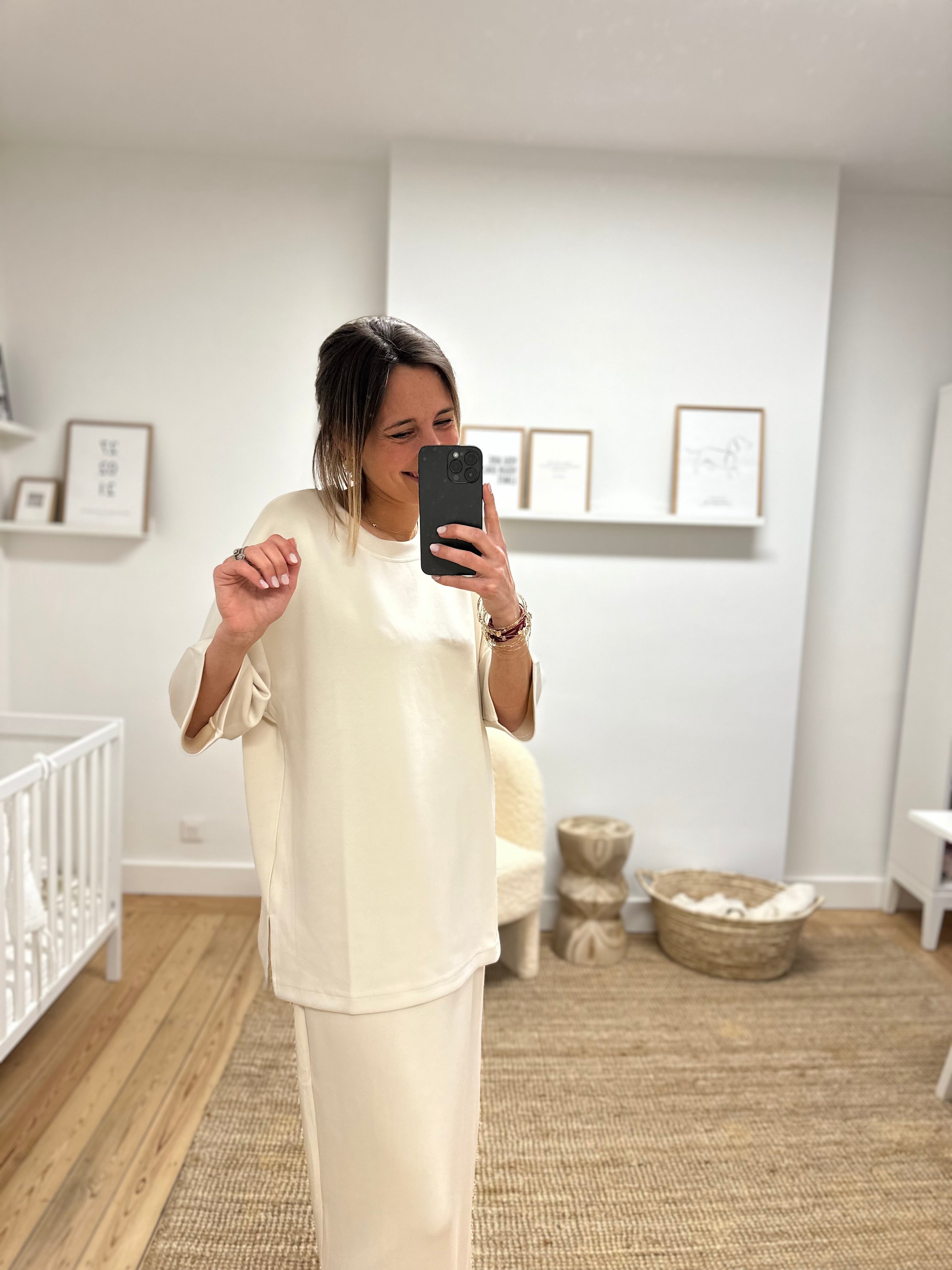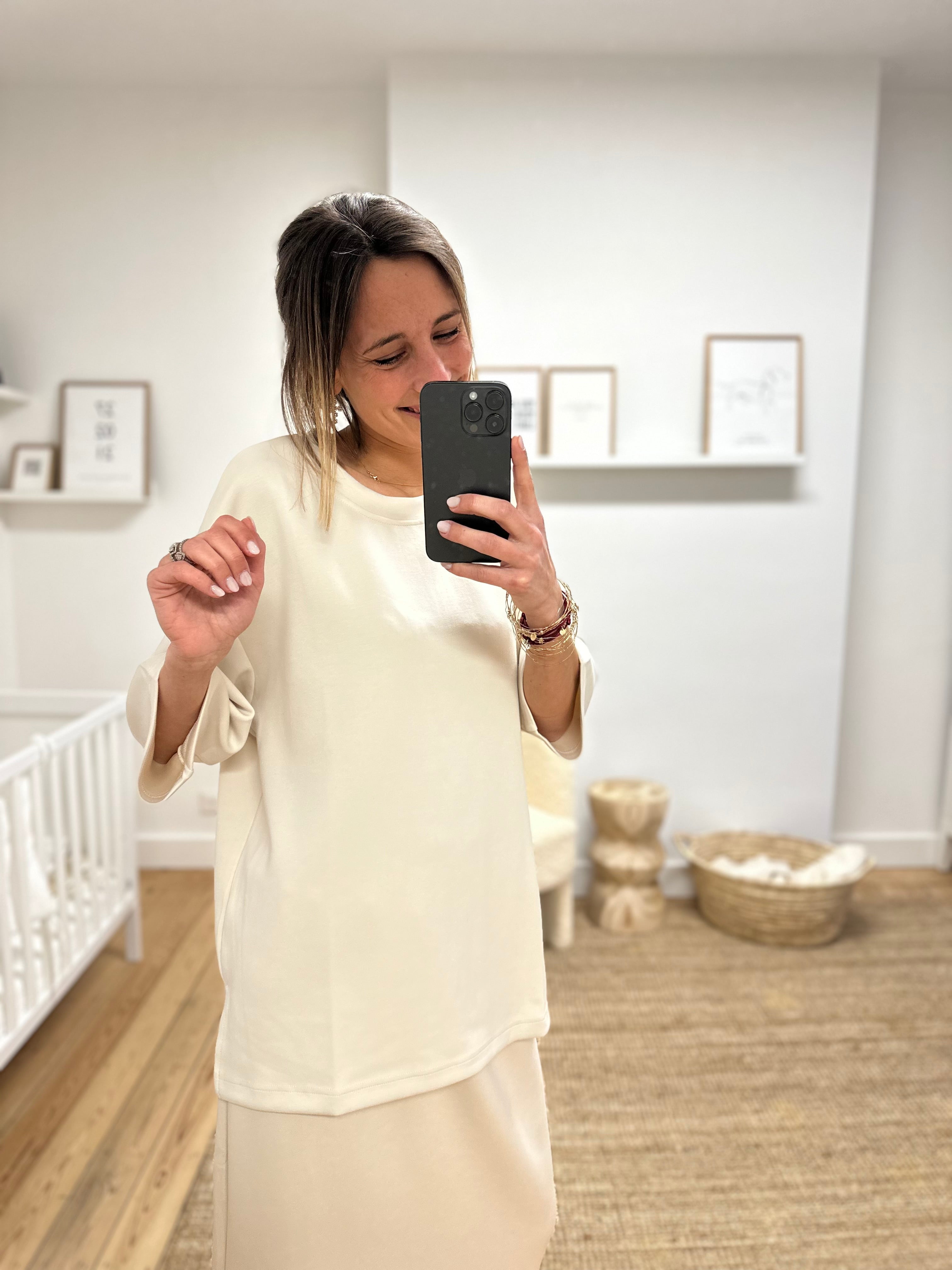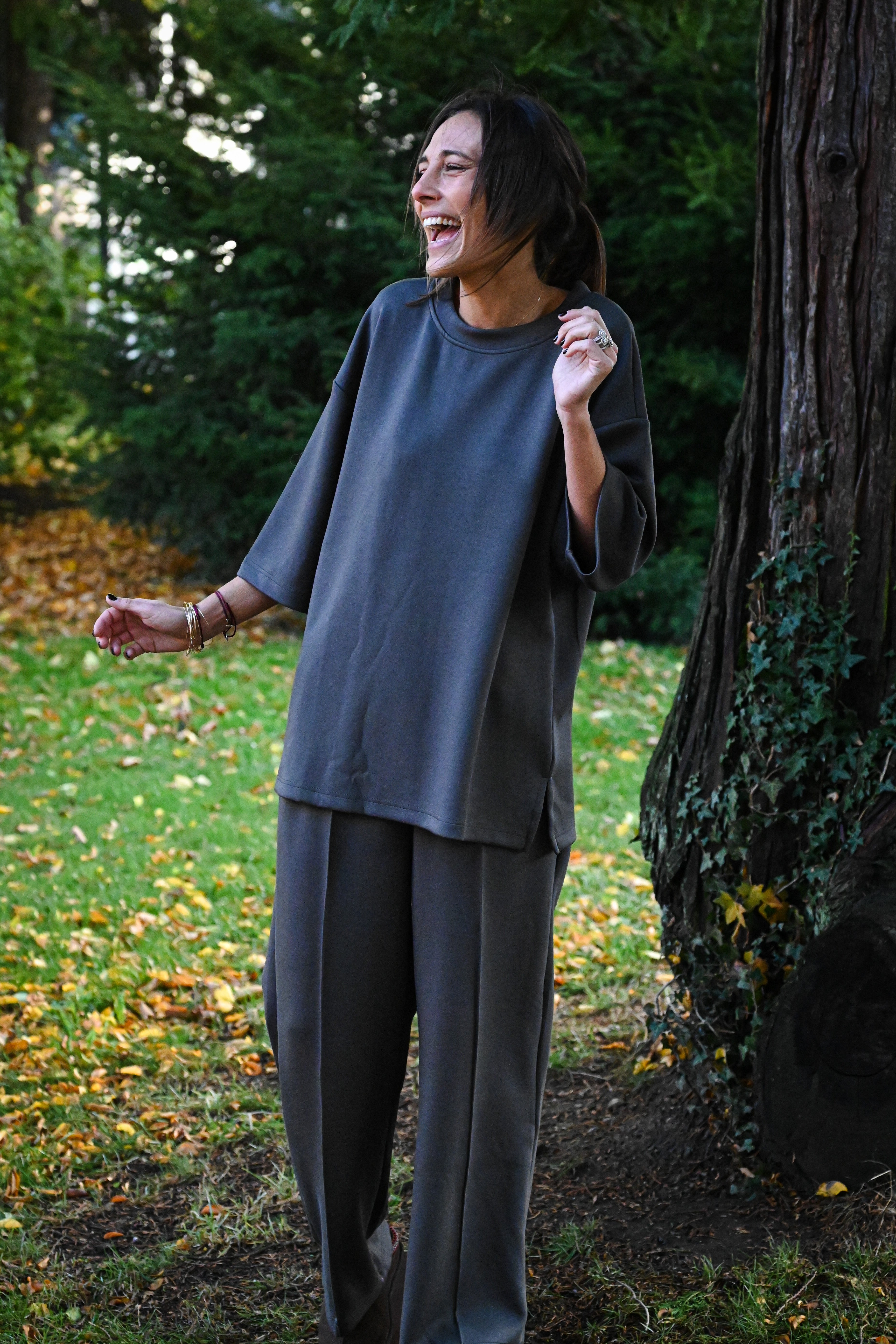 Sweat à courtes manches gris clair, look très oversize et matière très agréable. Il est disponible seulement en taille unique mais s'adapte facilement à toutes les tailles et morphologies. Le mannequin mesure 1m75.
