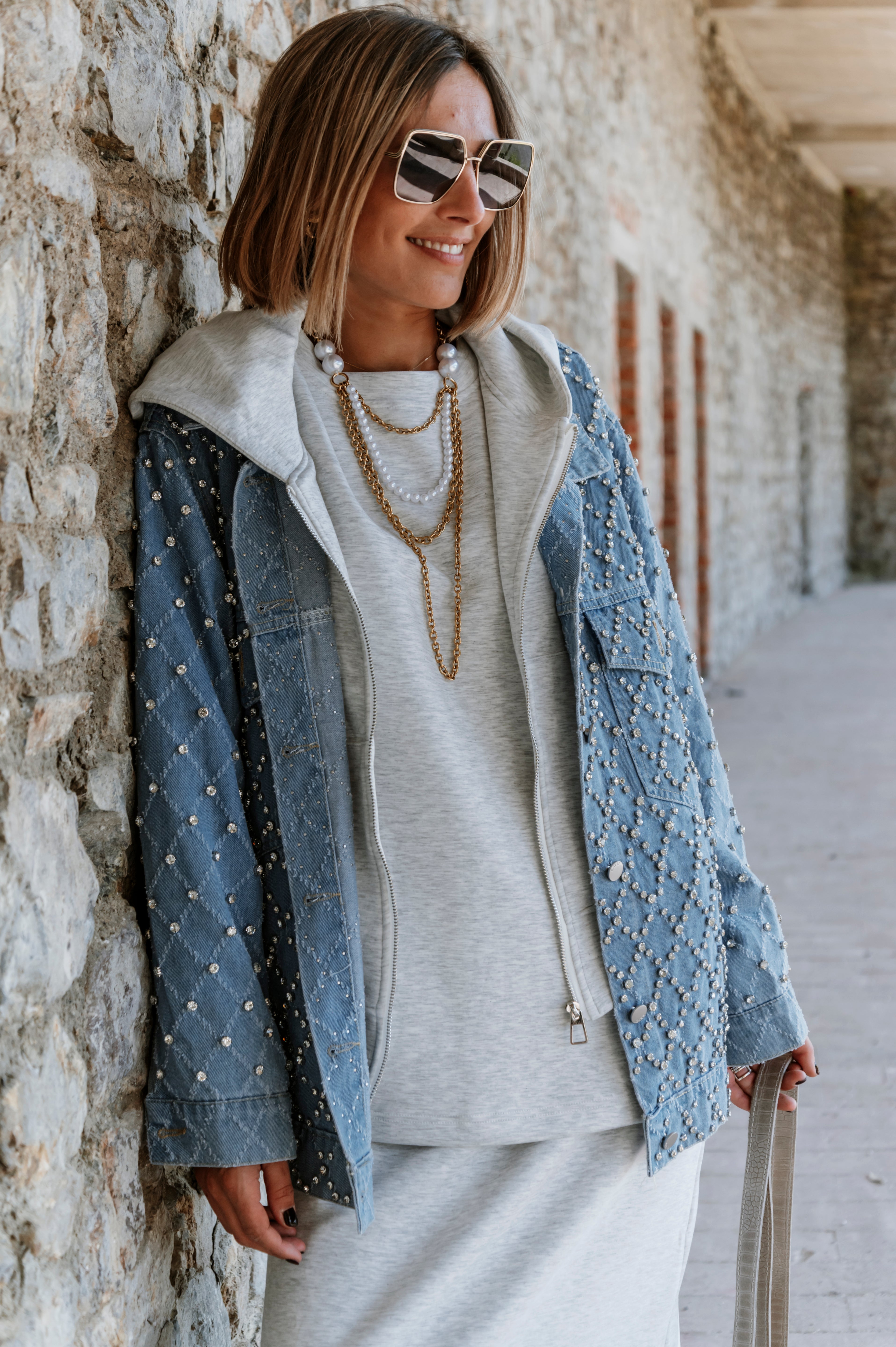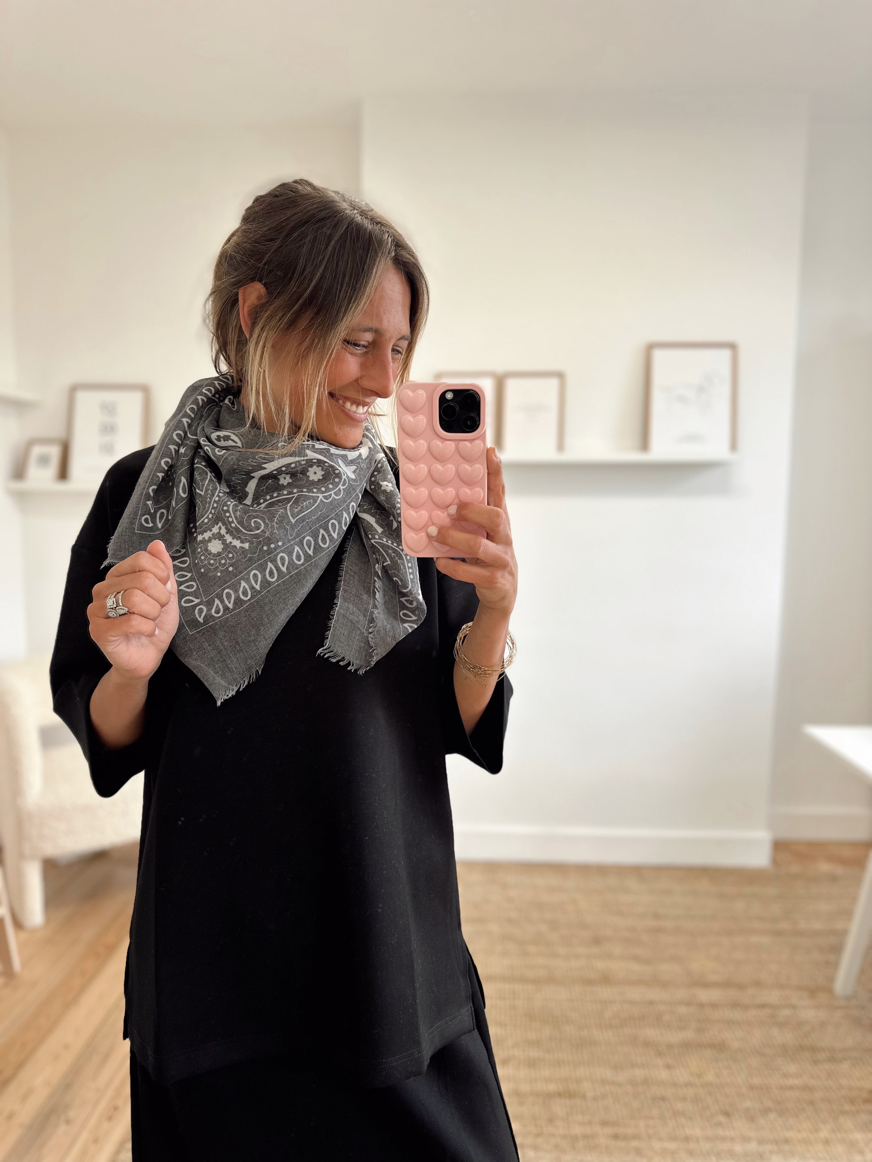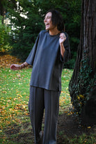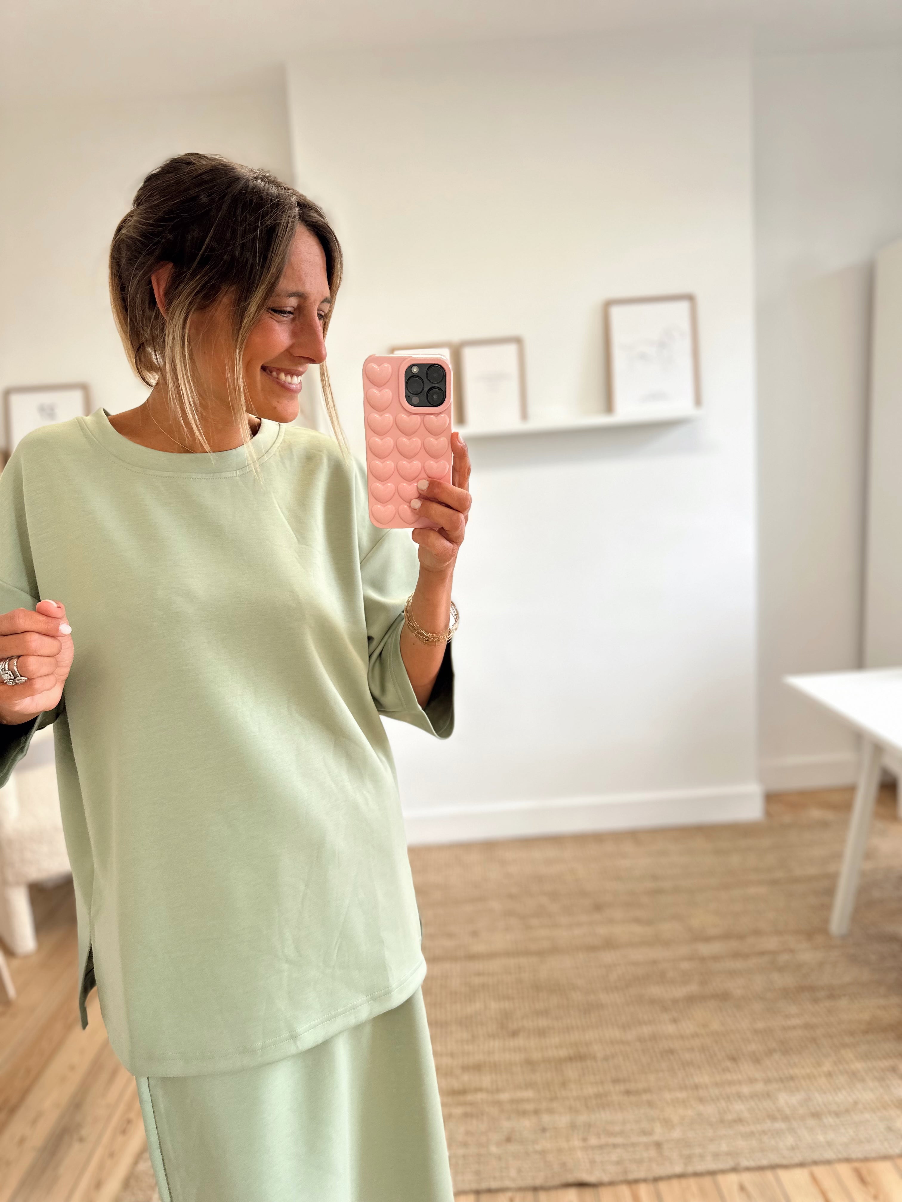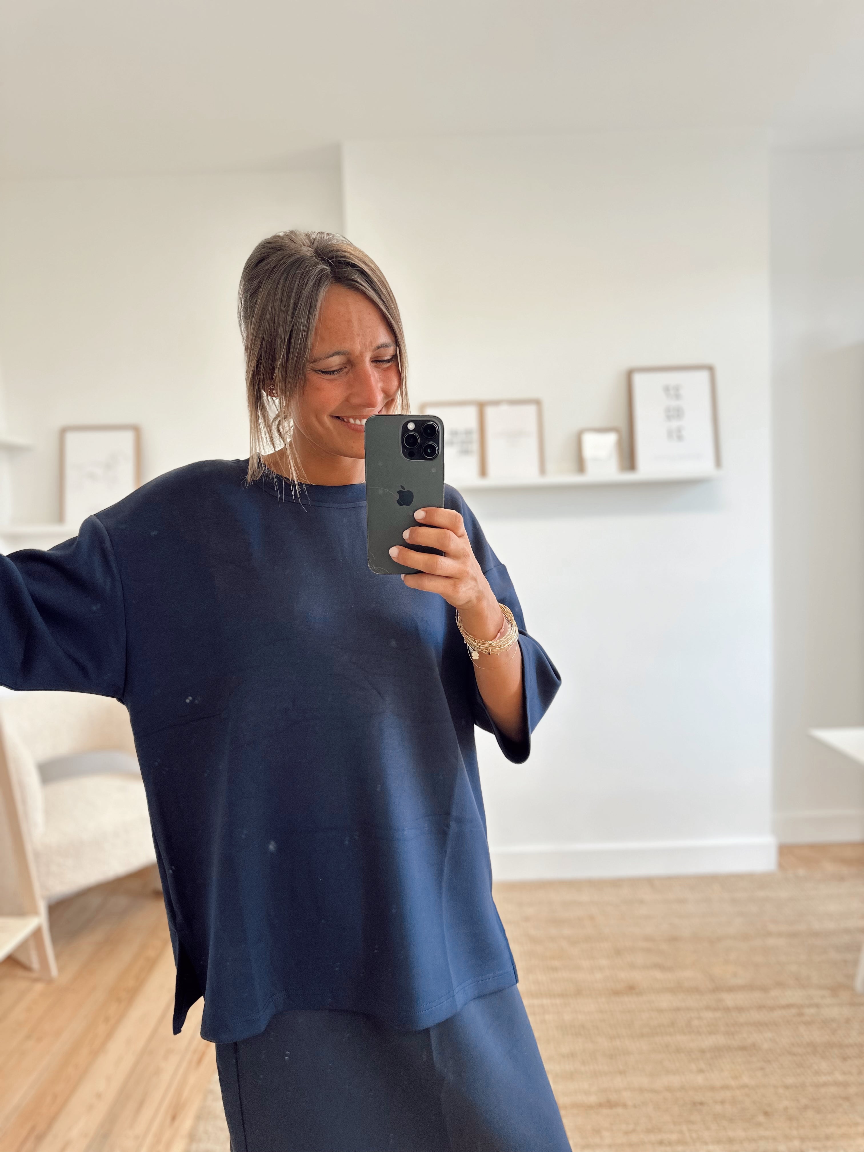 Sweat à courtes manches gris clair, look très oversize et matière très agréable. Il est disponible seulement en taille unique mais s'adapte facilement à toutes les tailles et morphologies. Le mannequin mesure 1m75.