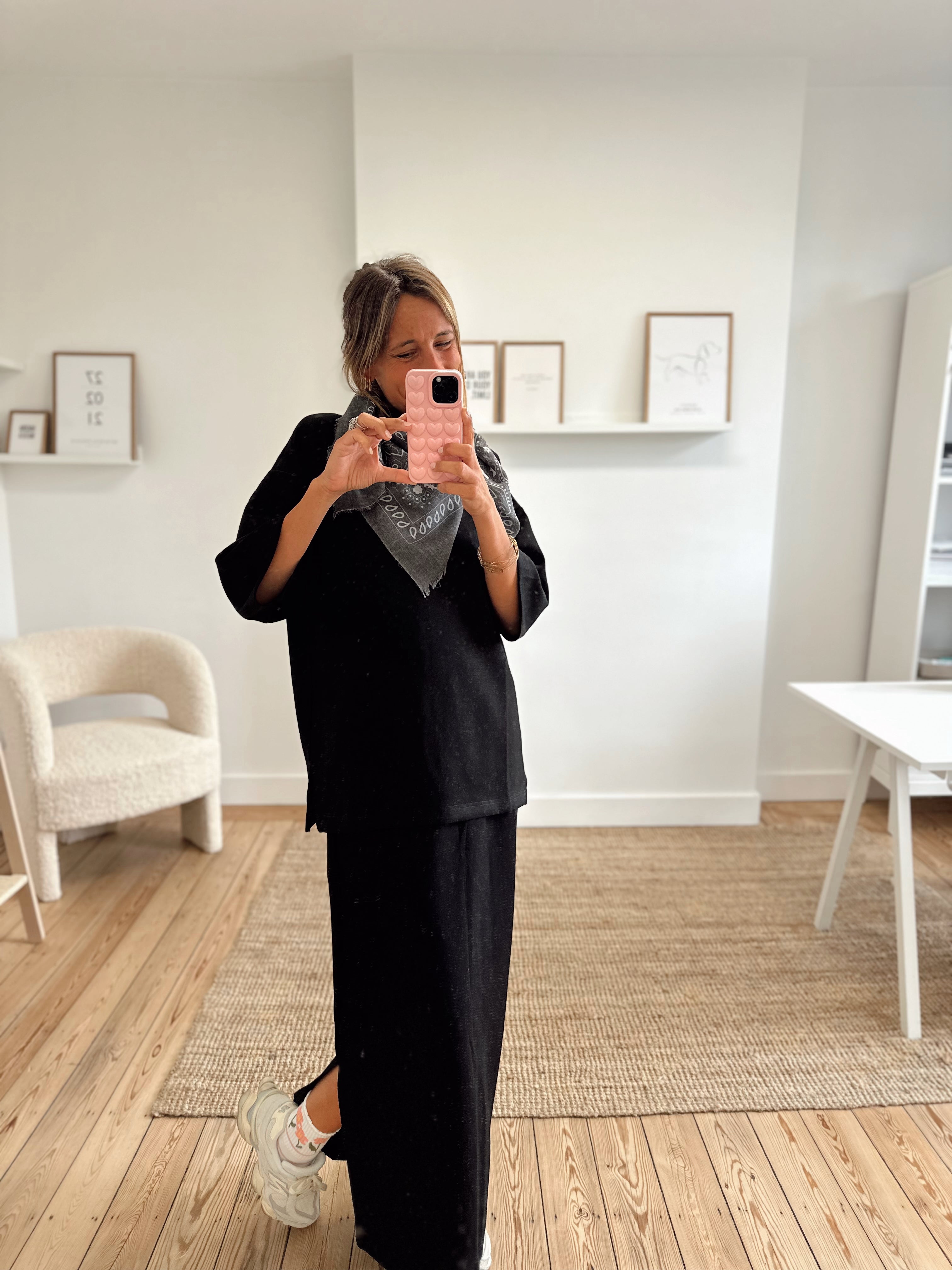 Composition : 48% polyester, 45% viscose et 7% élasthanne. Laver à 30 degrés.